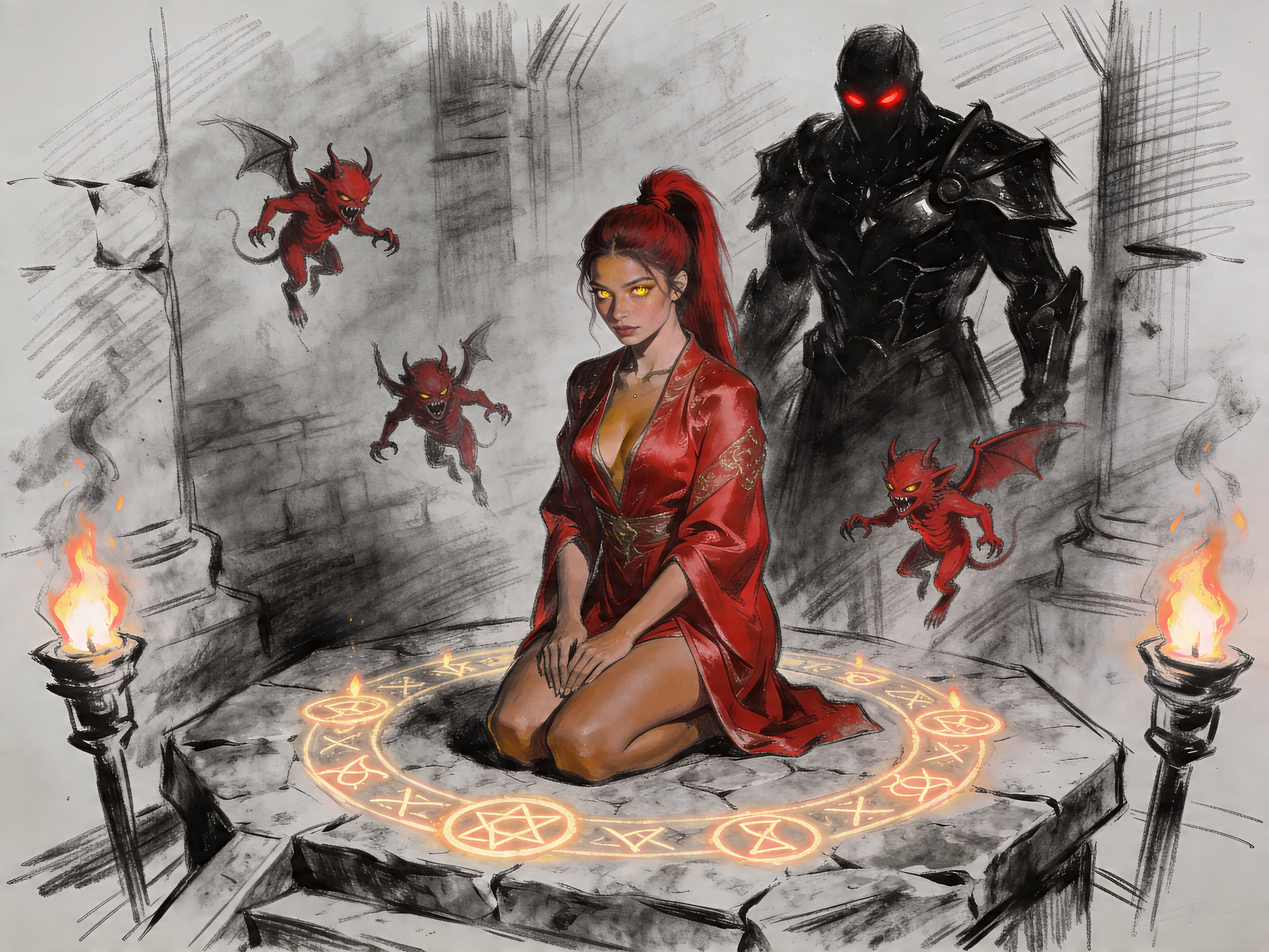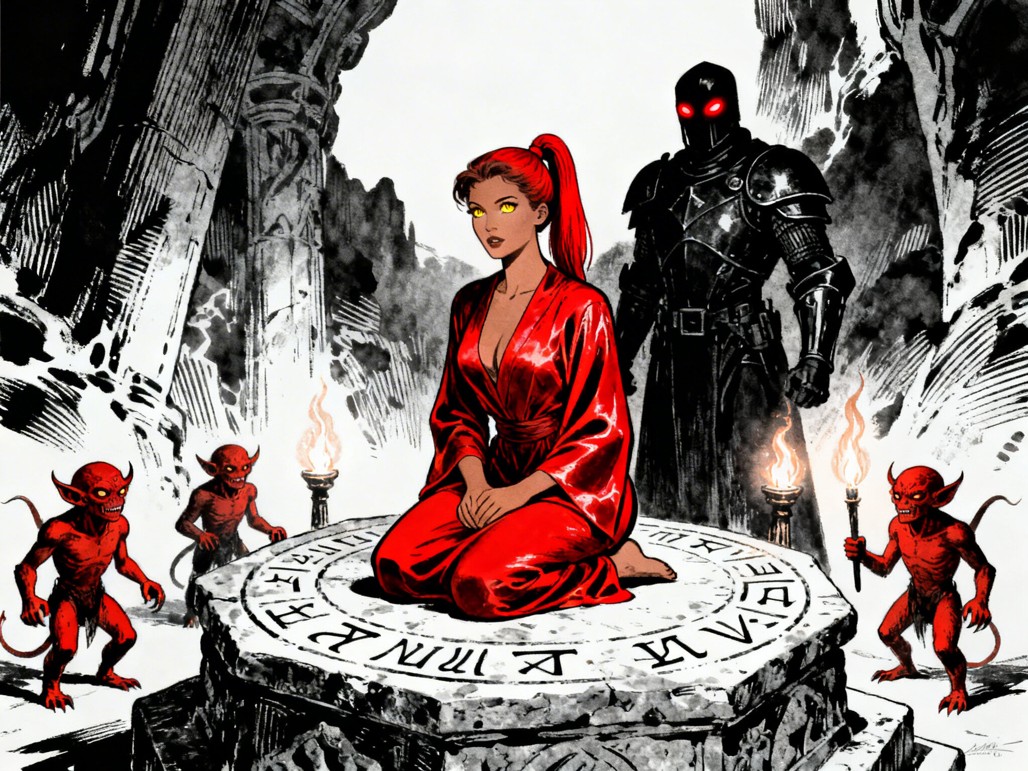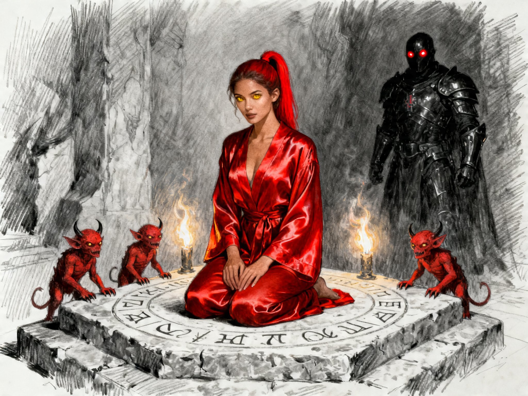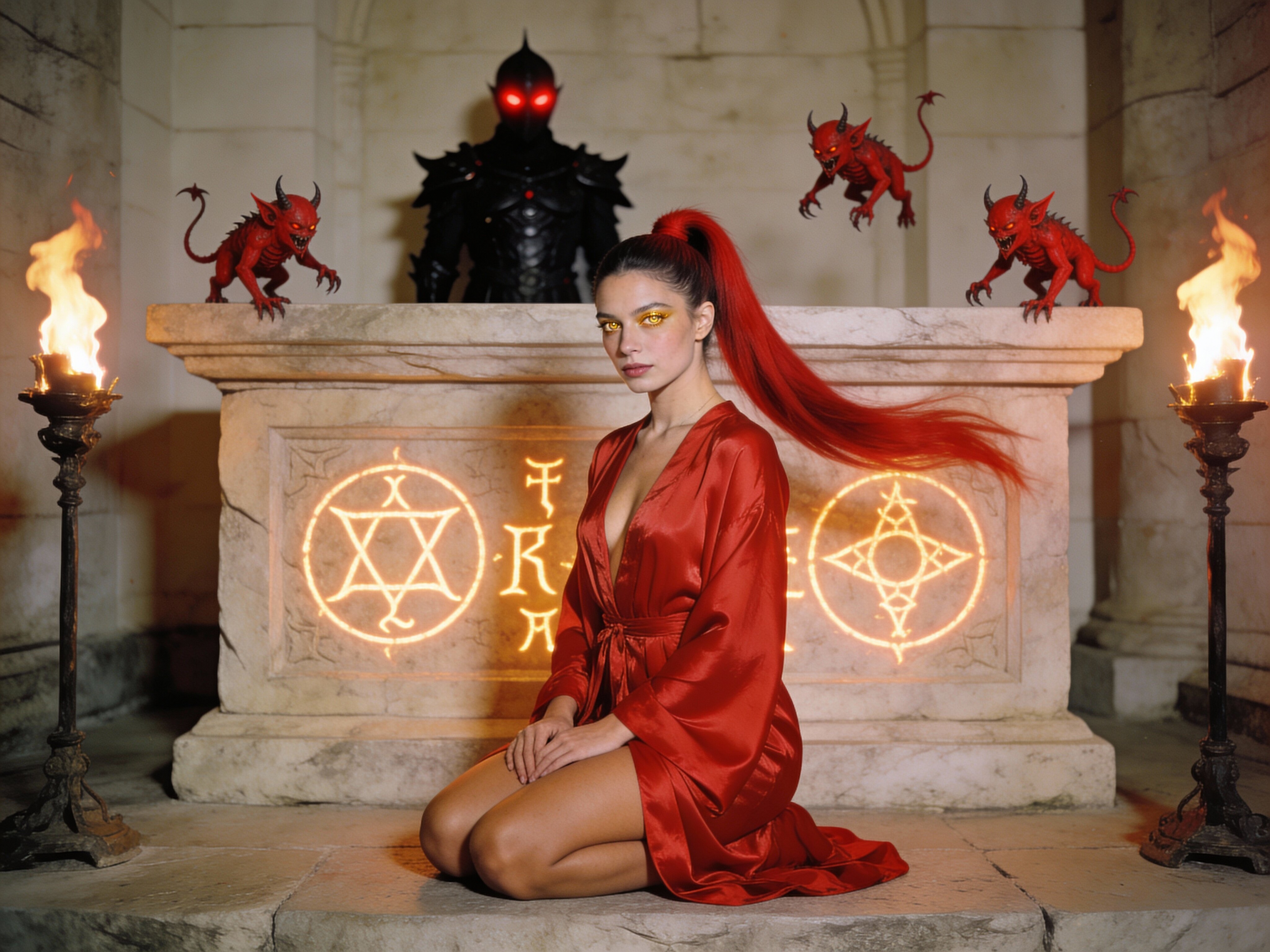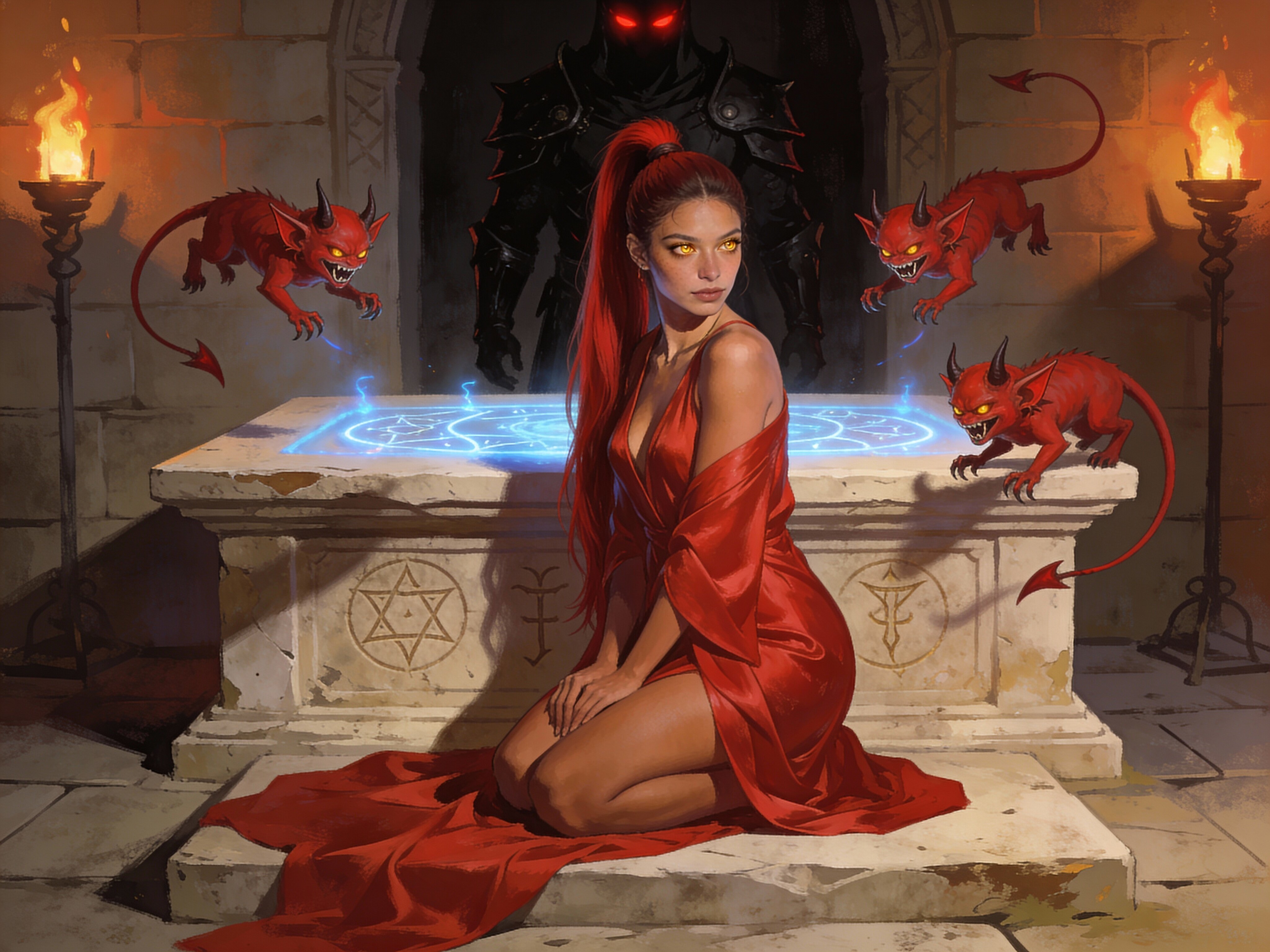 woman, late 20s with honey skin, golden eyes, red silk robe, kneeling on stone altar; glowing runes, flickering torches; red ponytail; three small red demons; black-armored figure with glowing red eyes in background