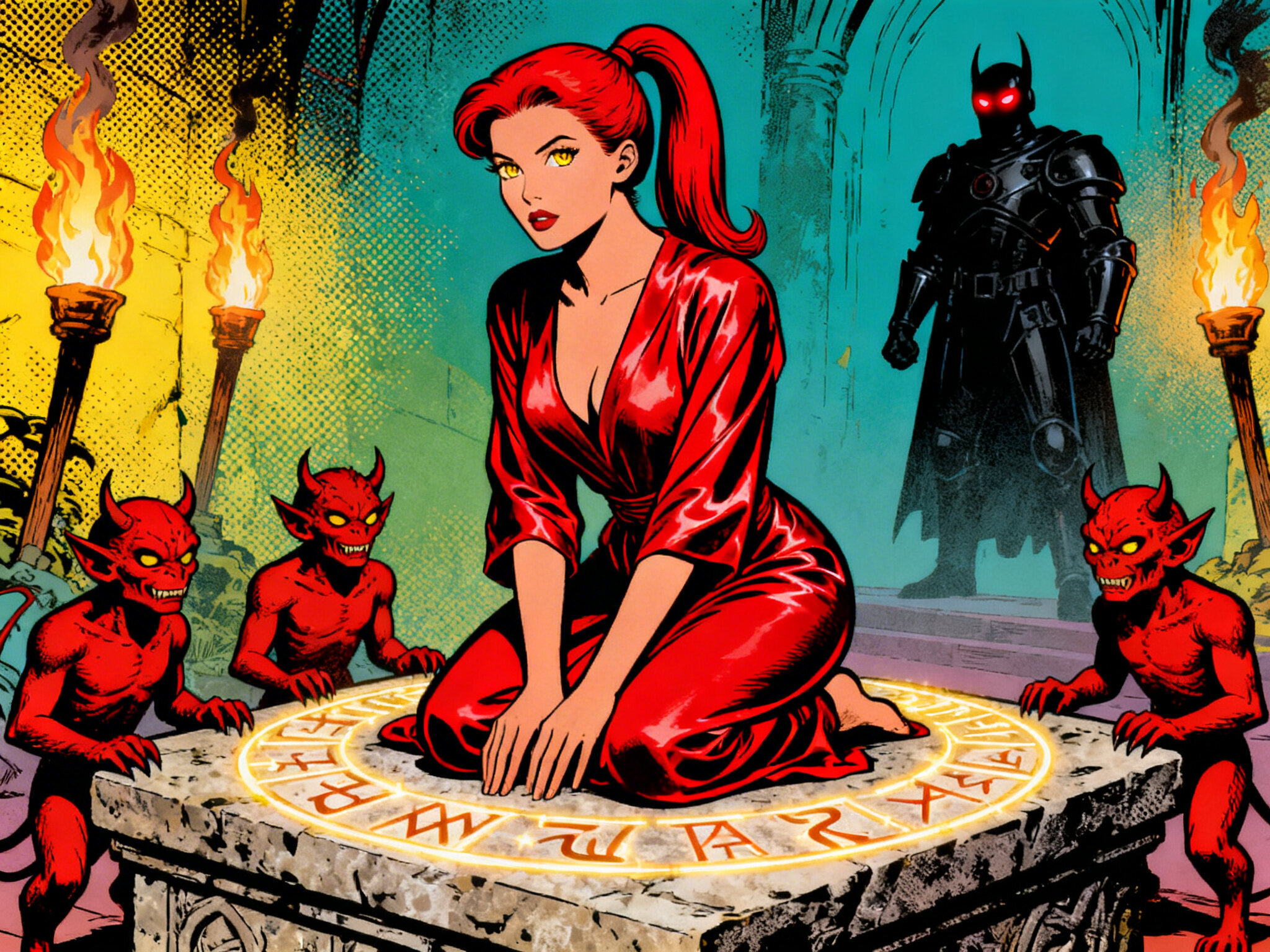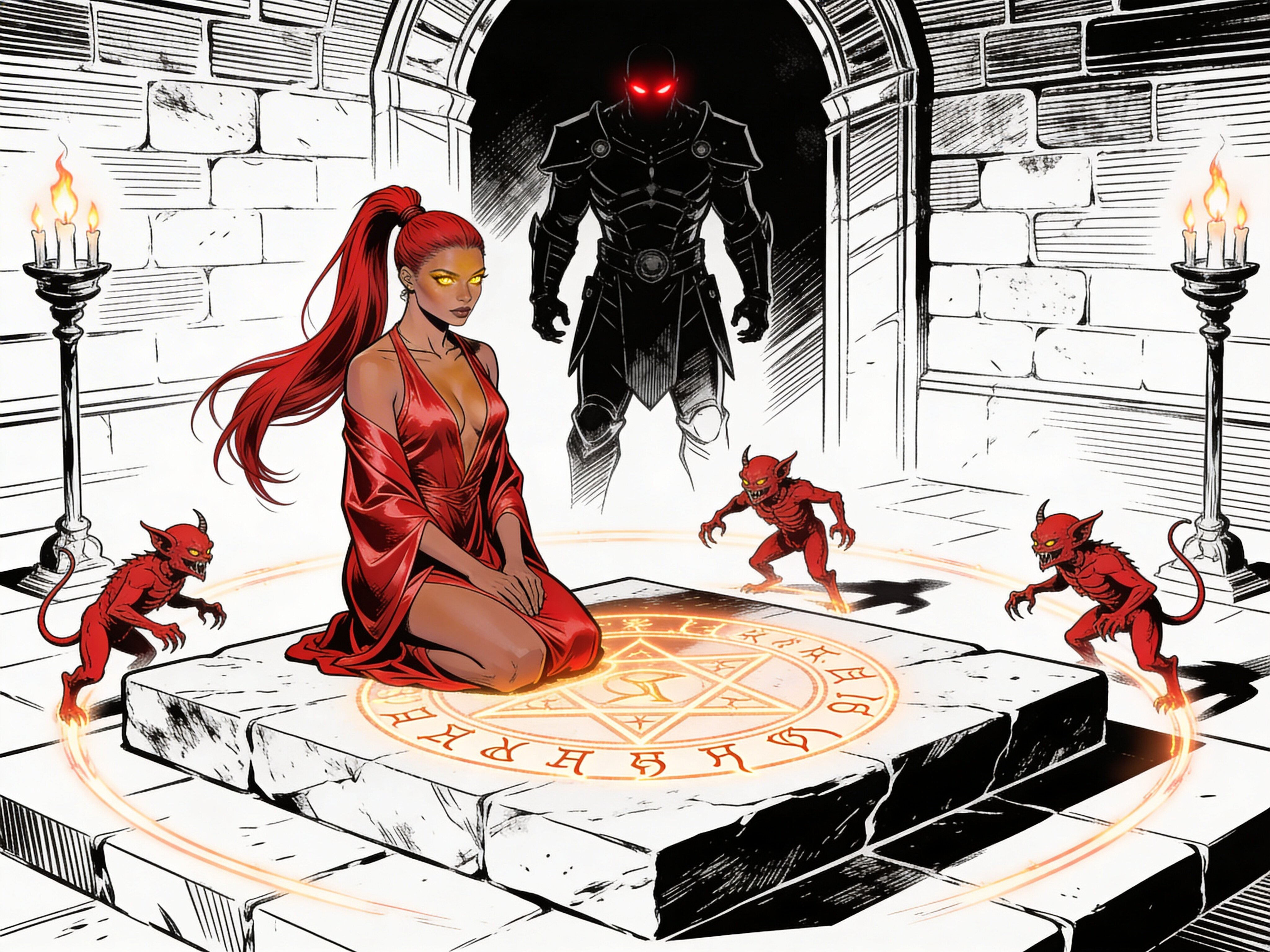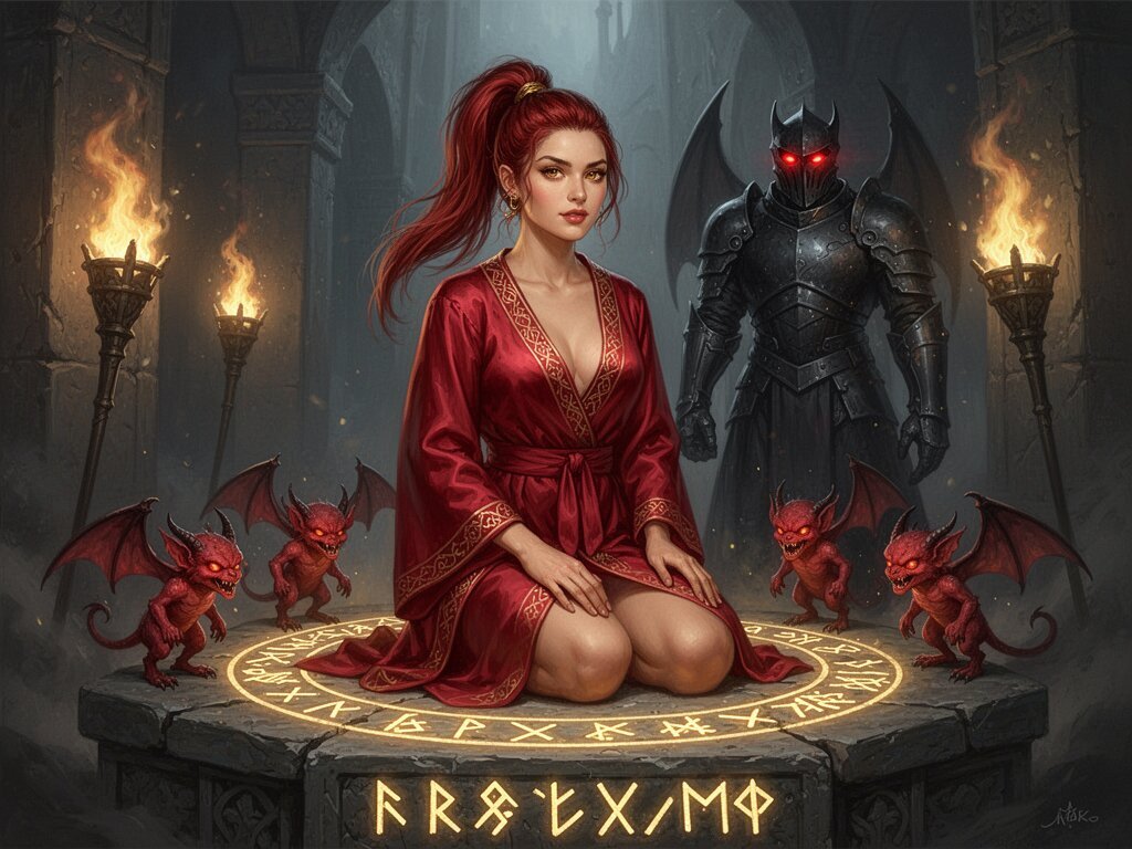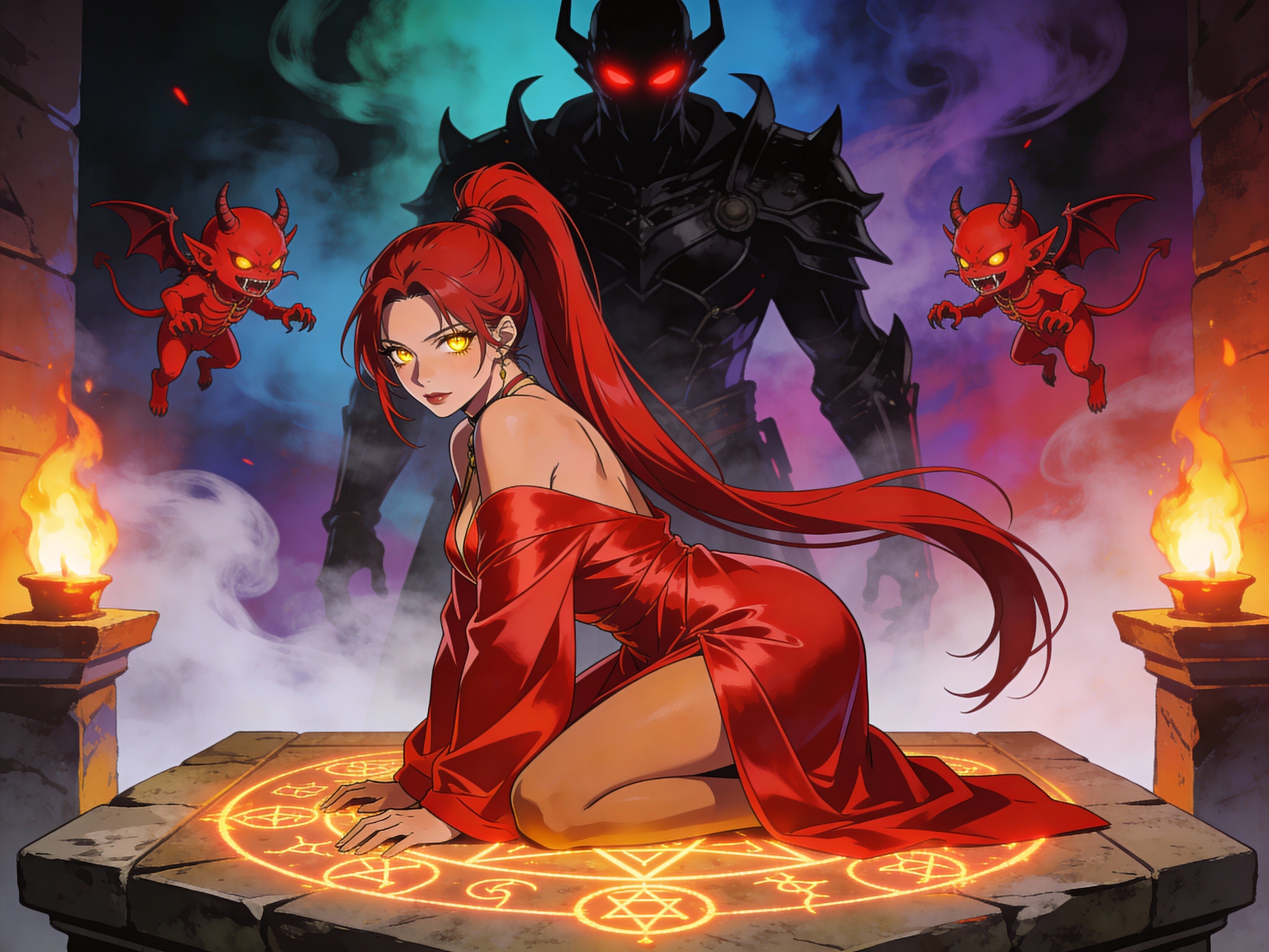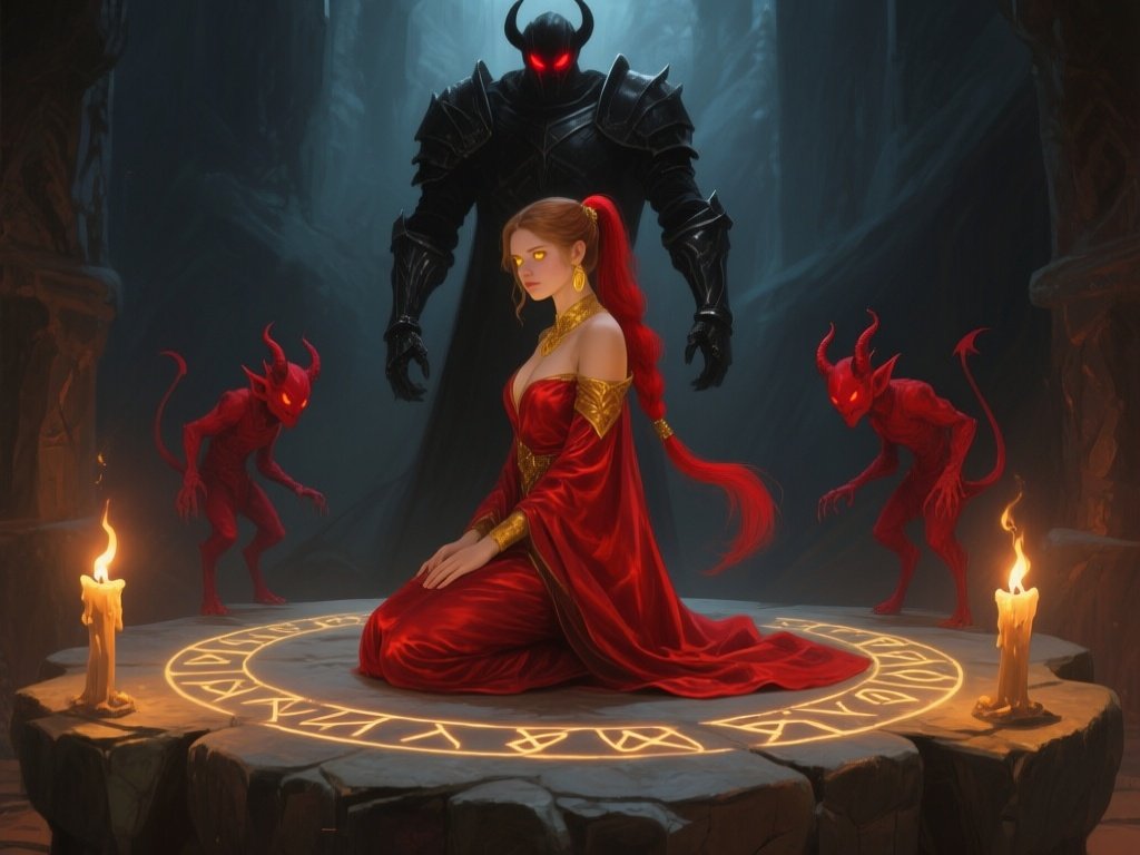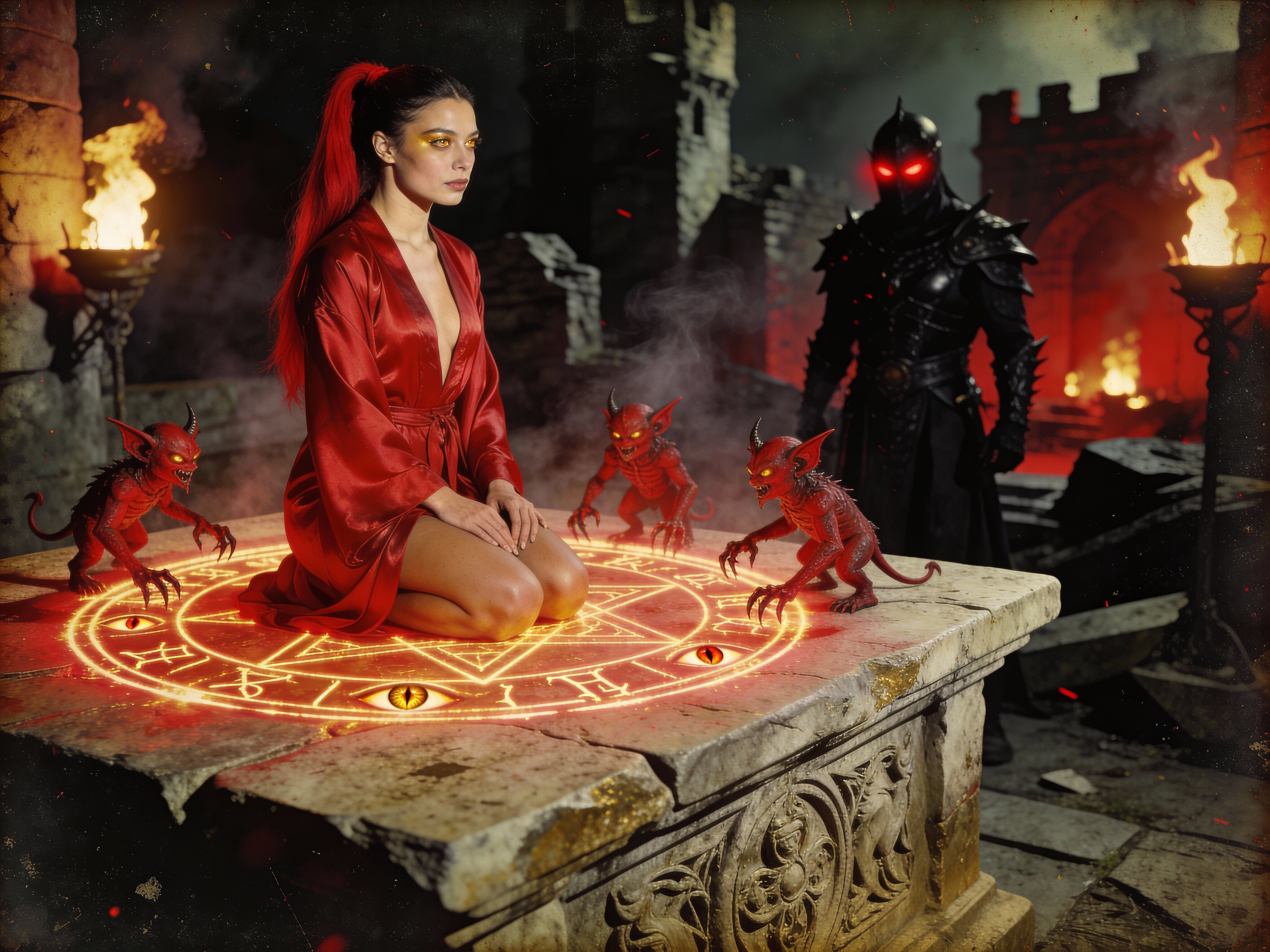 woman, late 20s with honey skin, golden eyes, red silk robe, kneeling on stone altar; glowing runes, flickering torches; red ponytail; three small red demons; black-armored figure with glowing red eyes in background