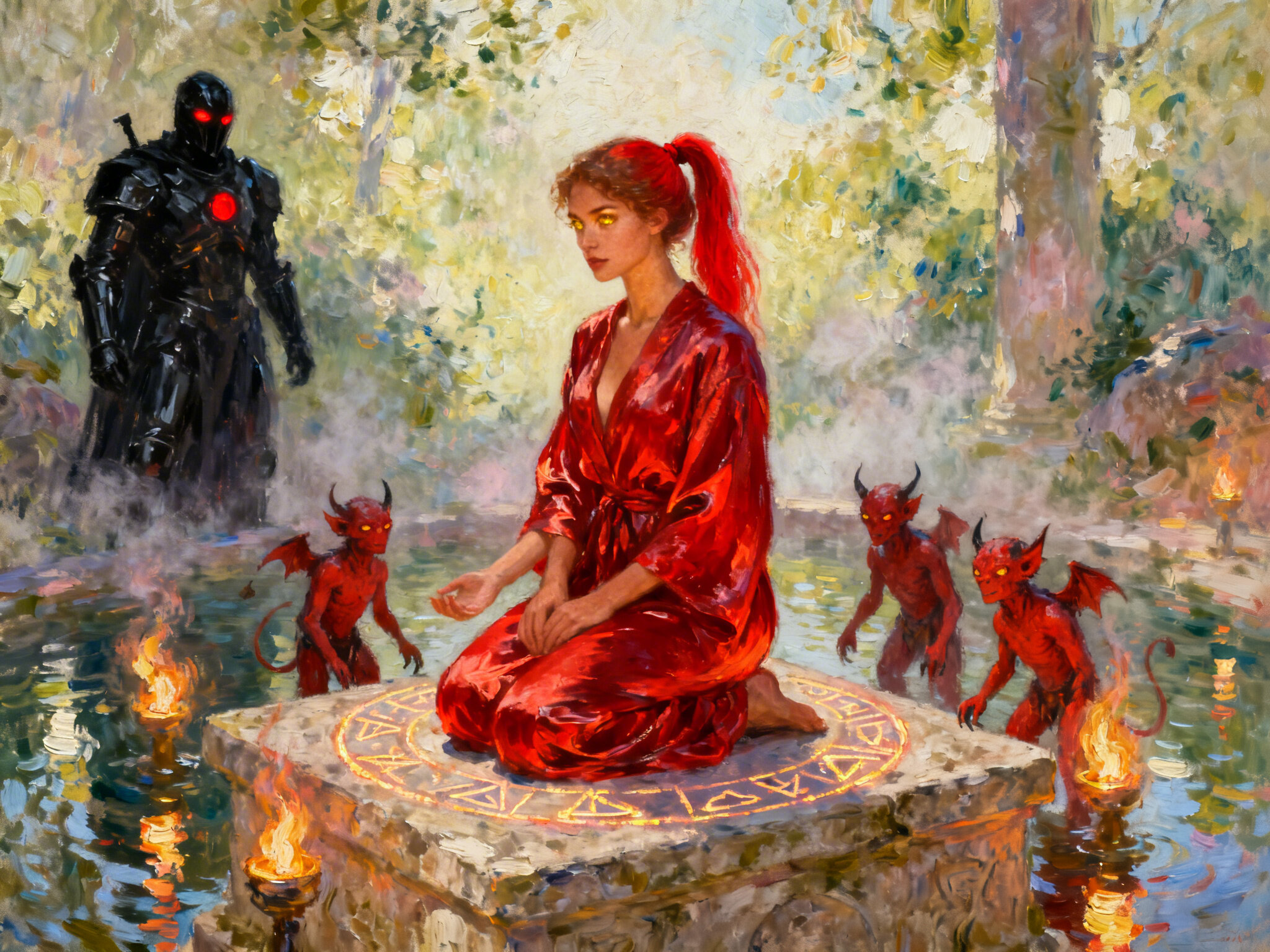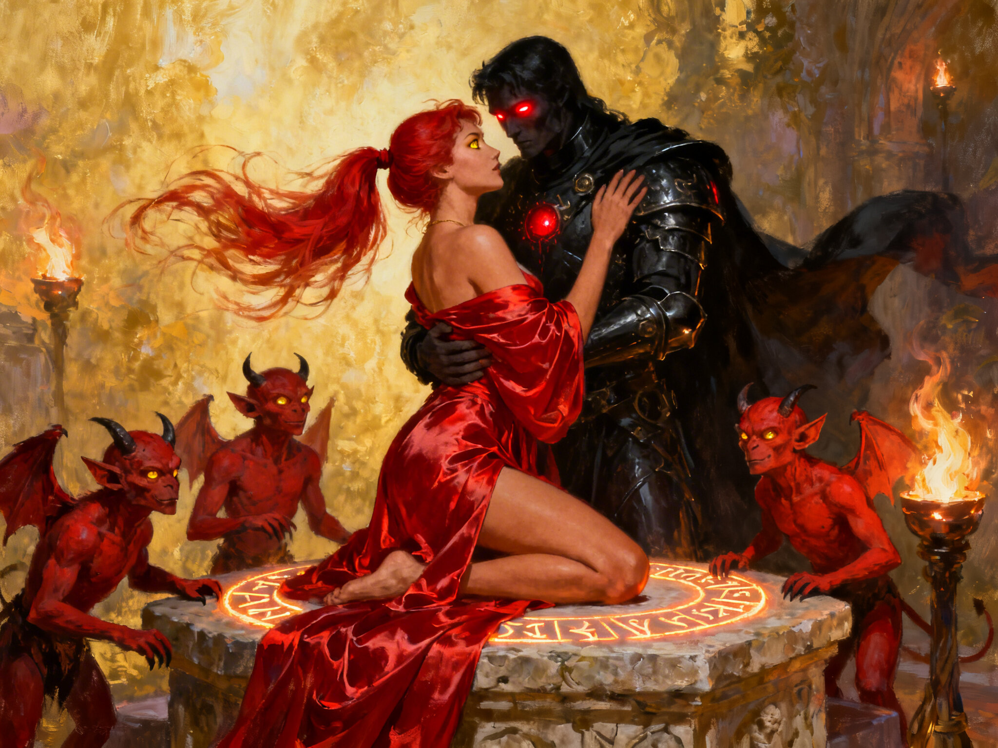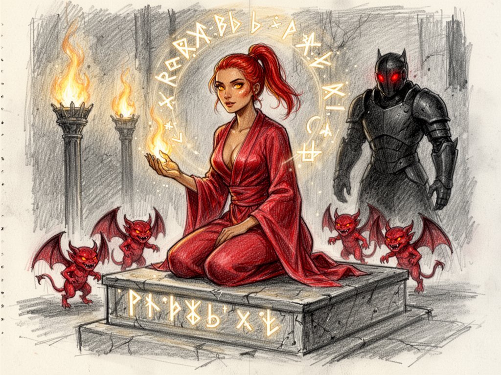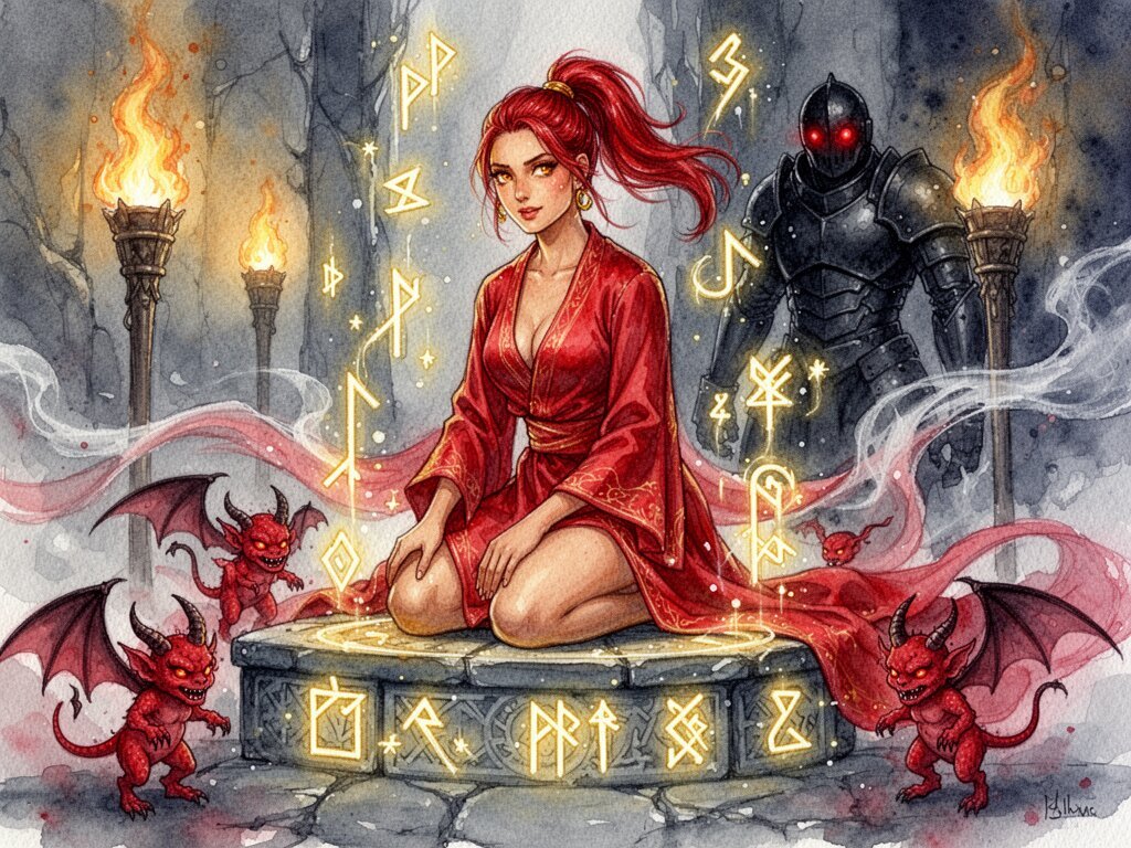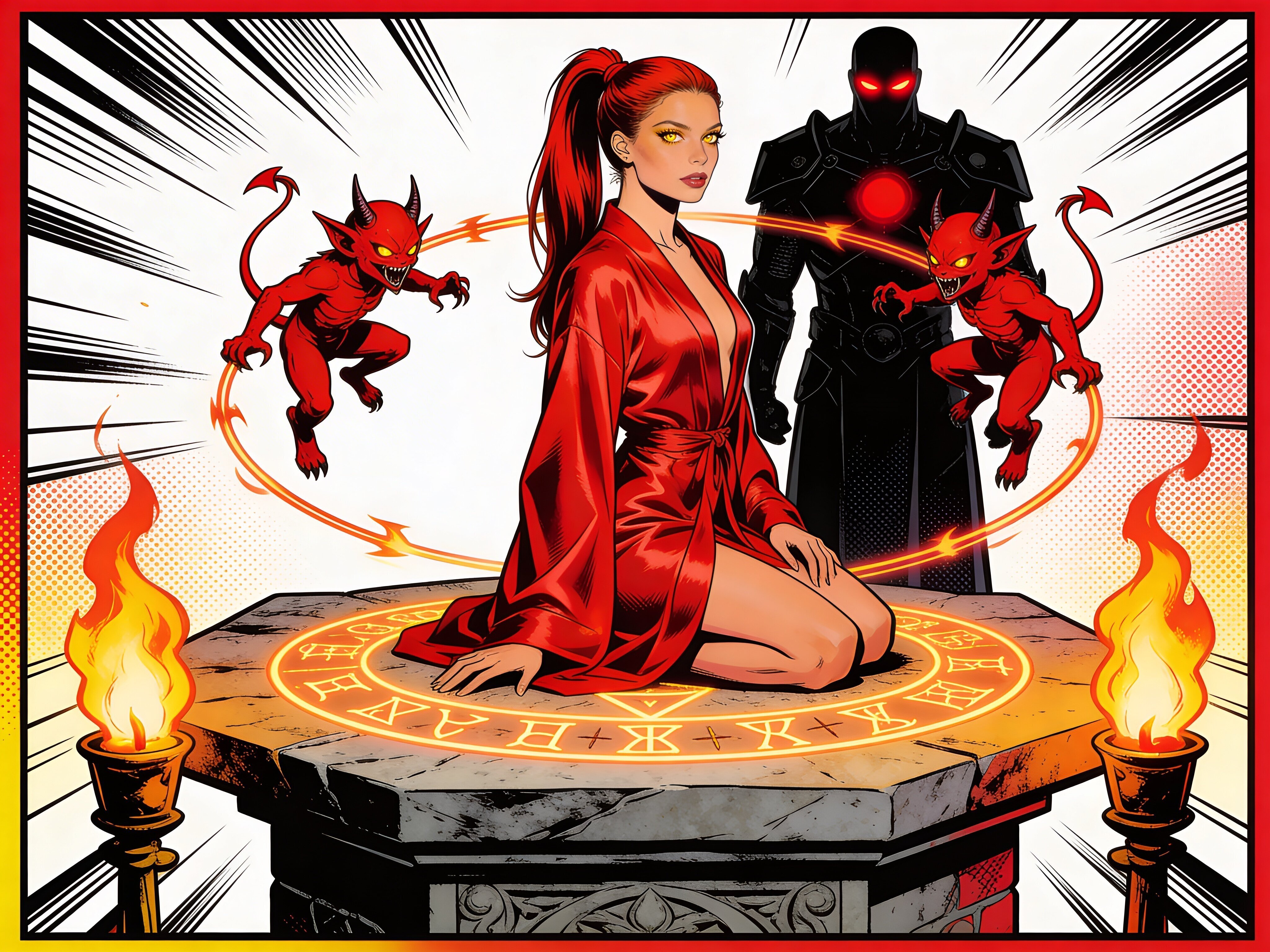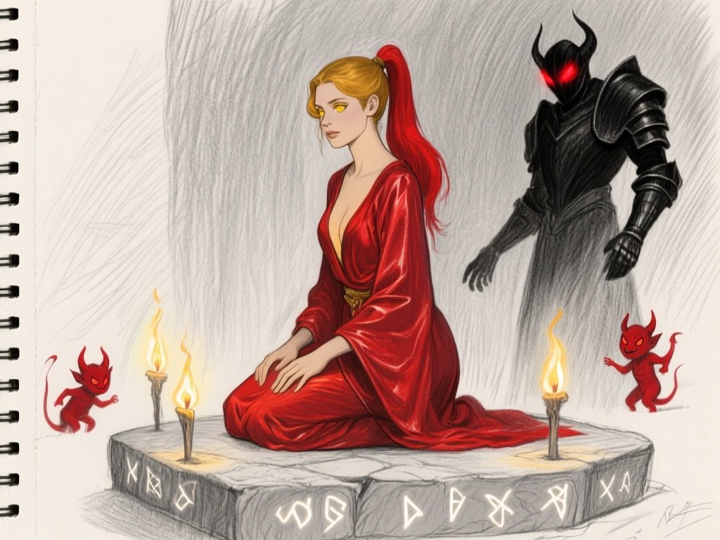 woman, late 20s with honey skin, golden eyes, red silk robe, kneeling on stone altar; glowing runes, flickering torches; red ponytail; three small red demons; black-armored figure with glowing red eyes in background