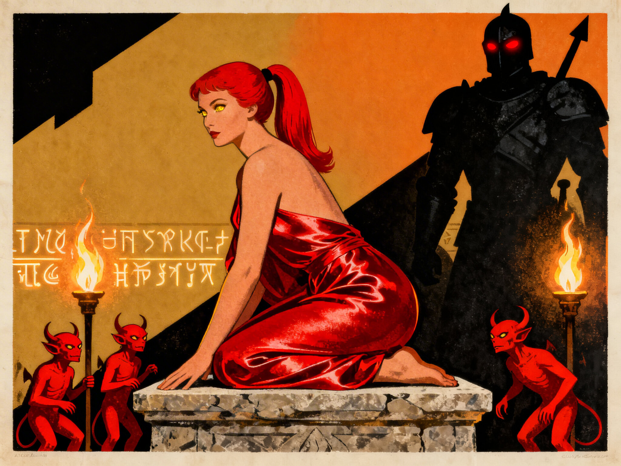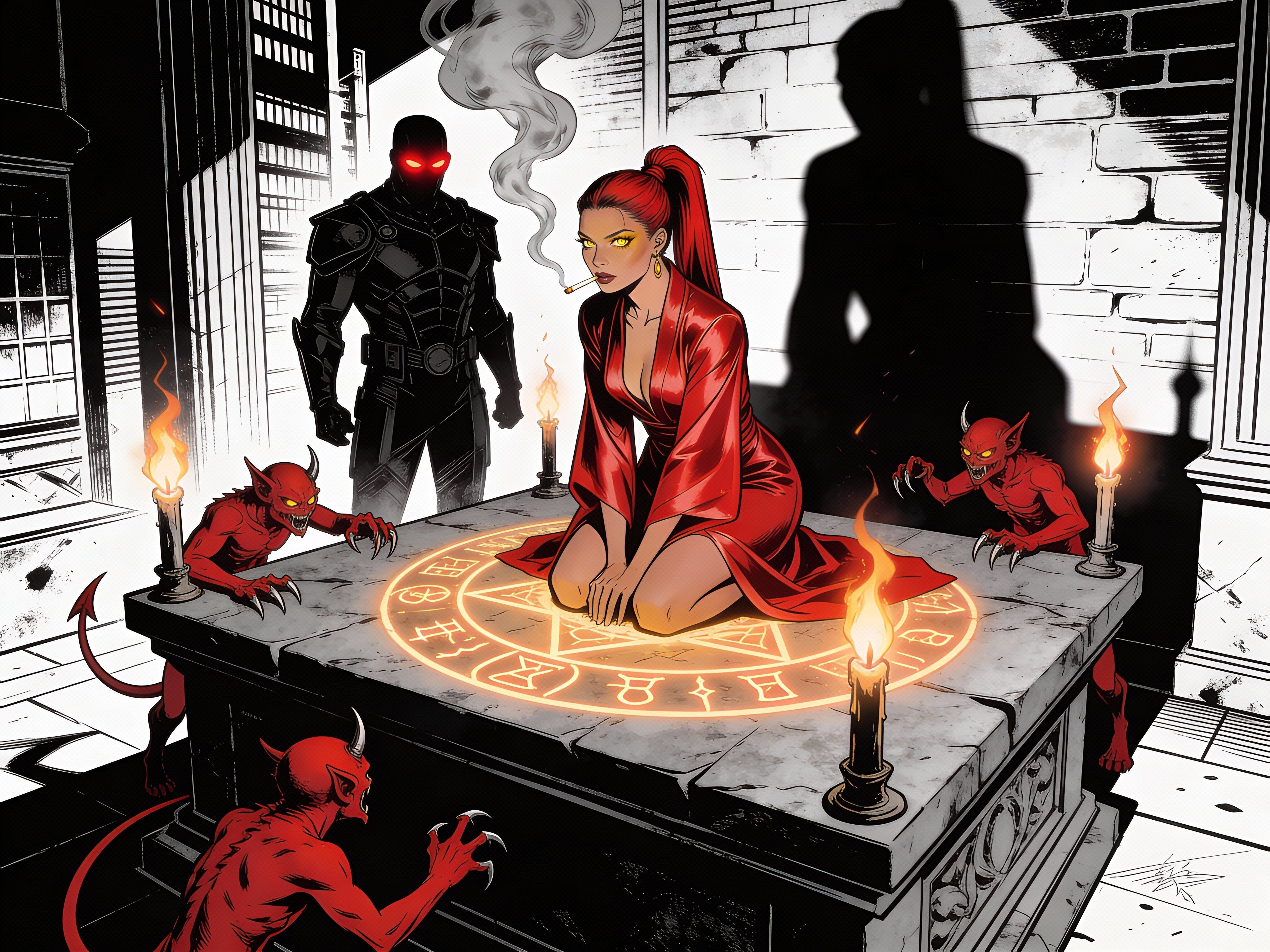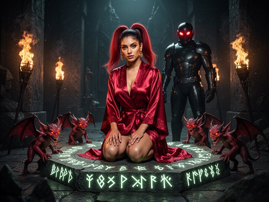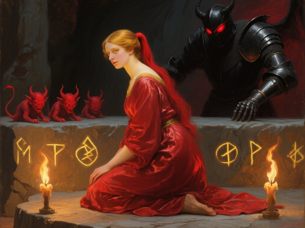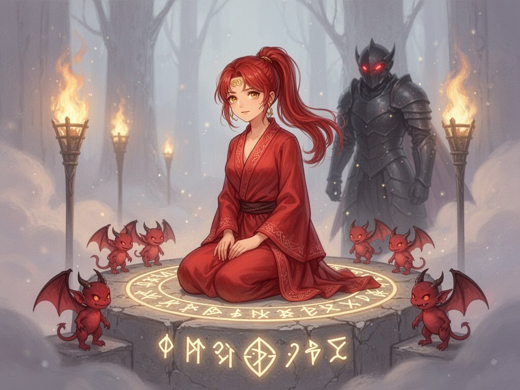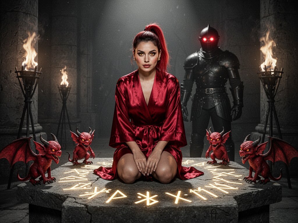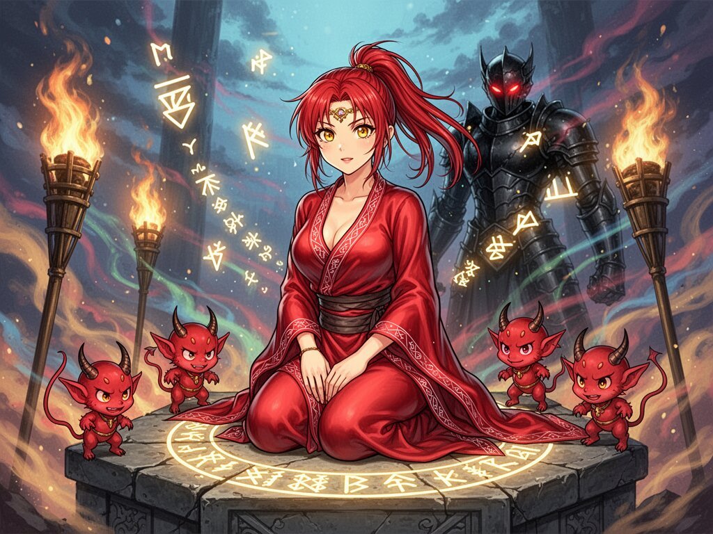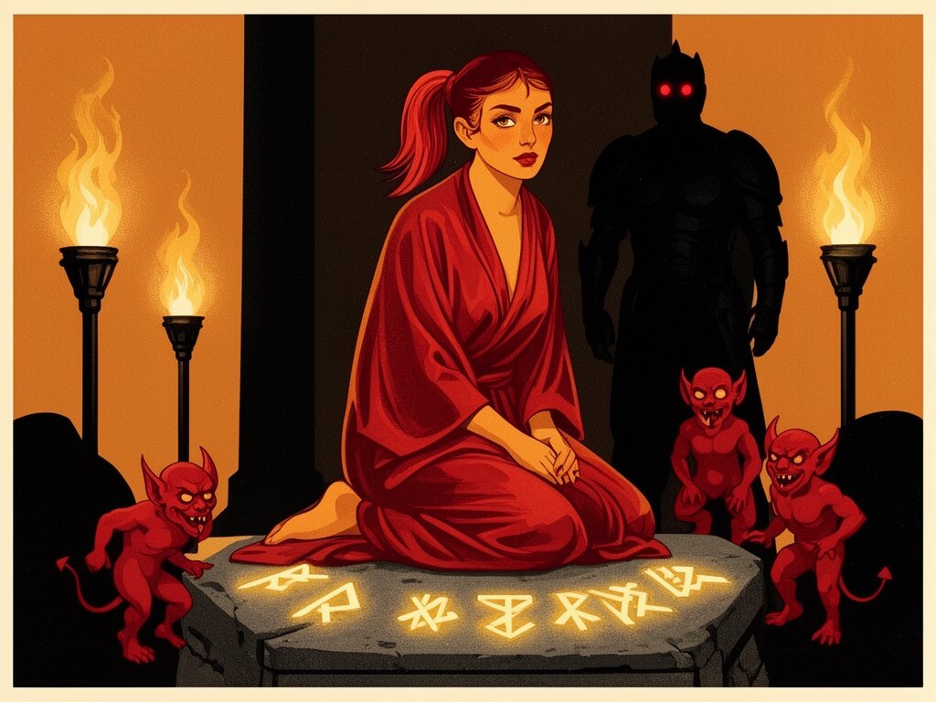 woman, late 20s with honey skin, golden eyes, red silk robe, kneeling on stone altar; glowing runes, flickering torches; red ponytail; three small red demons; black-armored figure with glowing red eyes in background