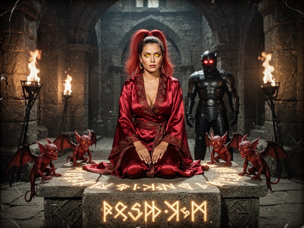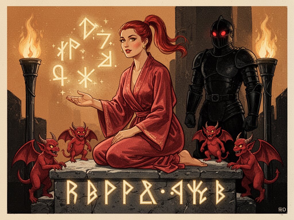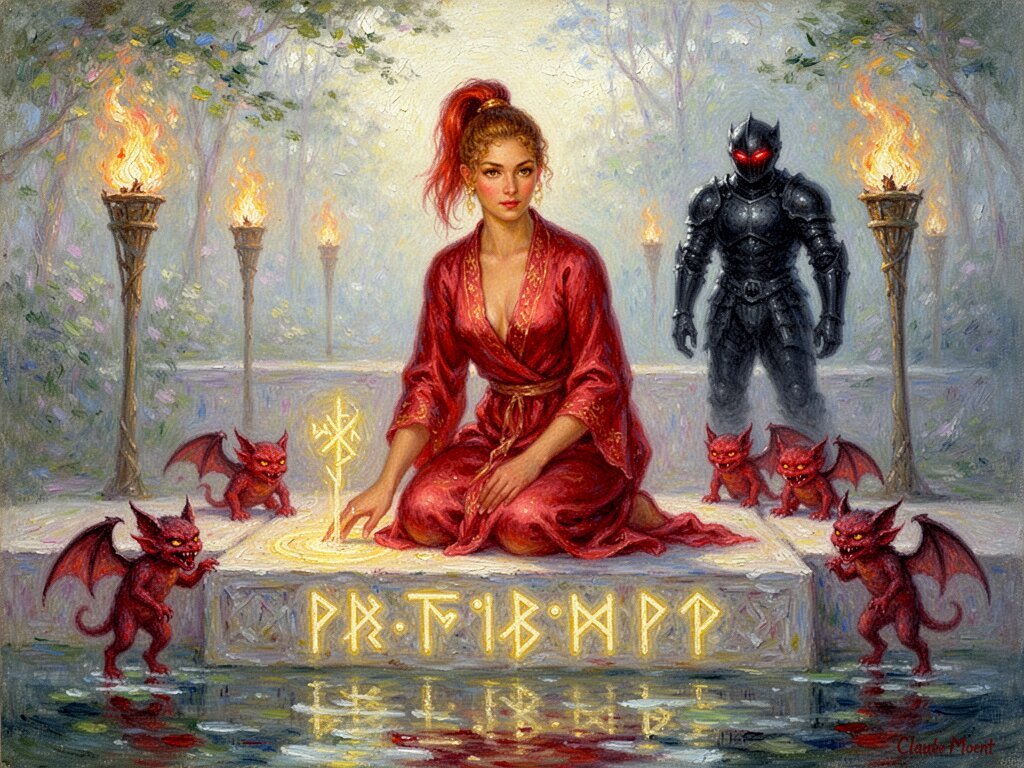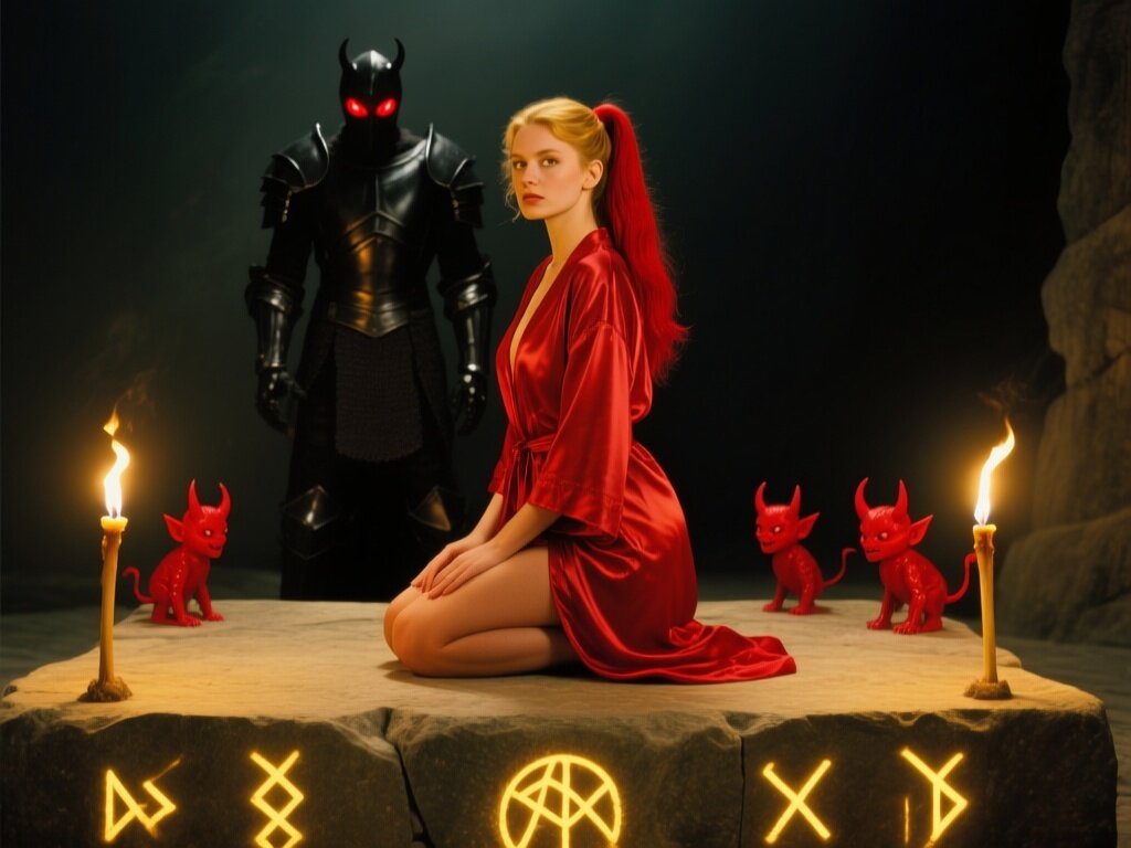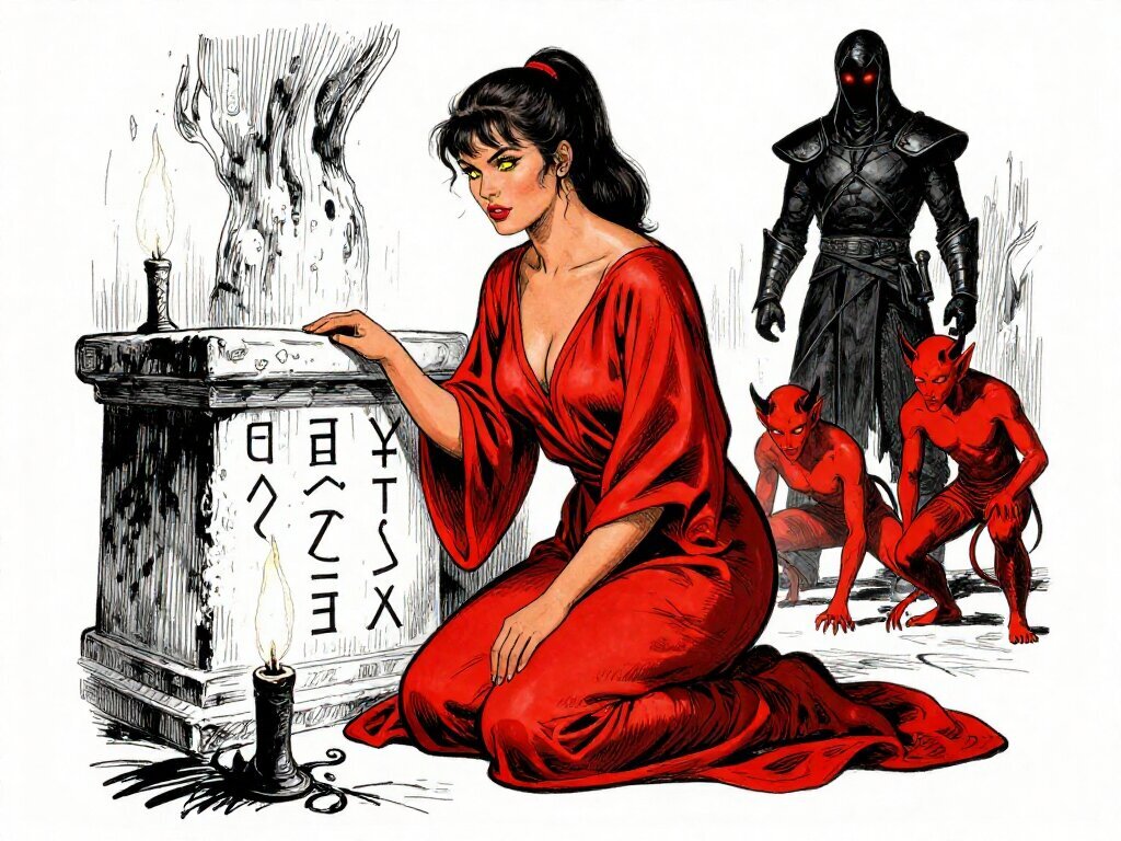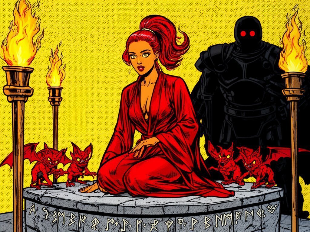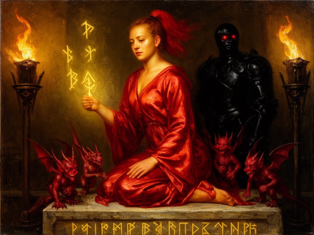 woman, late 20s with honey skin, golden eyes, red silk robe, kneeling on stone altar; glowing runes, flickering torches; red ponytail; three small red demons; black-armored figure with glowing red eyes in background