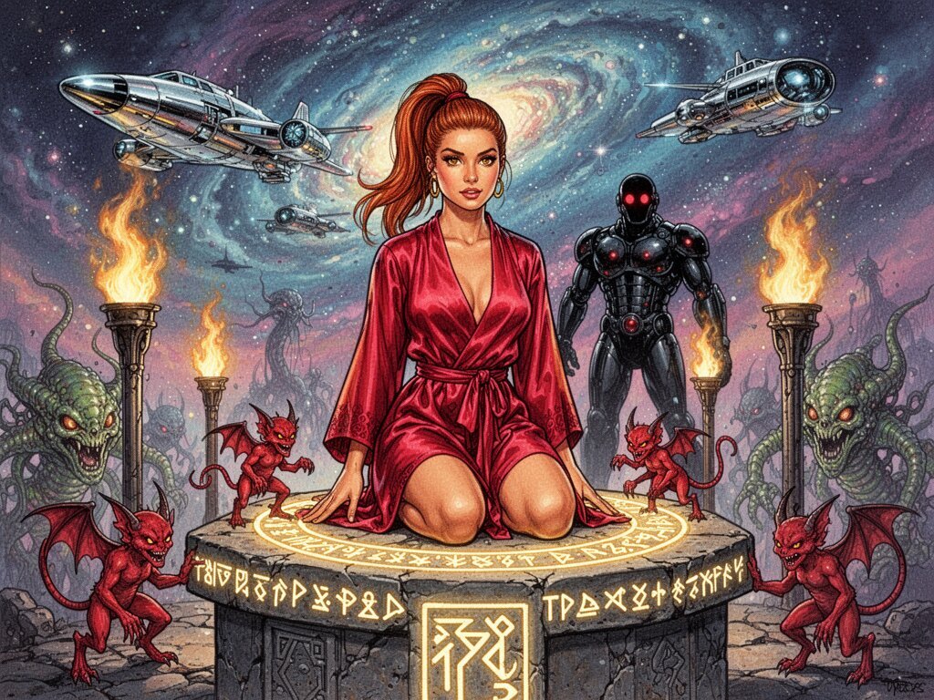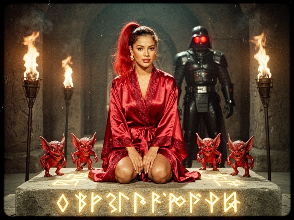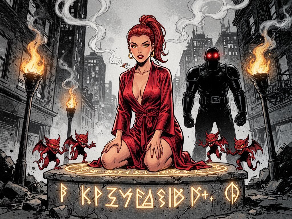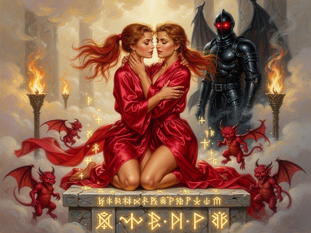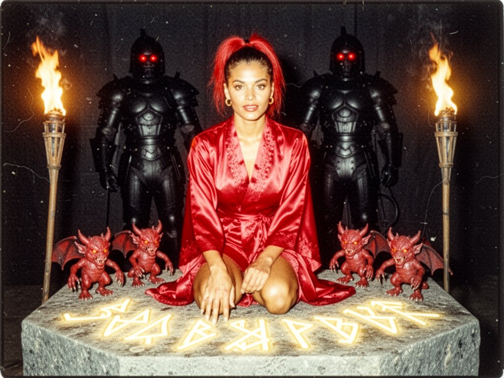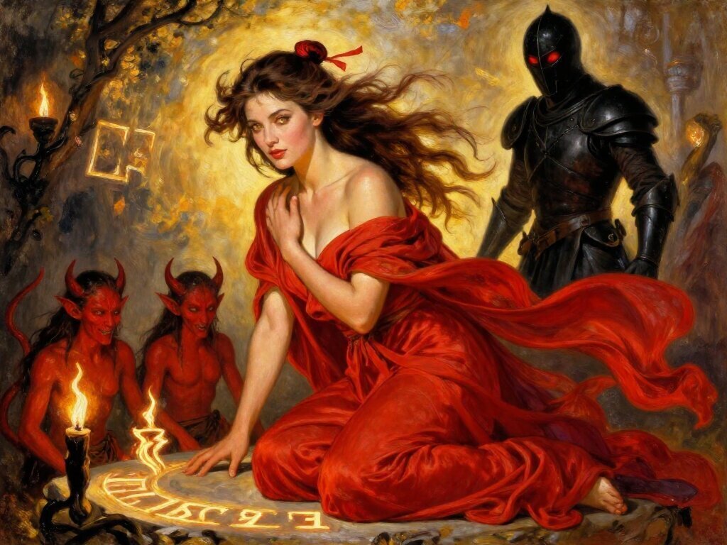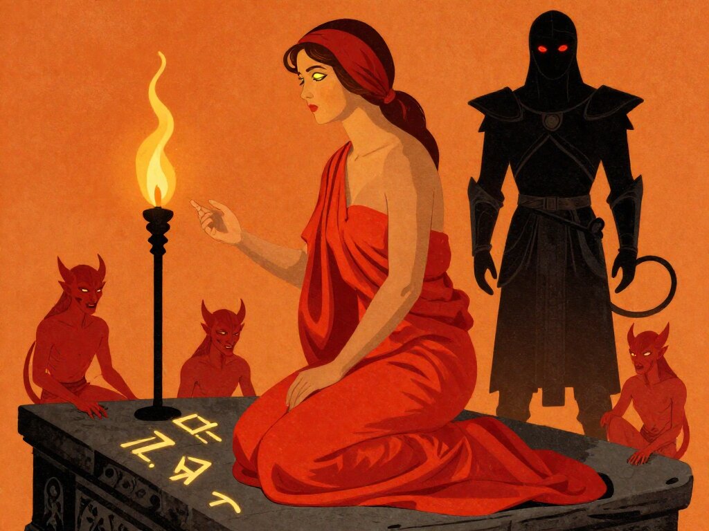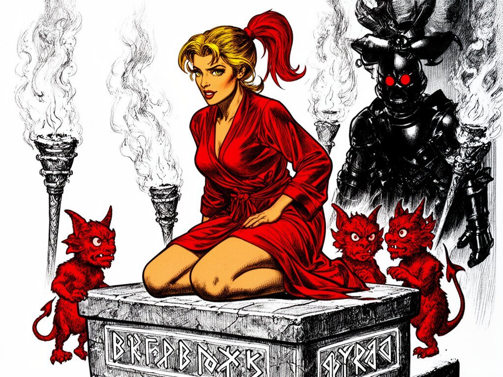 woman, late 20s with honey skin, golden eyes, red silk robe, kneeling on stone altar; glowing runes, flickering torches; red ponytail; three small red demons; black-armored figure with glowing red eyes in background