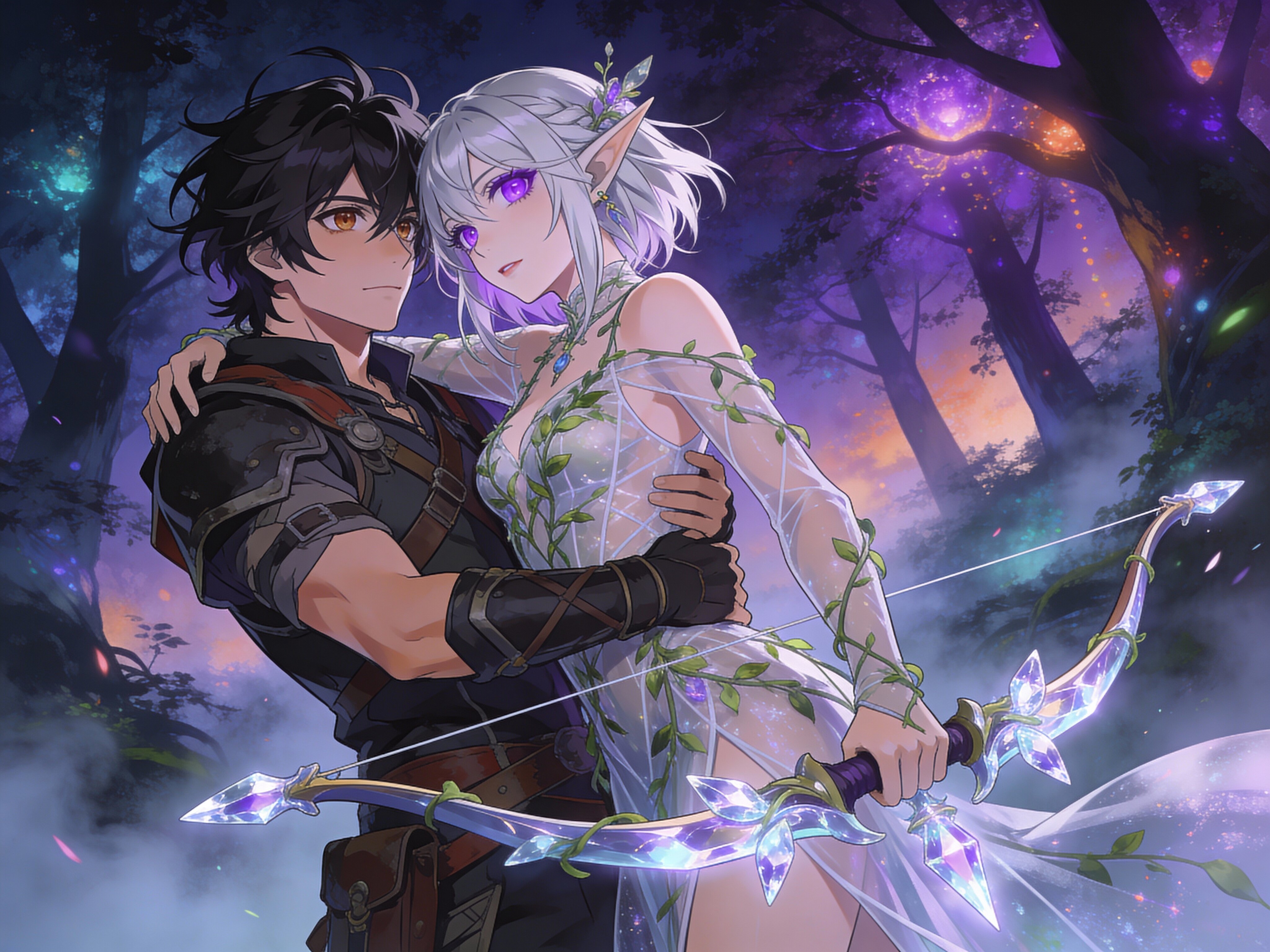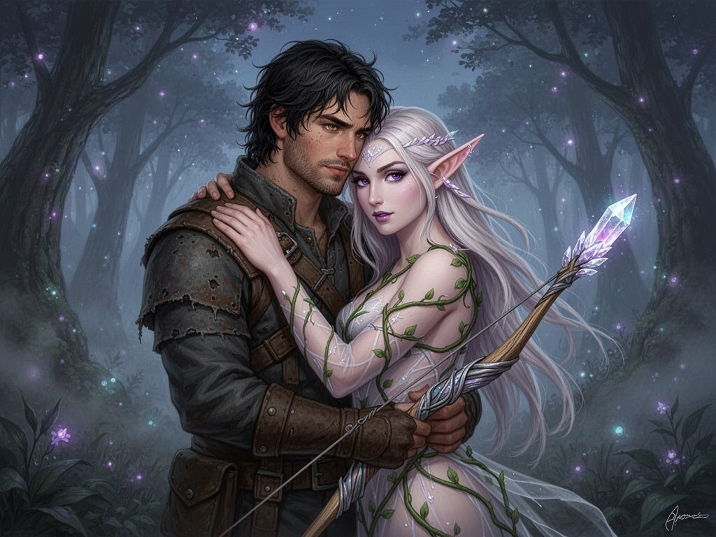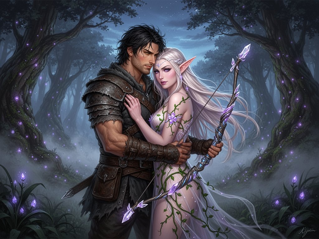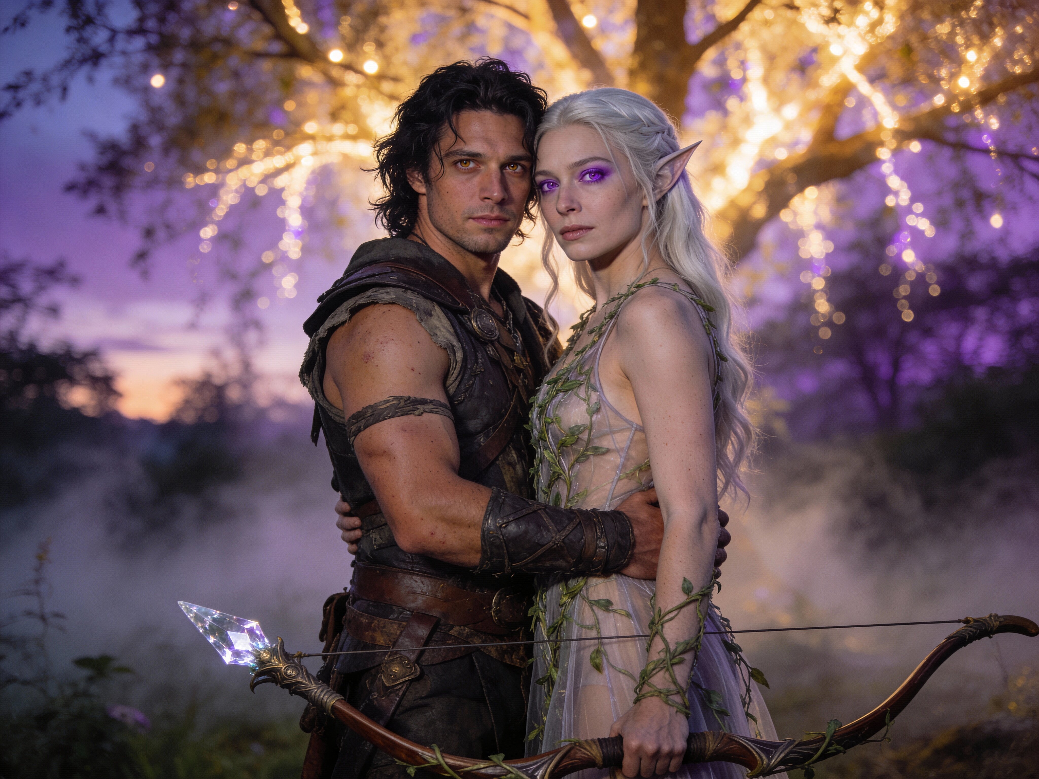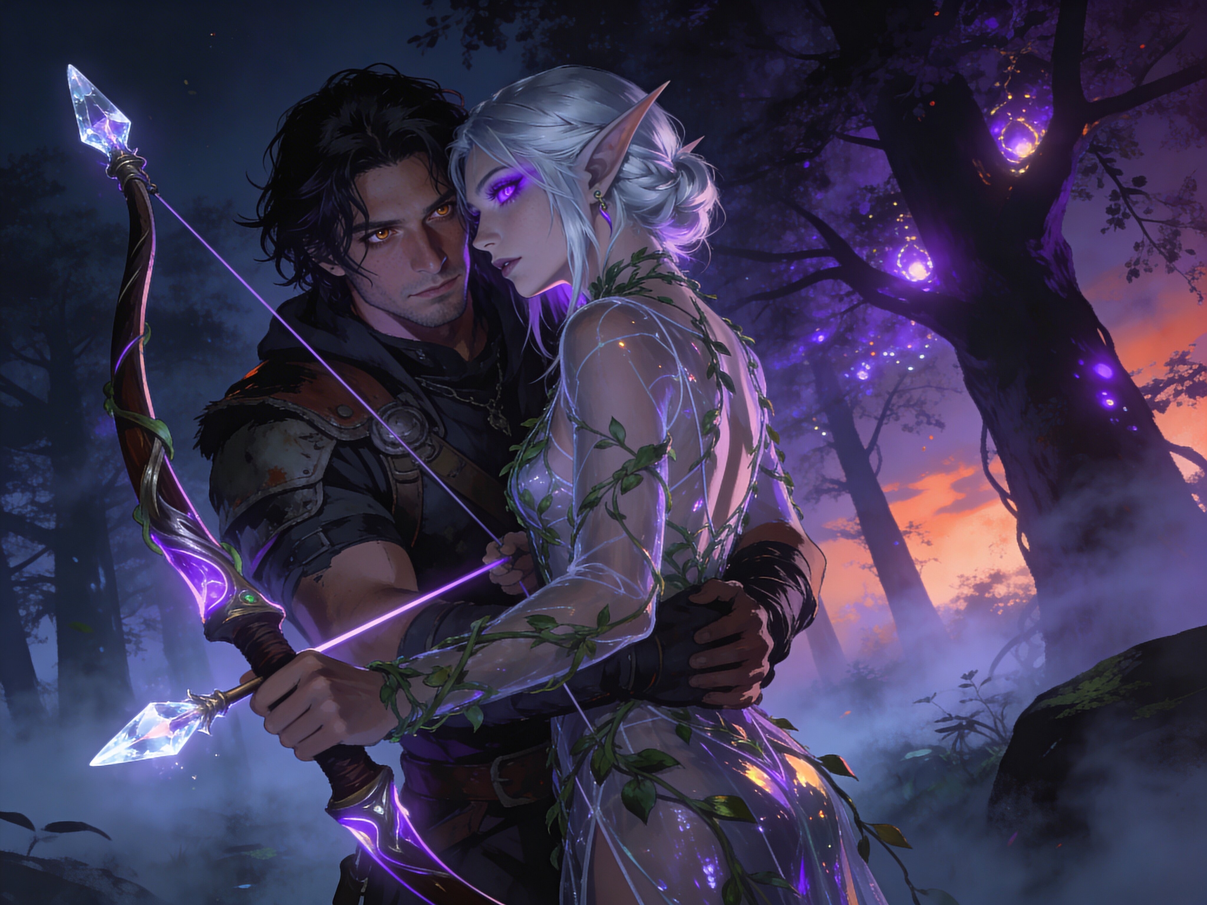 Kael: rugged man, 28 y.o, tousled black hair, hazel eyes, worn gear; Lysira: elf woman, 412 y.o, platinum hair, violet eyes, sheer vine dress, holding crystal-tipped bow; deep embrace in twilight grove with mist and glowing trees