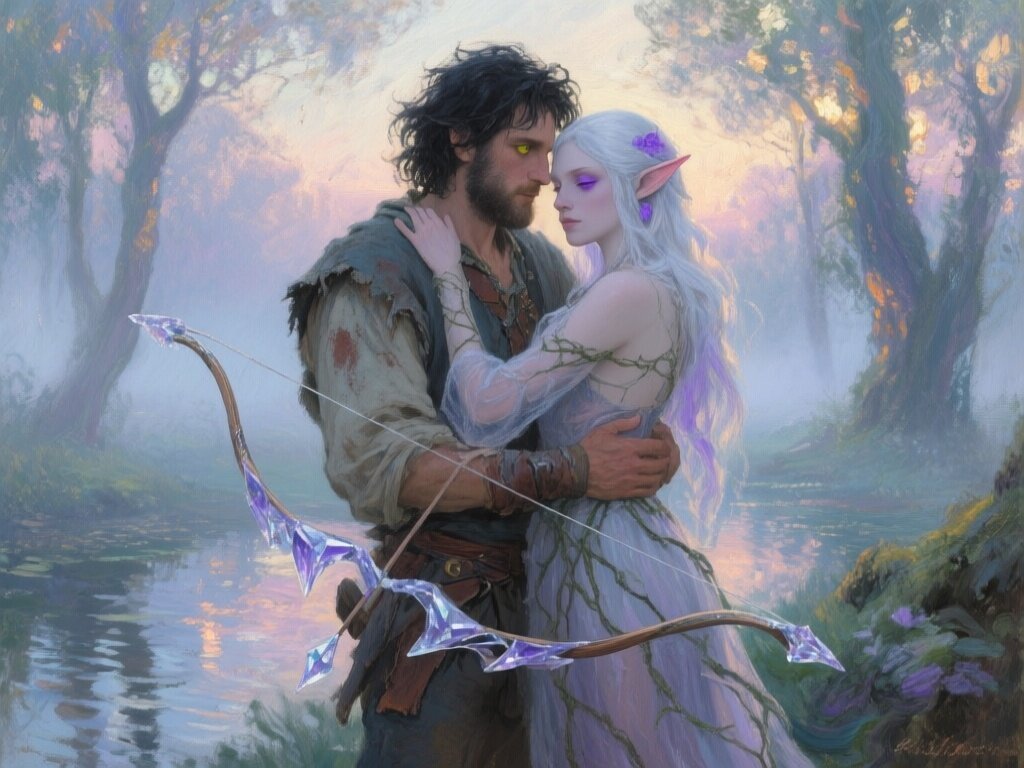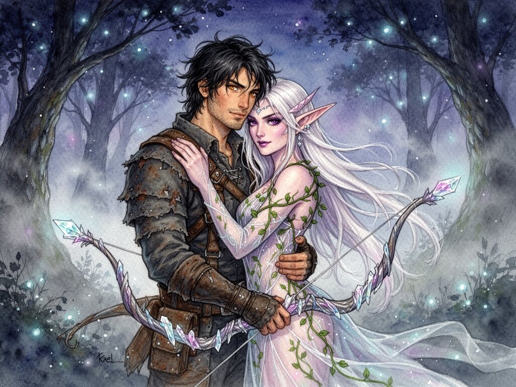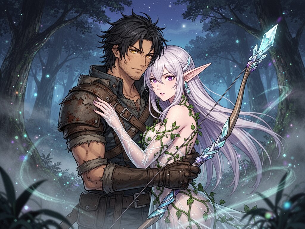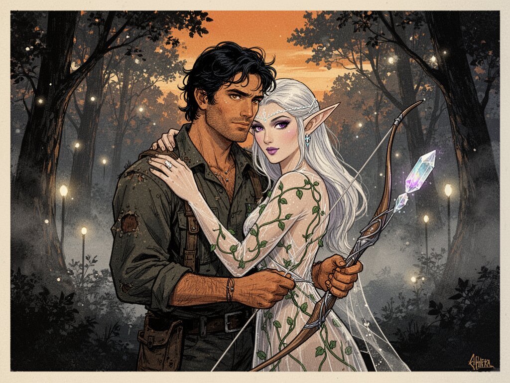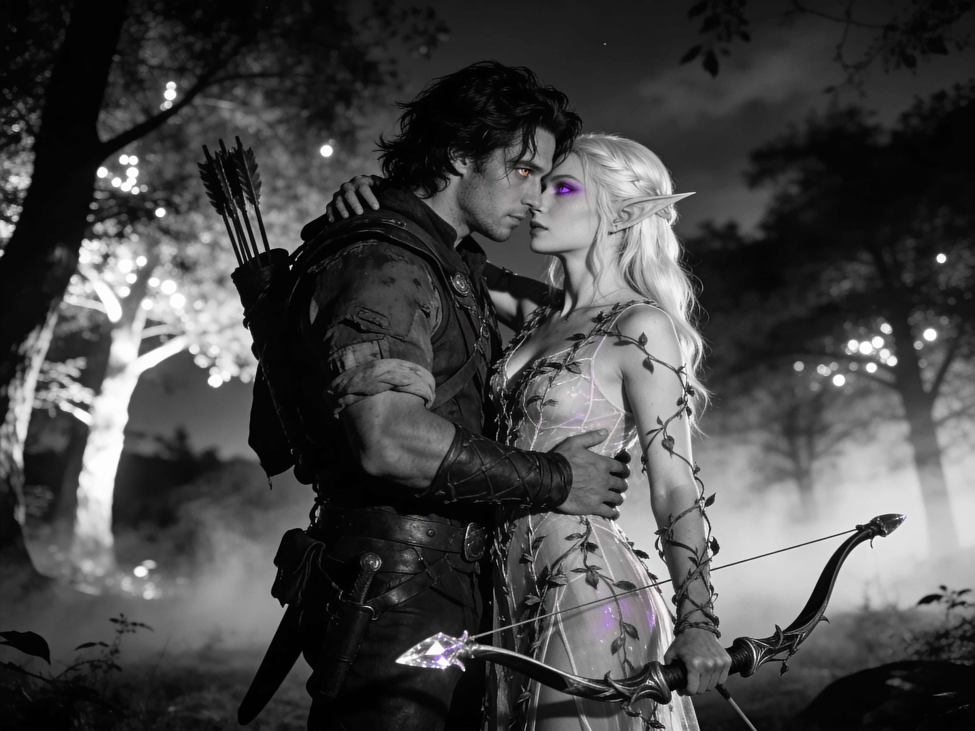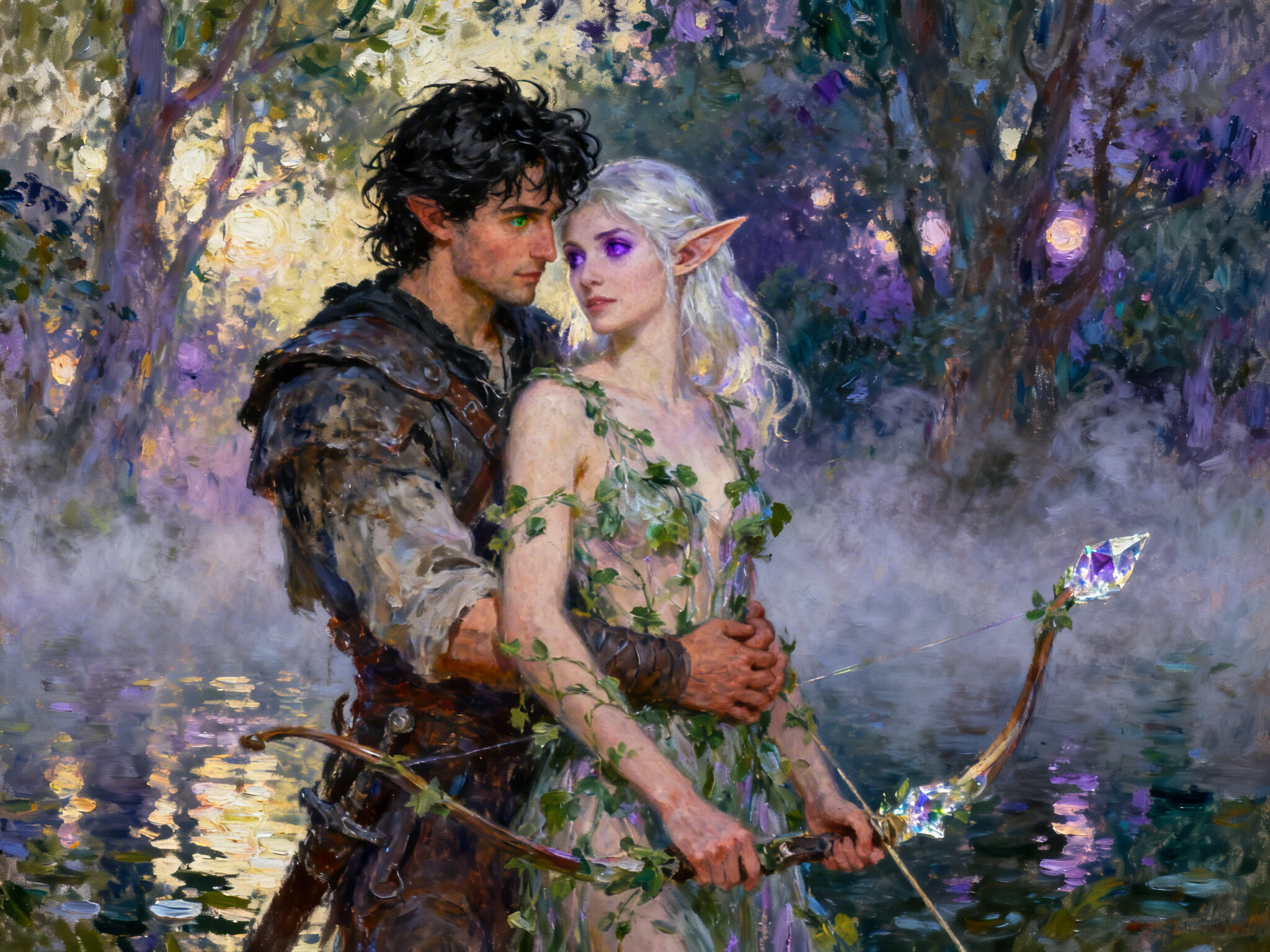 Kael: rugged man, 28 y.o, tousled black hair, hazel eyes, worn gear; Lysira: elf woman, 412 y.o, platinum hair, violet eyes, sheer vine dress, holding crystal-tipped bow; deep embrace in twilight grove with mist and glowing trees