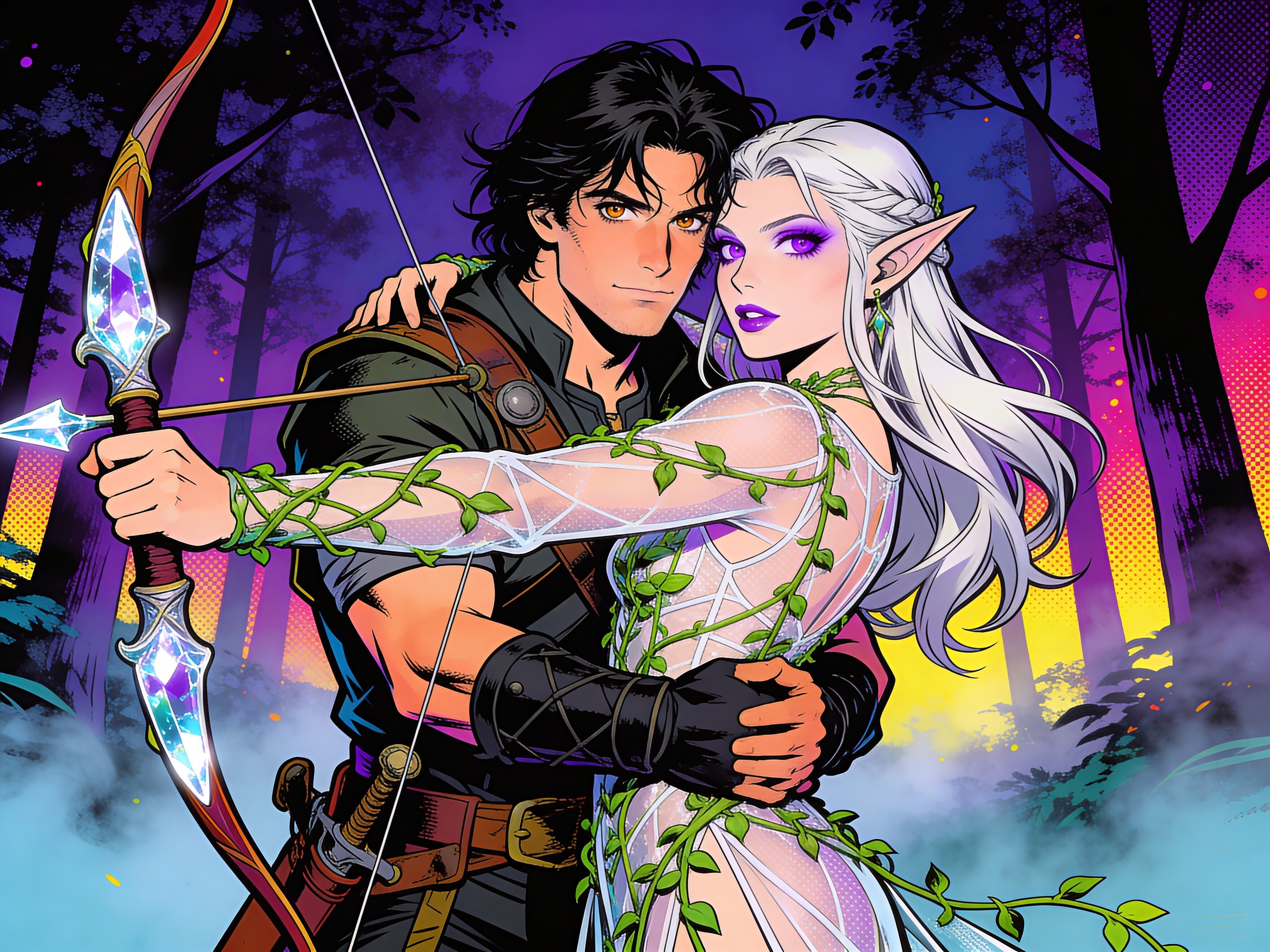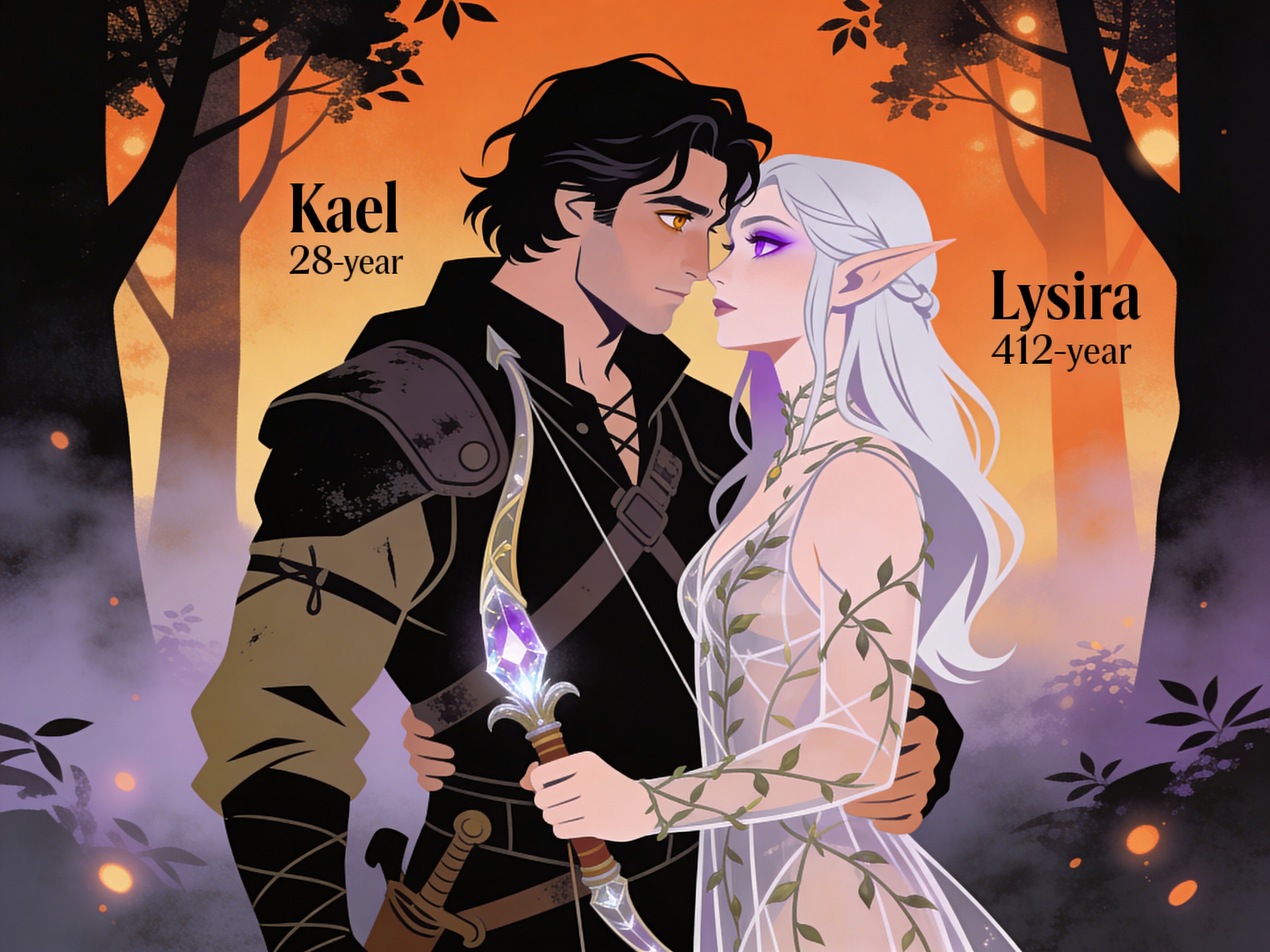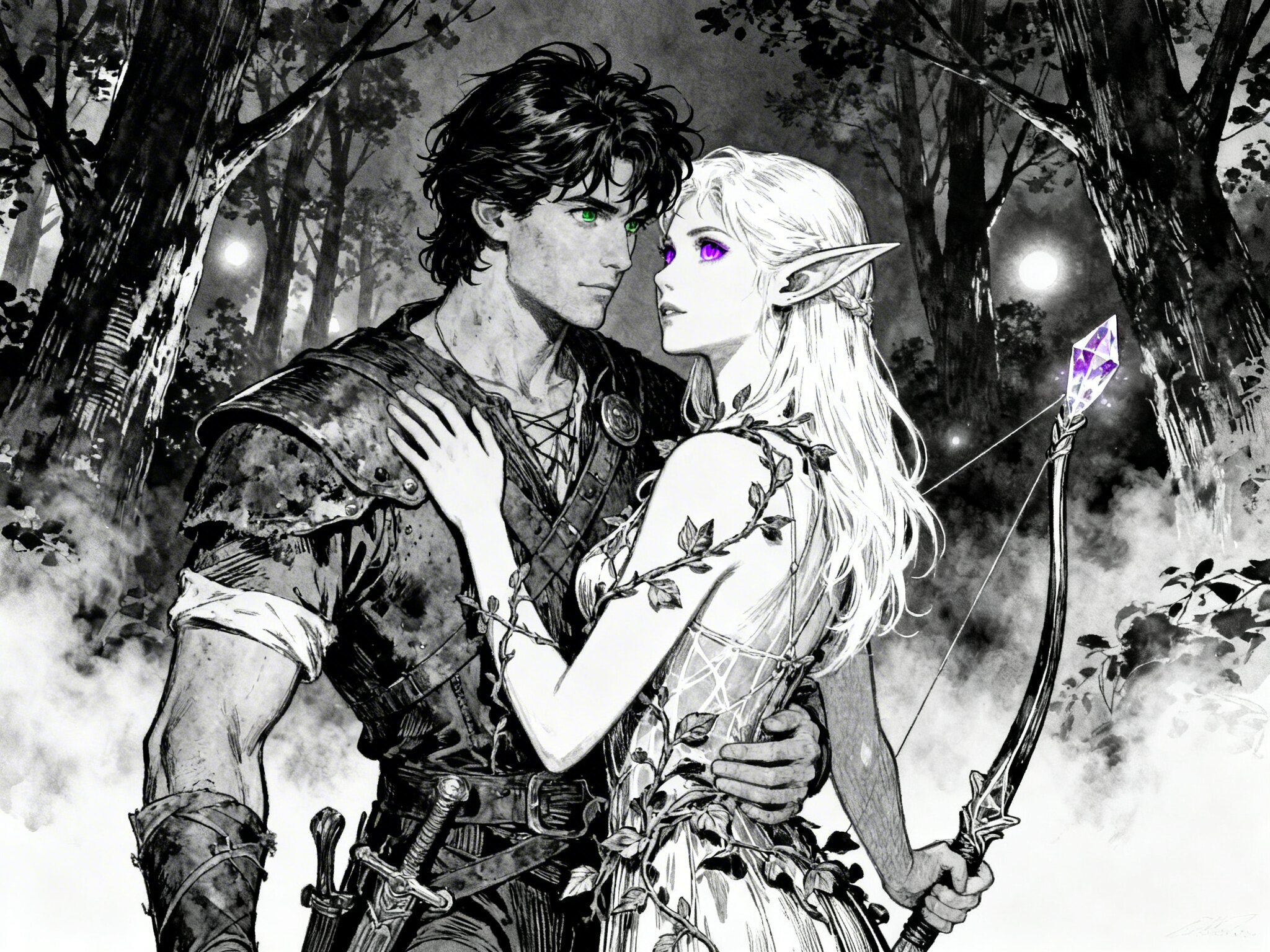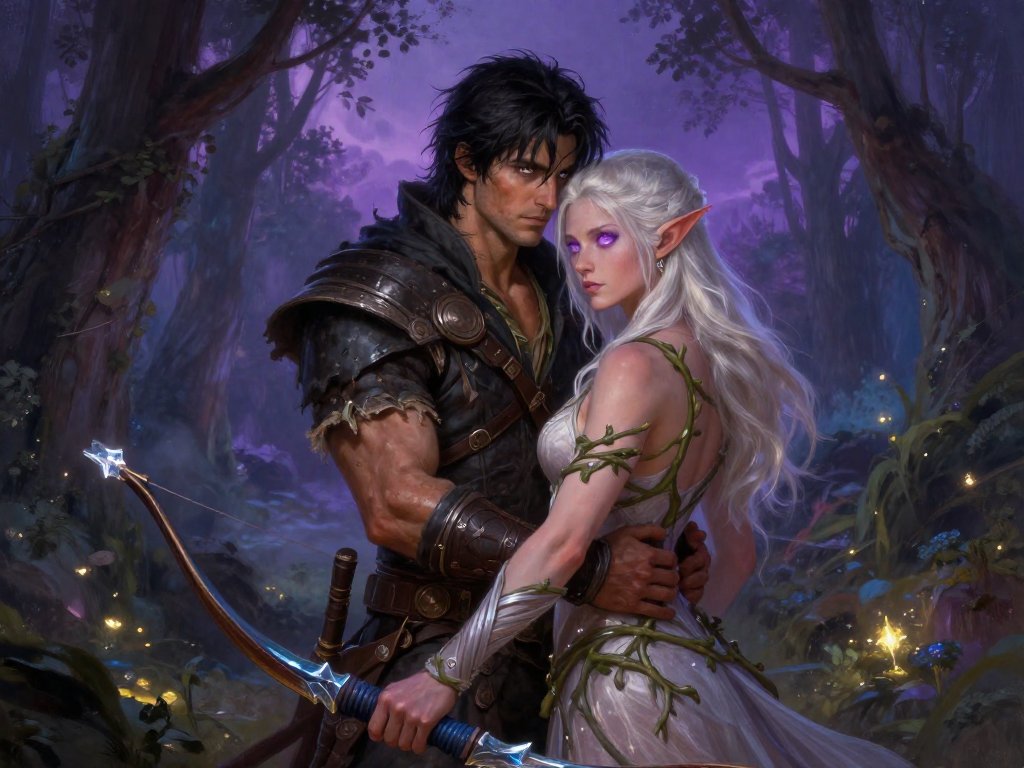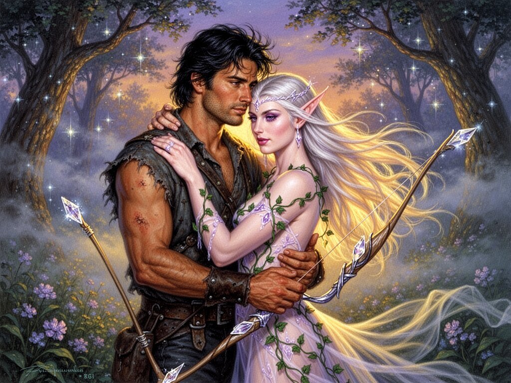 Kael: rugged man, 28 y.o, tousled black hair, hazel eyes, worn gear; Lysira: elf woman, 412 y.o, platinum hair, violet eyes, sheer vine dress, holding crystal-tipped bow; deep embrace in twilight grove with mist and glowing trees