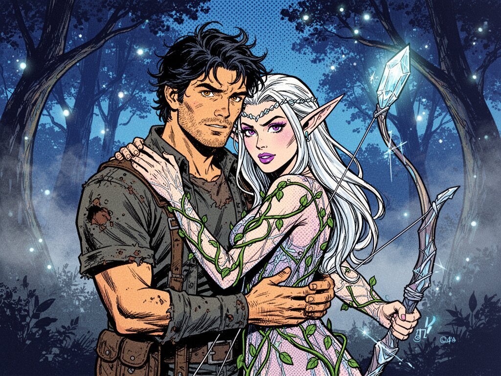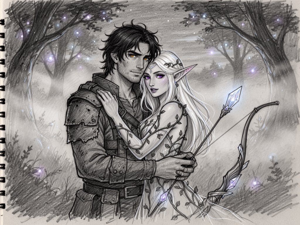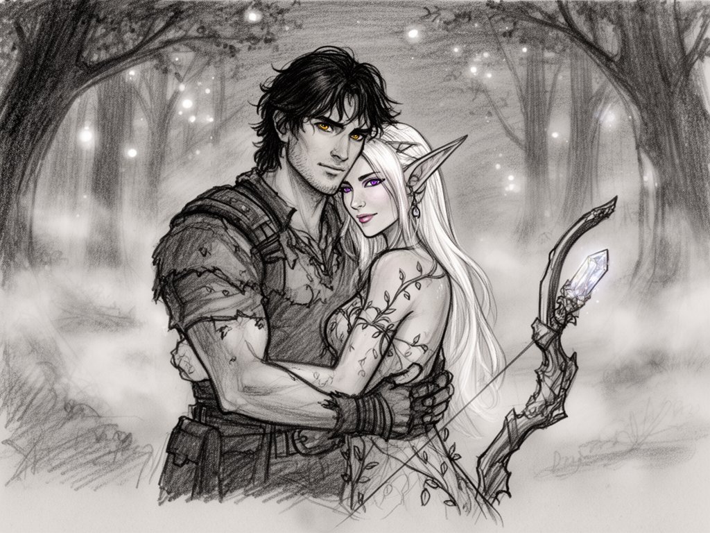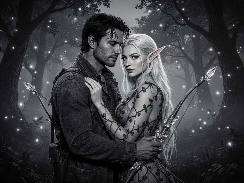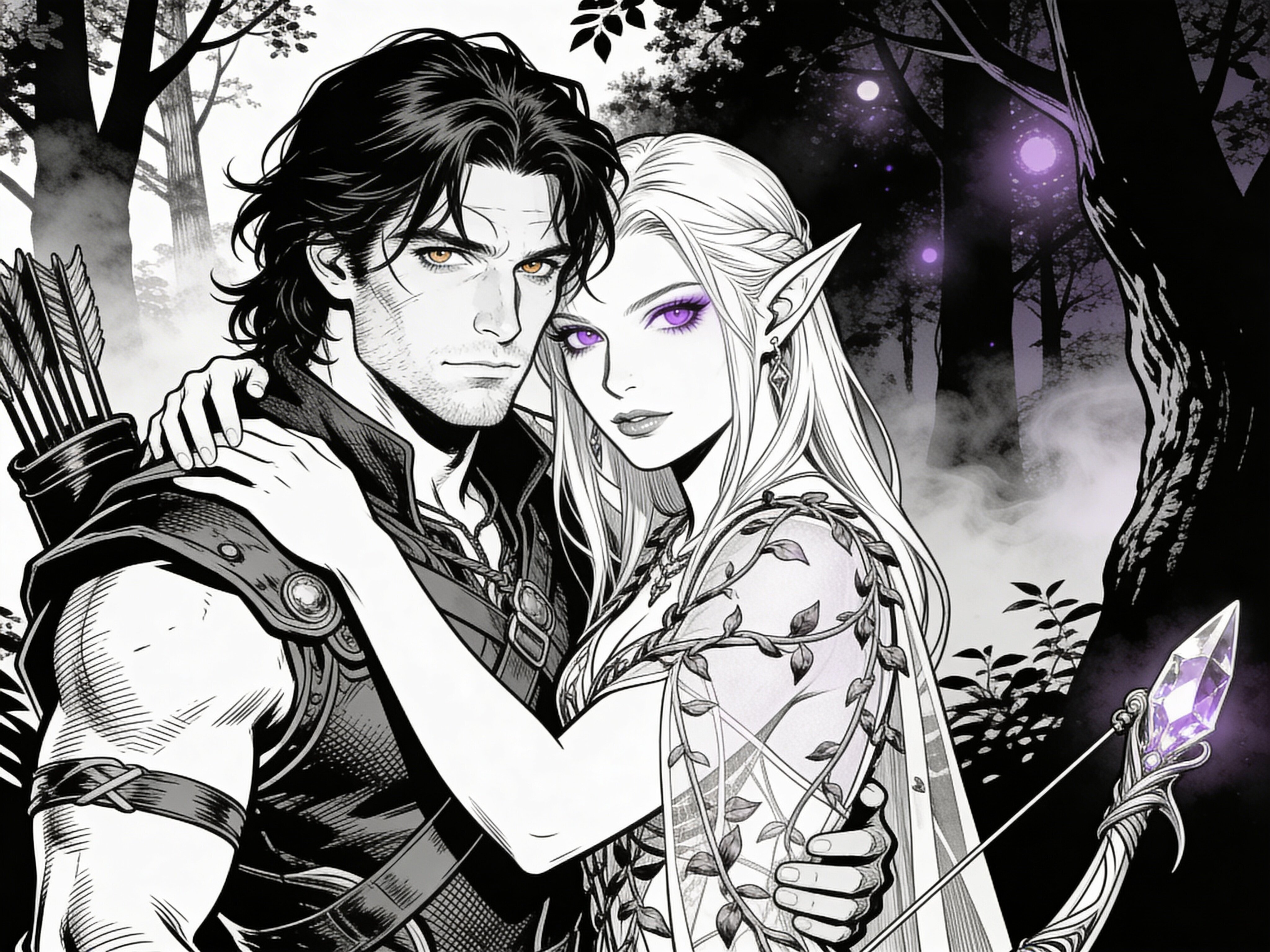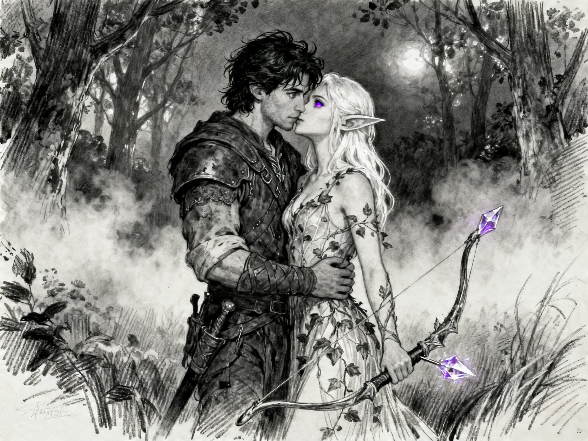 Kael: rugged man, 28 y.o, tousled black hair, hazel eyes, worn gear; Lysira: elf woman, 412 y.o, platinum hair, violet eyes, sheer vine dress, holding crystal-tipped bow; deep embrace in twilight grove with mist and glowing trees