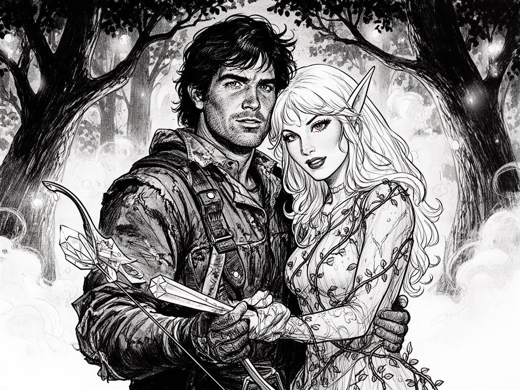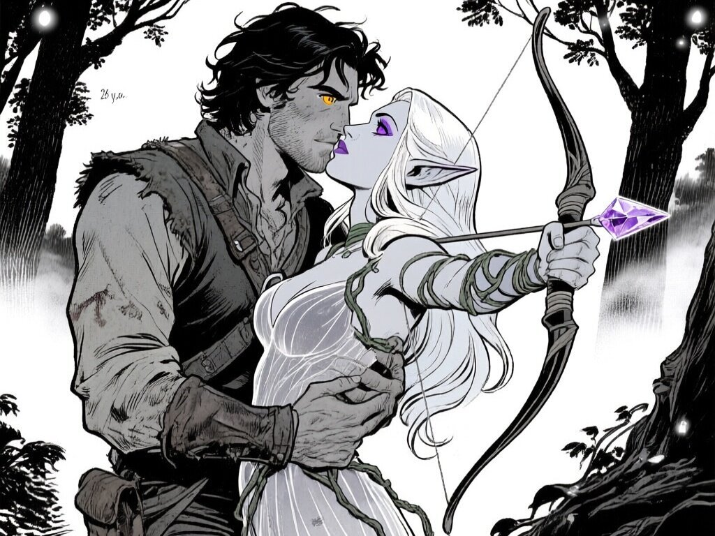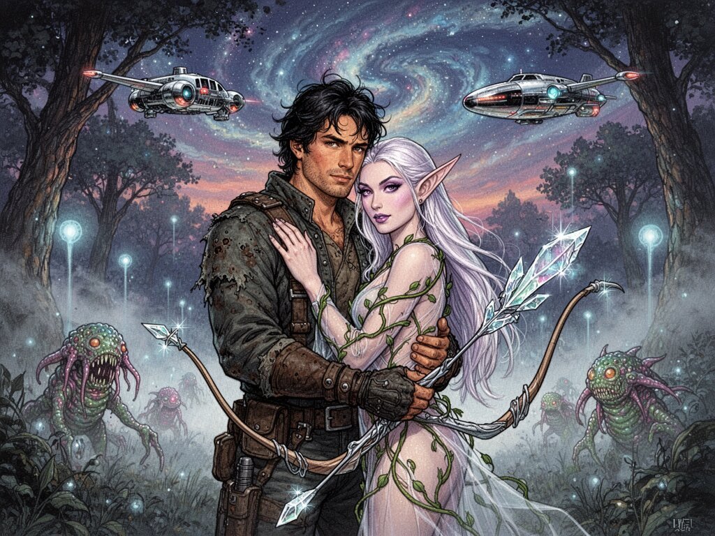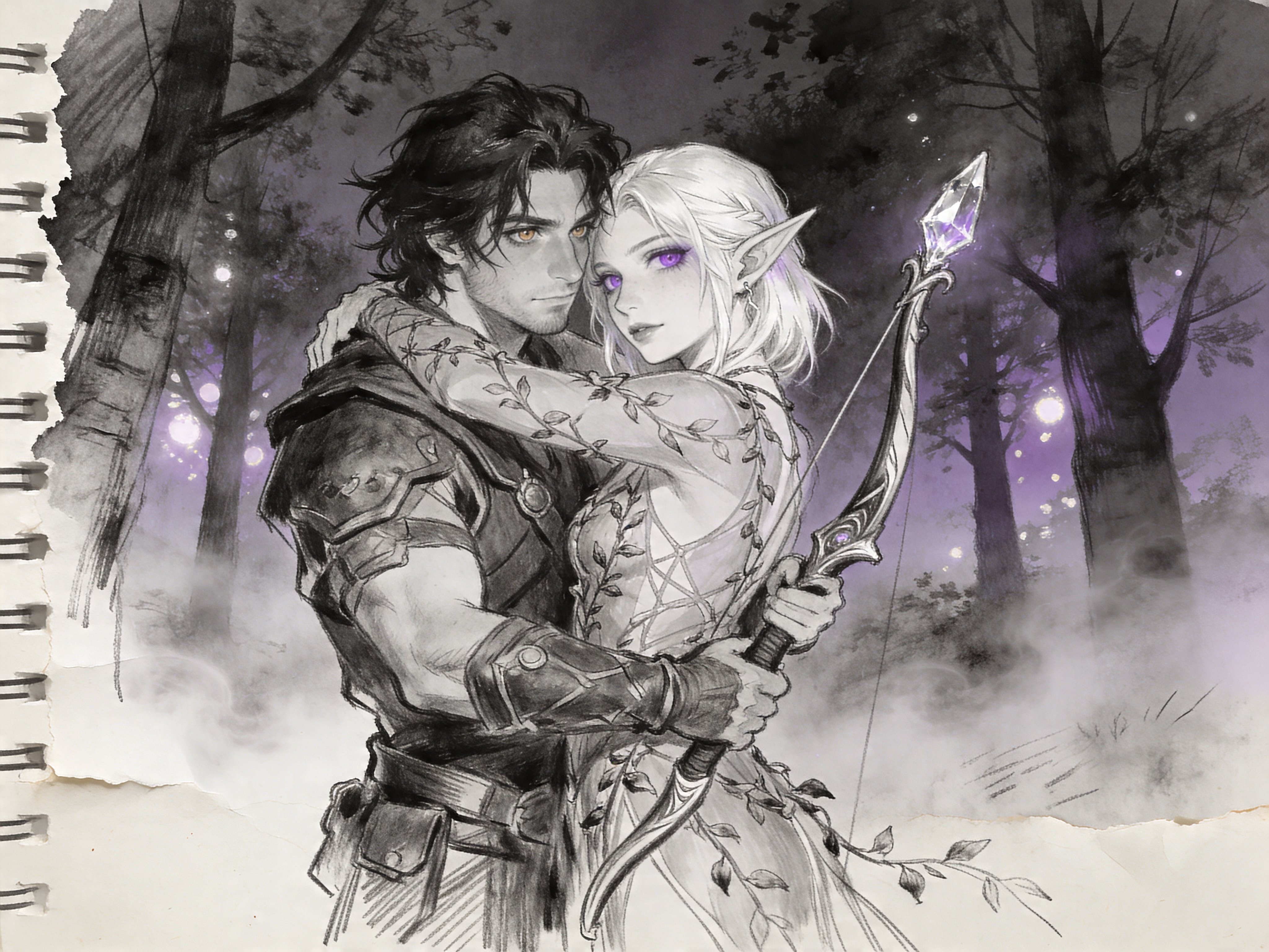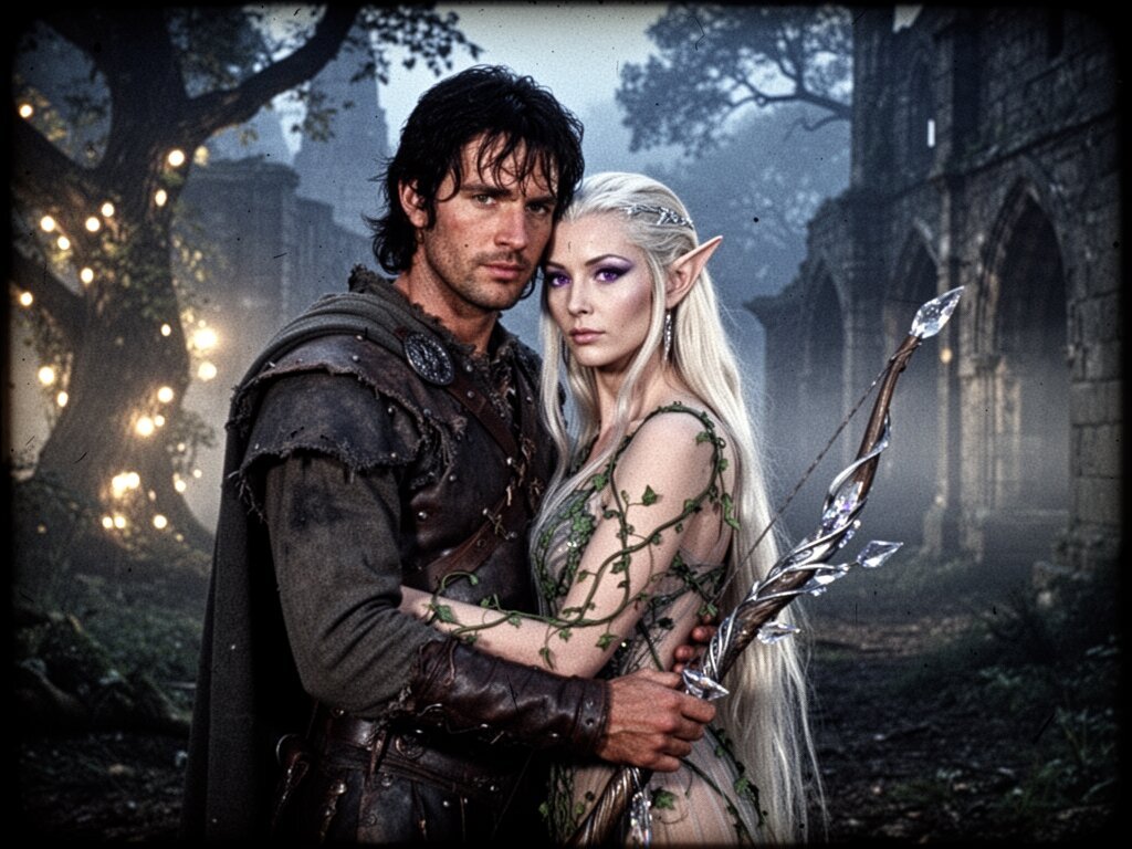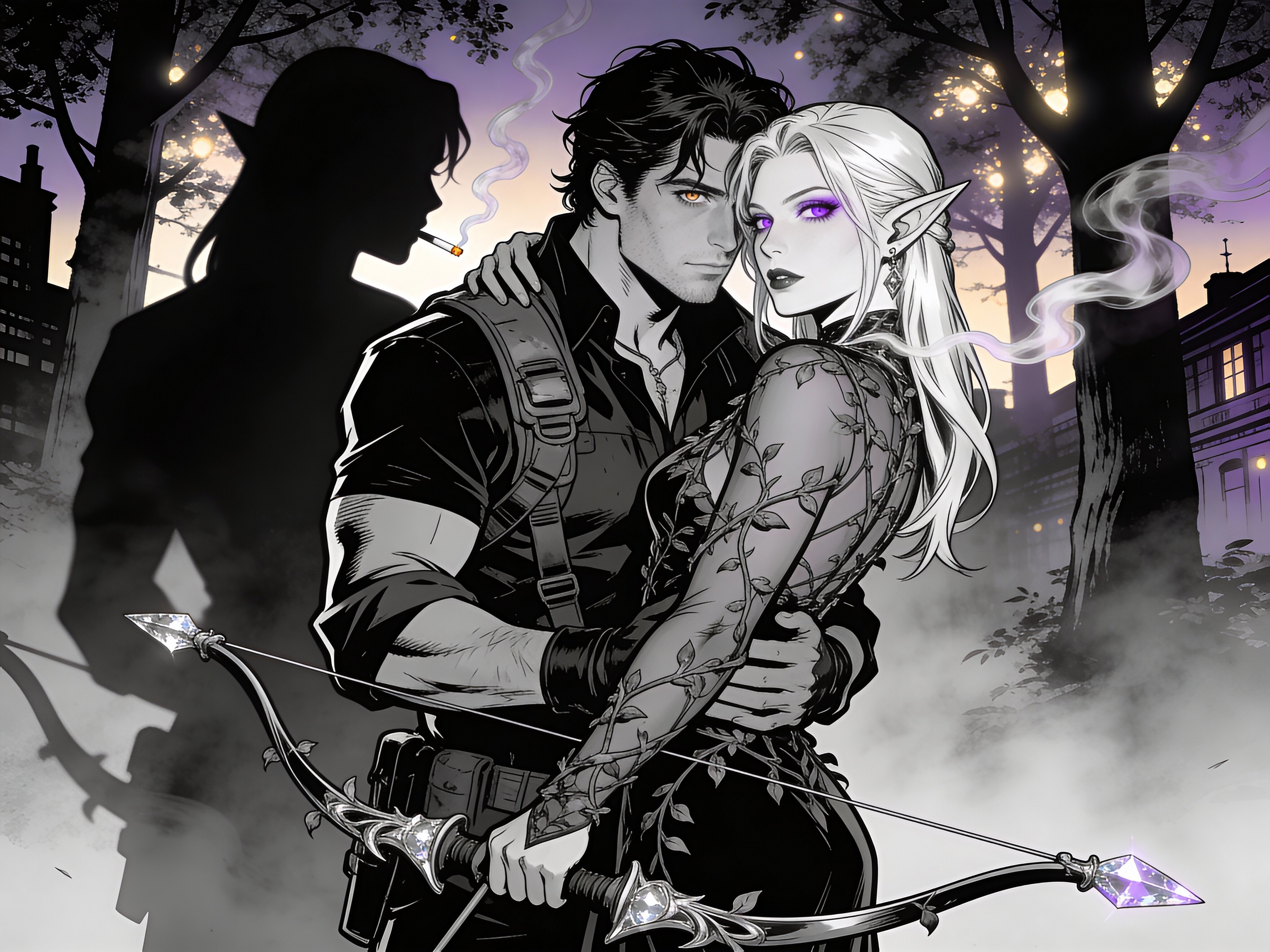 Kael: rugged man, 28 y.o, tousled black hair, hazel eyes, worn gear; Lysira: elf woman, 412 y.o, platinum hair, violet eyes, sheer vine dress, holding crystal-tipped bow; deep embrace in twilight grove with mist and glowing trees