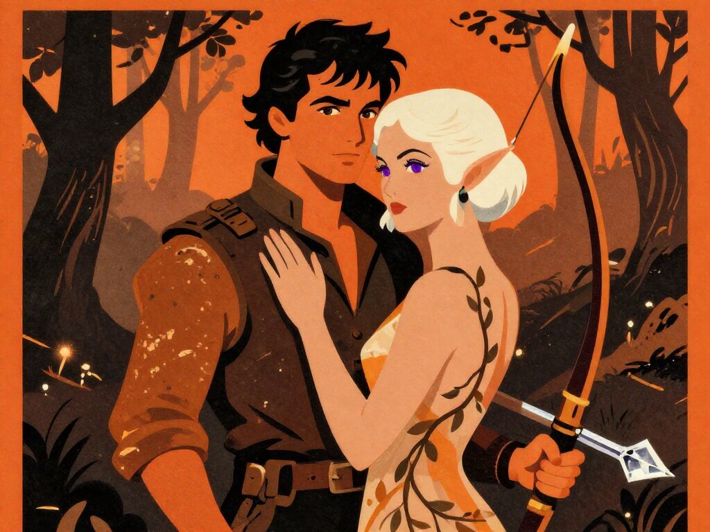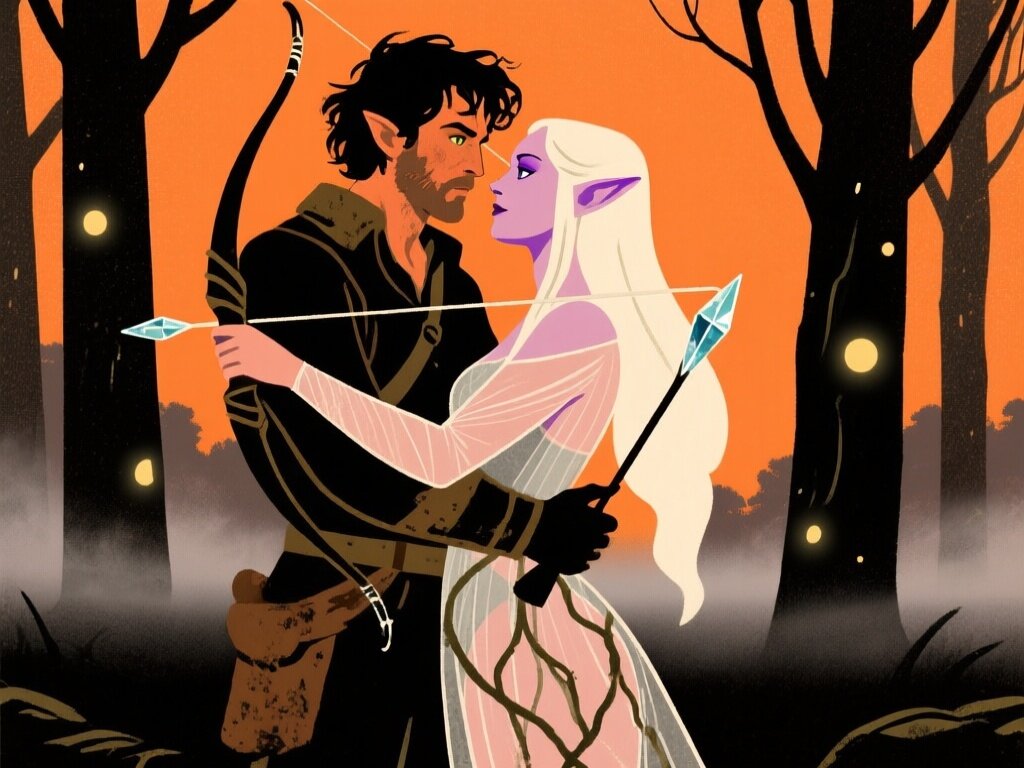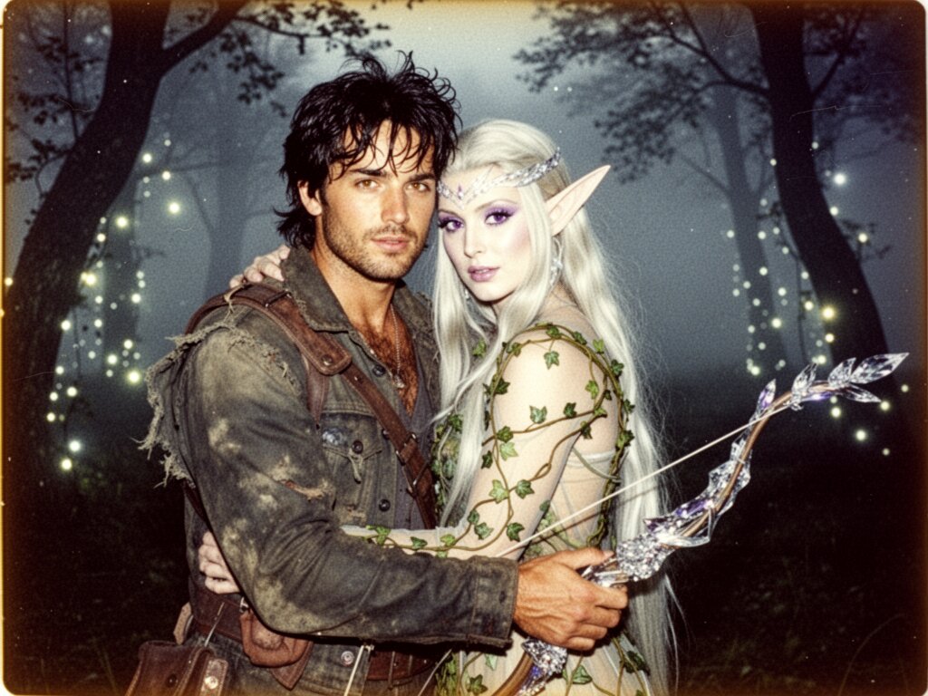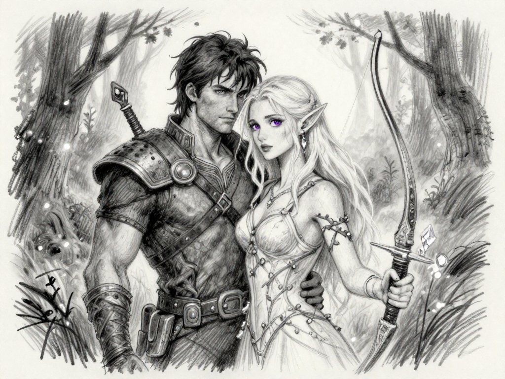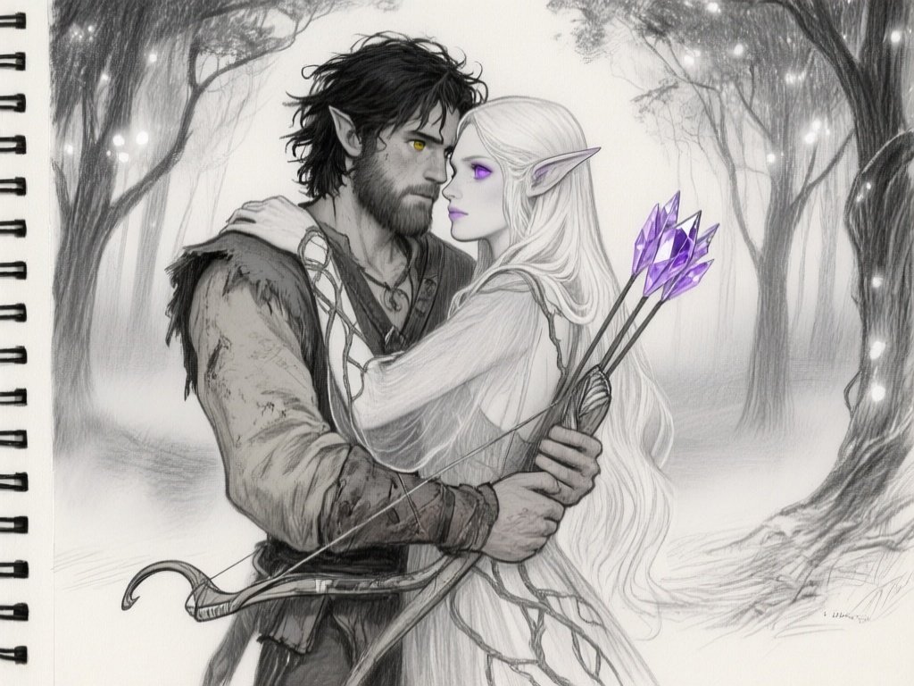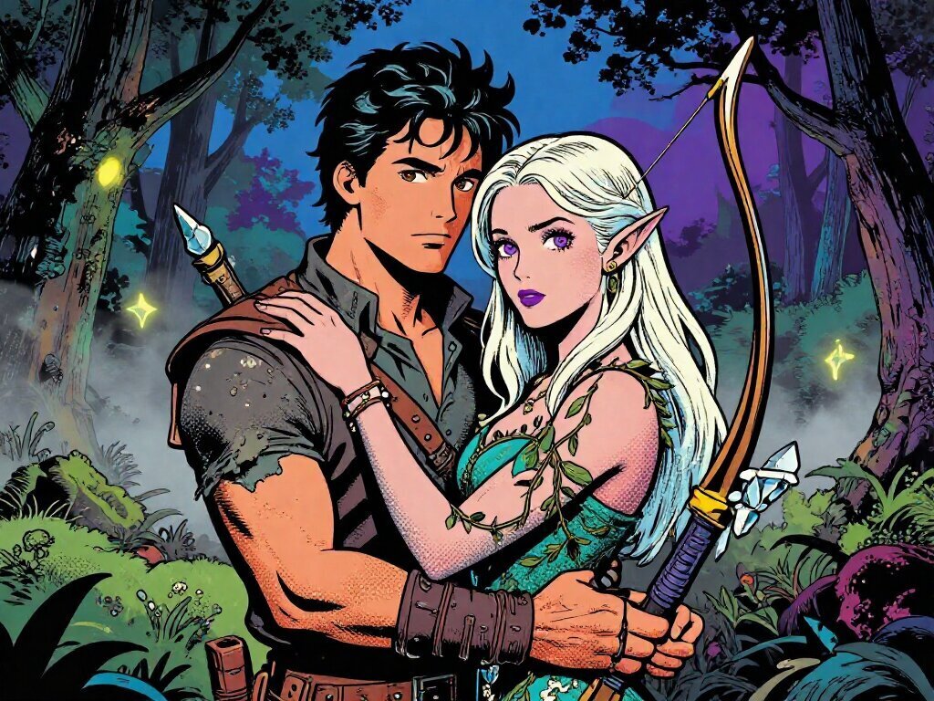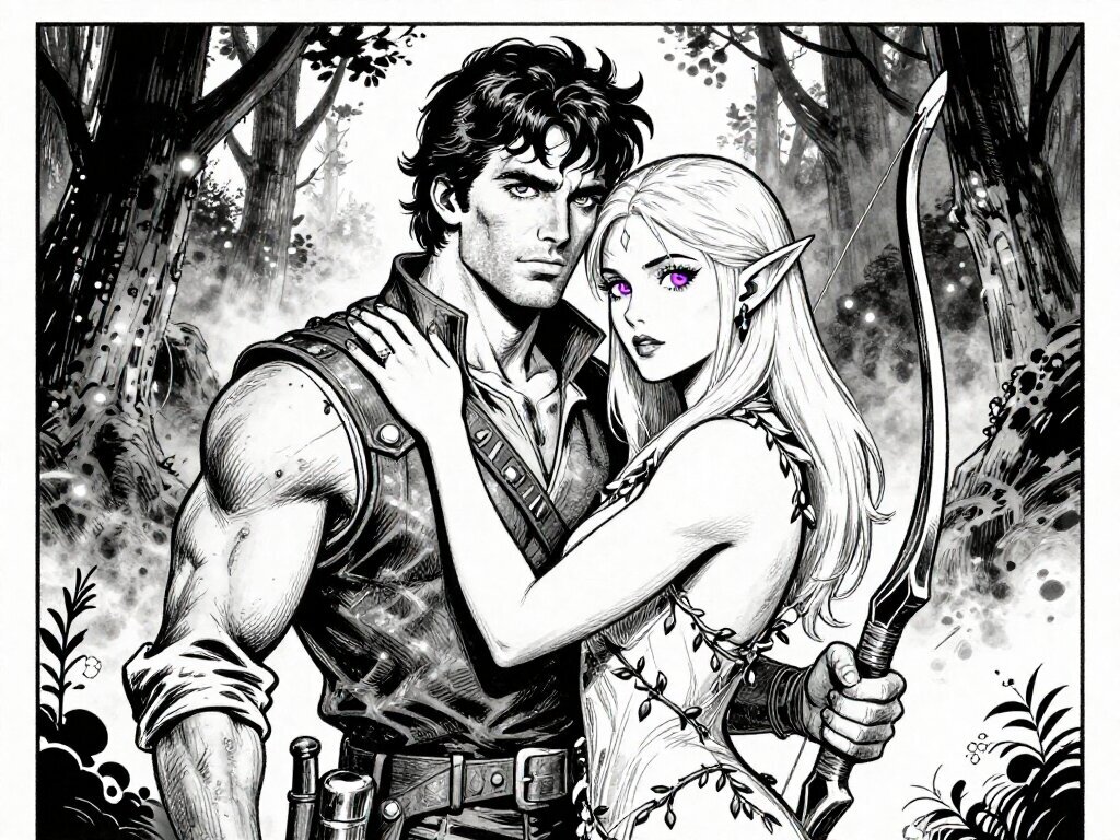 Kael: rugged man, 28 y.o, tousled black hair, hazel eyes, worn gear; Lysira: elf woman, 412 y.o, platinum hair, violet eyes, sheer vine dress, holding crystal-tipped bow; deep embrace in twilight grove with mist and glowing trees