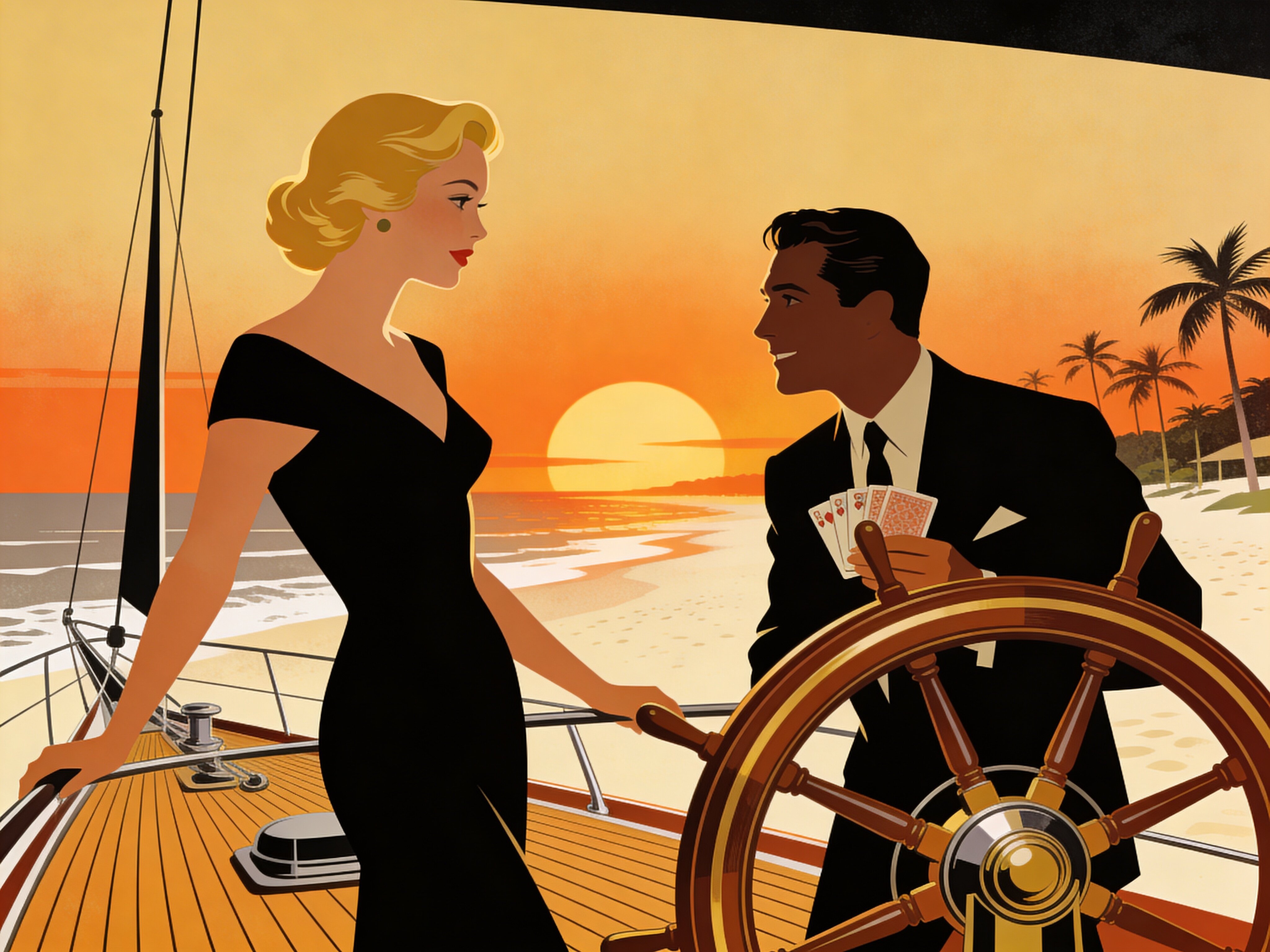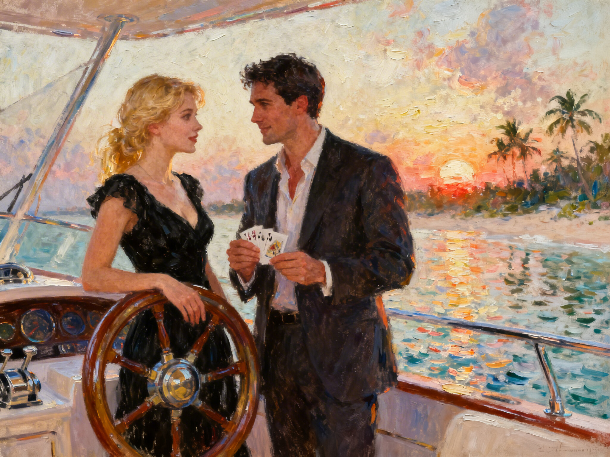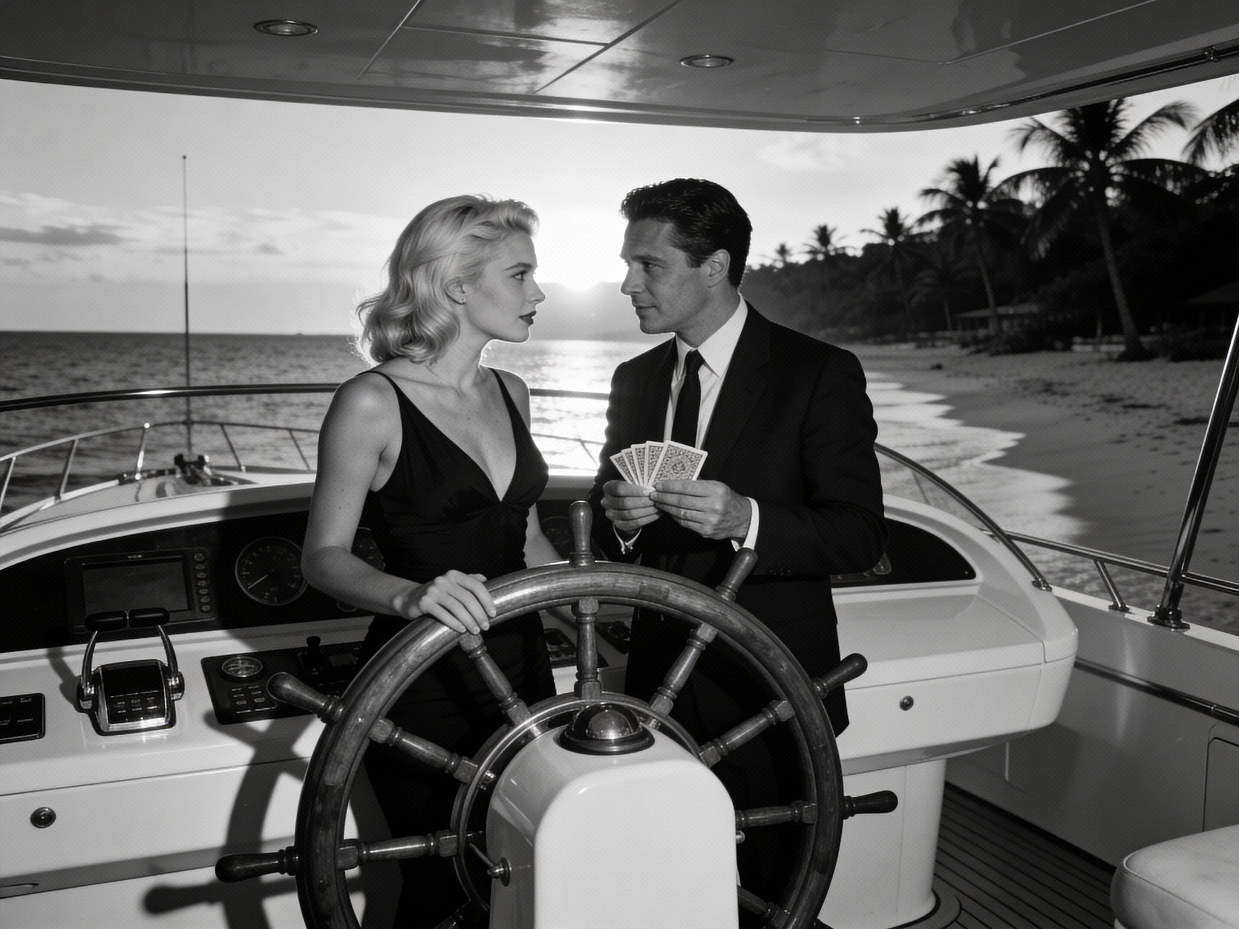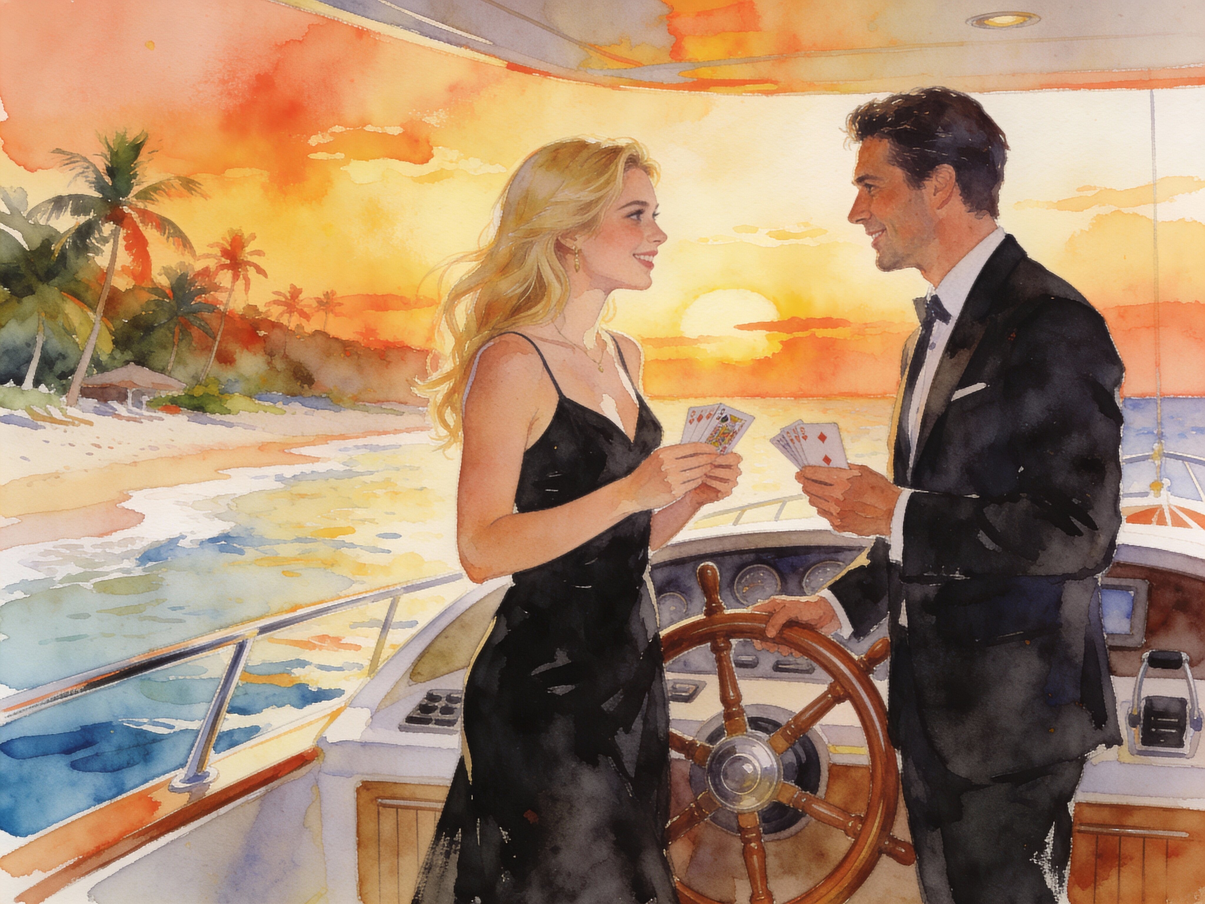 Lisa, 20 y.o blonde woman in black dress; Jason, 35 y.o man with short dark hair in suit, holding cards, flirtatious look; standing by luxury yacht wheel at sunset, tropical beach in background