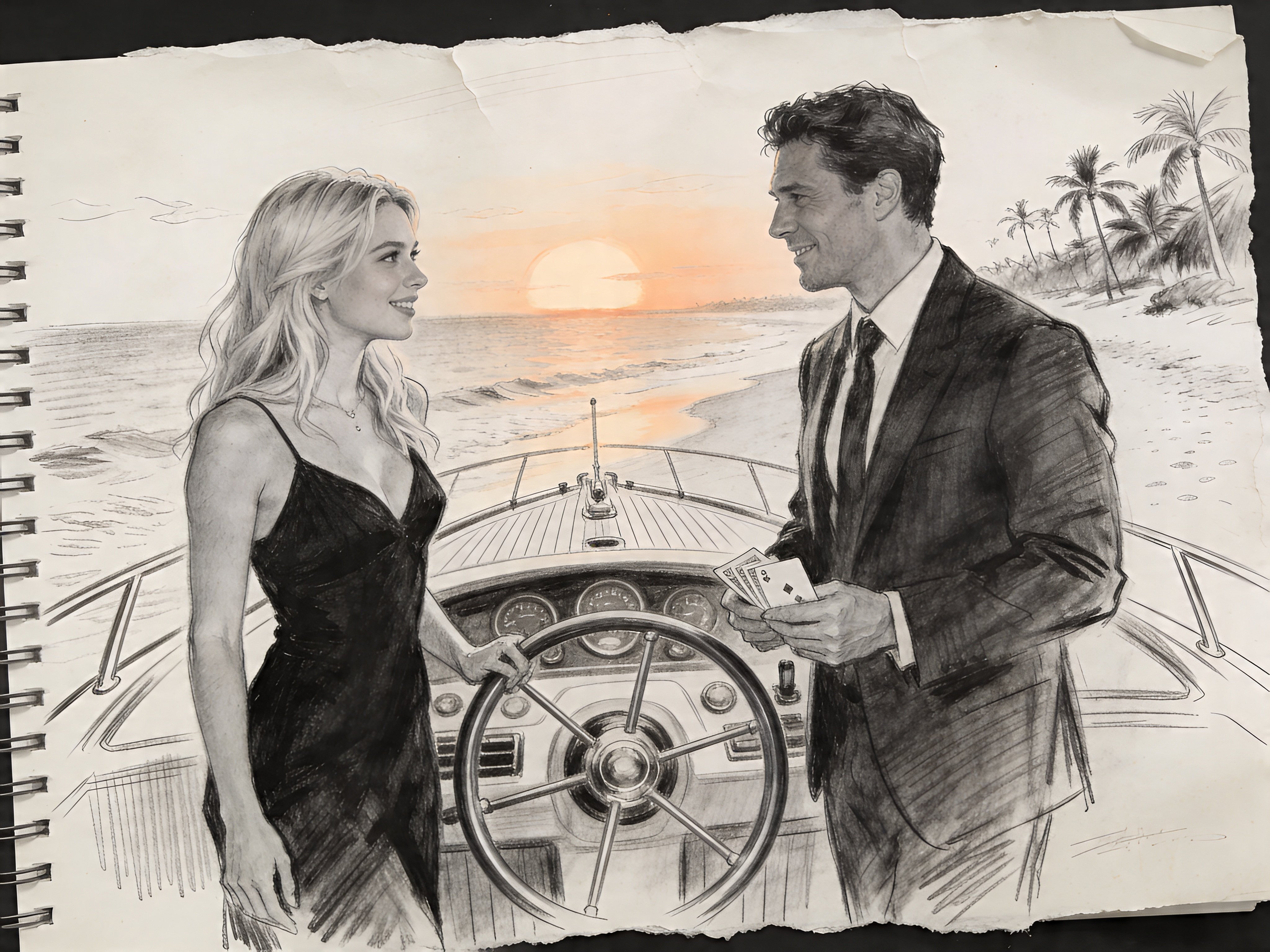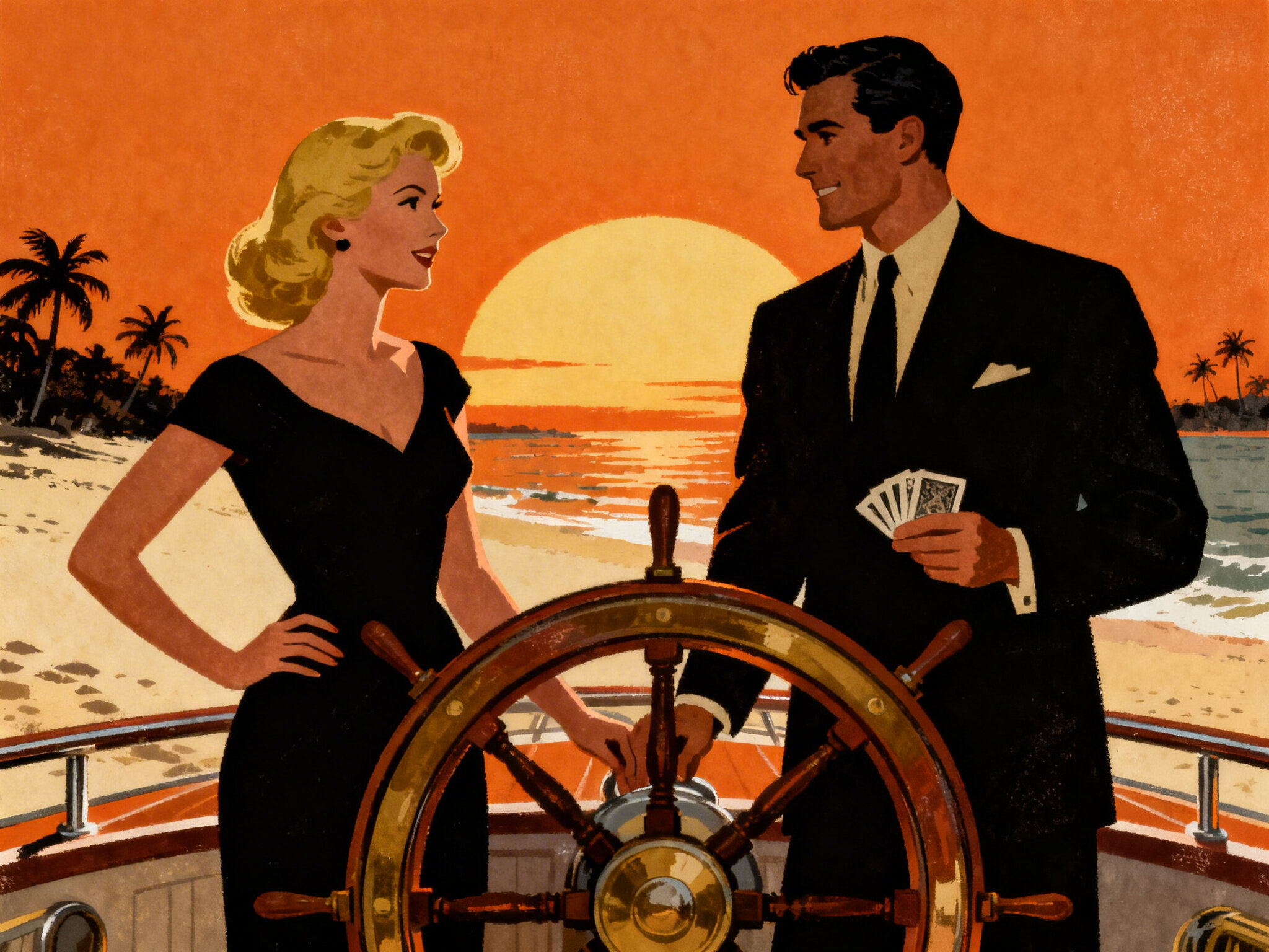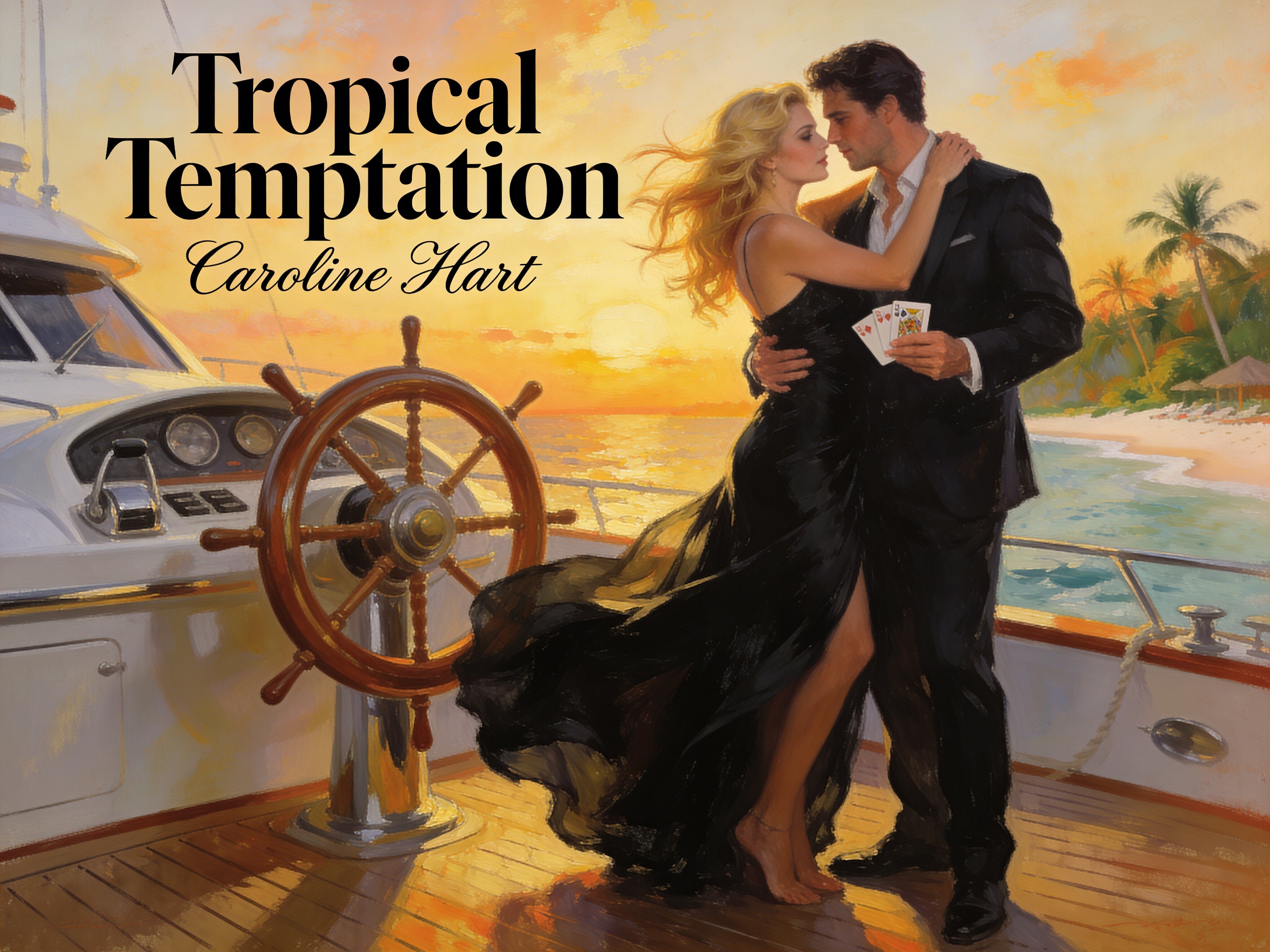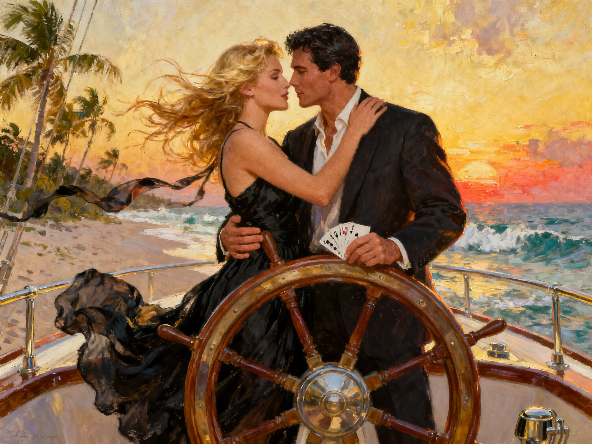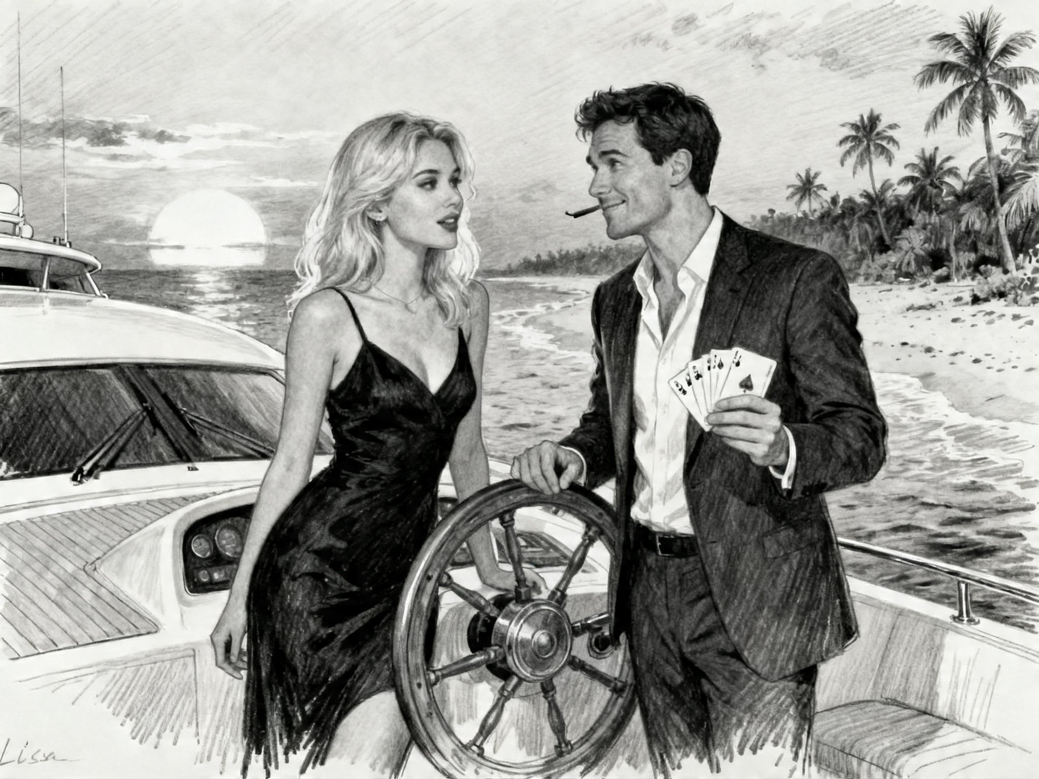 Lisa, 20 y.o blonde woman in black dress; Jason, 35 y.o man with short dark hair in suit, holding cards, flirtatious look; standing by luxury yacht wheel at sunset, tropical beach in background