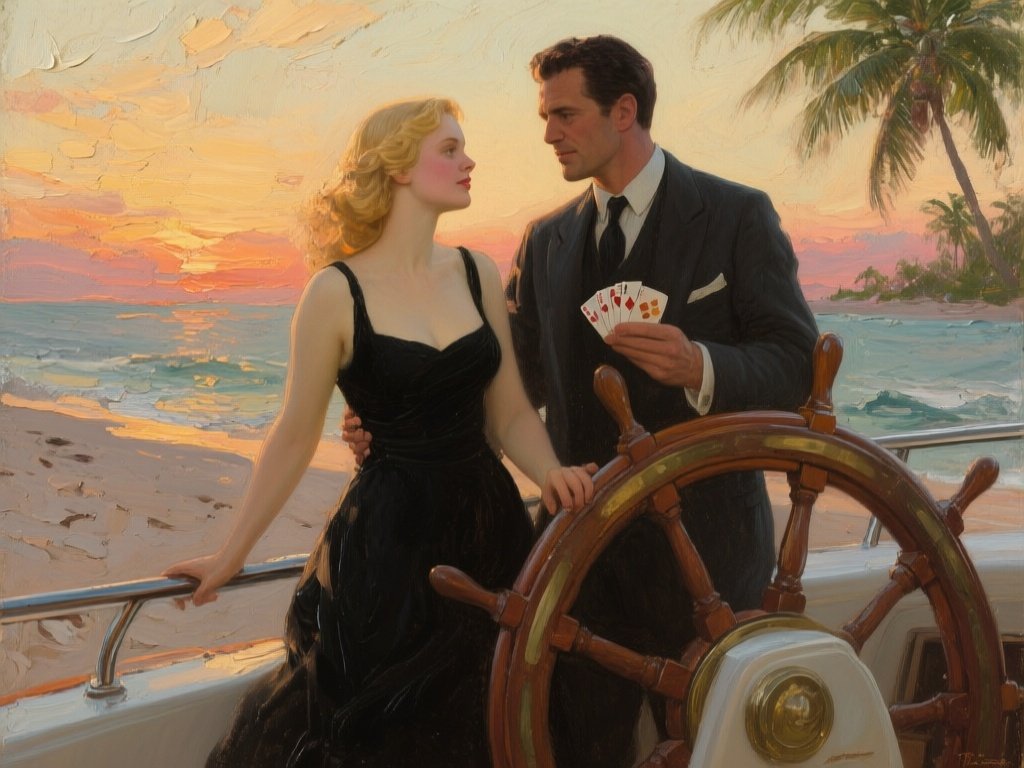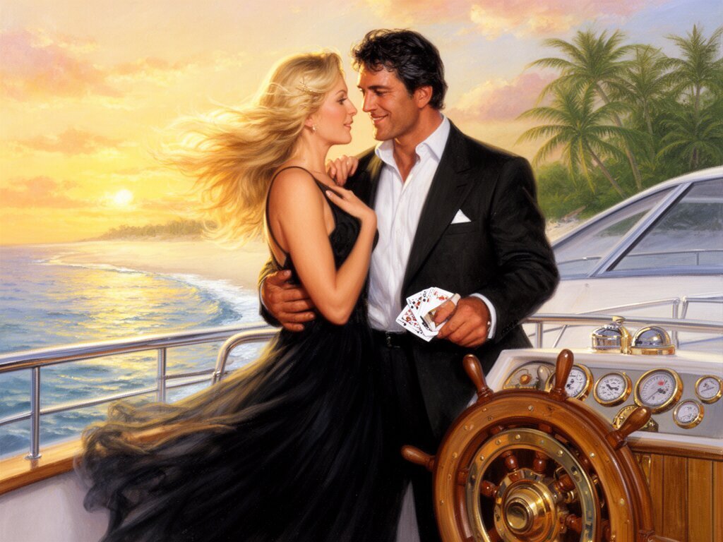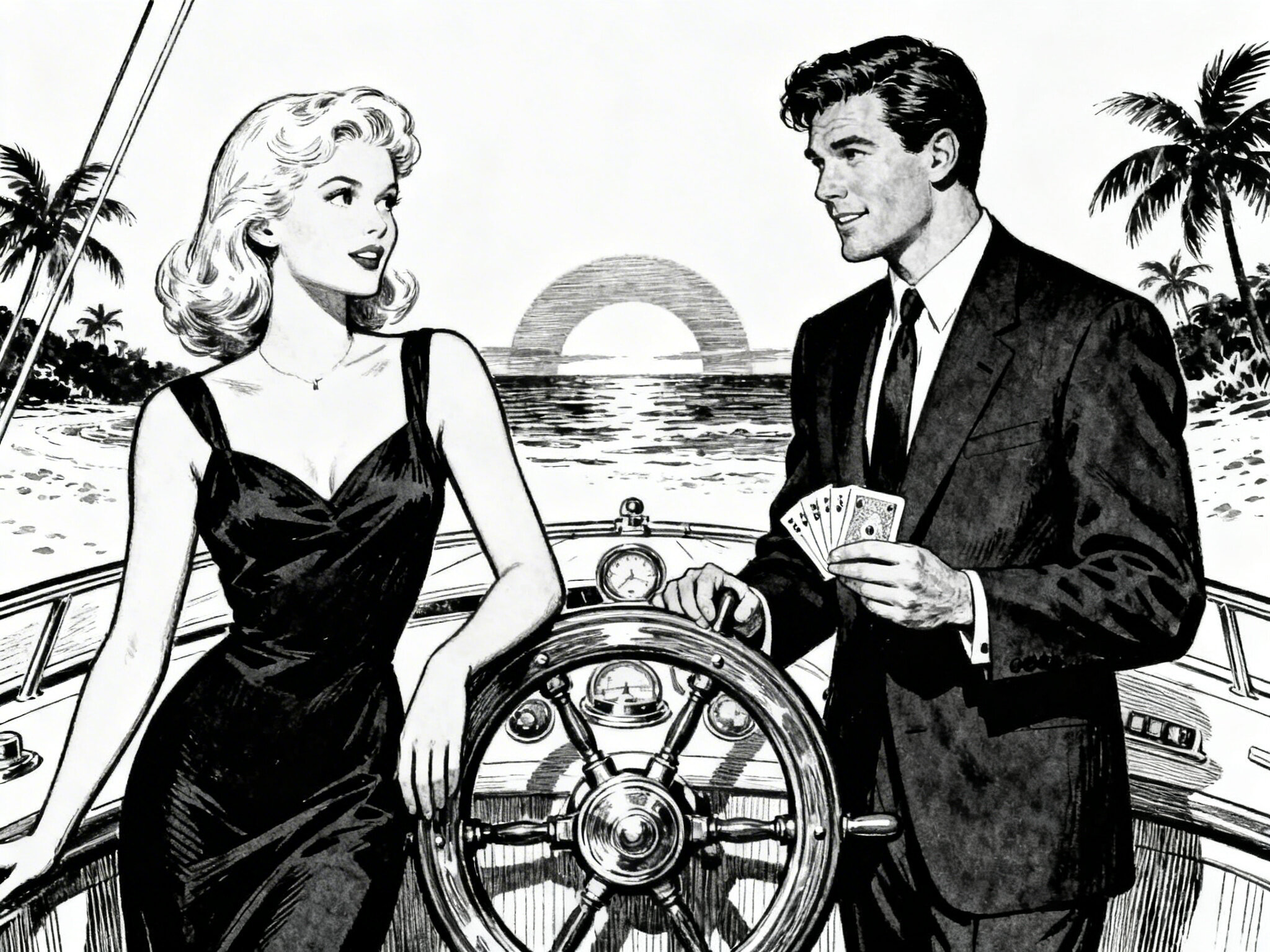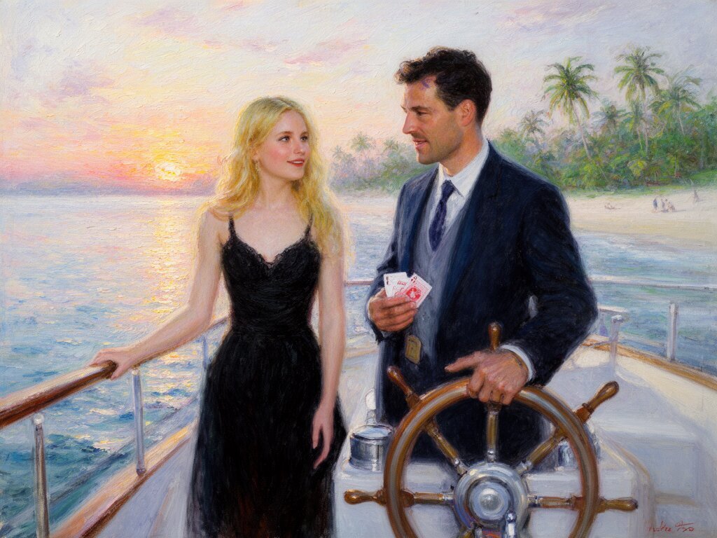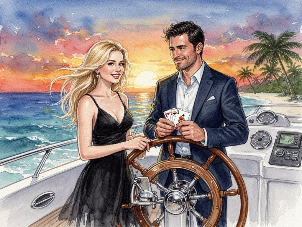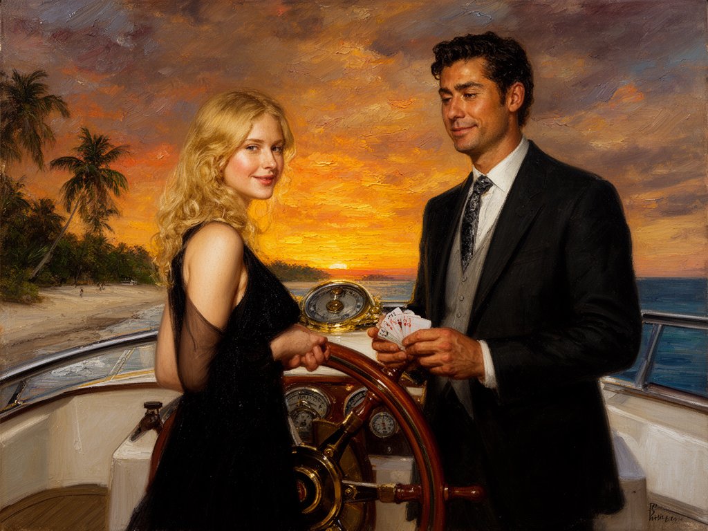 Lisa, 20 y.o blonde woman in black dress; Jason, 35 y.o man with short dark hair in suit, holding cards, flirtatious look; standing by luxury yacht wheel at sunset, tropical beach in background