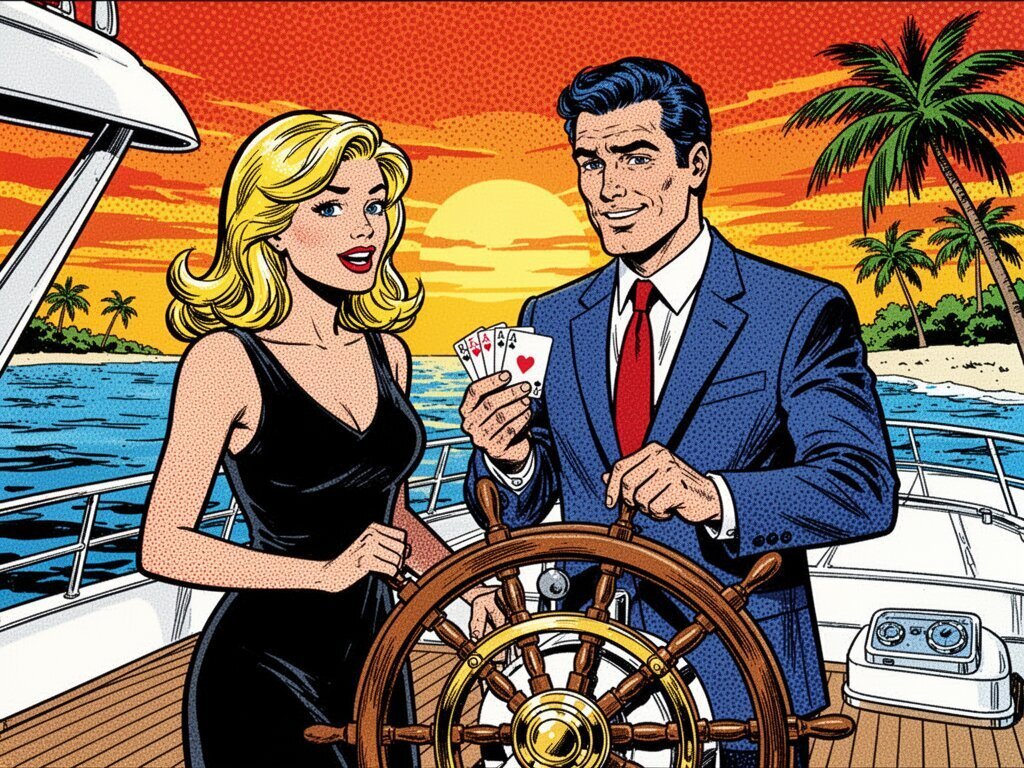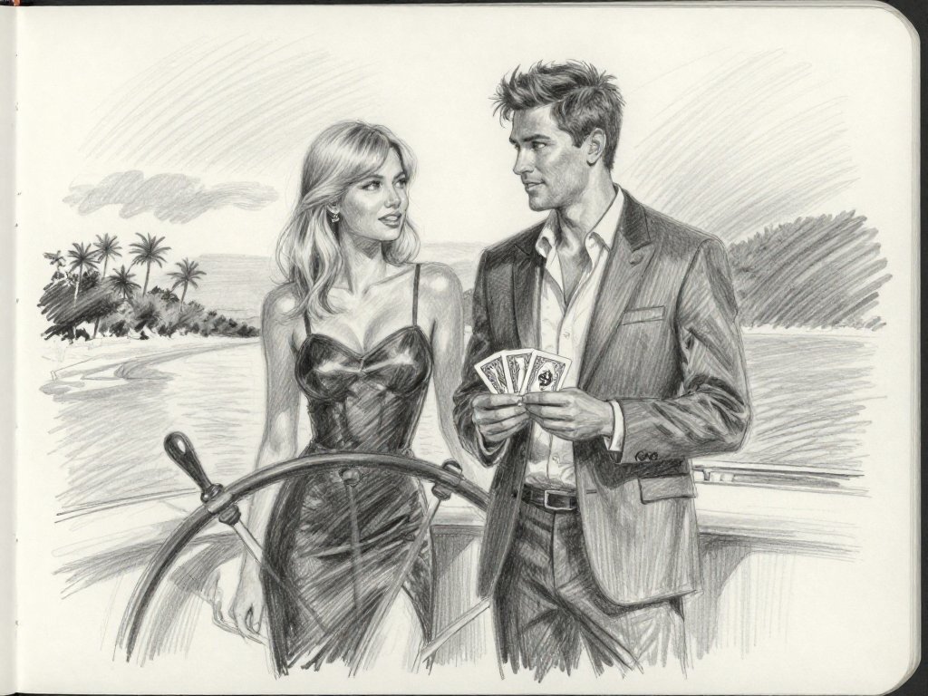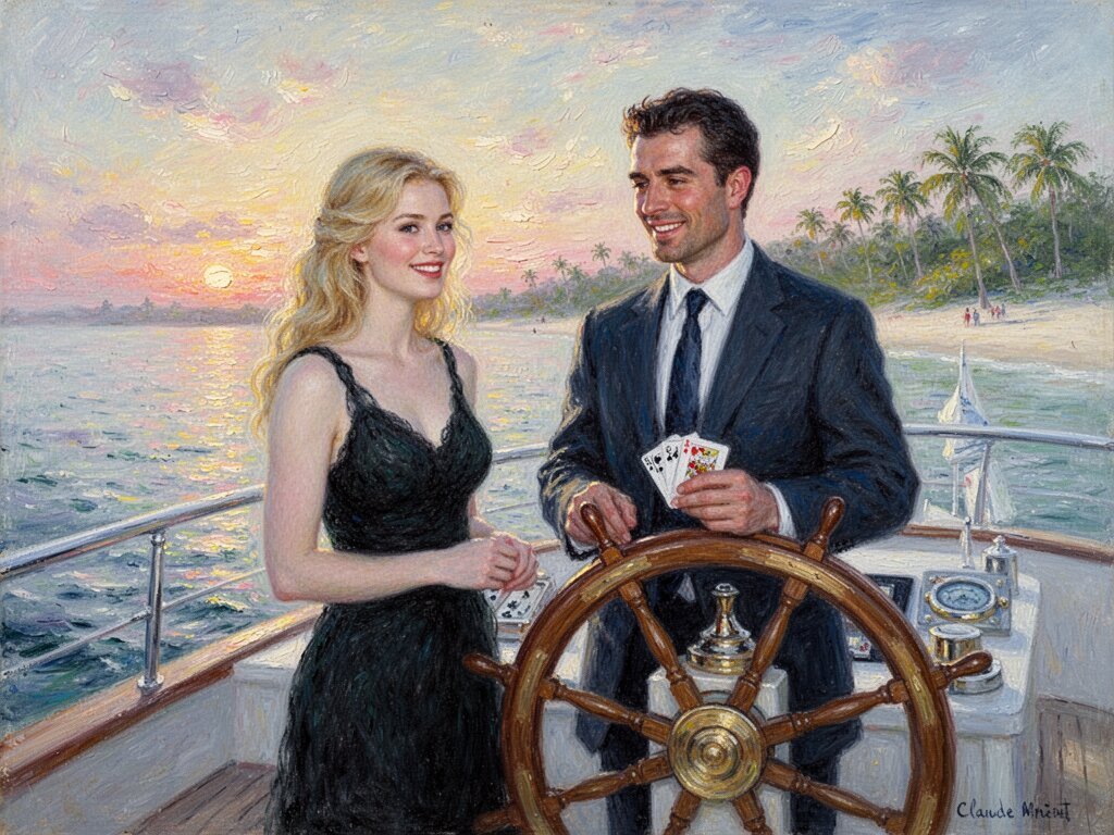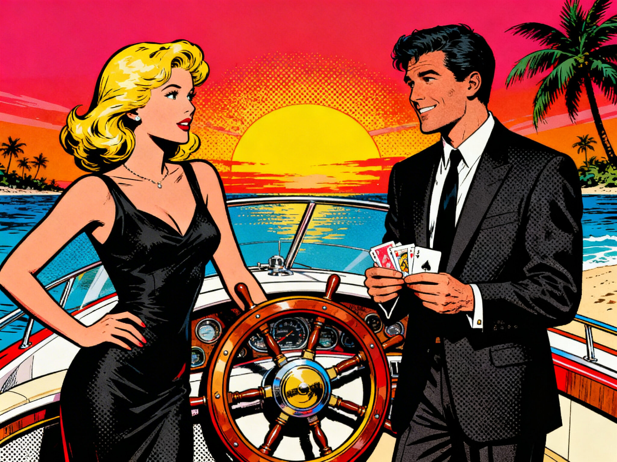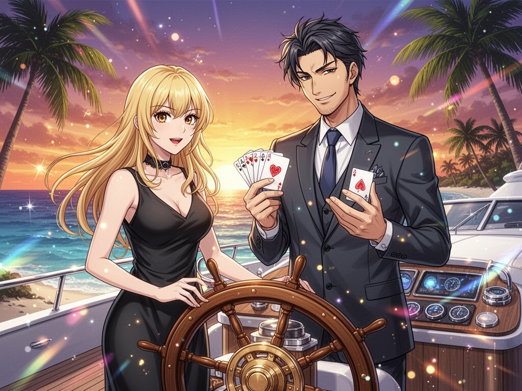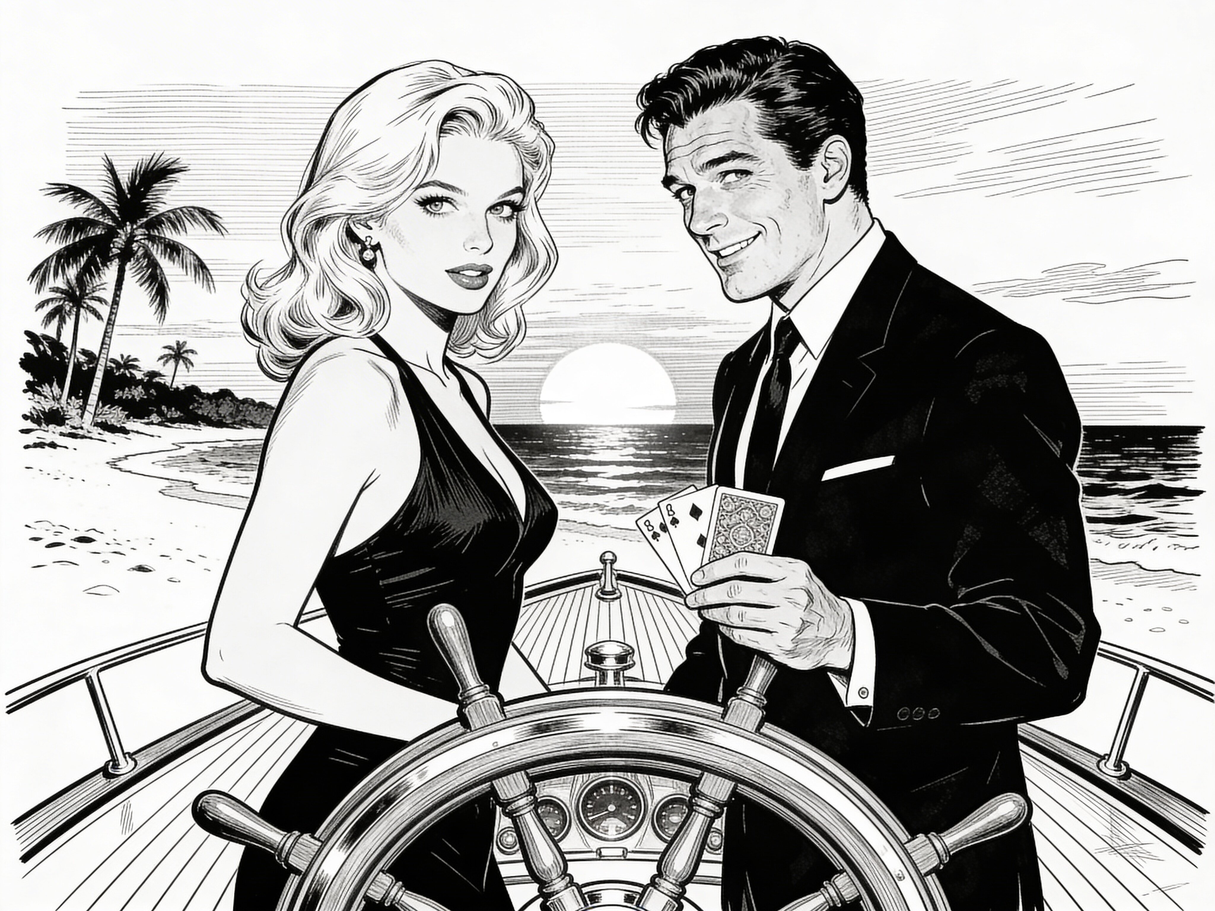 Lisa, 20 y.o blonde woman in black dress; Jason, 35 y.o man with short dark hair in suit, holding cards, flirtatious look; standing by luxury yacht wheel at sunset, tropical beach in background