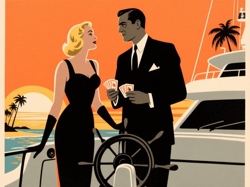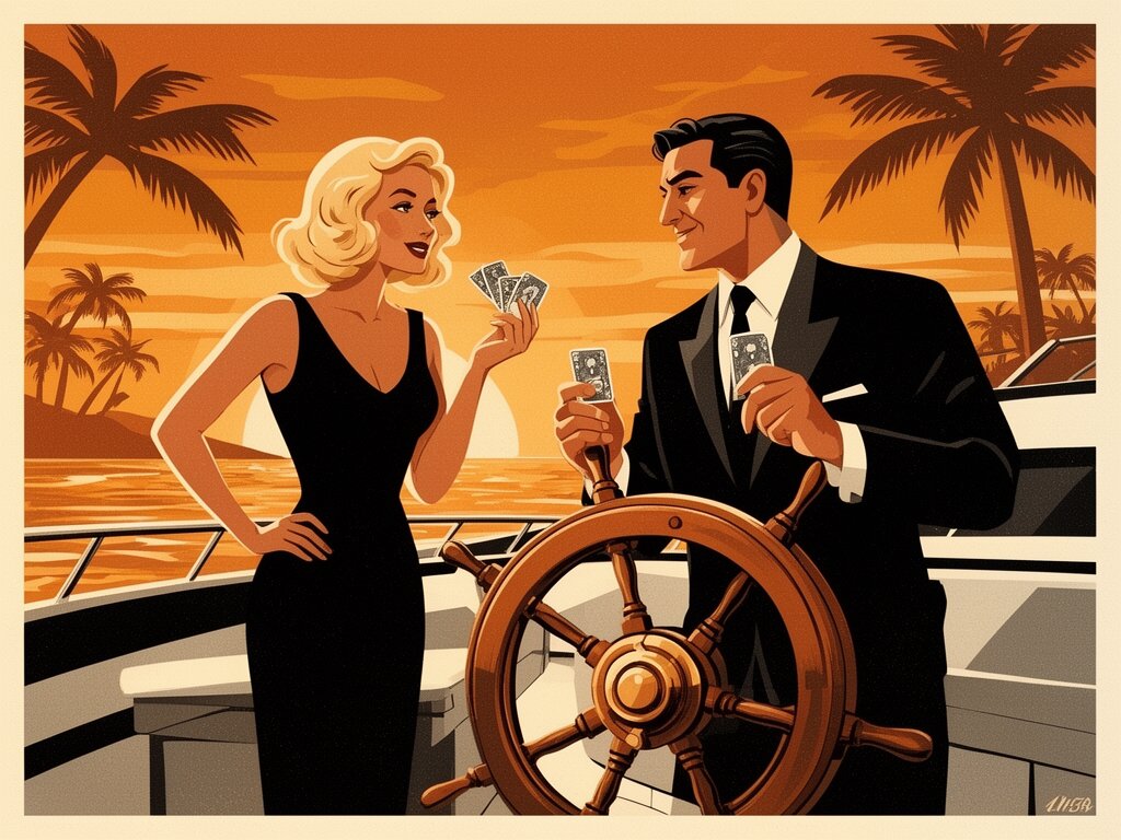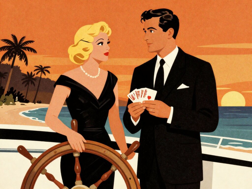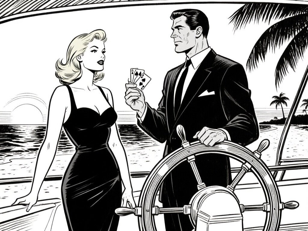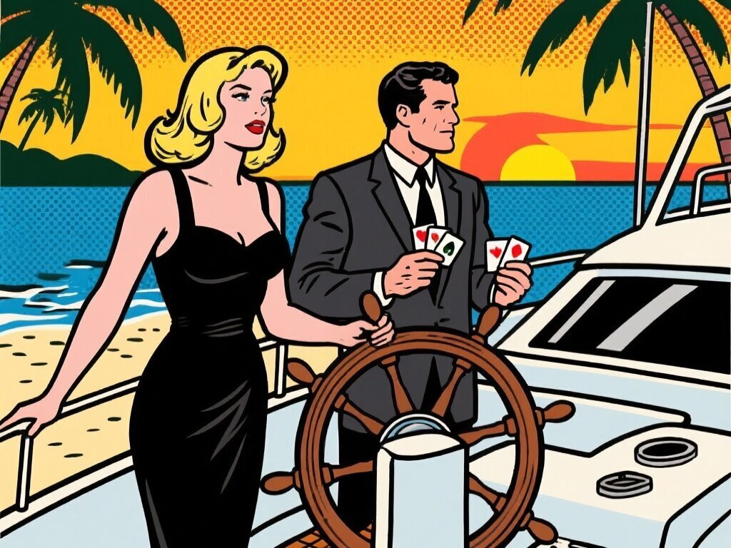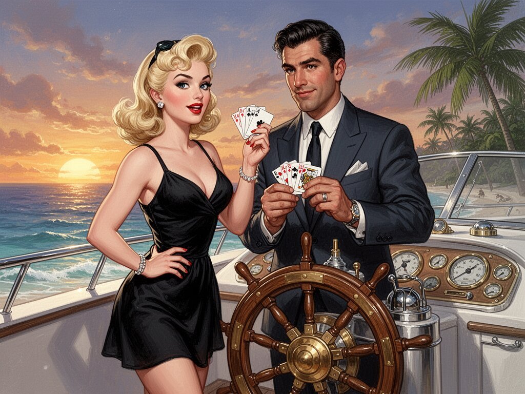 Lisa, 20 y.o blonde woman in black dress; Jason, 35 y.o man with short dark hair in suit, holding cards, flirtatious look; standing by luxury yacht wheel at sunset, tropical beach in background