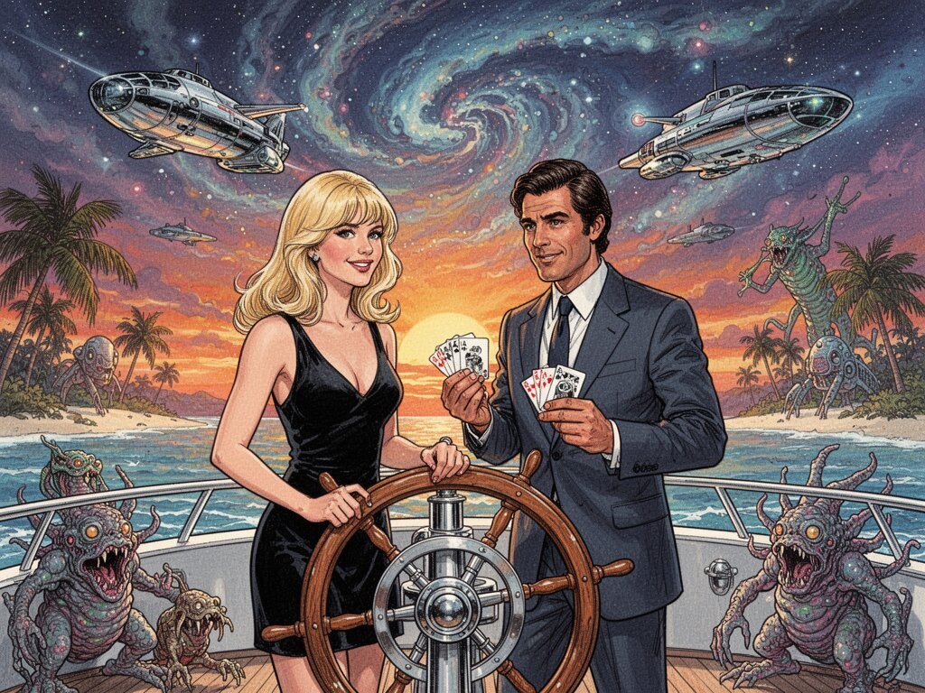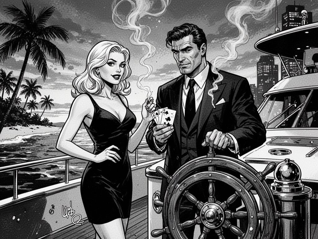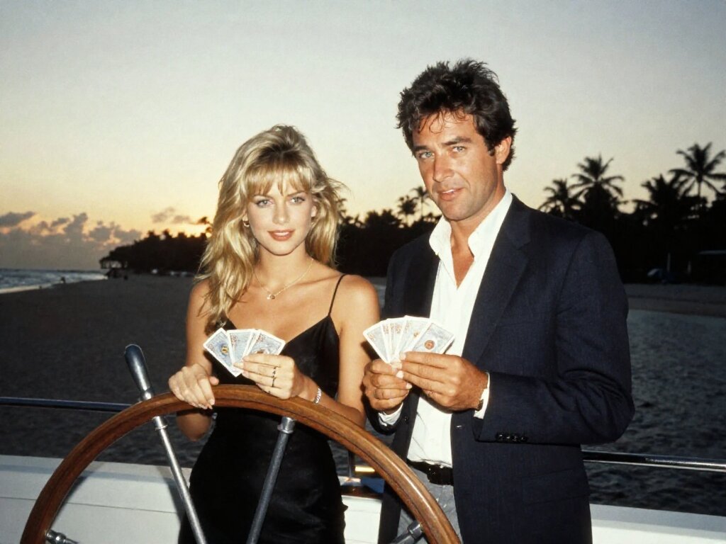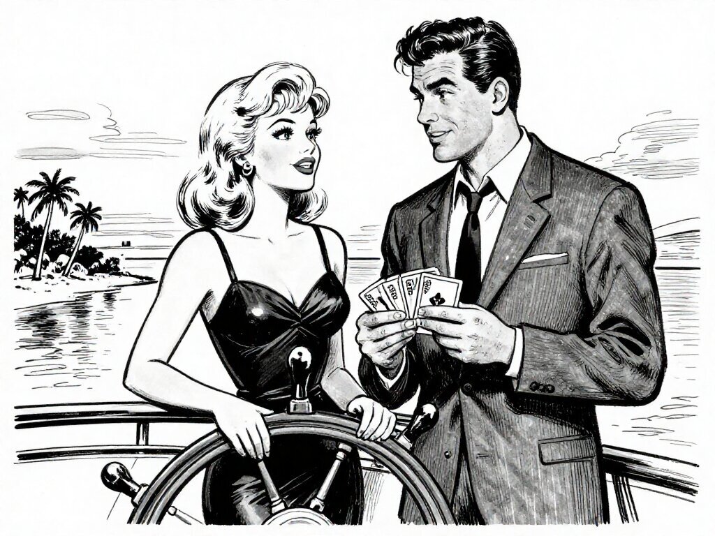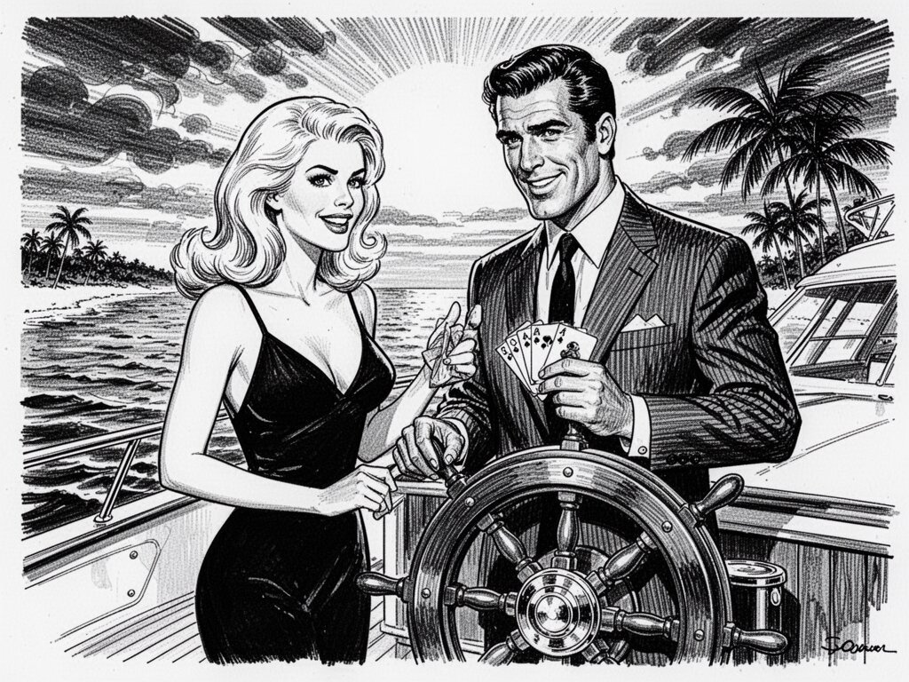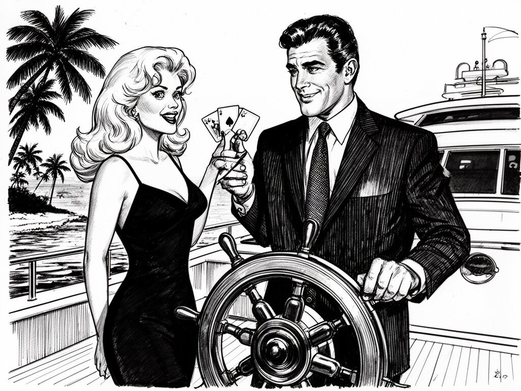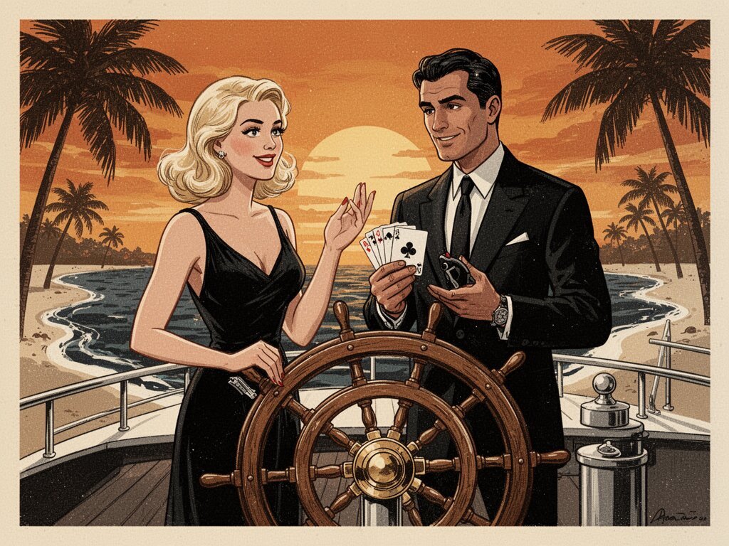 Lisa, 20 y.o blonde woman in black dress; Jason, 35 y.o man with short dark hair in suit, holding cards, flirtatious look; standing by luxury yacht wheel at sunset, tropical beach in background