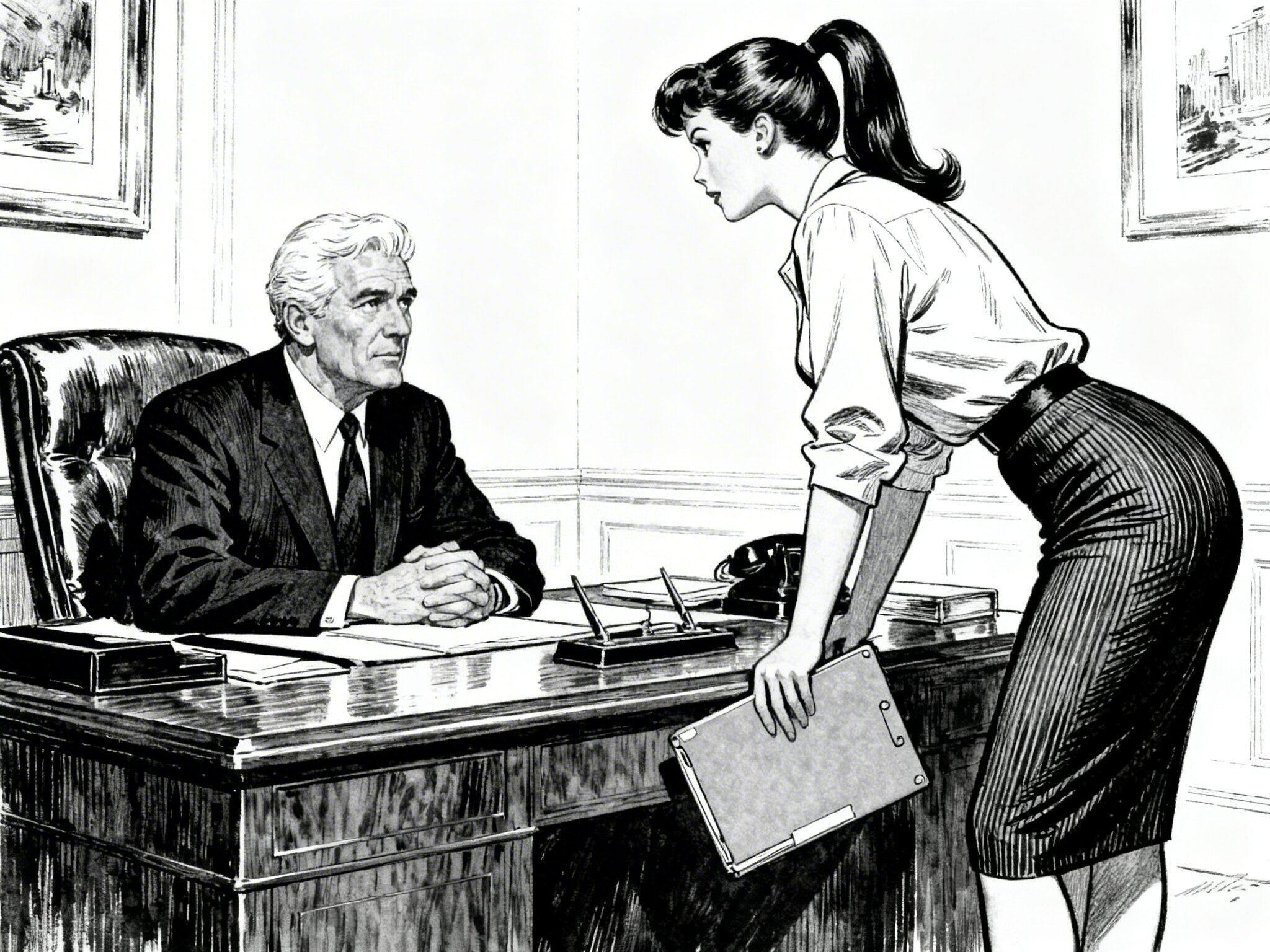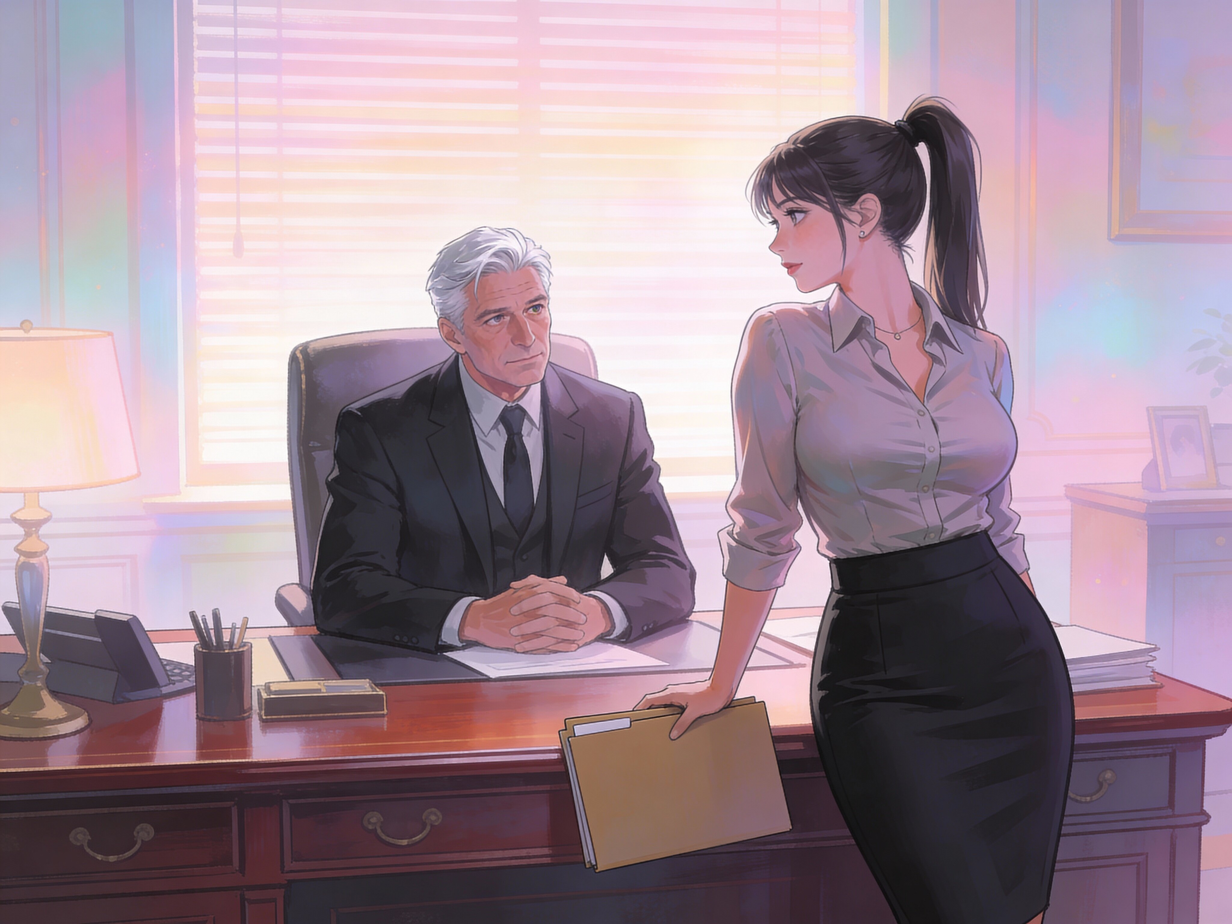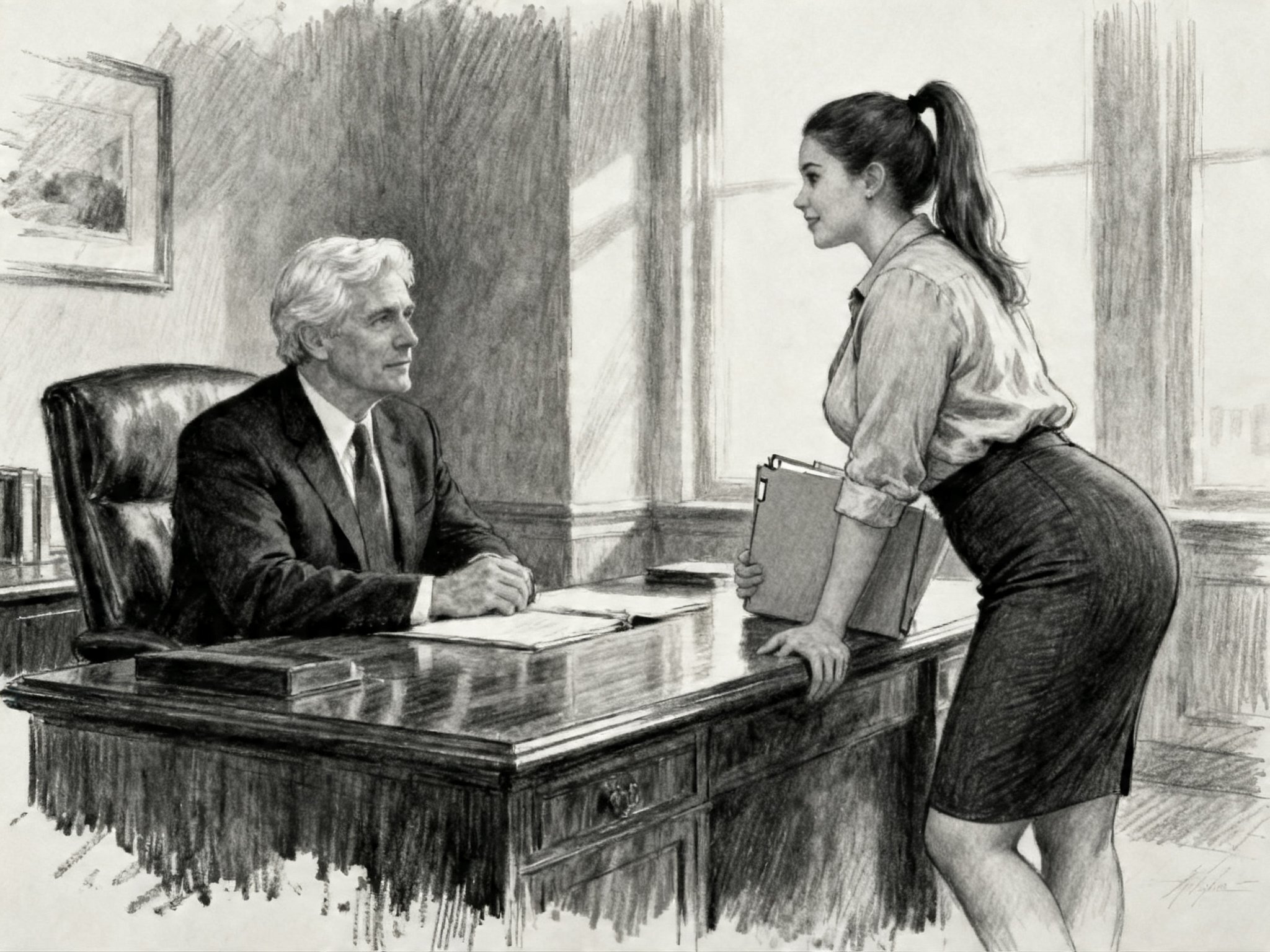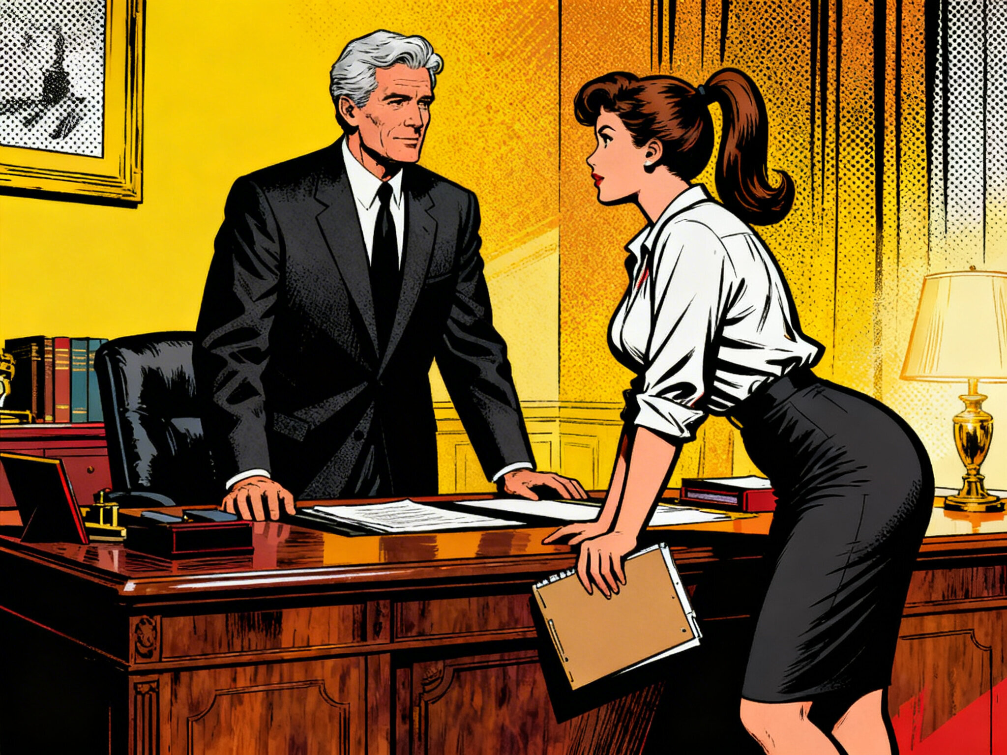 silver-haired white man, late 40s, dark suit, behind mahogany desk in classic office; Emily, curvy woman, early 20s, high ponytail, blouse and pencil skirt, leaning with folder, warm moody lighting