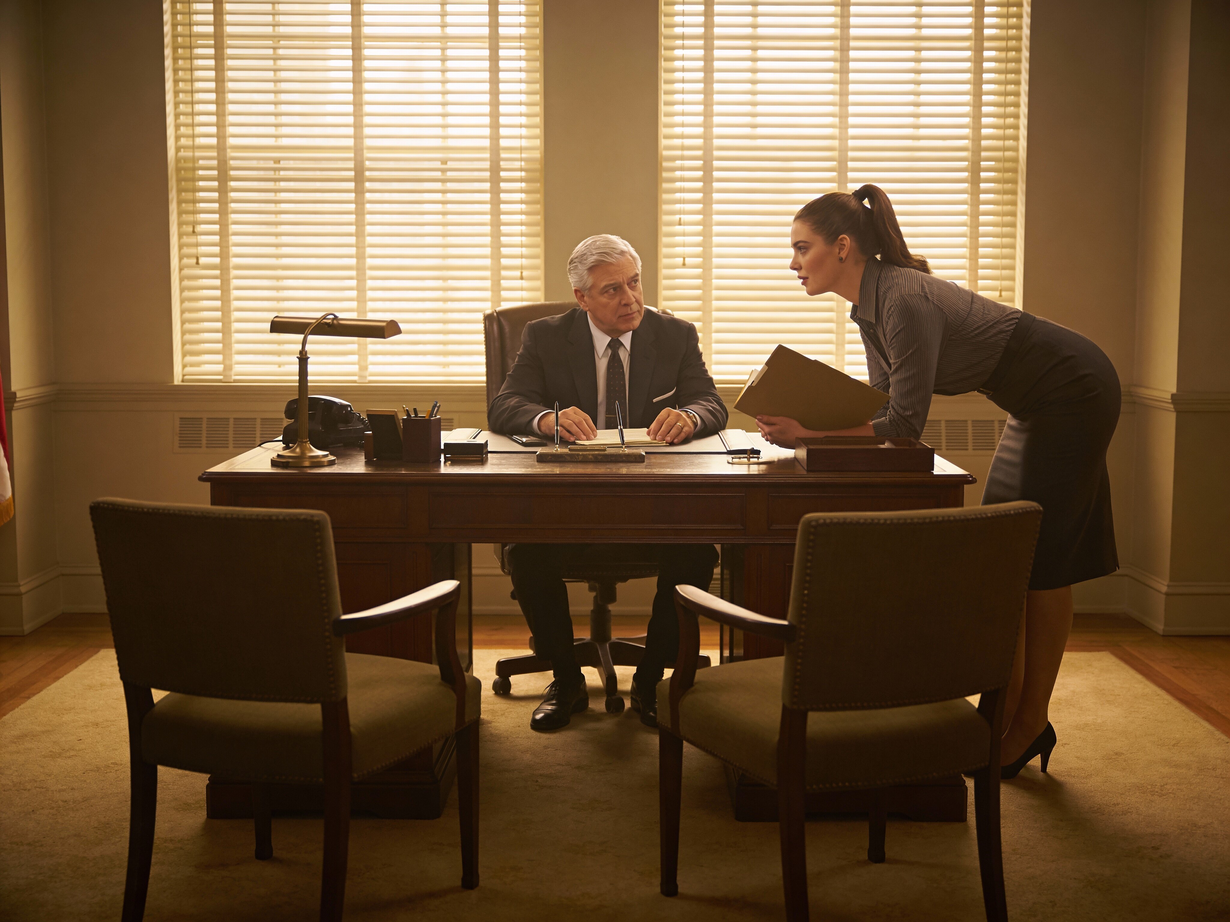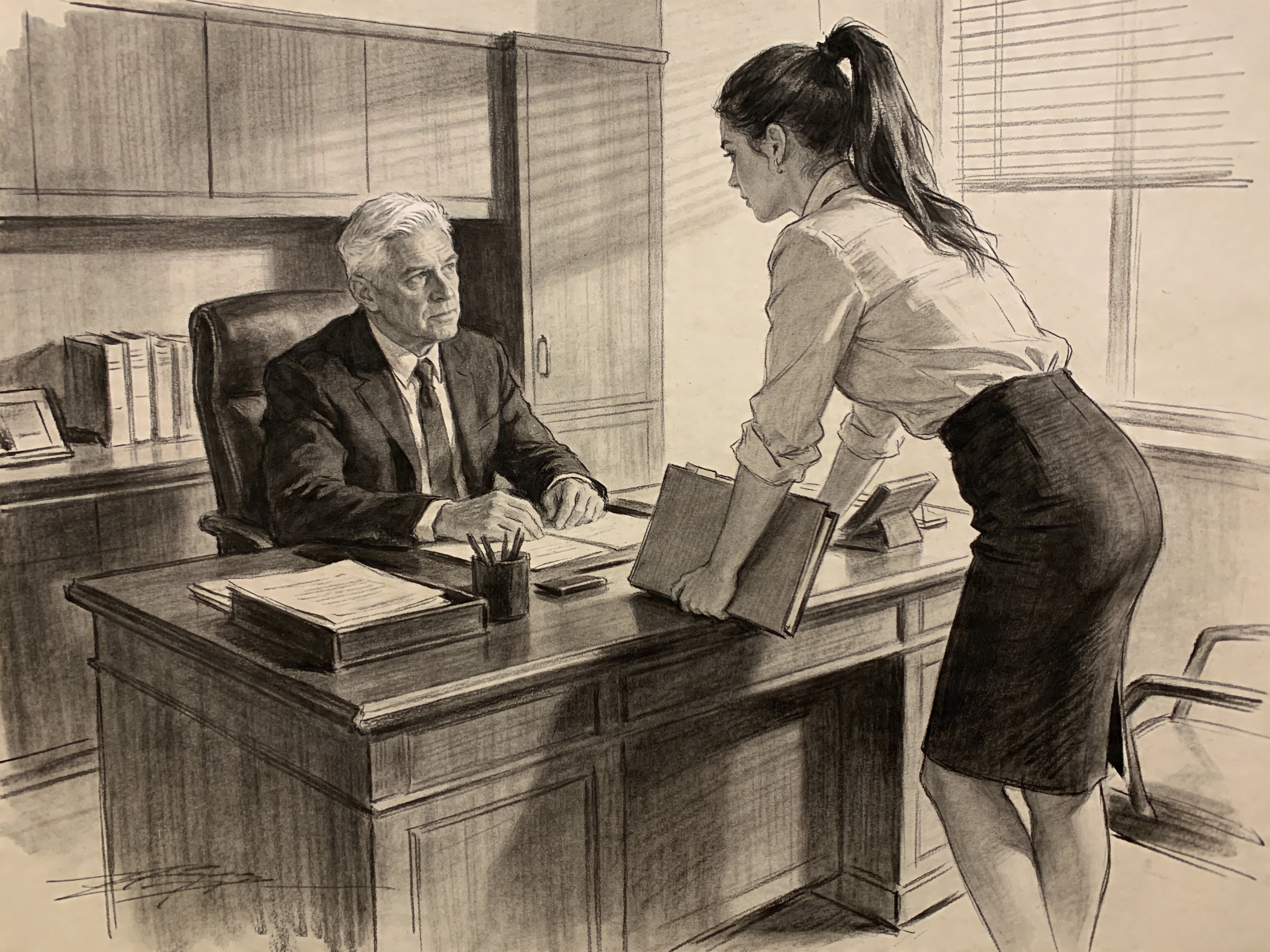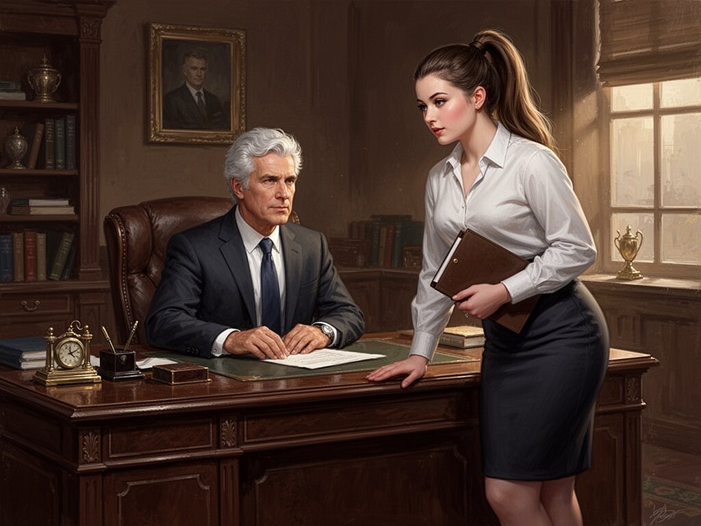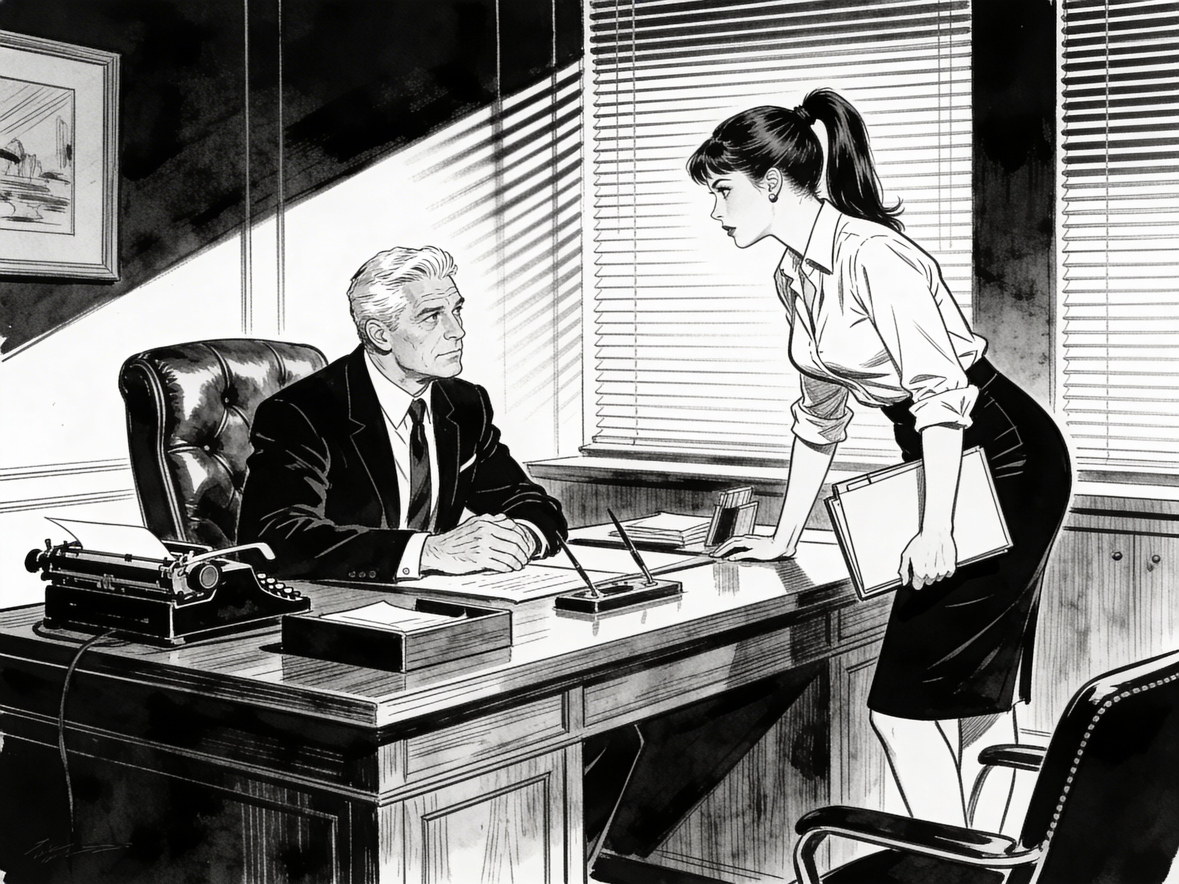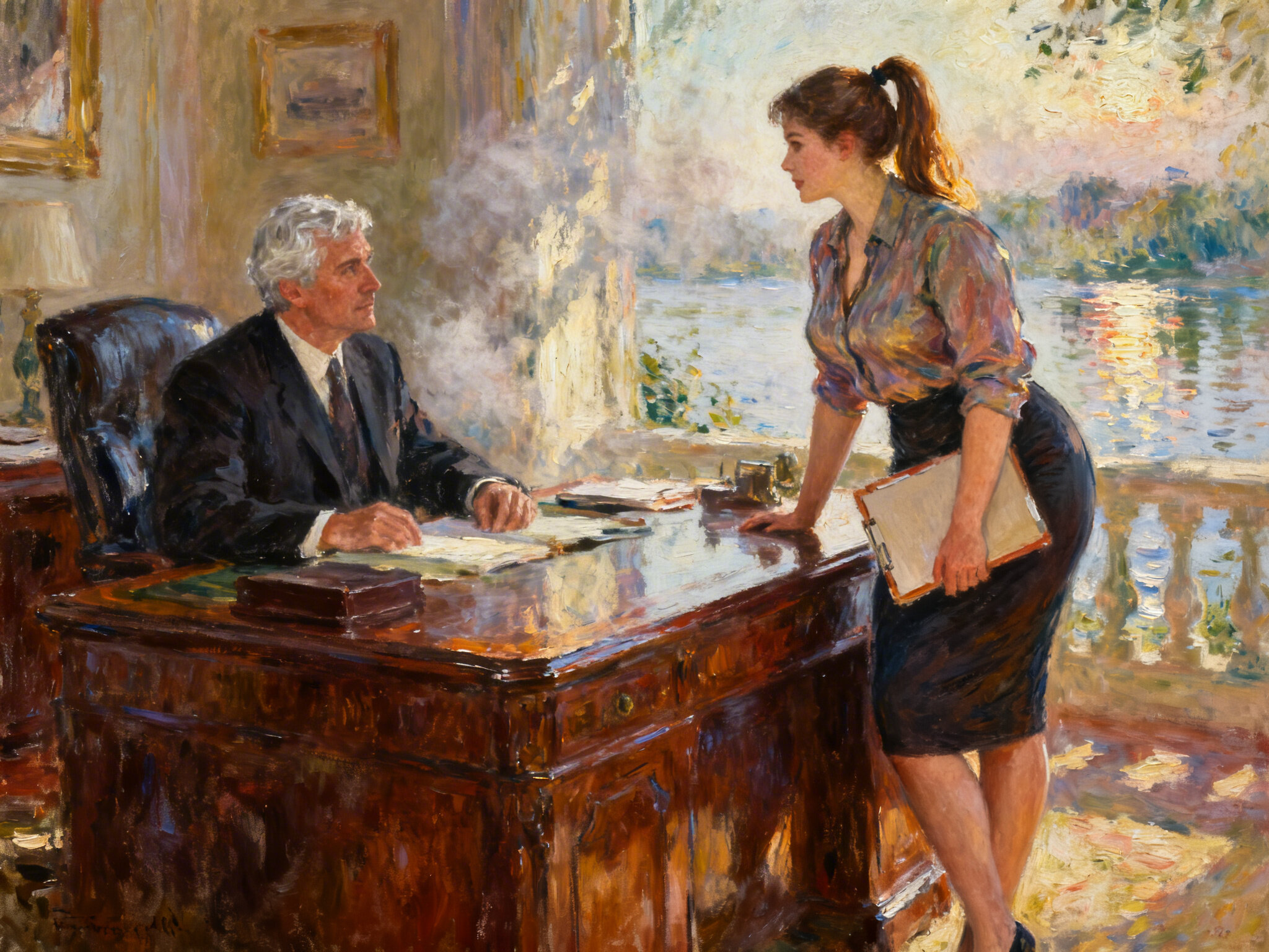 silver-haired white man, late 40s, dark suit, behind mahogany desk in classic office; Emily, curvy woman, early 20s, high ponytail, blouse and pencil skirt, leaning with folder, warm moody lighting
