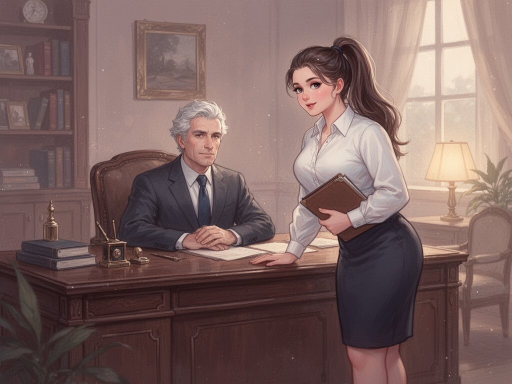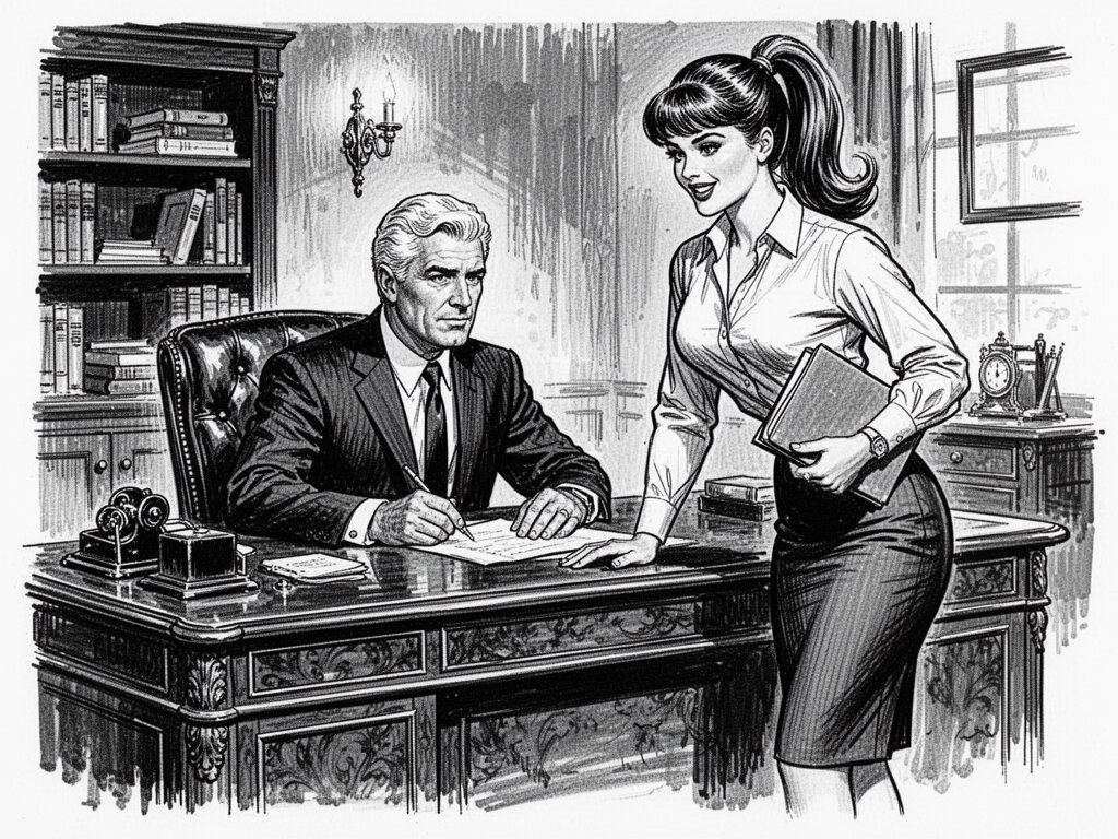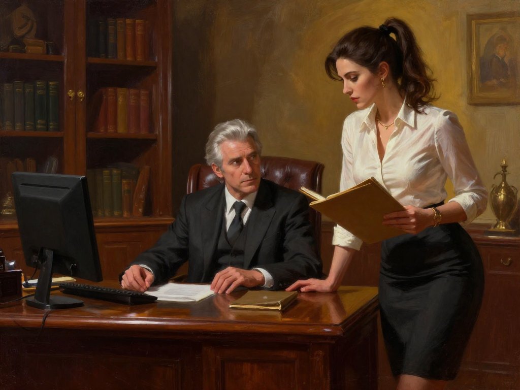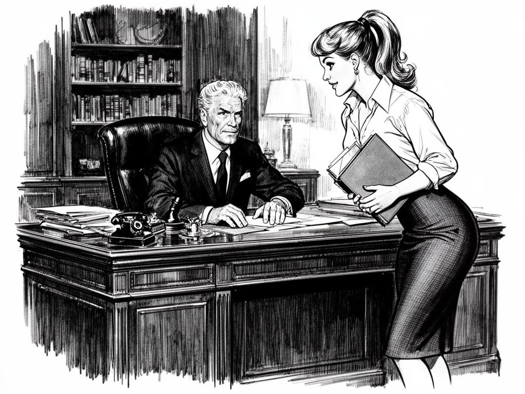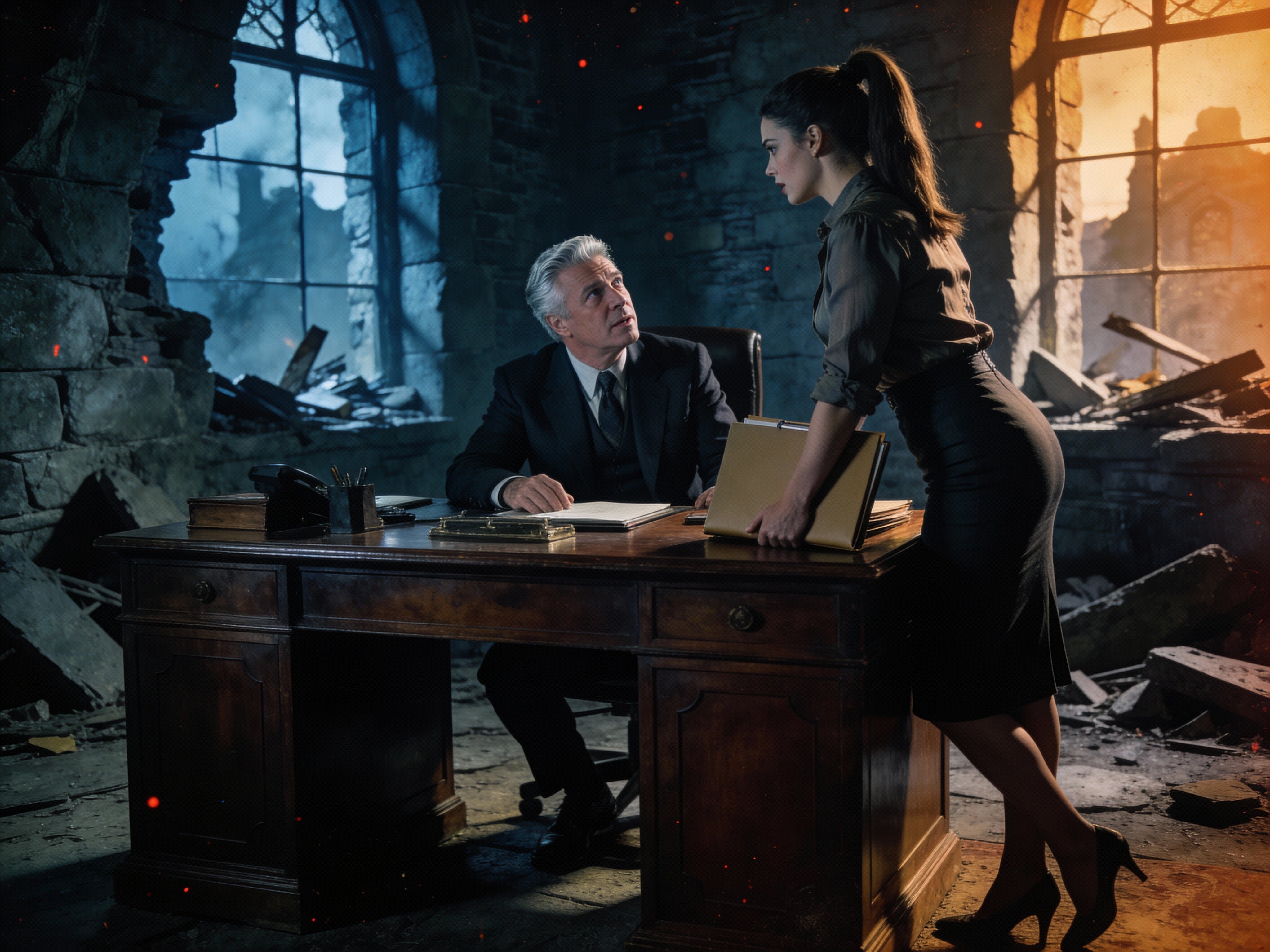 silver-haired white man, late 40s, dark suit, behind mahogany desk in classic office; Emily, curvy woman, early 20s, high ponytail, blouse and pencil skirt, leaning with folder, warm moody lighting