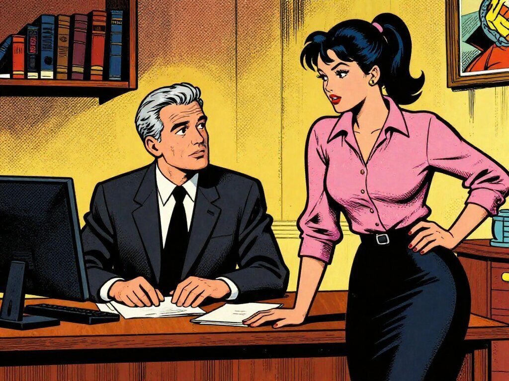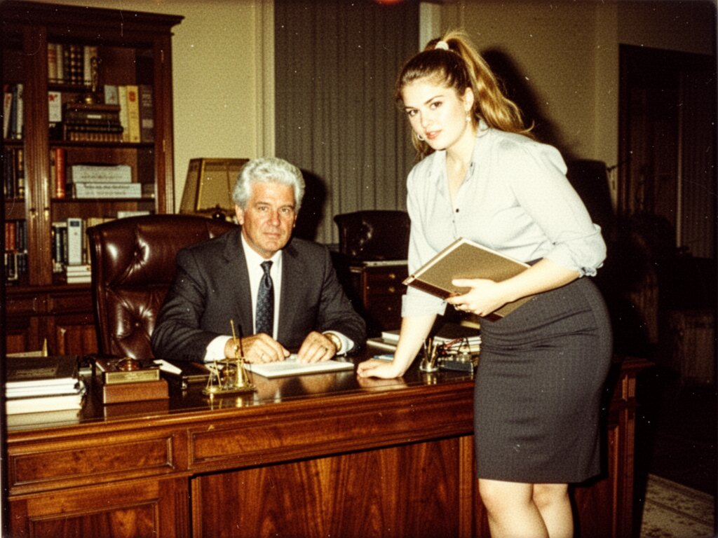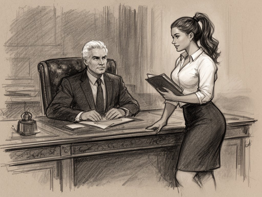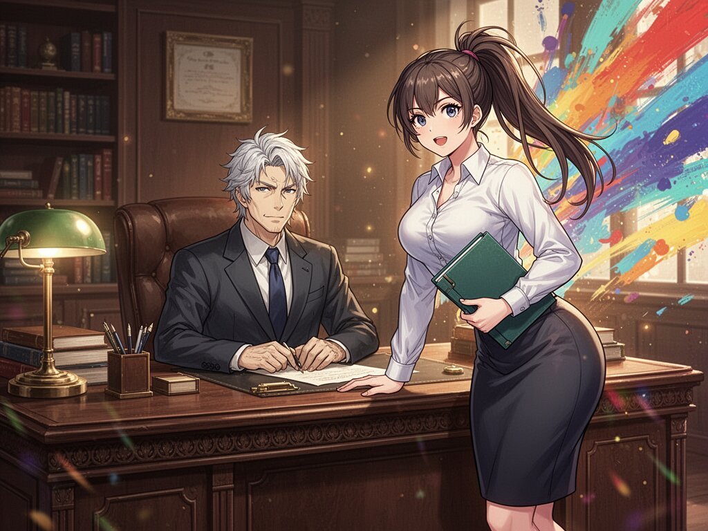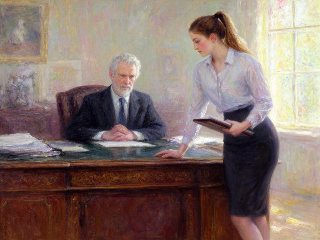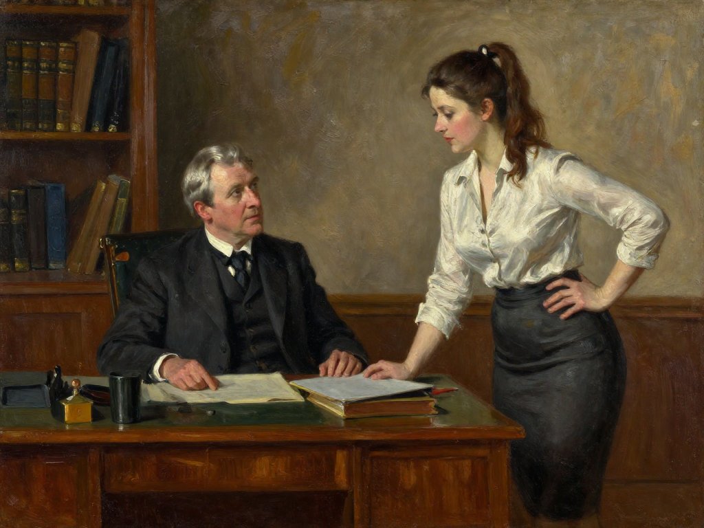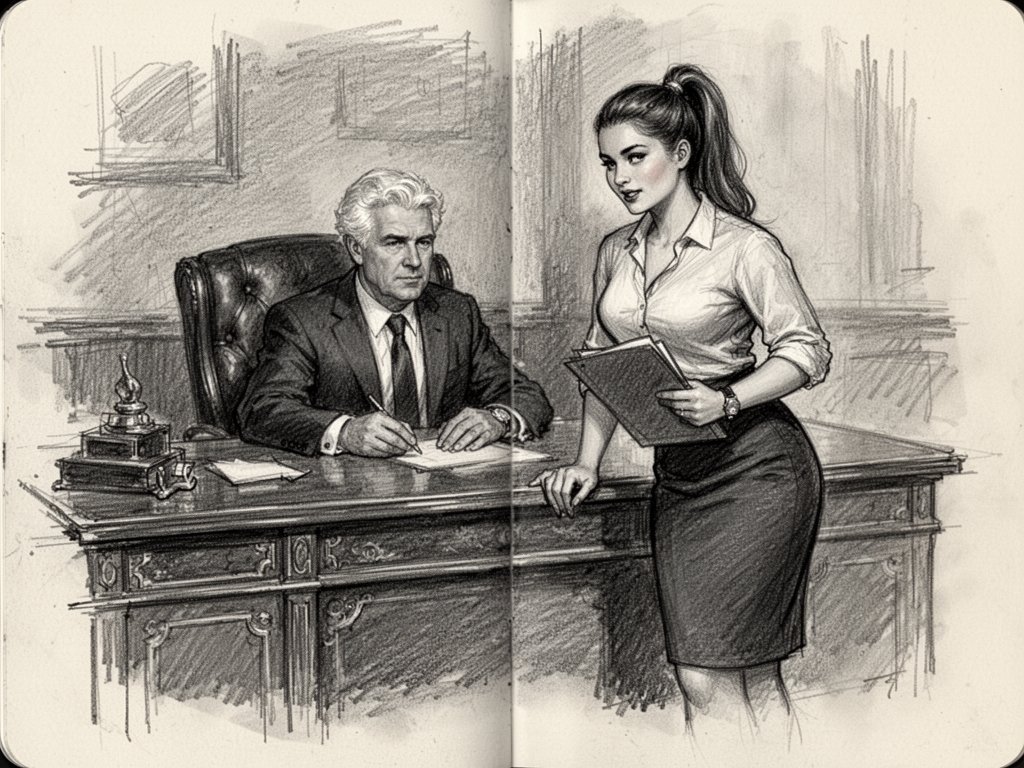 silver-haired white man, late 40s, dark suit, behind mahogany desk in classic office; Emily, curvy woman, early 20s, high ponytail, blouse and pencil skirt, leaning with folder, warm moody lighting
