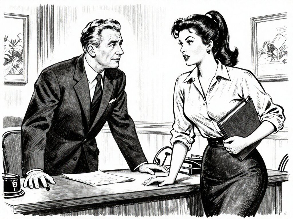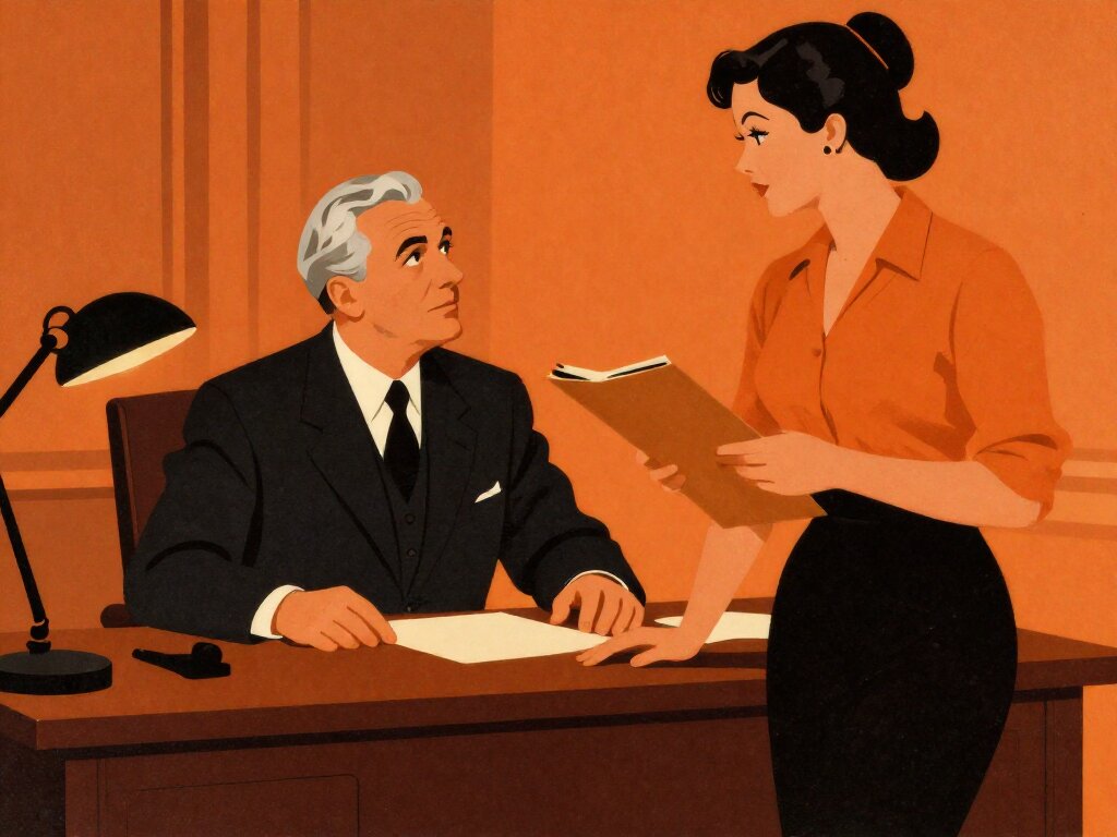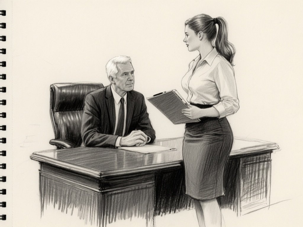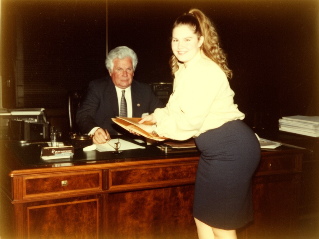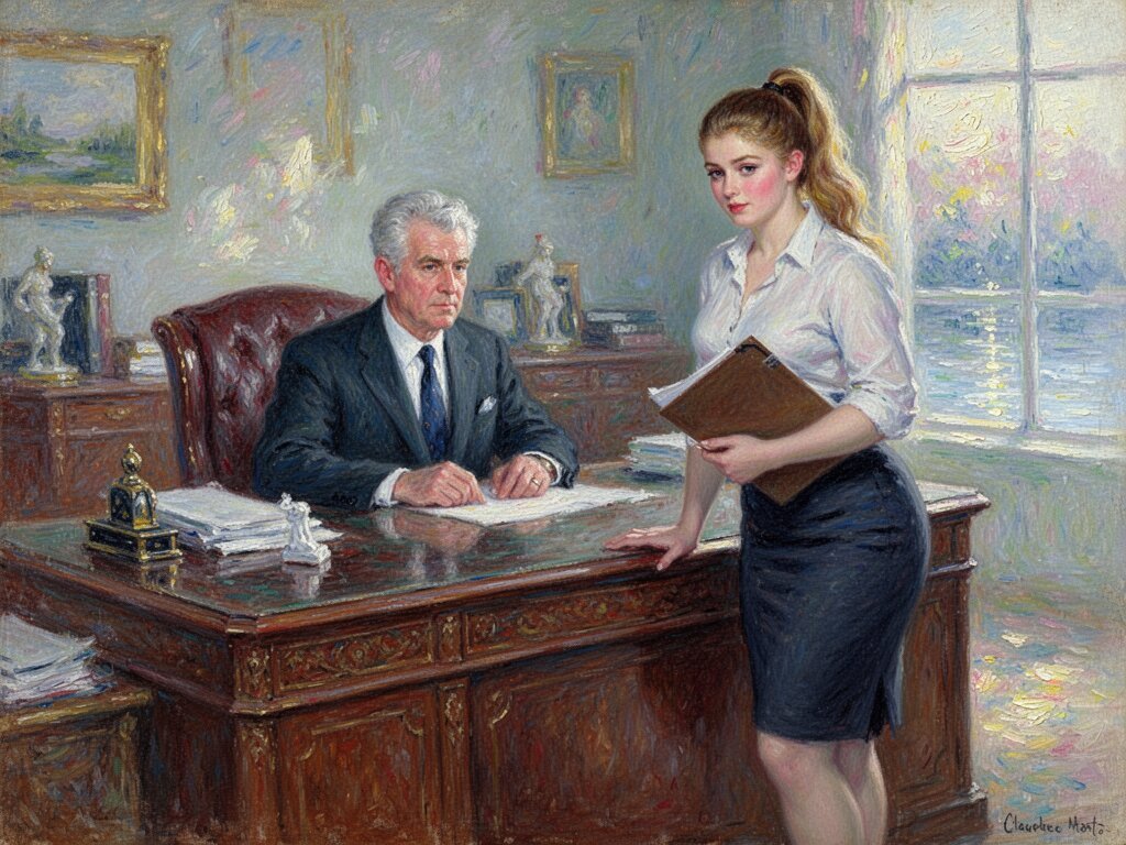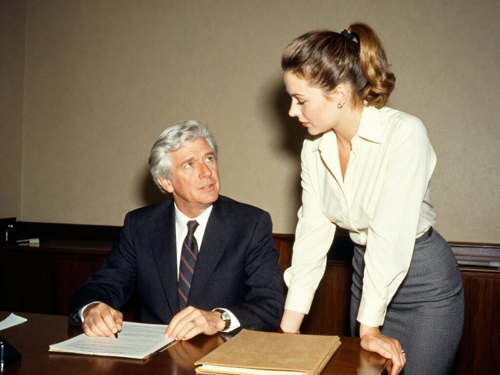 silver-haired white man, late 40s, dark suit, behind mahogany desk in classic office; Emily, curvy woman, early 20s, high ponytail, blouse and pencil skirt, leaning with folder, warm moody lighting