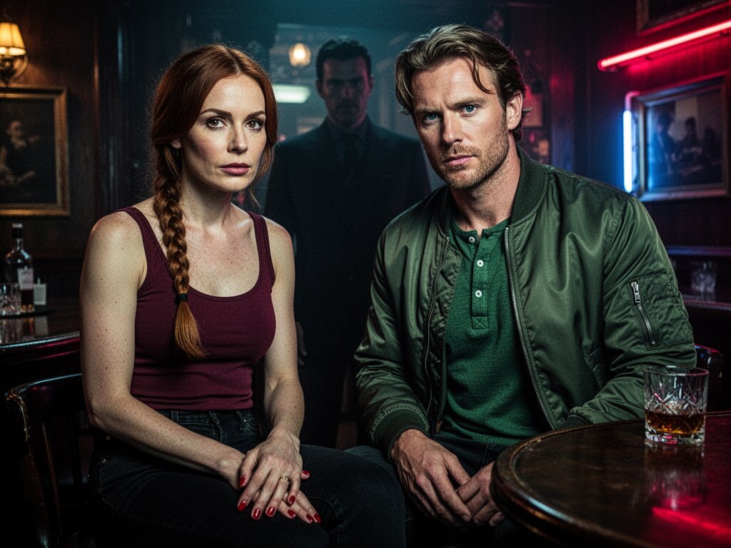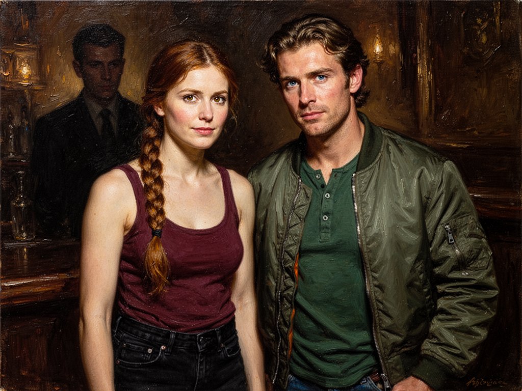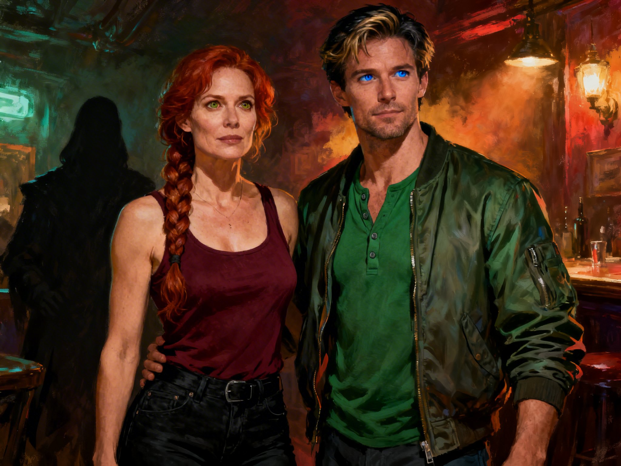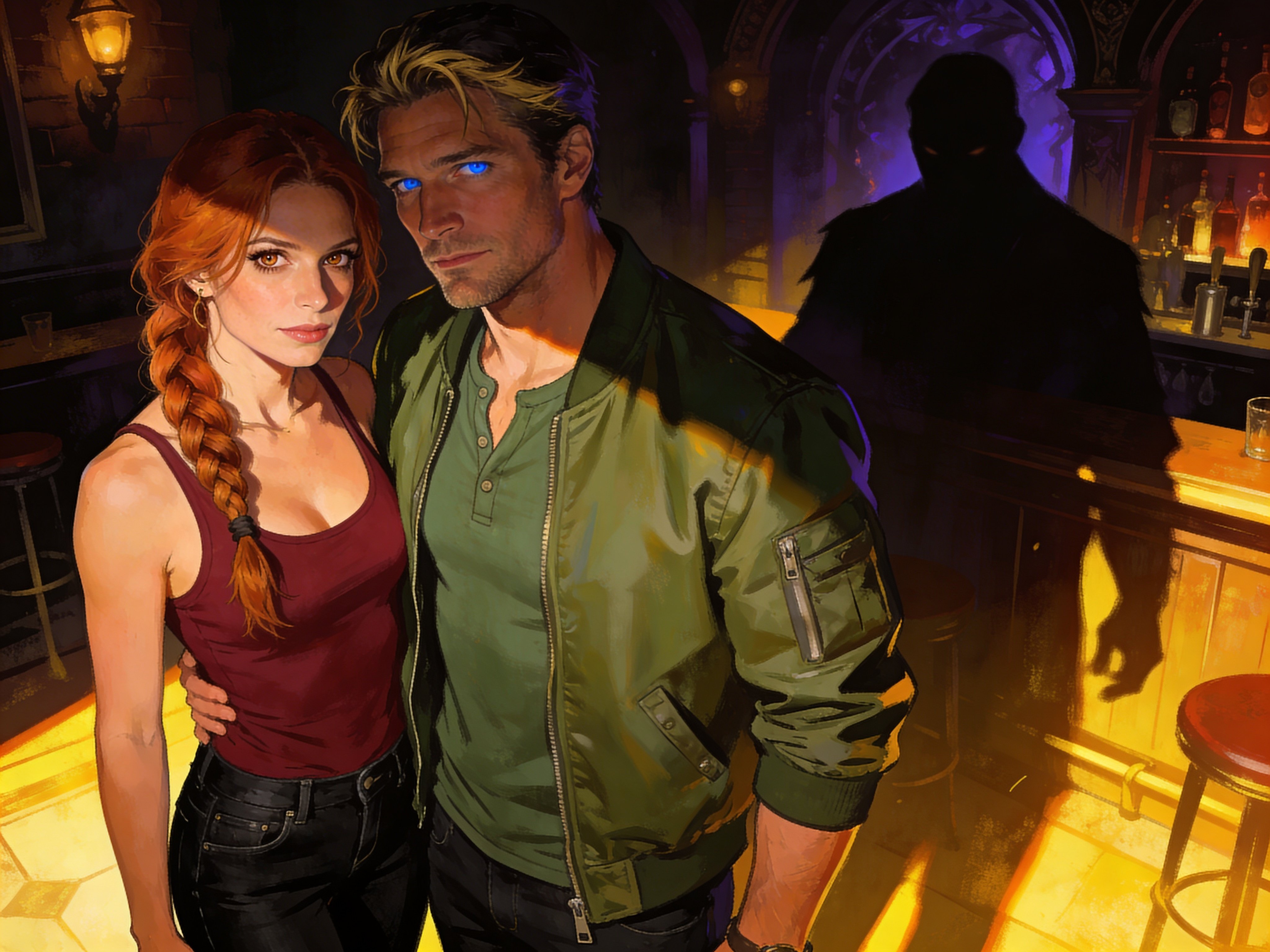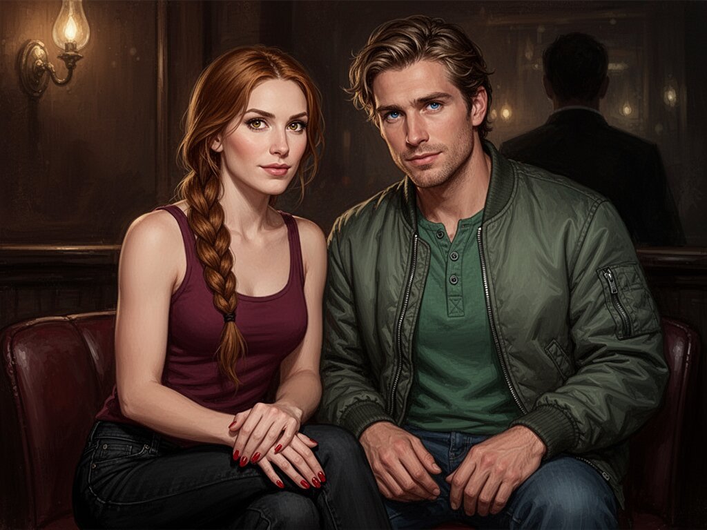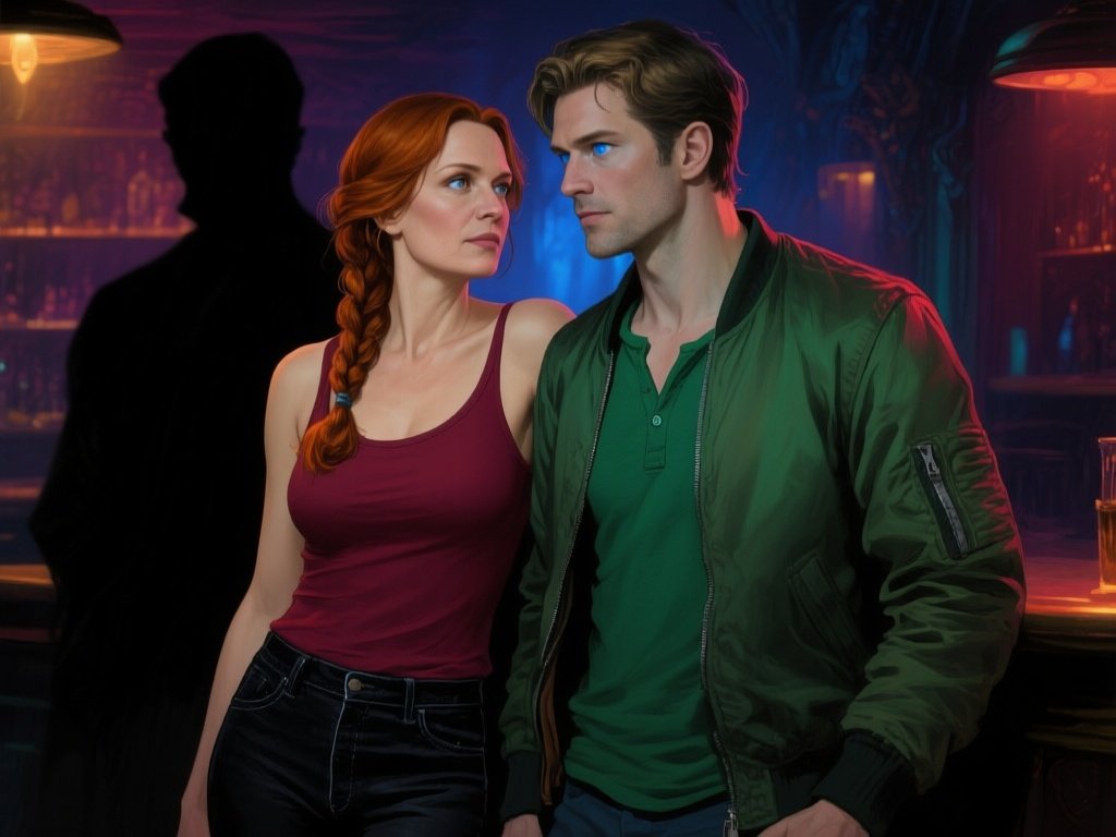 woman, late 30s, hazel eyes, auburn braid, black jeans, burgundy tank top; man, mid-30s, blue eyes, dark blond hair, green henley, bomber jacket; close in low-lit speakeasy, shadowy figure behind