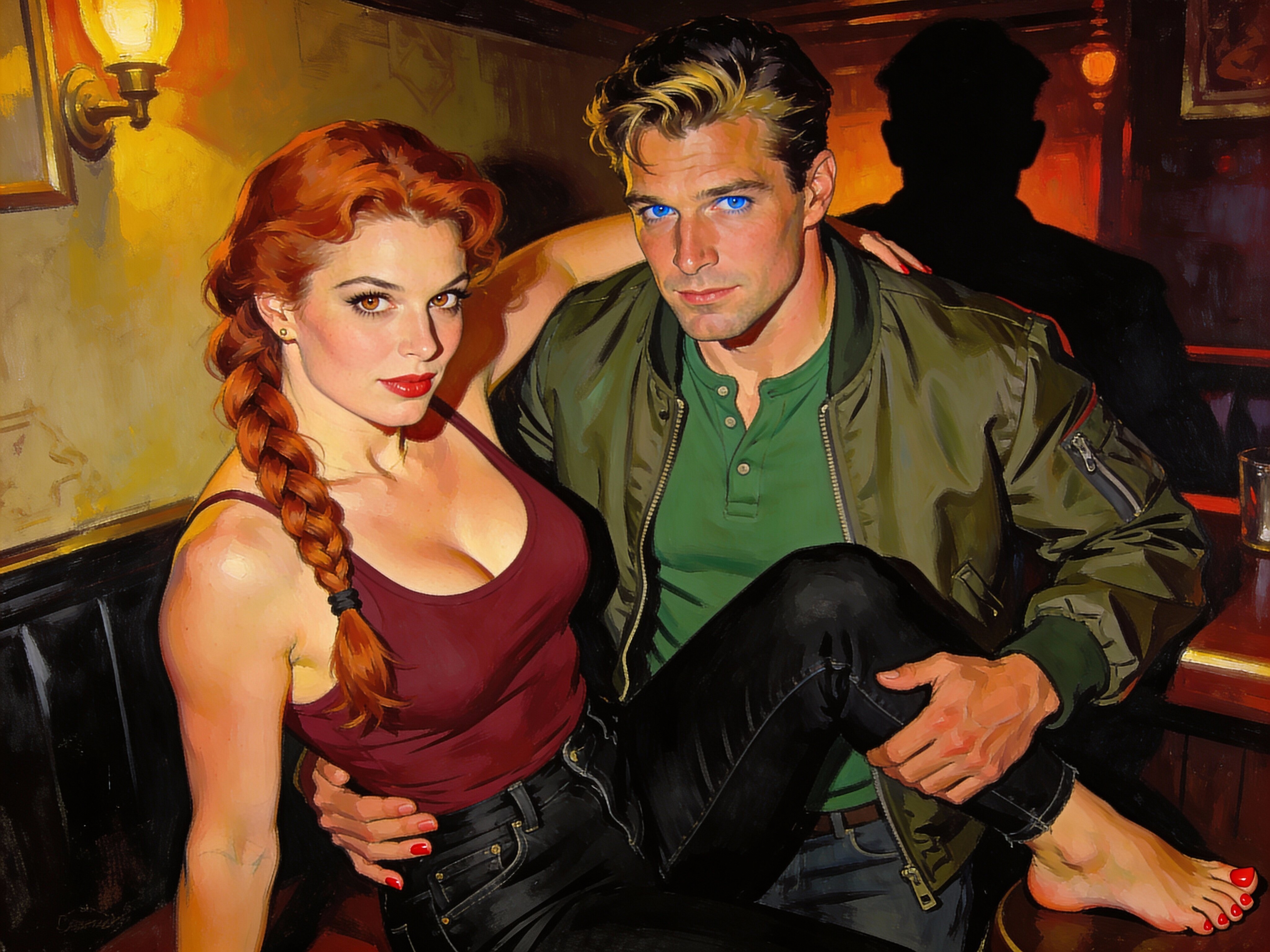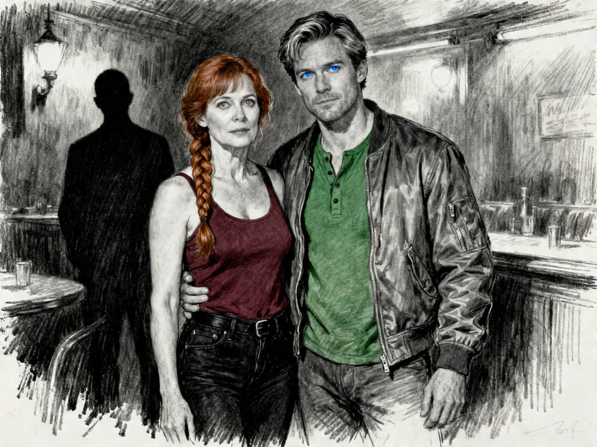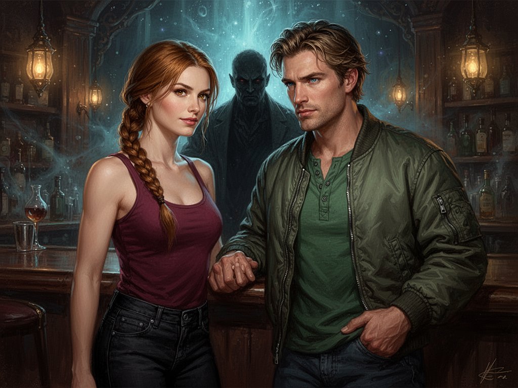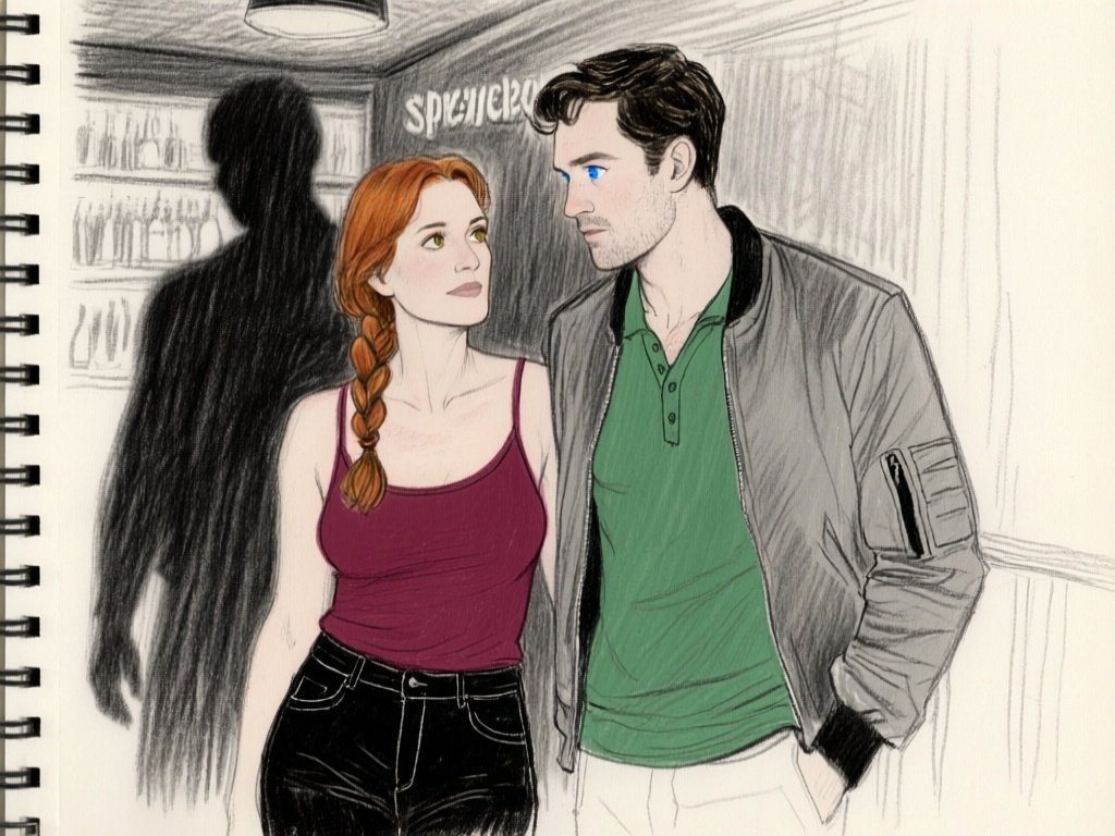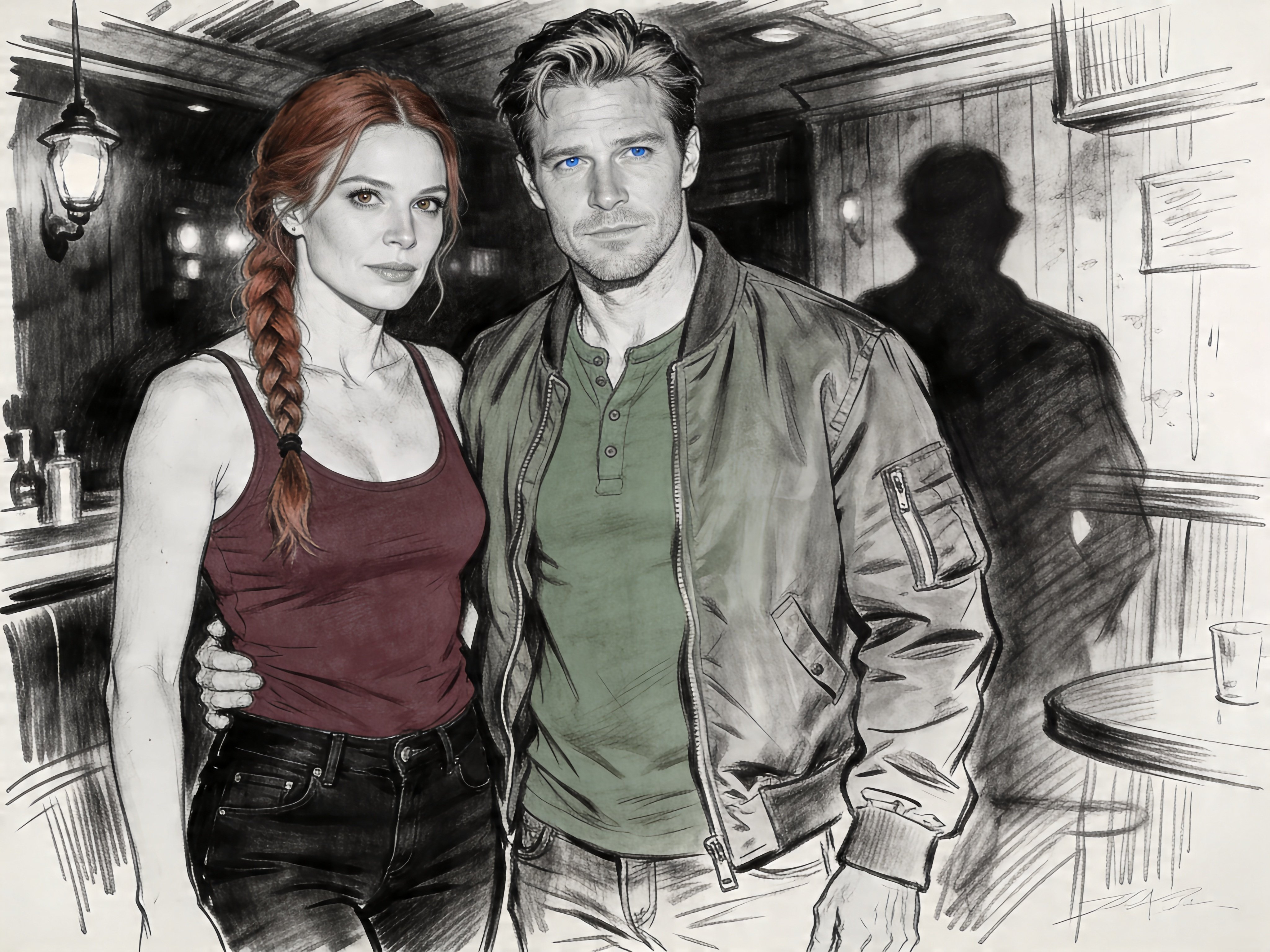 woman, late 30s, hazel eyes, auburn braid, black jeans, burgundy tank top; man, mid-30s, blue eyes, dark blond hair, green henley, bomber jacket; close in low-lit speakeasy, shadowy figure behind