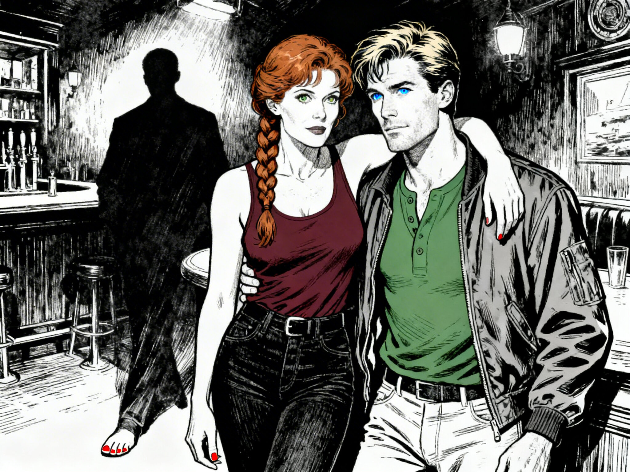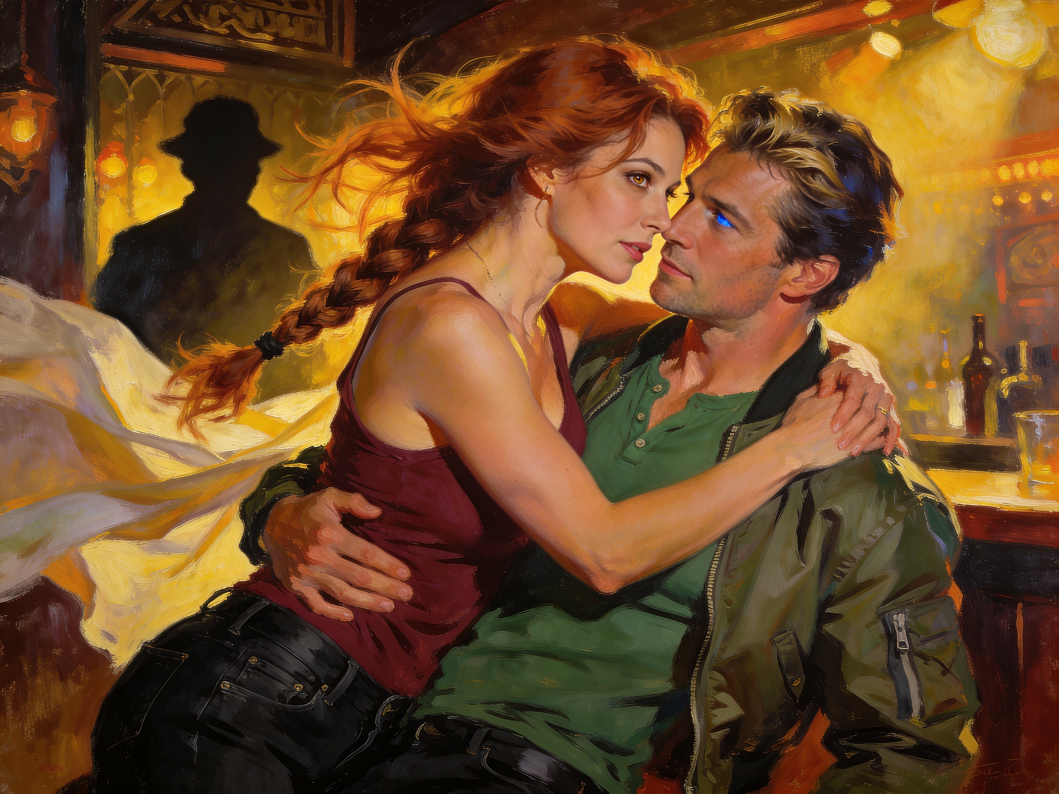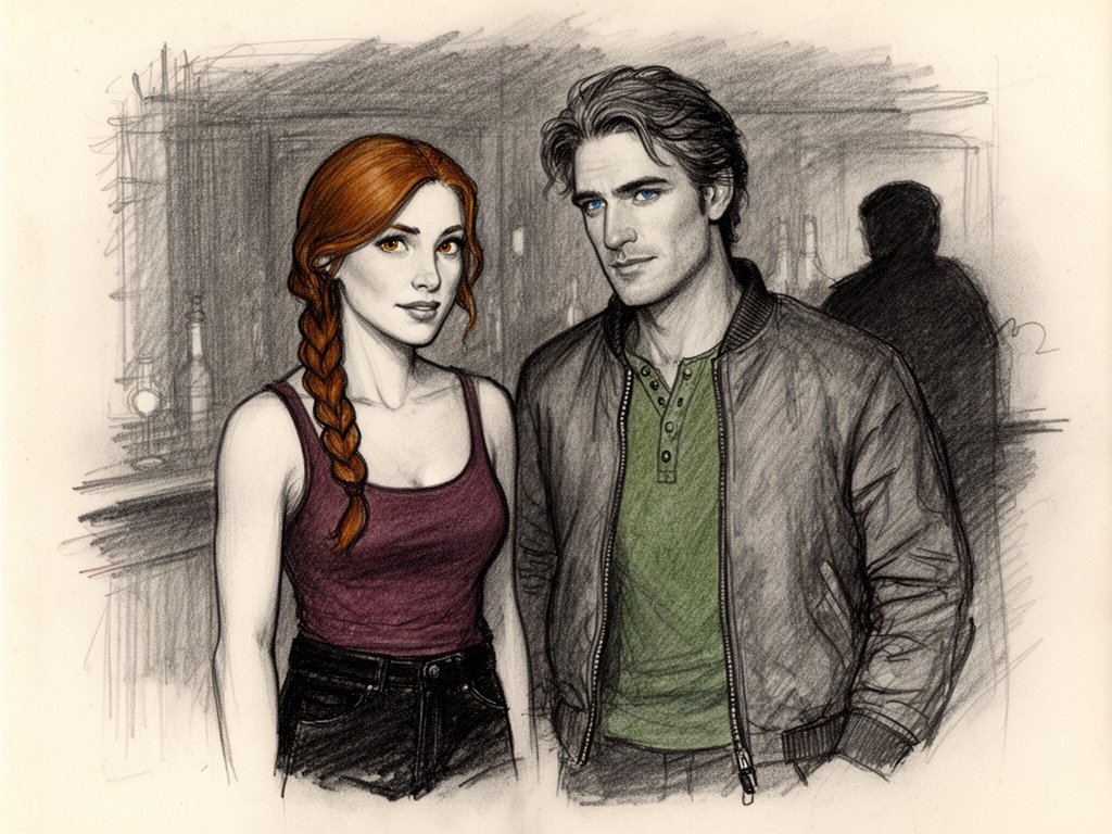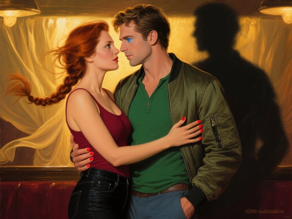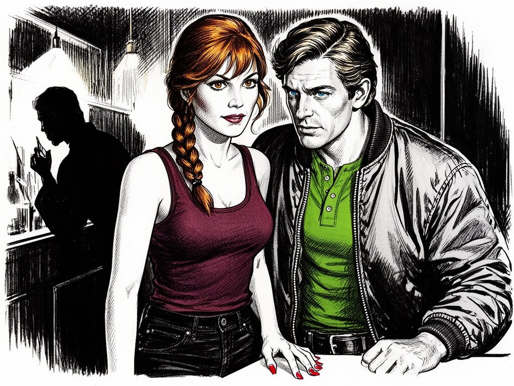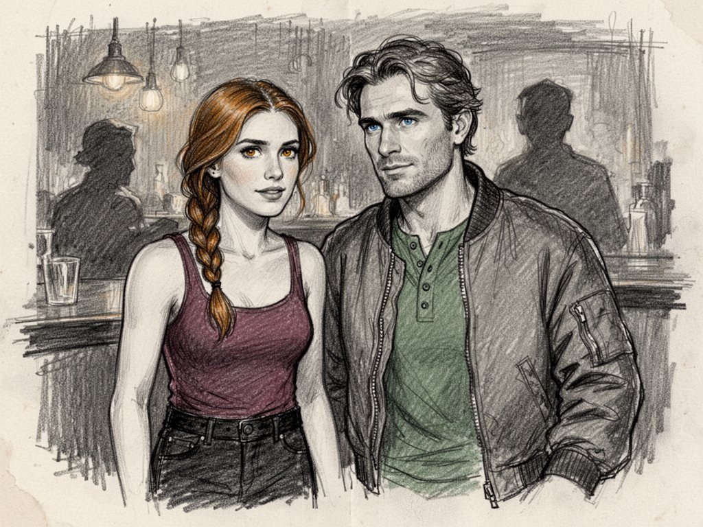 woman, late 30s, hazel eyes, auburn braid, black jeans, burgundy tank top; man, mid-30s, blue eyes, dark blond hair, green henley, bomber jacket; close in low-lit speakeasy, shadowy figure behind