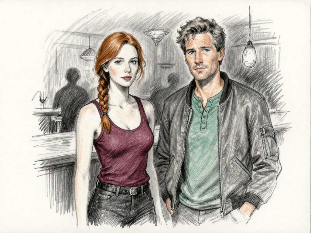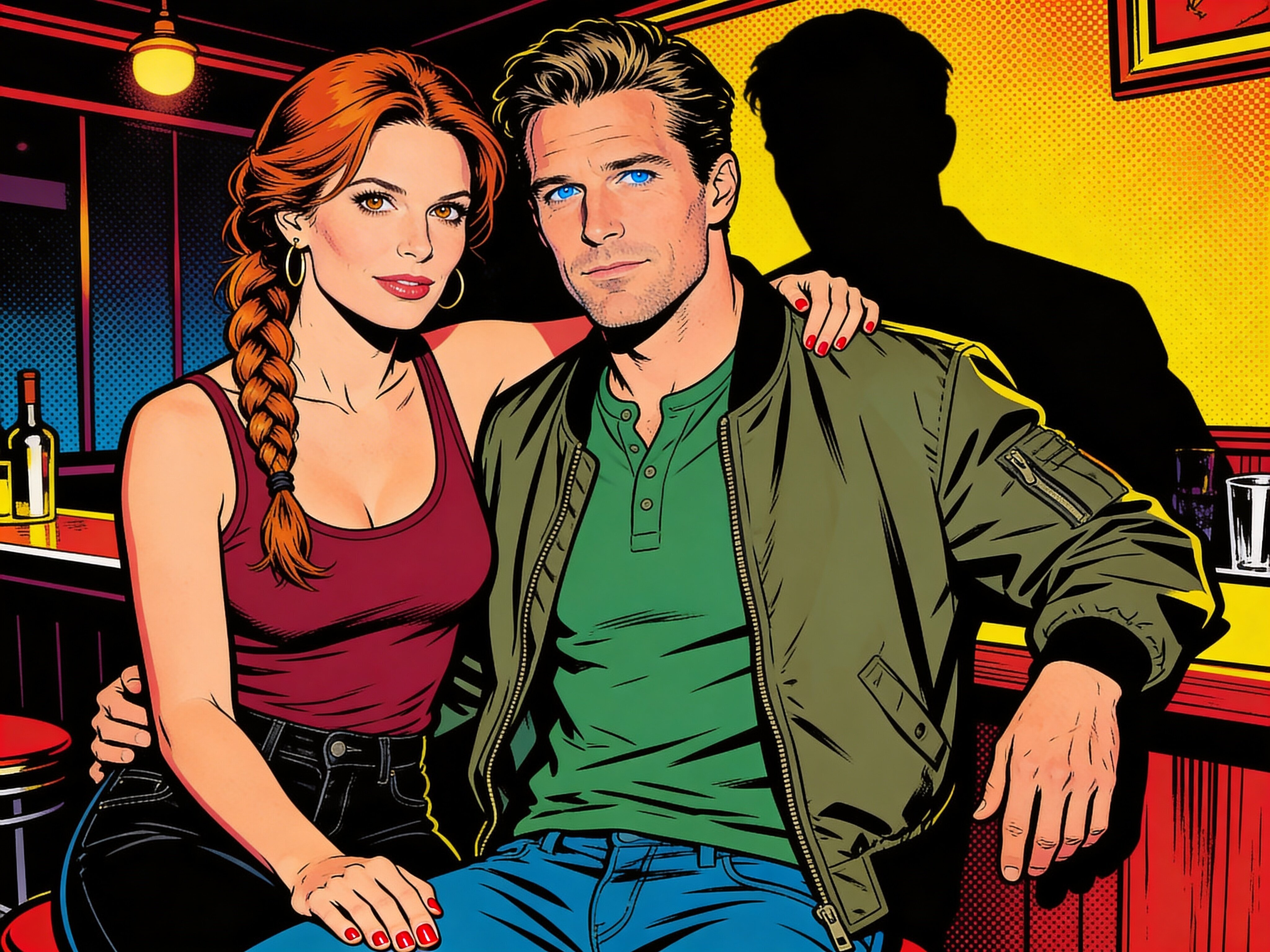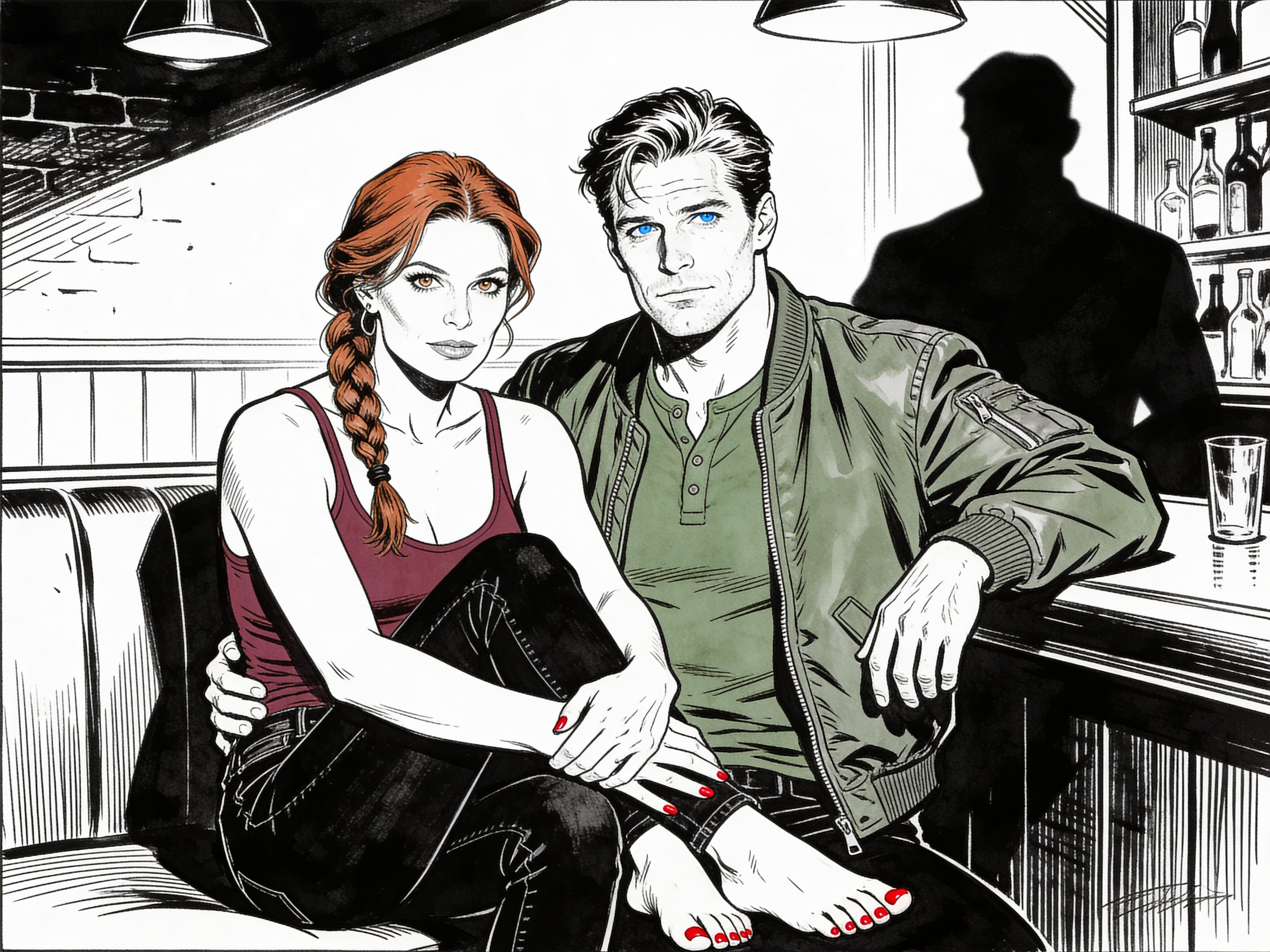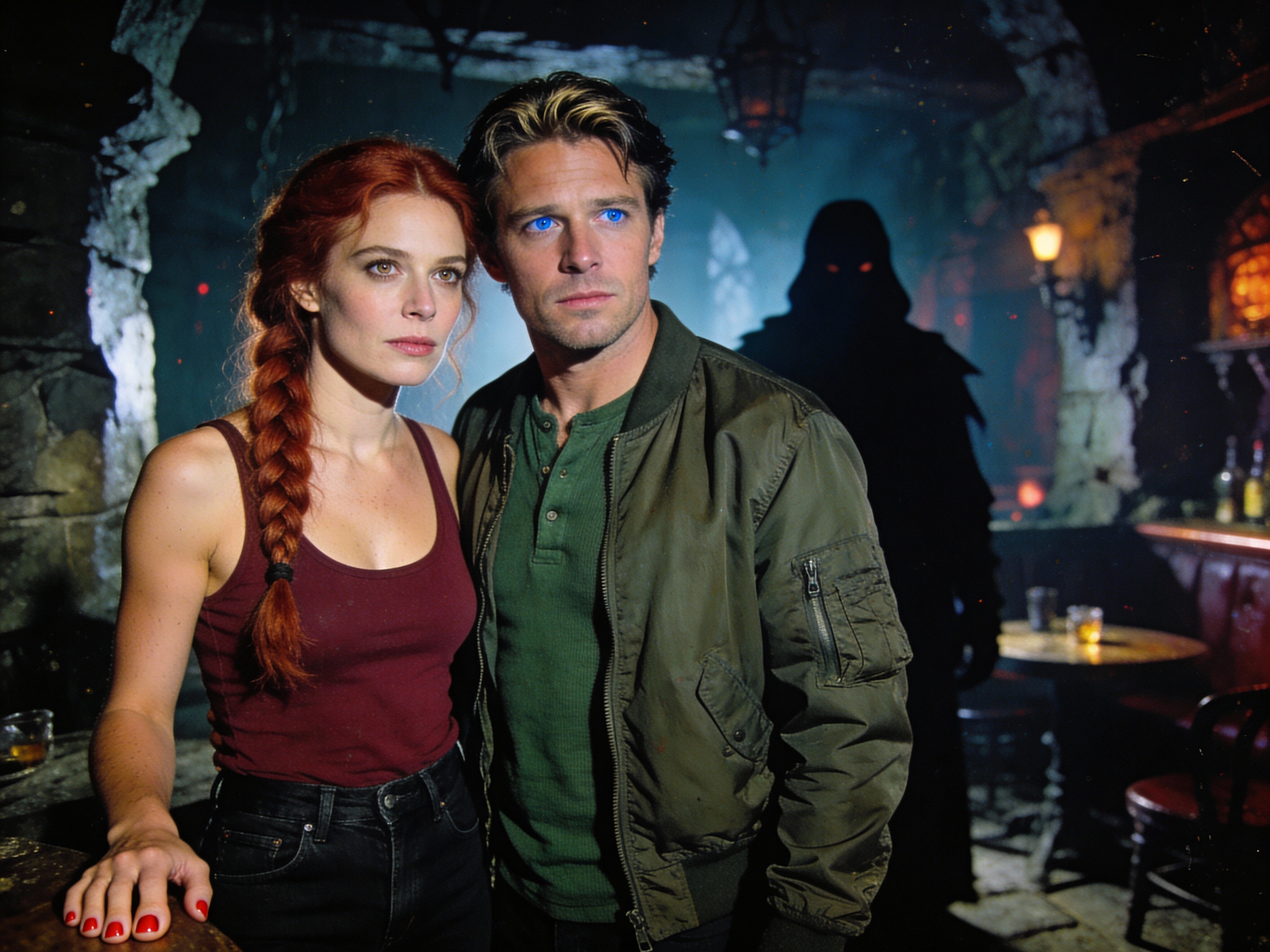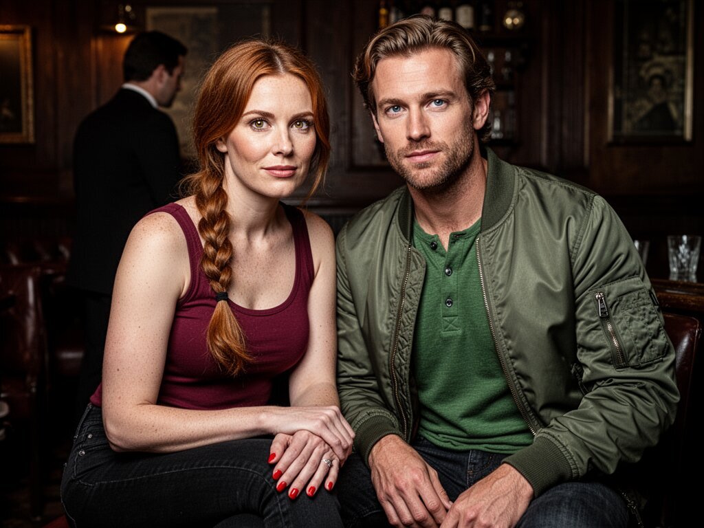 woman, late 30s, hazel eyes, auburn braid, black jeans, burgundy tank top; man, mid-30s, blue eyes, dark blond hair, green henley, bomber jacket; close in low-lit speakeasy, shadowy figure behind