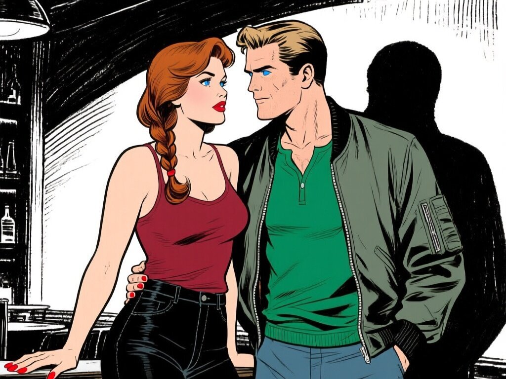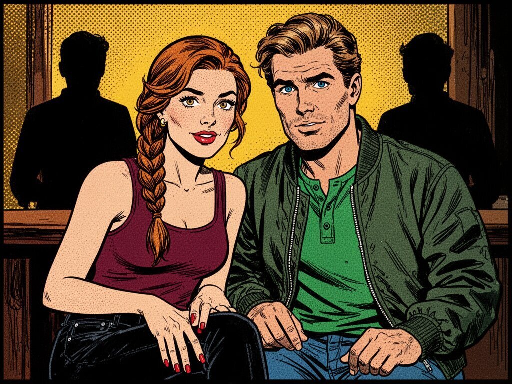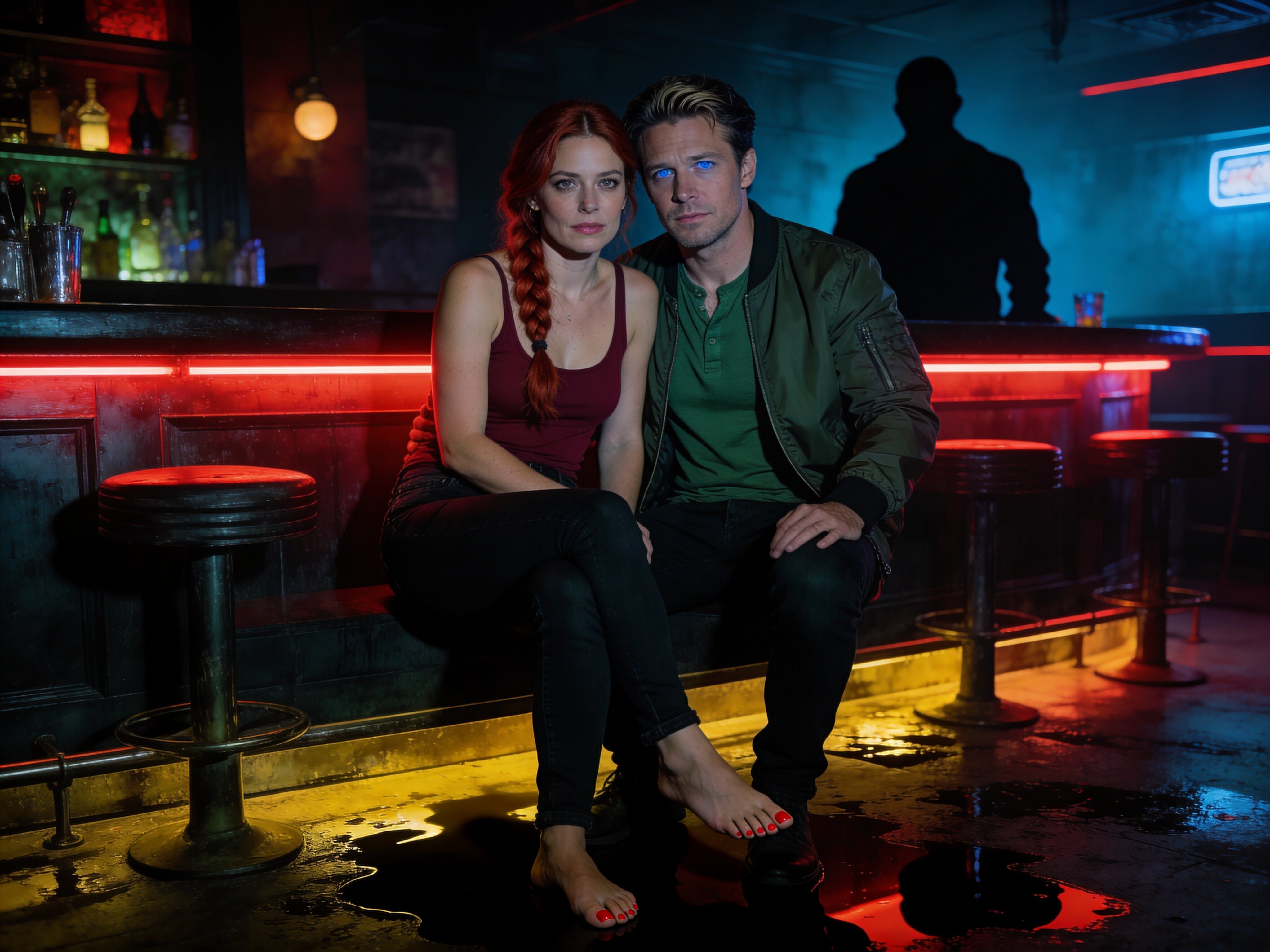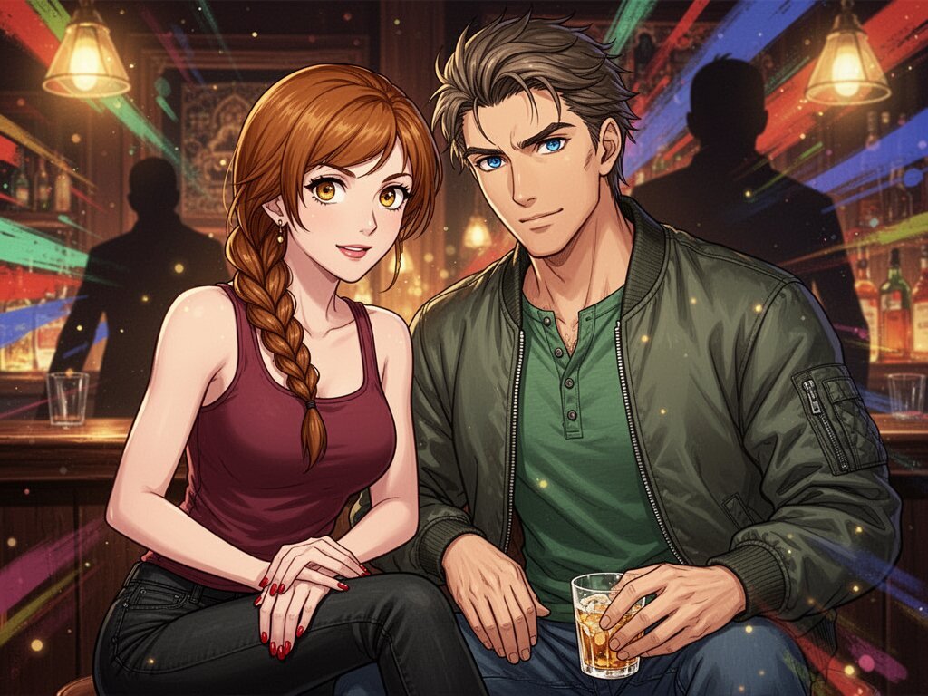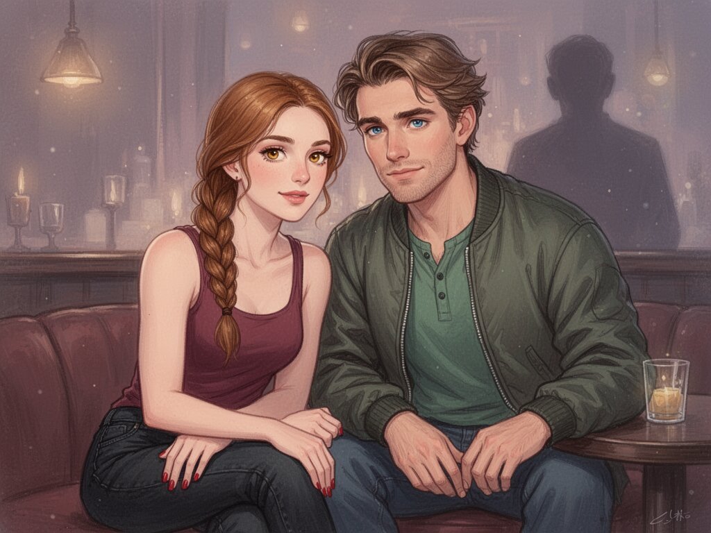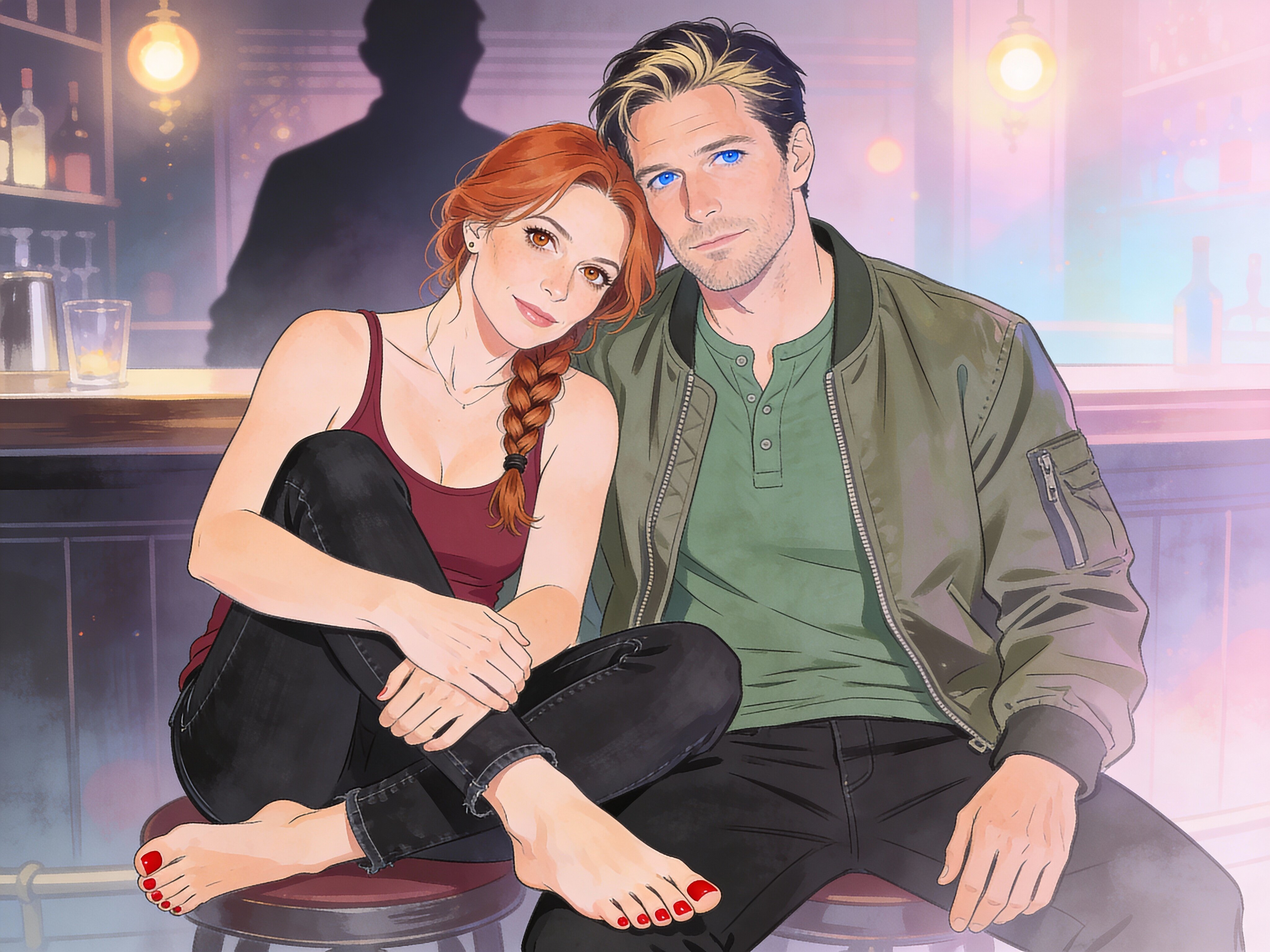 woman, late 30s, hazel eyes, auburn braid, black jeans, burgundy tank top; man, mid-30s, blue eyes, dark blond hair, green henley, bomber jacket; close in low-lit speakeasy, shadowy figure behind