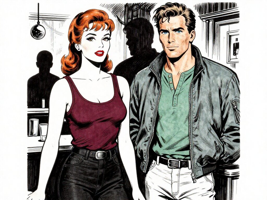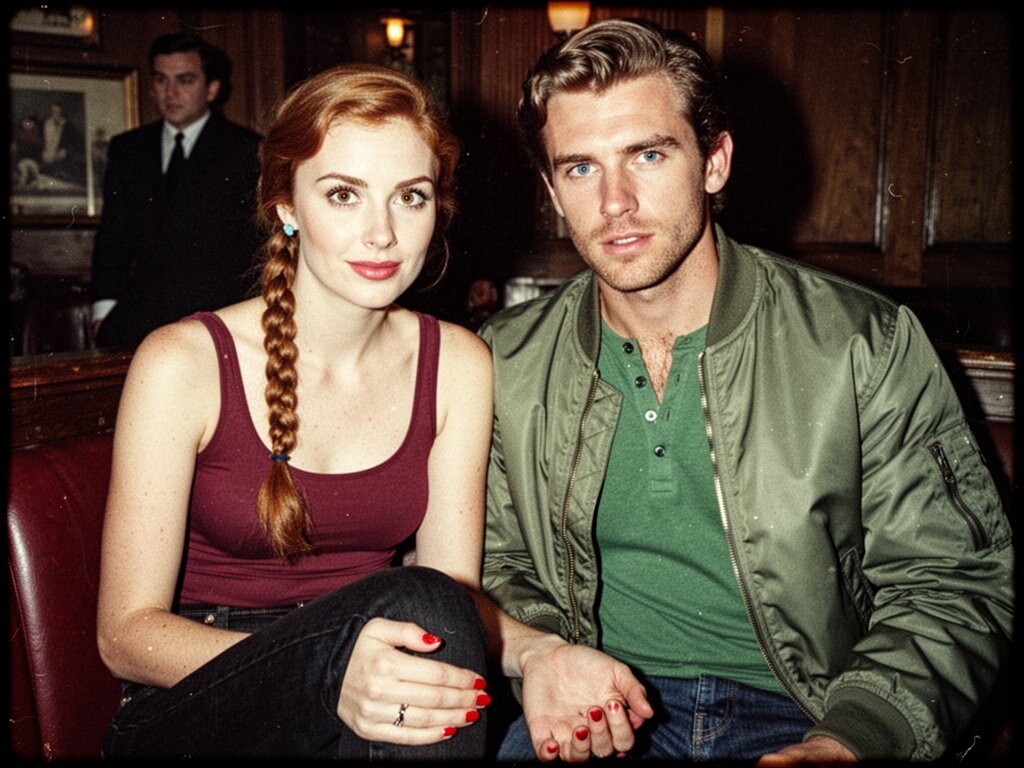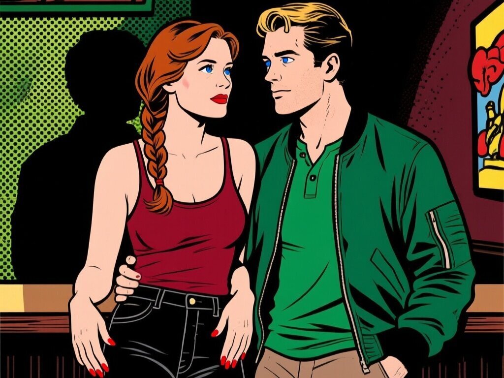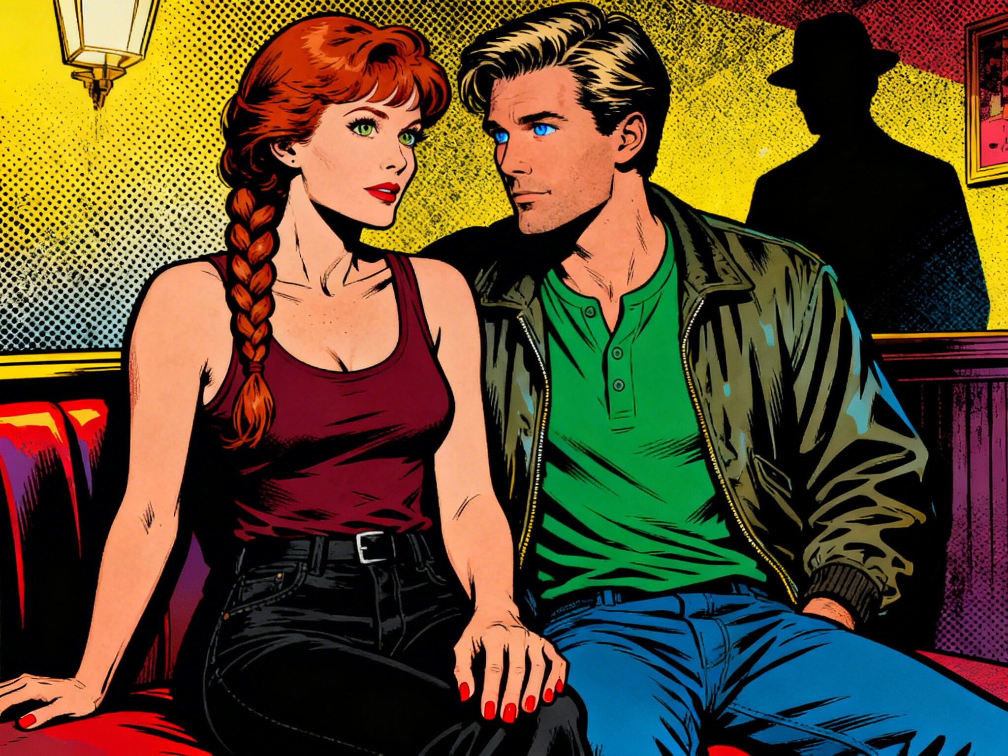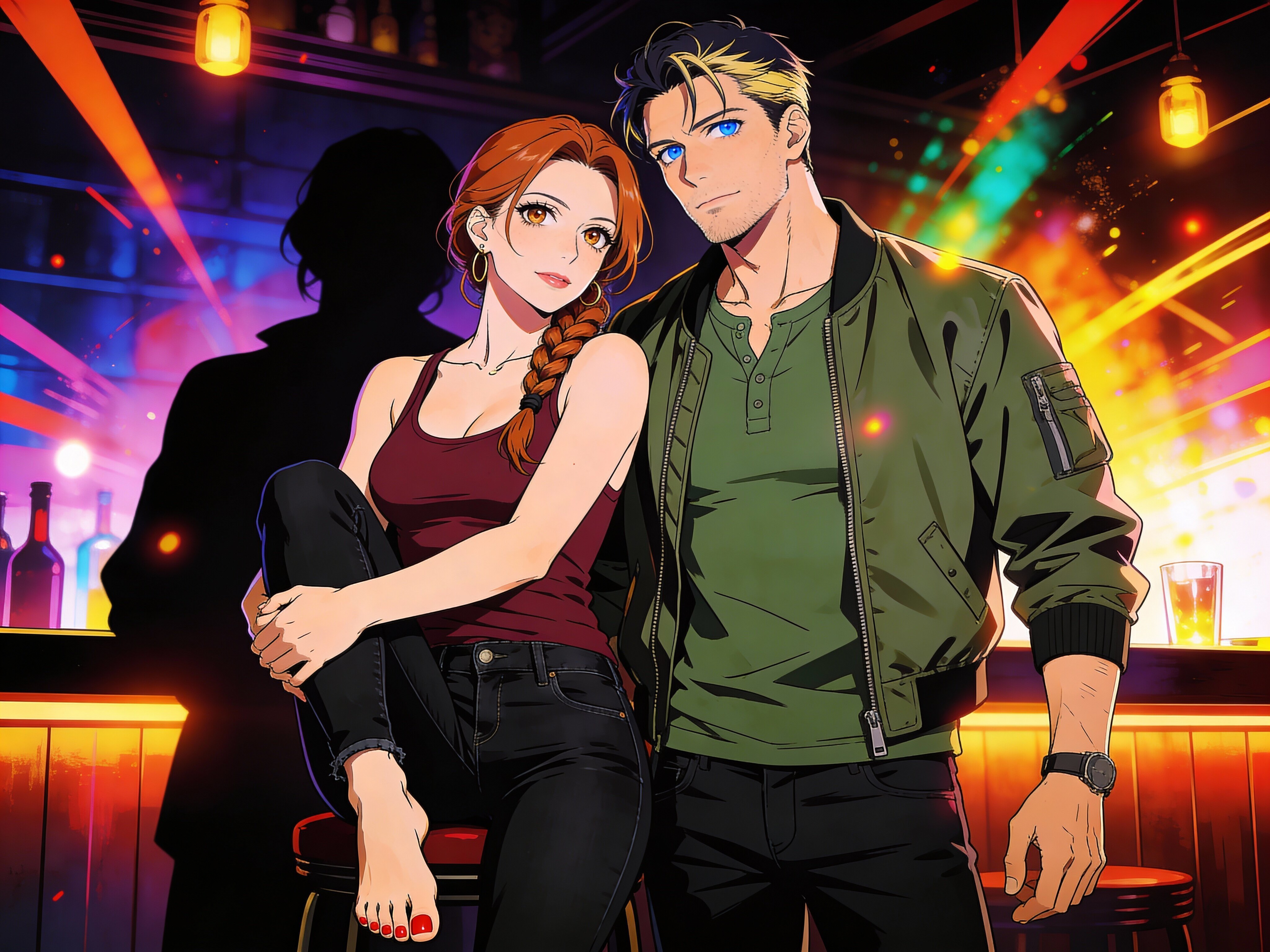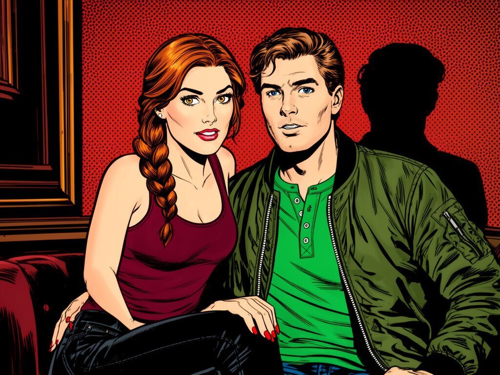 woman, late 30s, hazel eyes, auburn braid, black jeans, burgundy tank top; man, mid-30s, blue eyes, dark blond hair, green henley, bomber jacket; close in low-lit speakeasy, shadowy figure behind