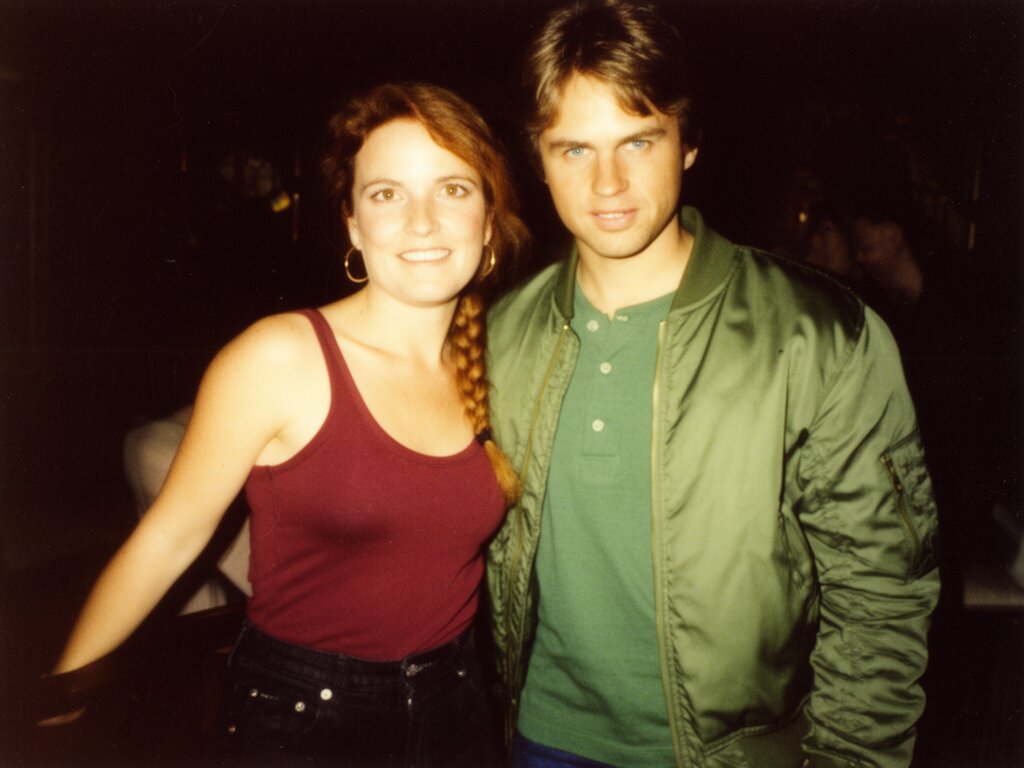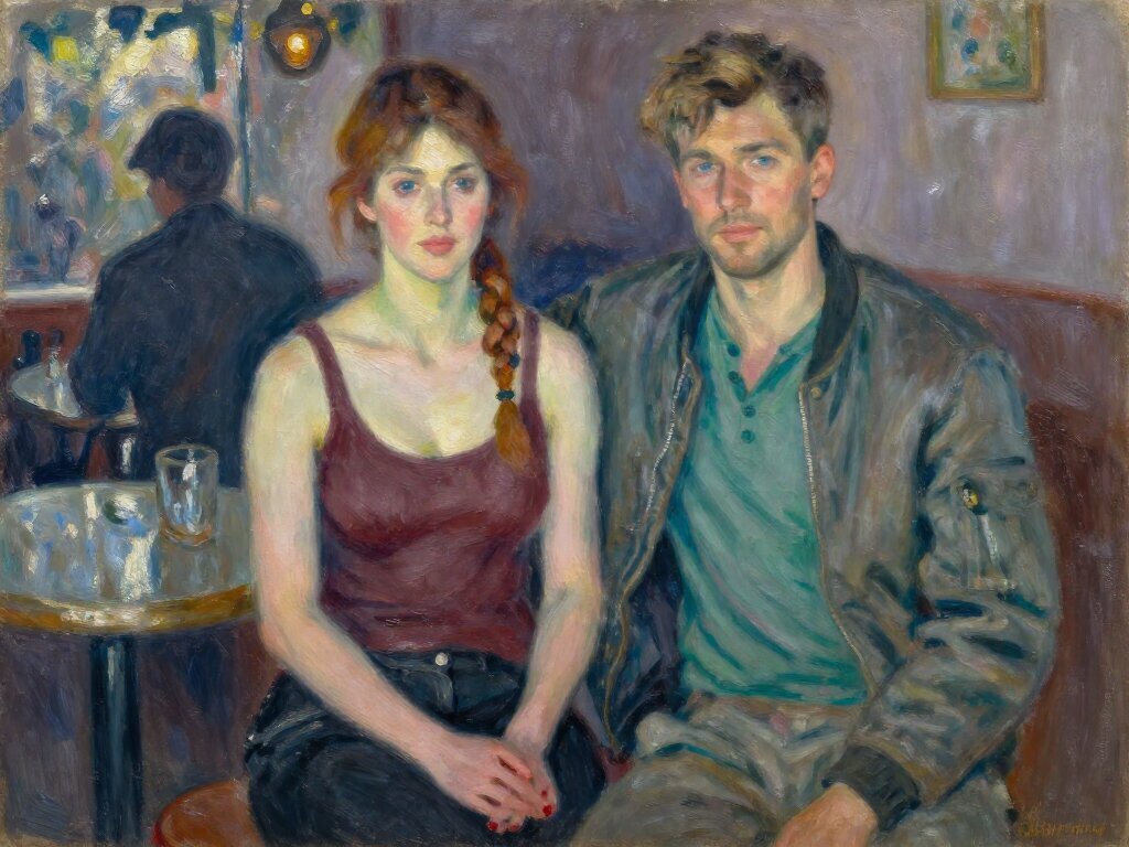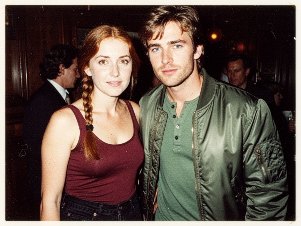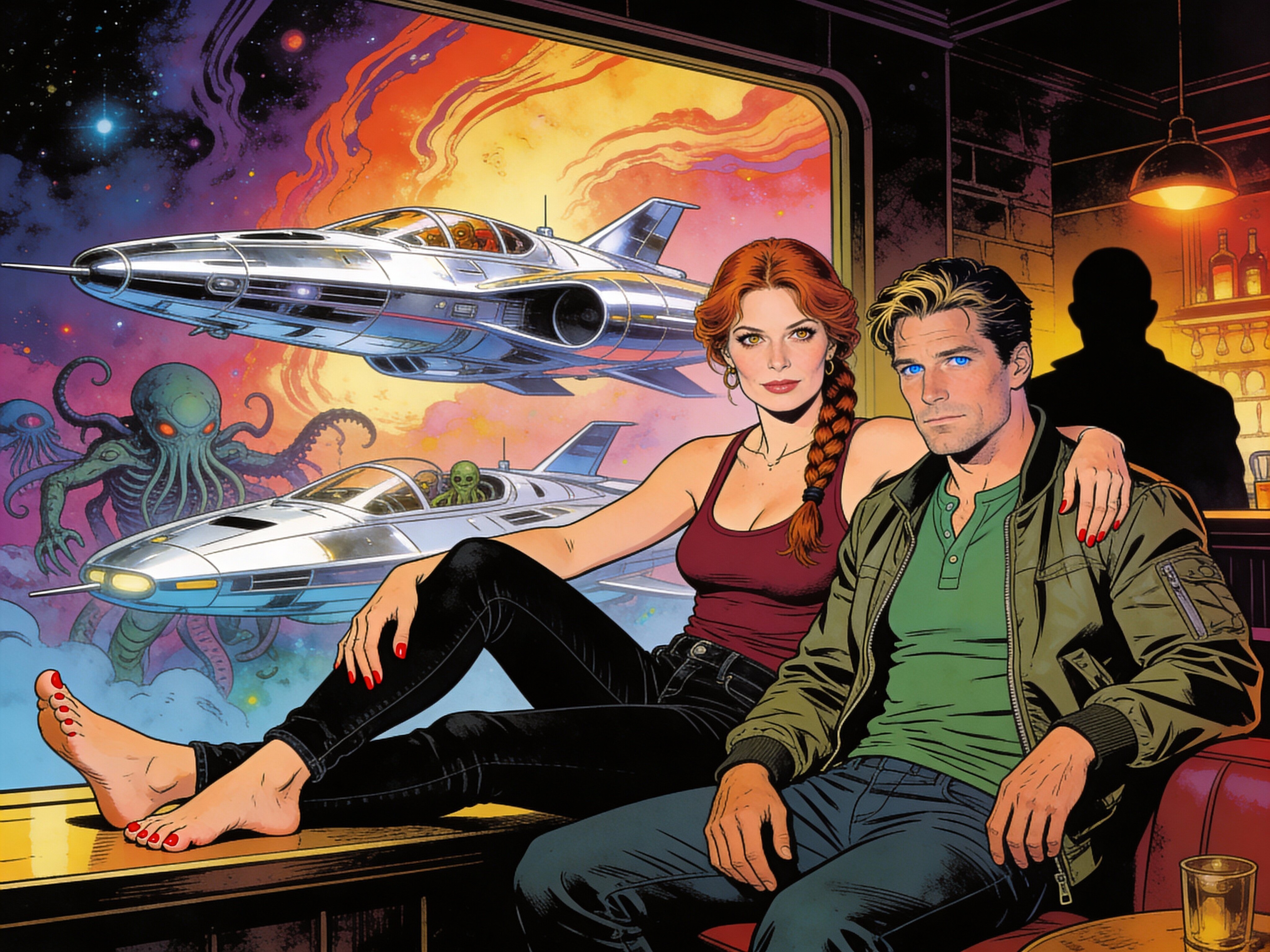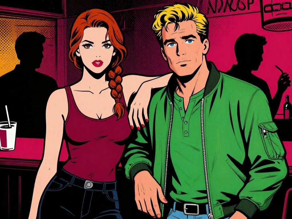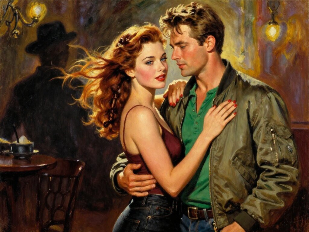 woman, late 30s, hazel eyes, auburn braid, black jeans, burgundy tank top; man, mid-30s, blue eyes, dark blond hair, green henley, bomber jacket; close in low-lit speakeasy, shadowy figure behind