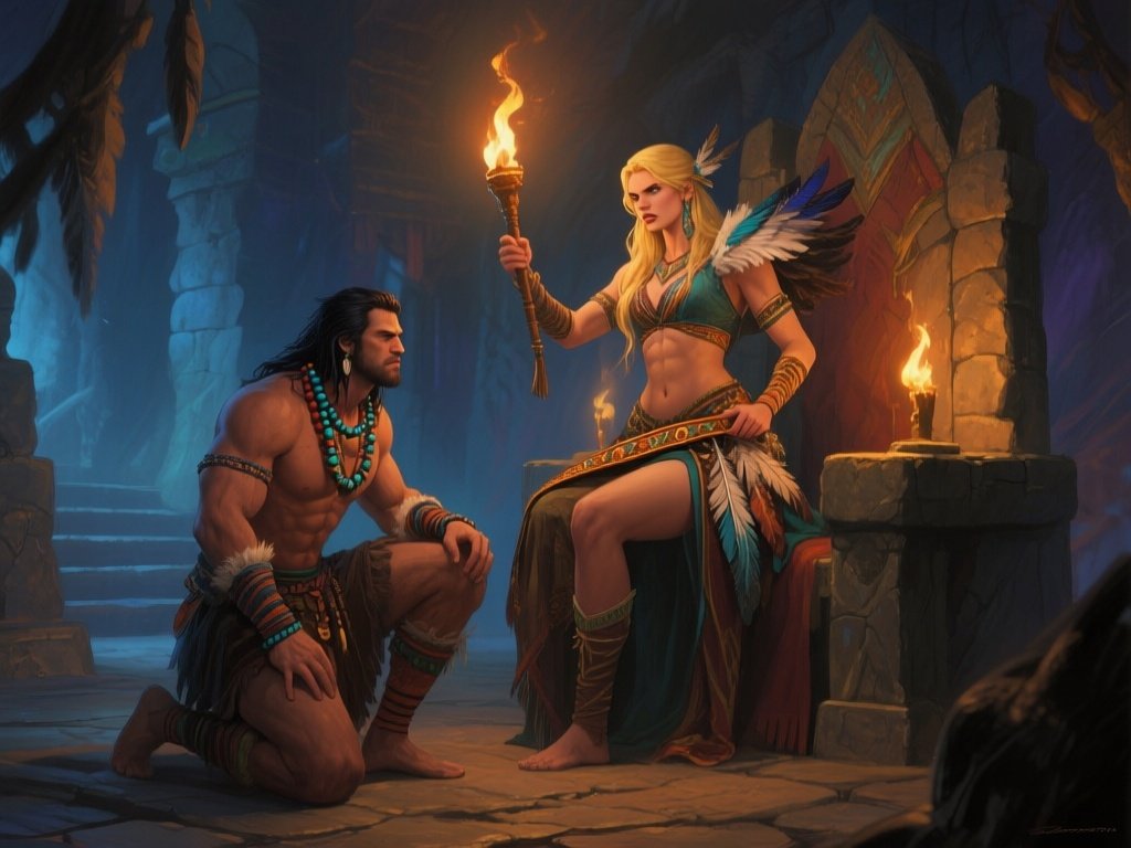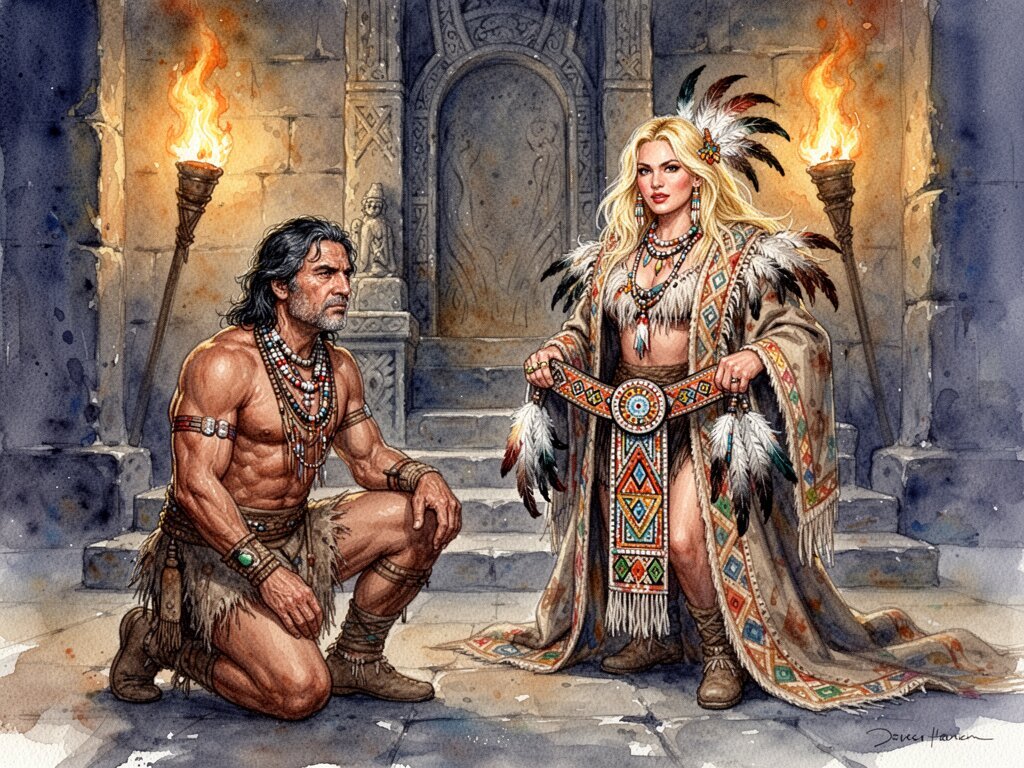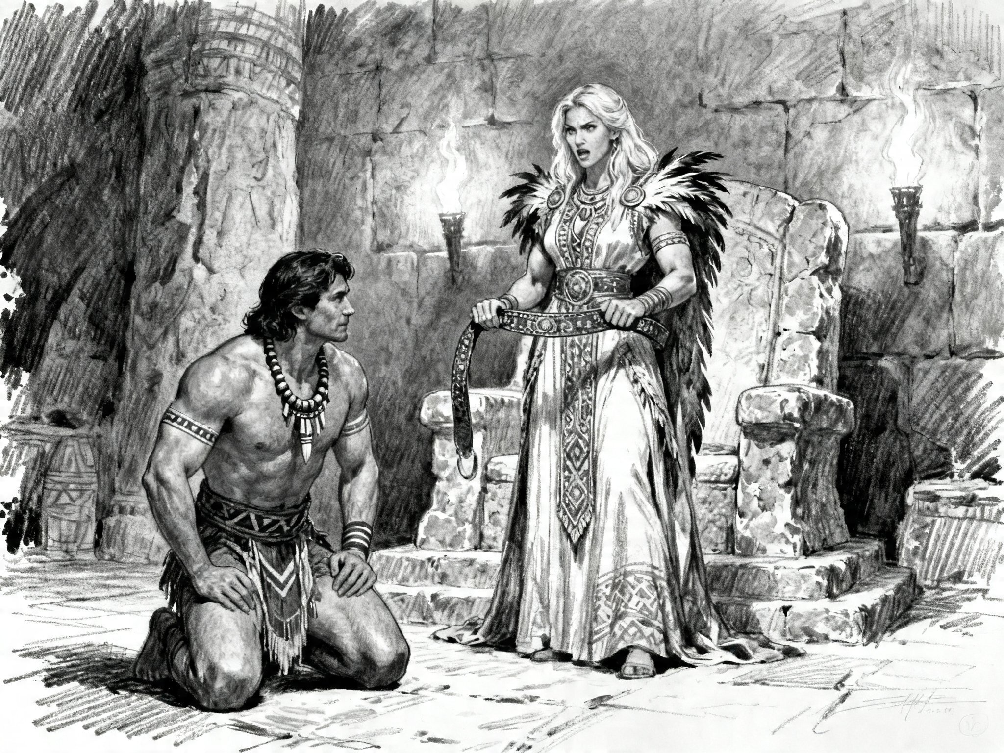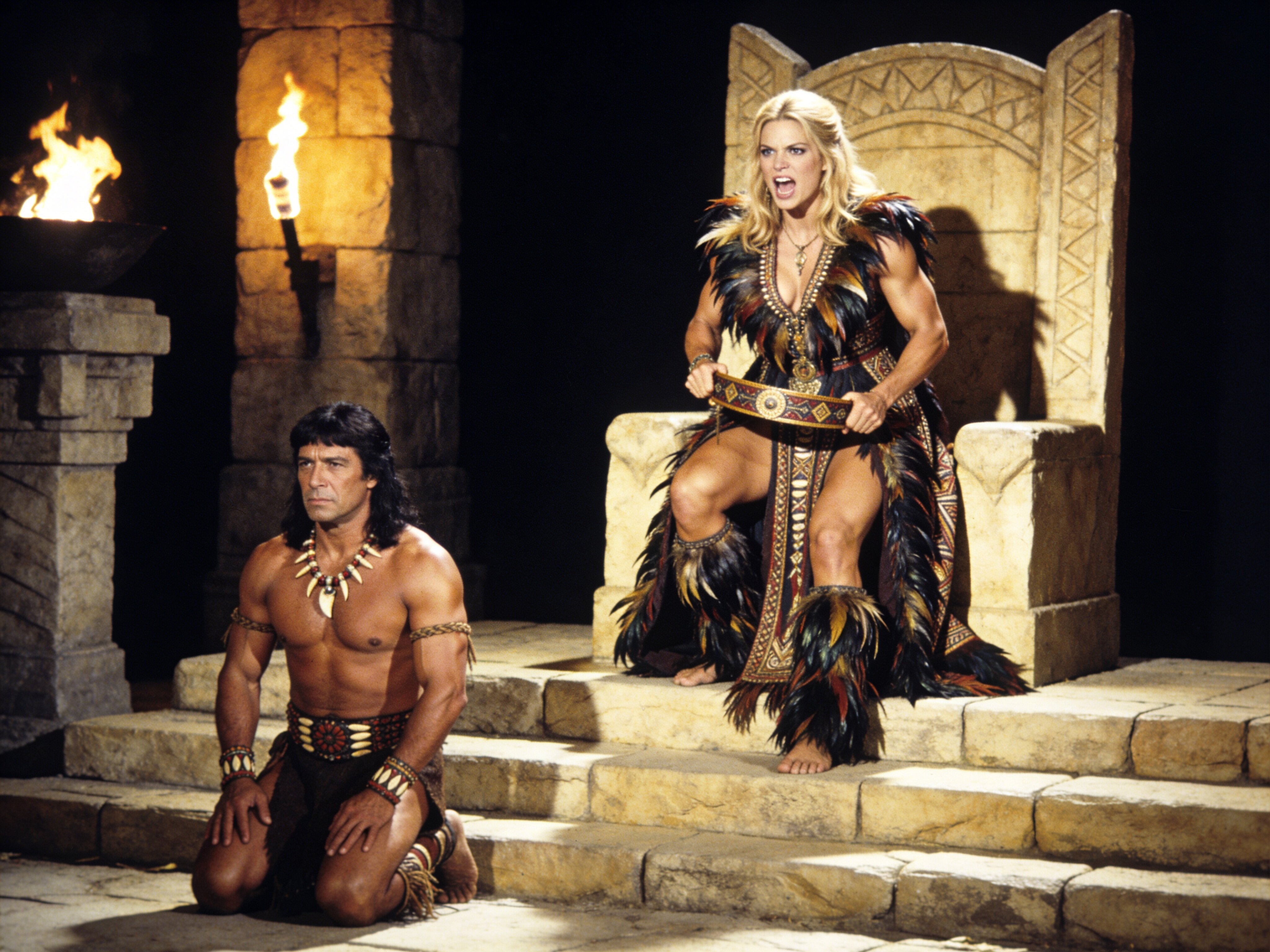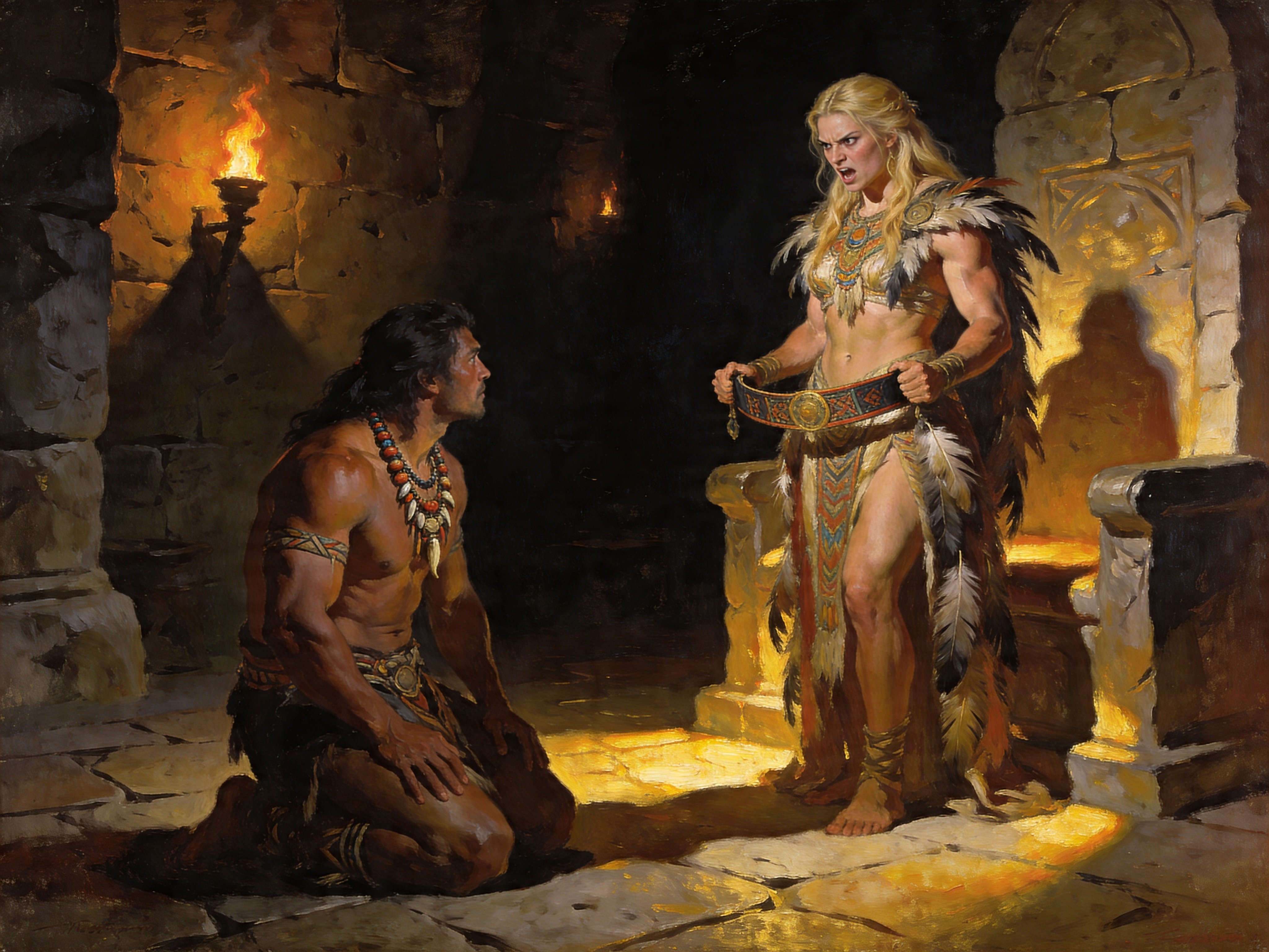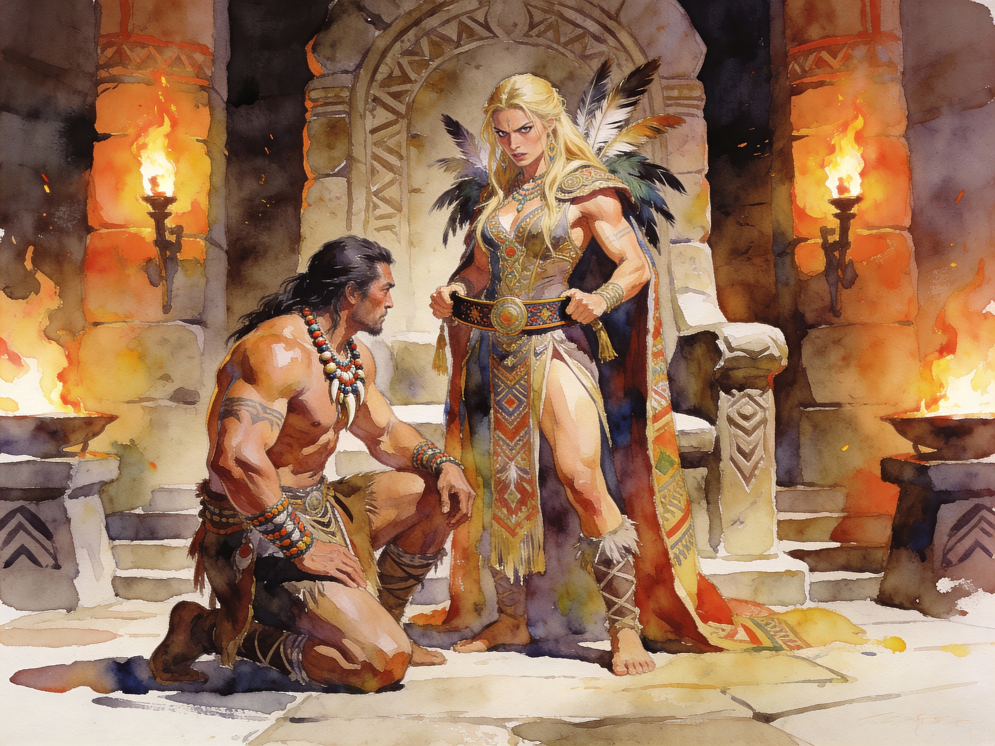 tribal setting; muscular man, 40 y.o, dark hair, tribal beads, kneeling; blonde woman, 25 y.o, strong build, ornate robe with feathers, holding ceremonial belt, intense expression, torch-lit stone throne room