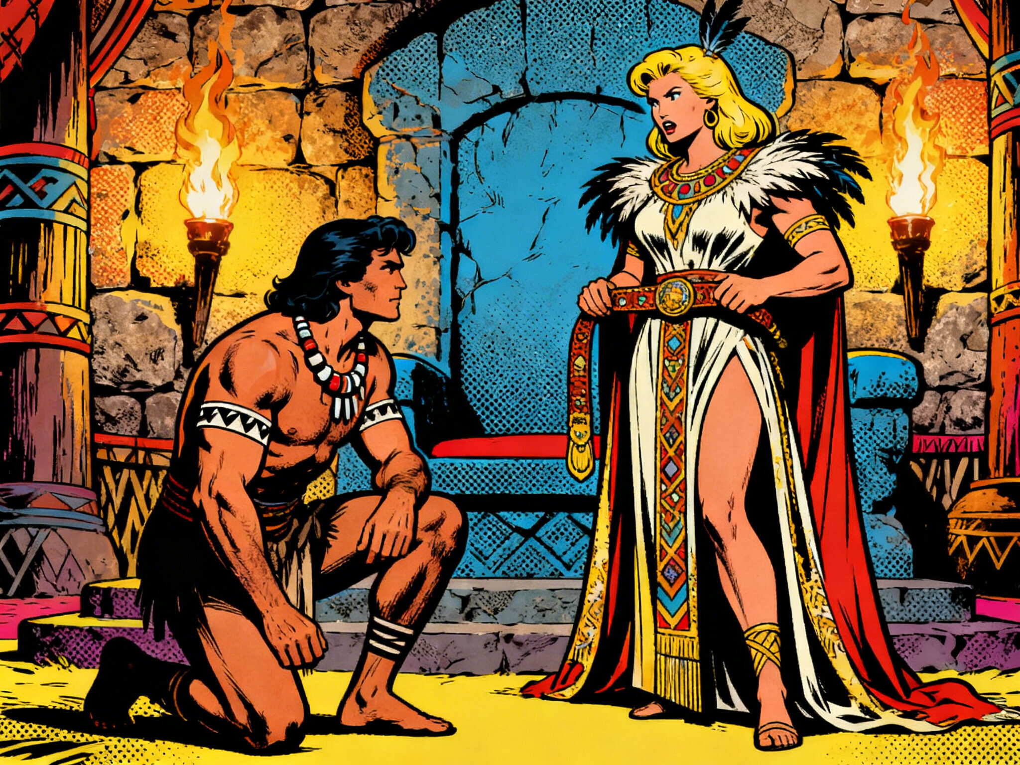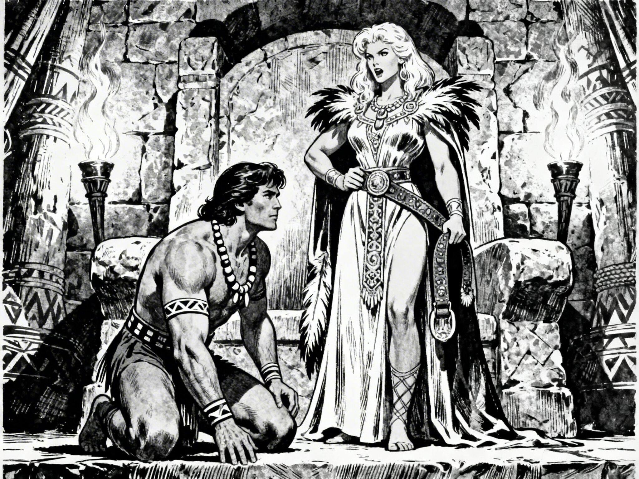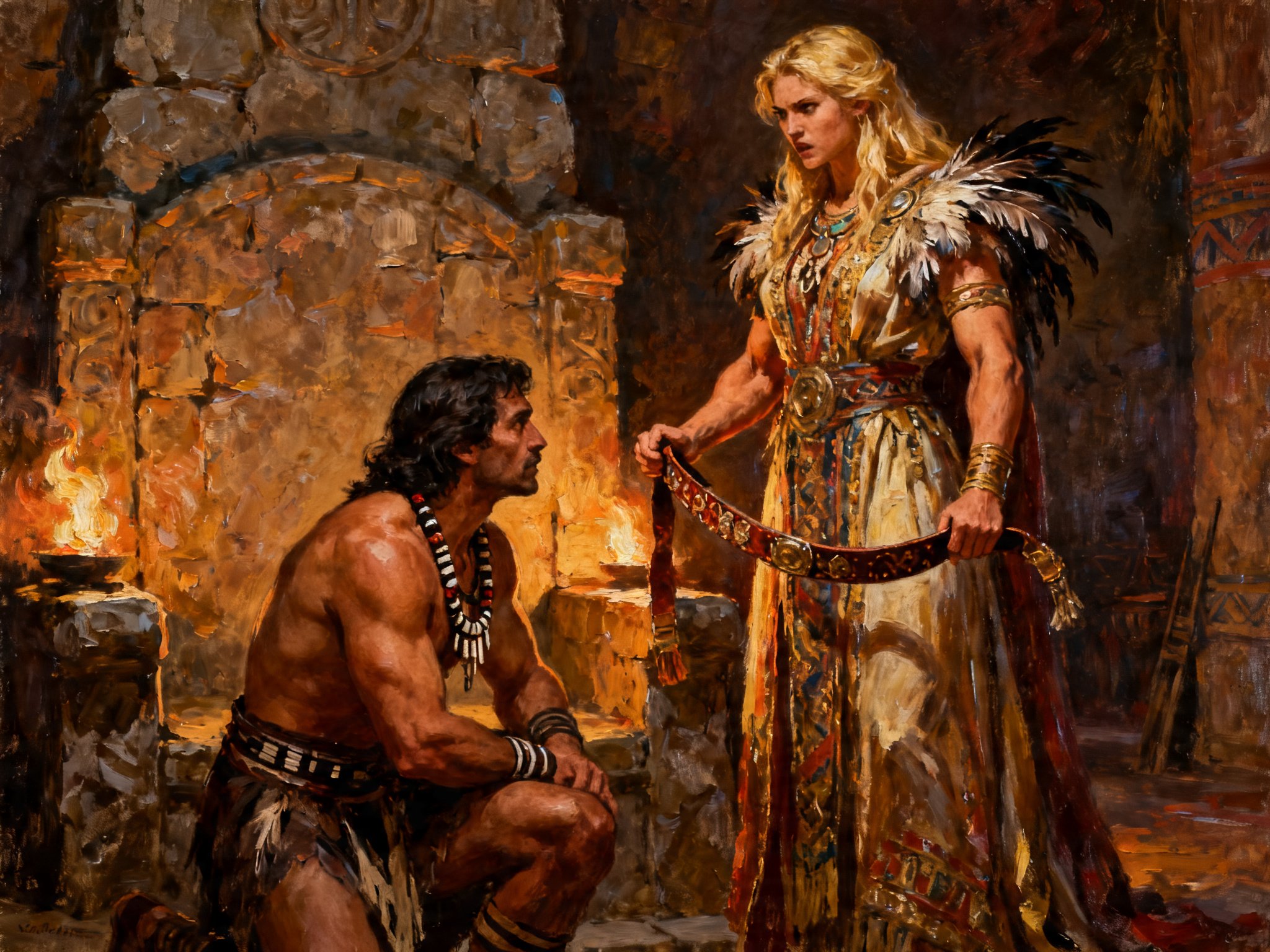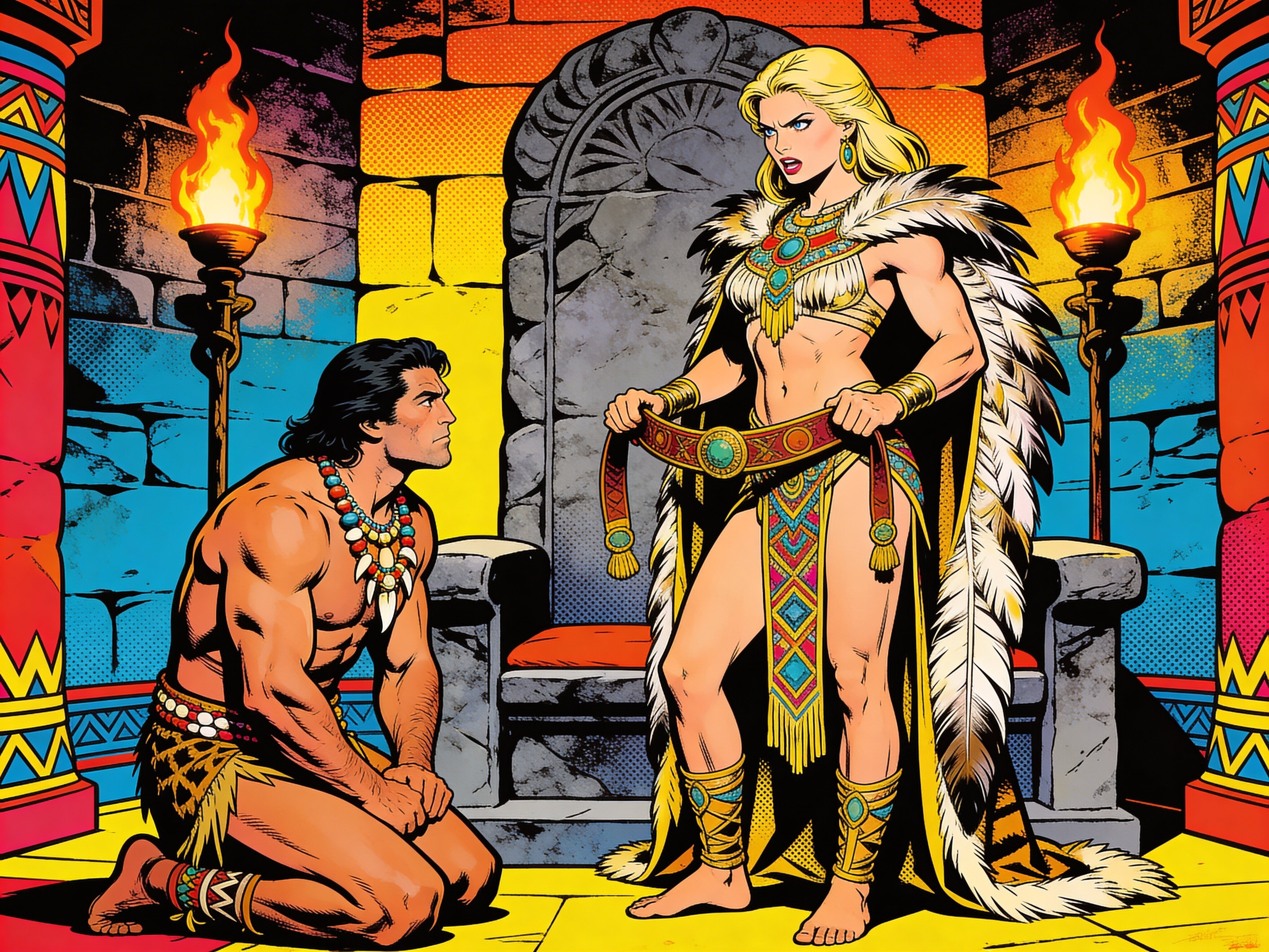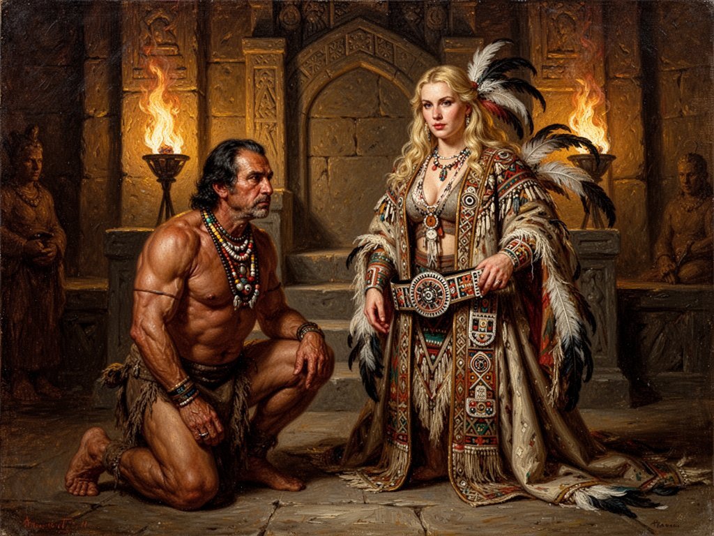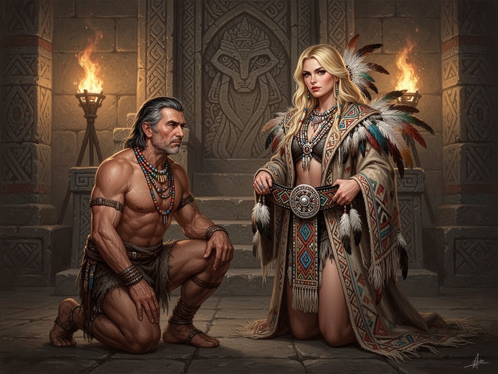tribal setting; muscular man, 40 y.o, dark hair, tribal beads, kneeling; blonde woman, 25 y.o, strong build, ornate robe with feathers, holding ceremonial belt, intense expression, torch-lit stone throne room