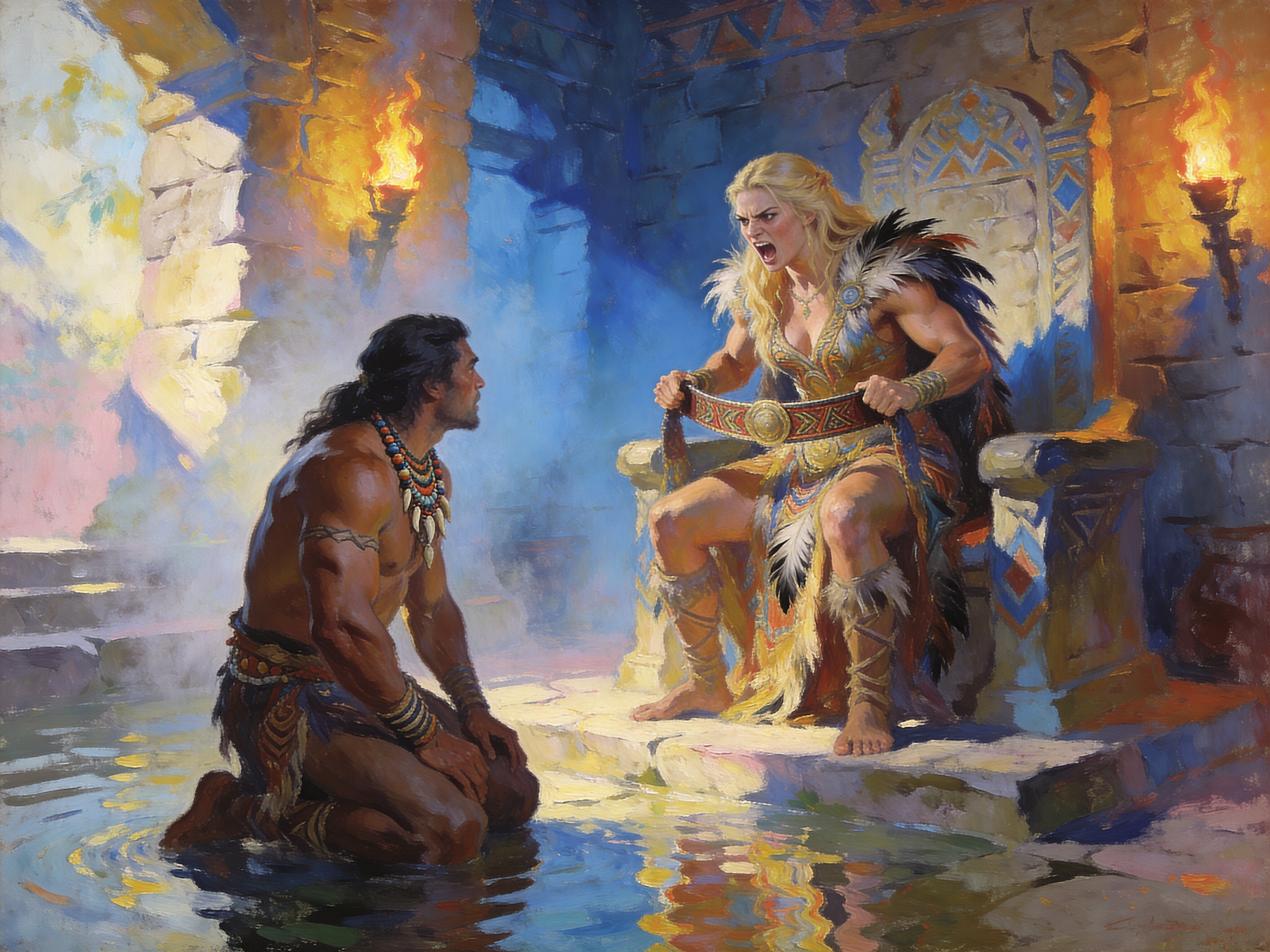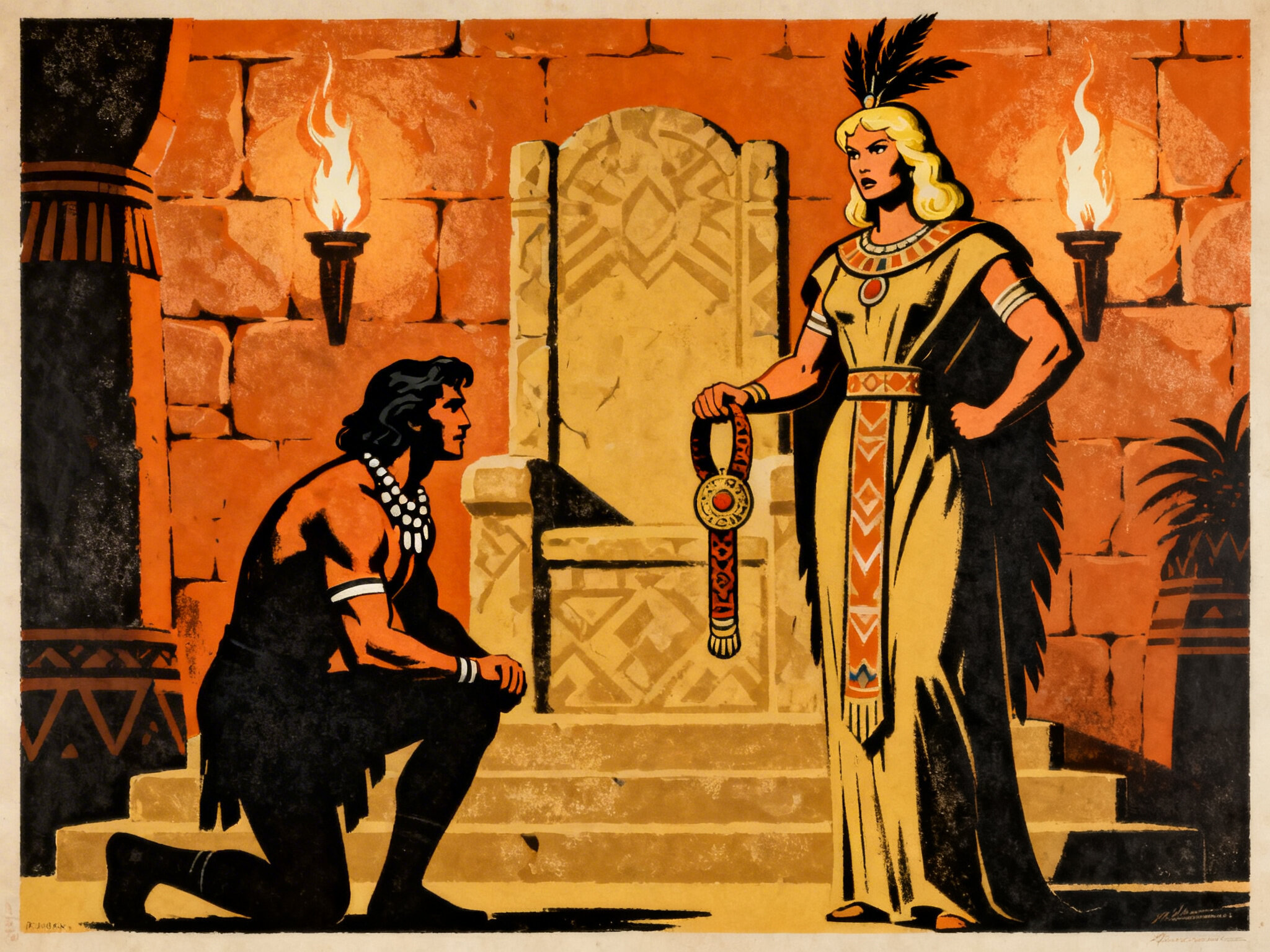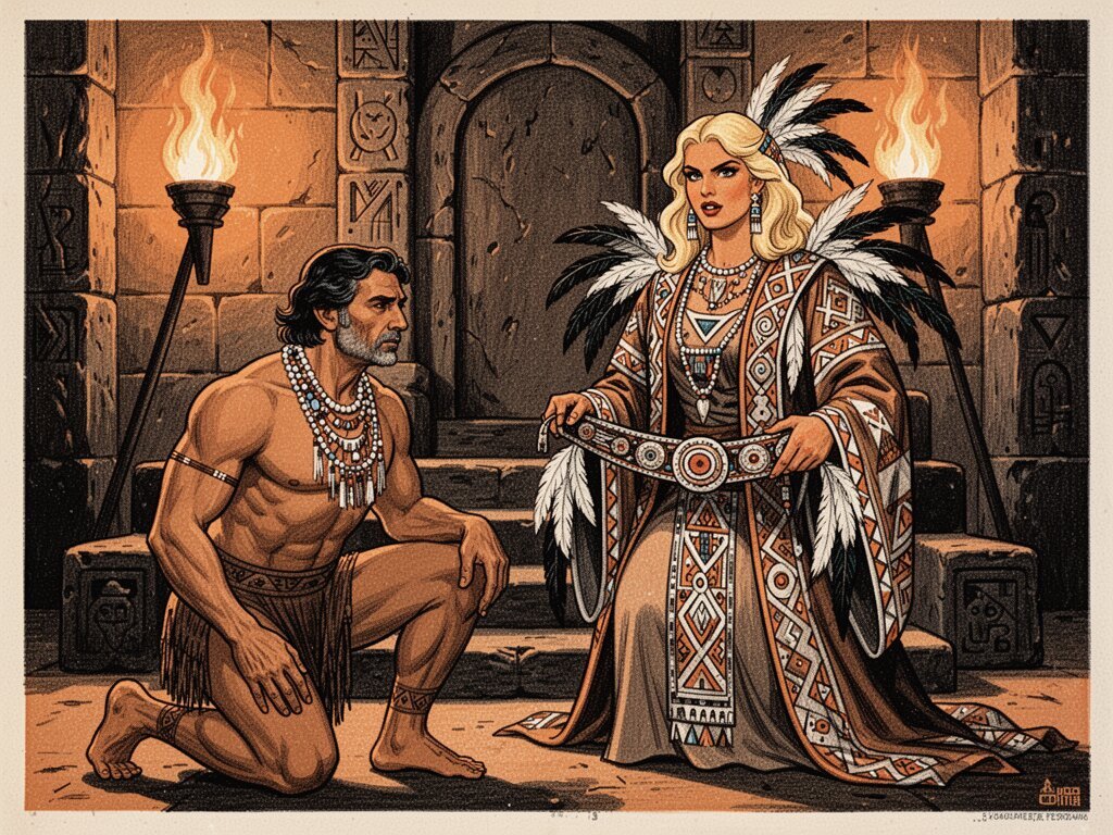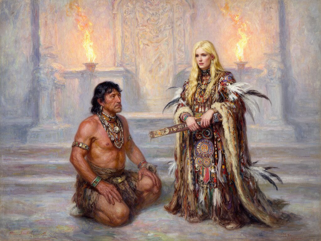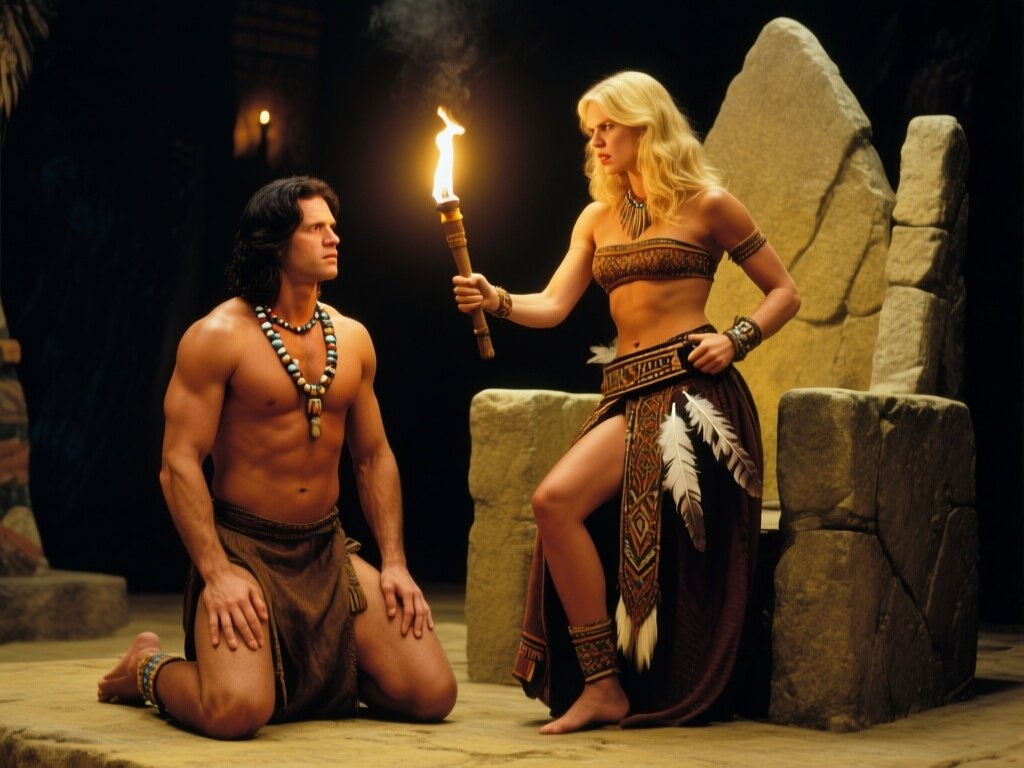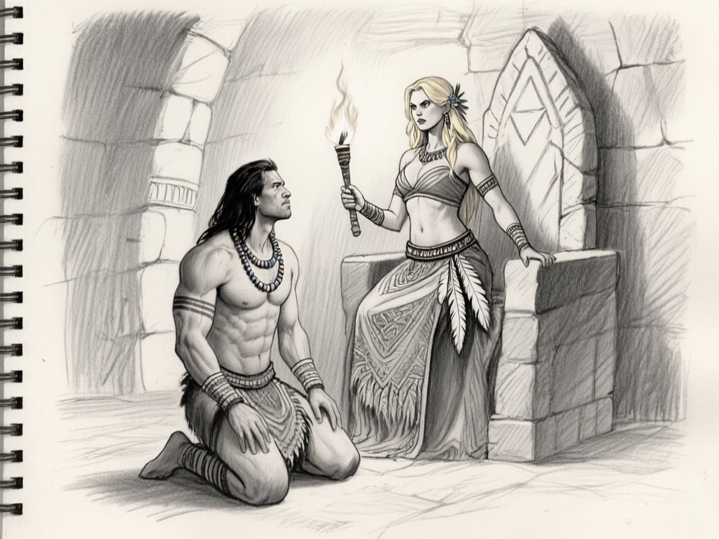 tribal setting; muscular man, 40 y.o, dark hair, tribal beads, kneeling; blonde woman, 25 y.o, strong build, ornate robe with feathers, holding ceremonial belt, intense expression, torch-lit stone throne room