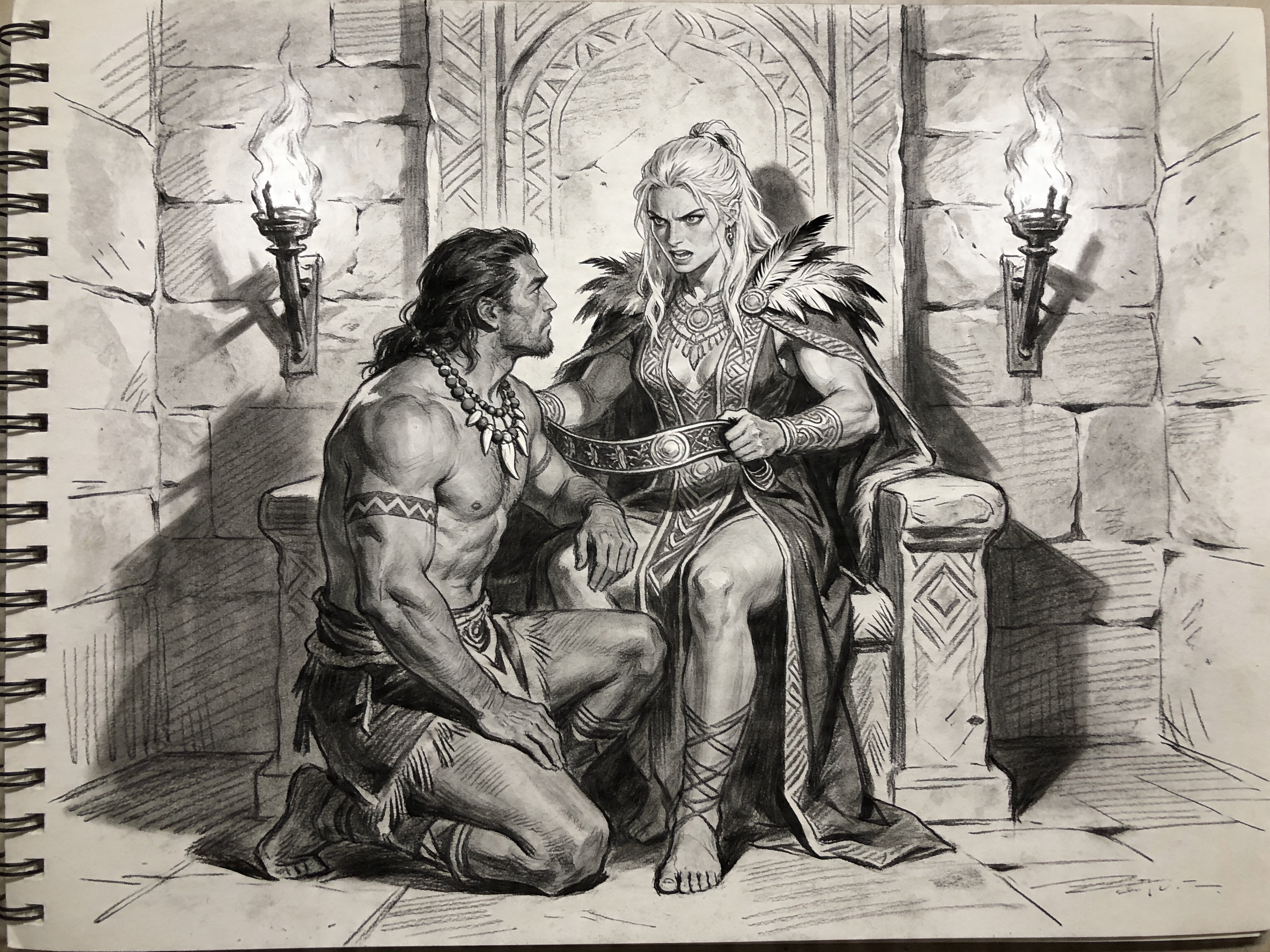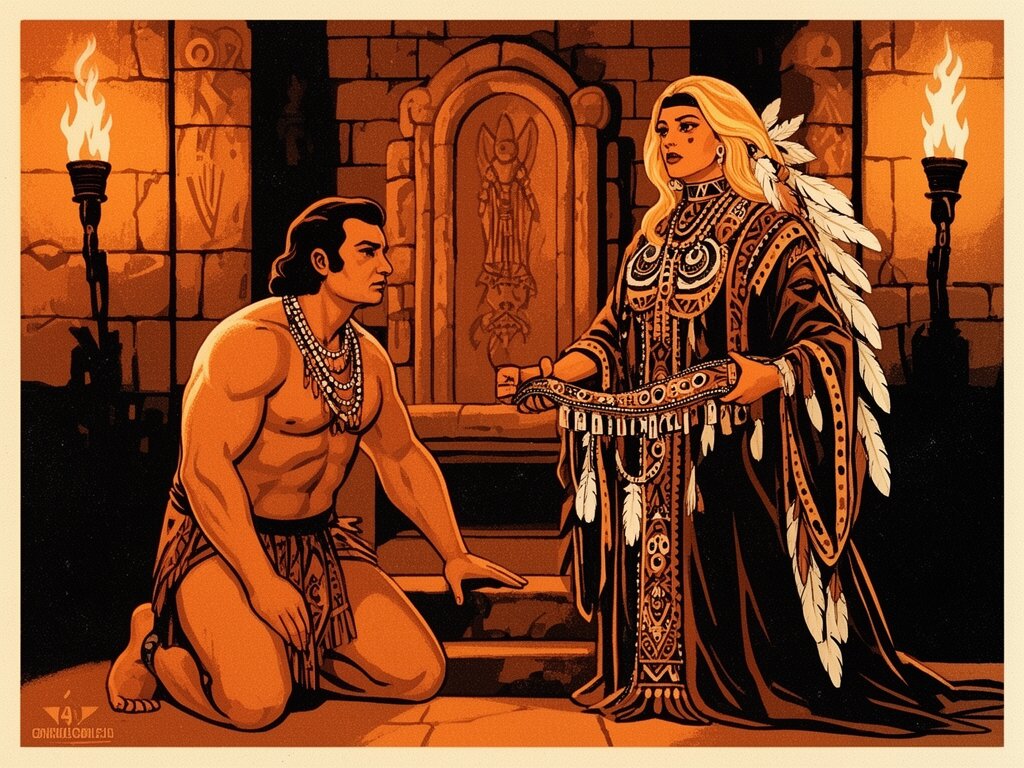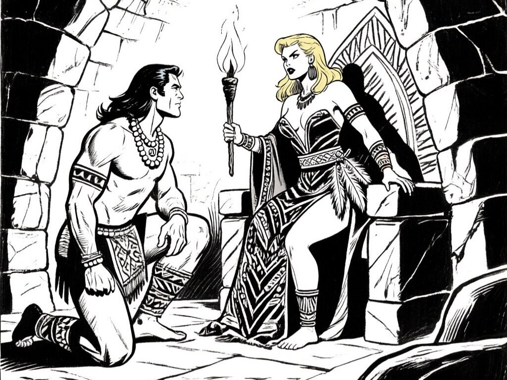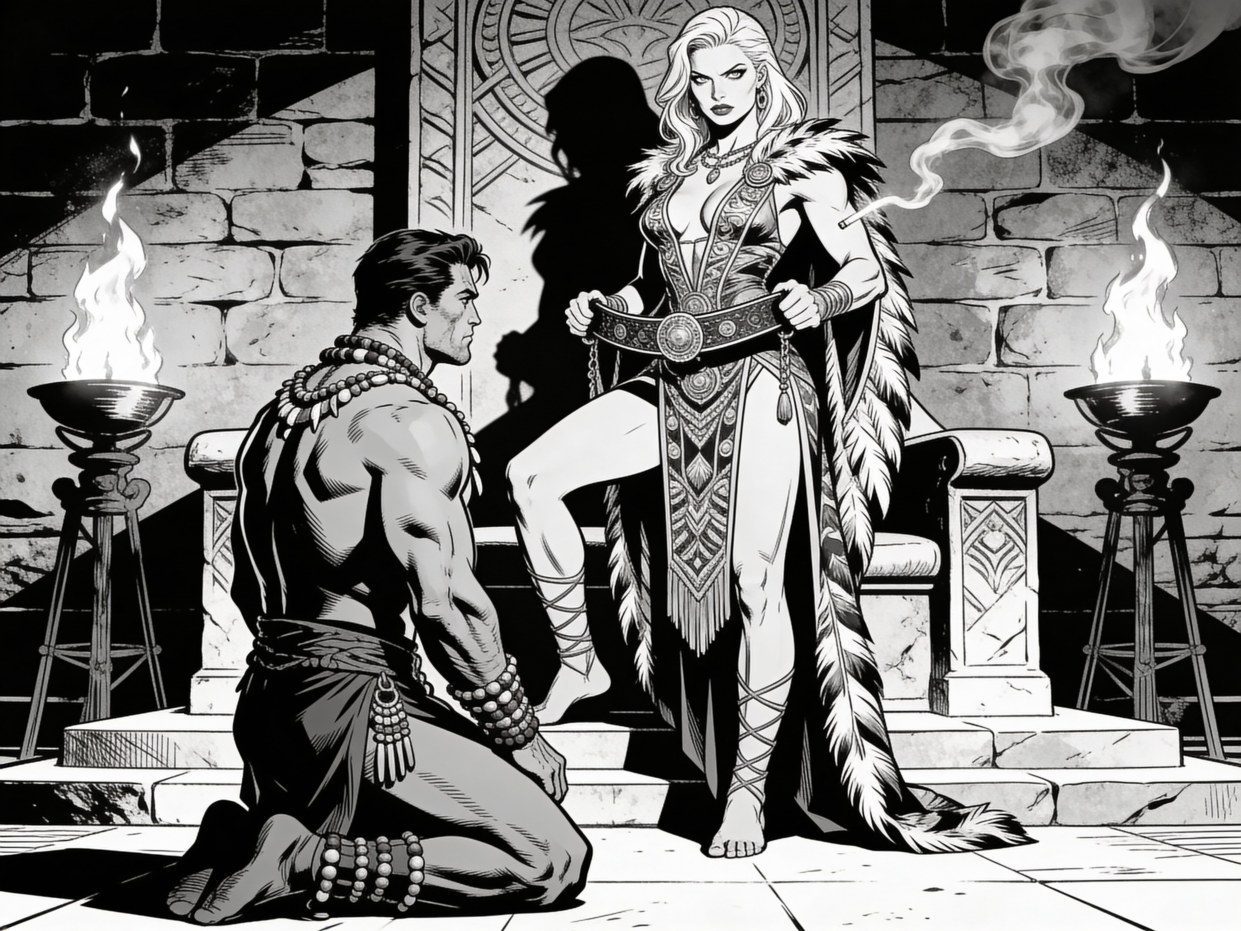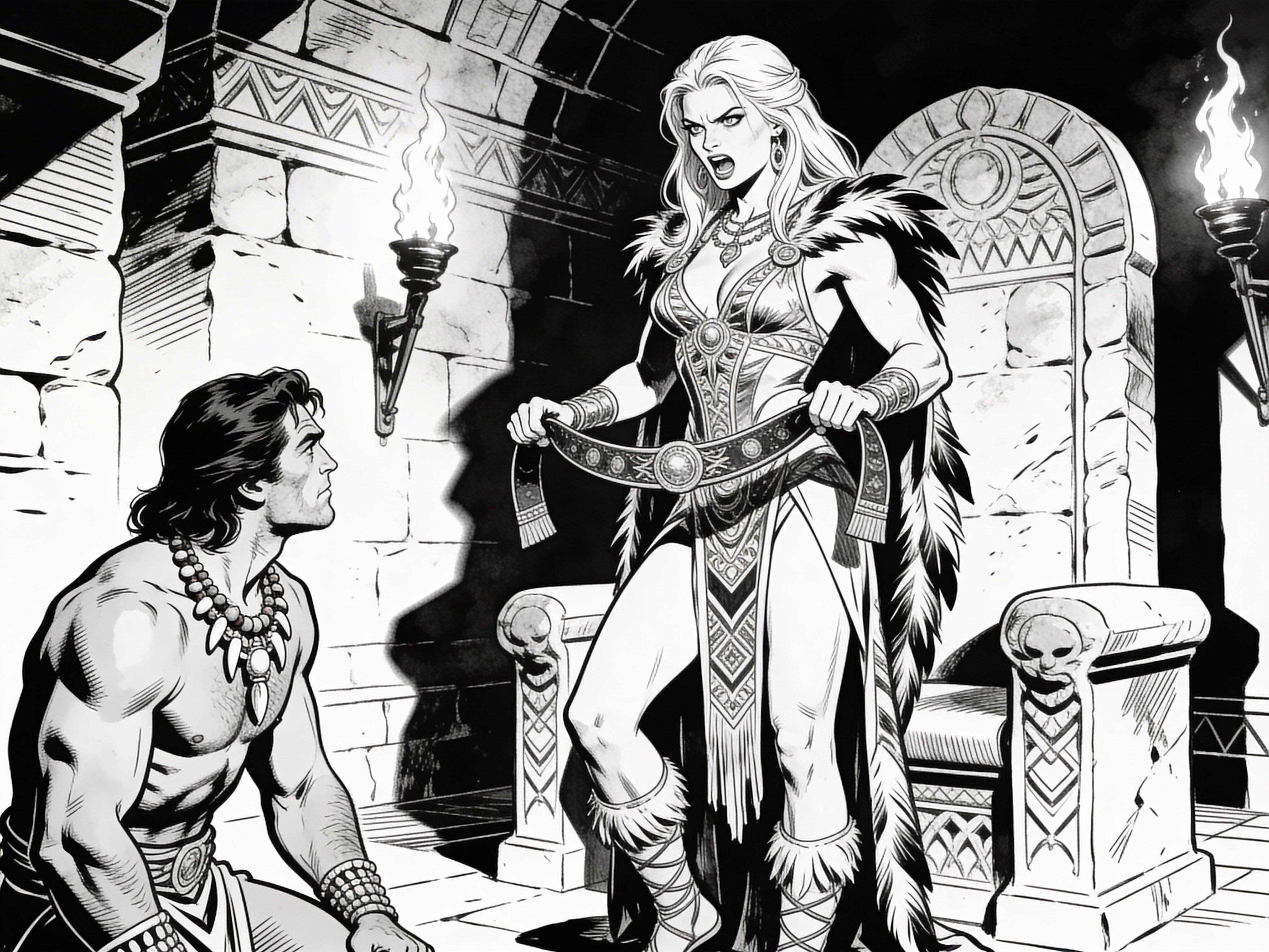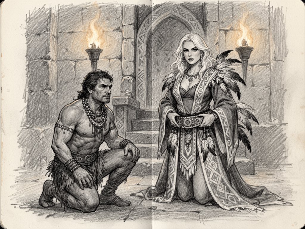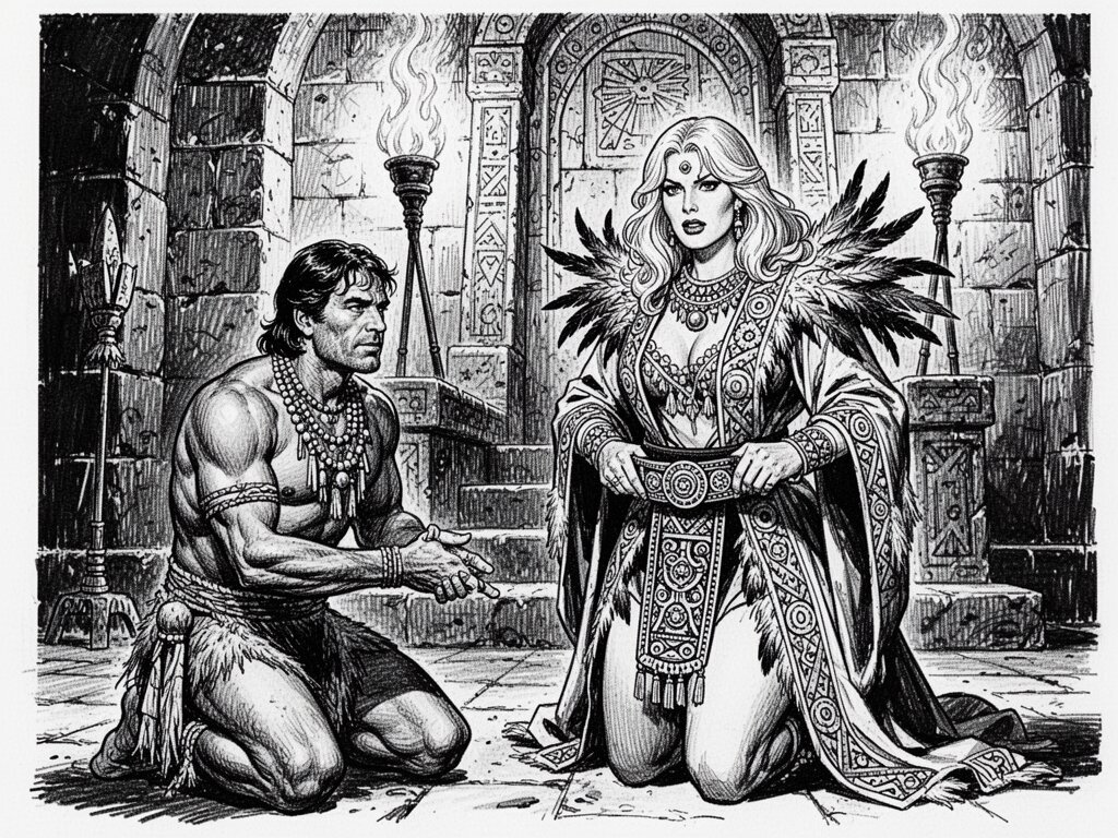 tribal setting; muscular man, 40 y.o, dark hair, tribal beads, kneeling; blonde woman, 25 y.o, strong build, ornate robe with feathers, holding ceremonial belt, intense expression, torch-lit stone throne room