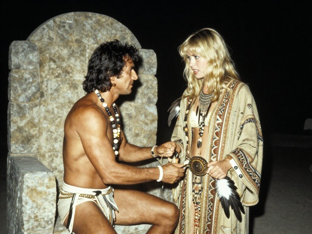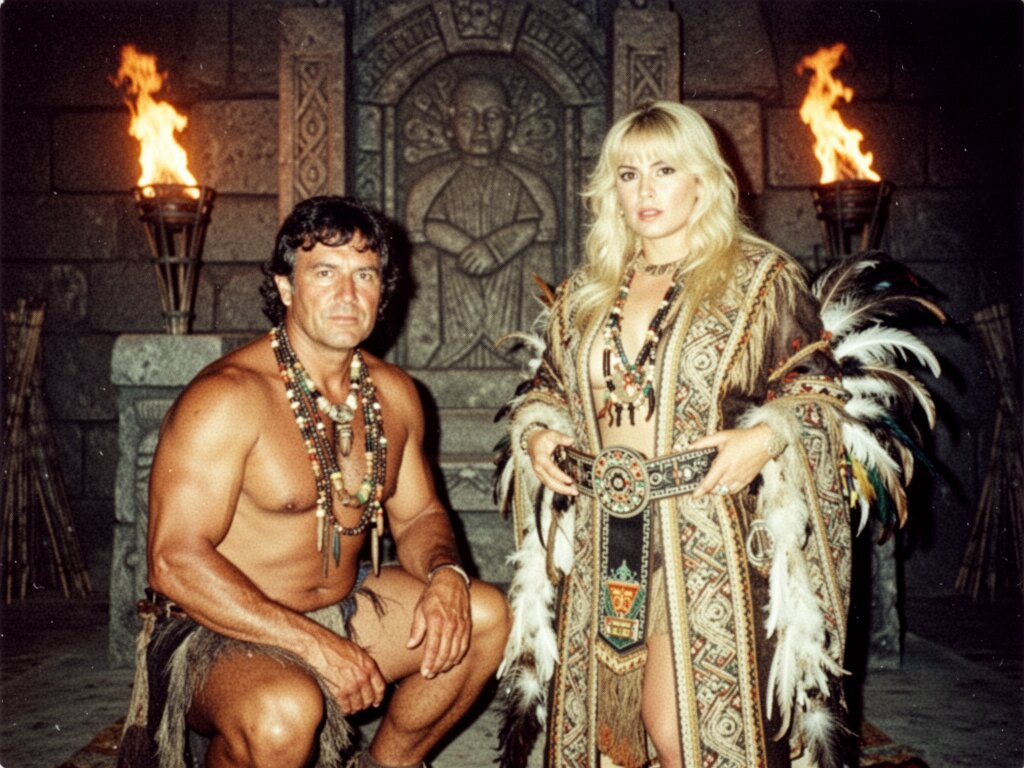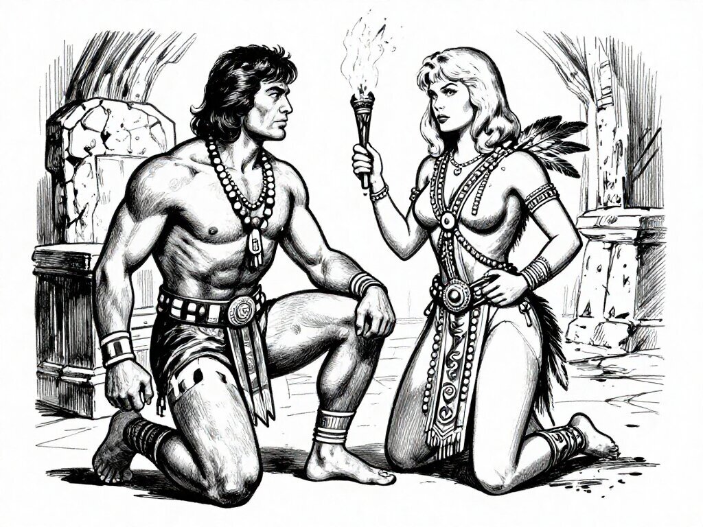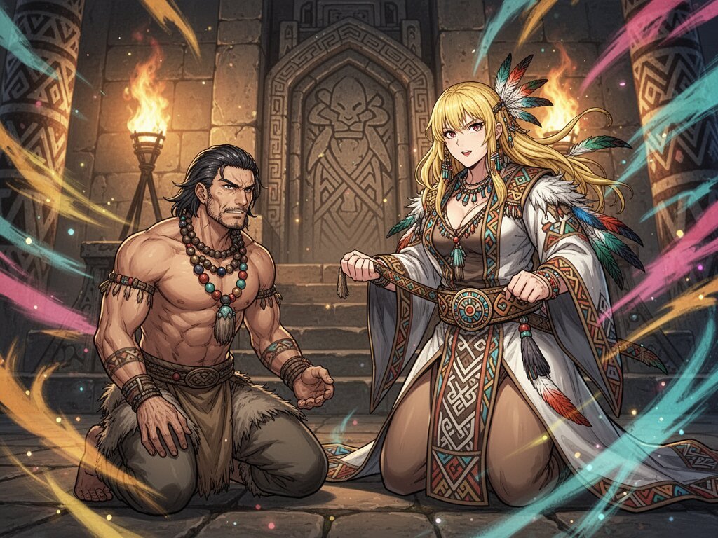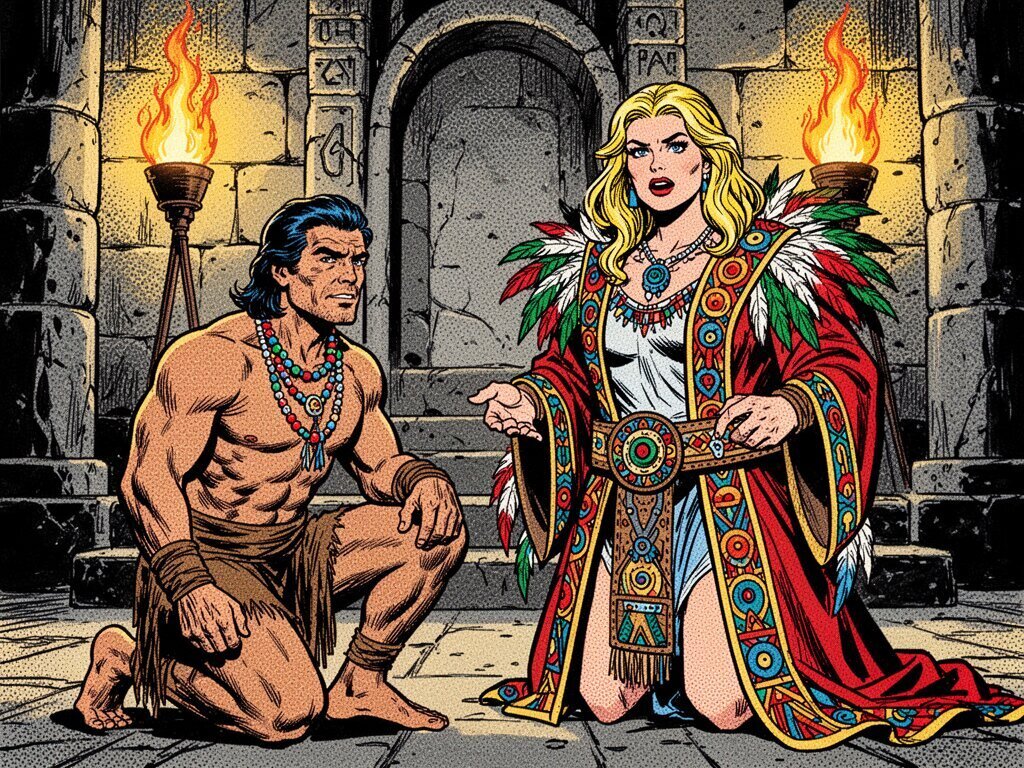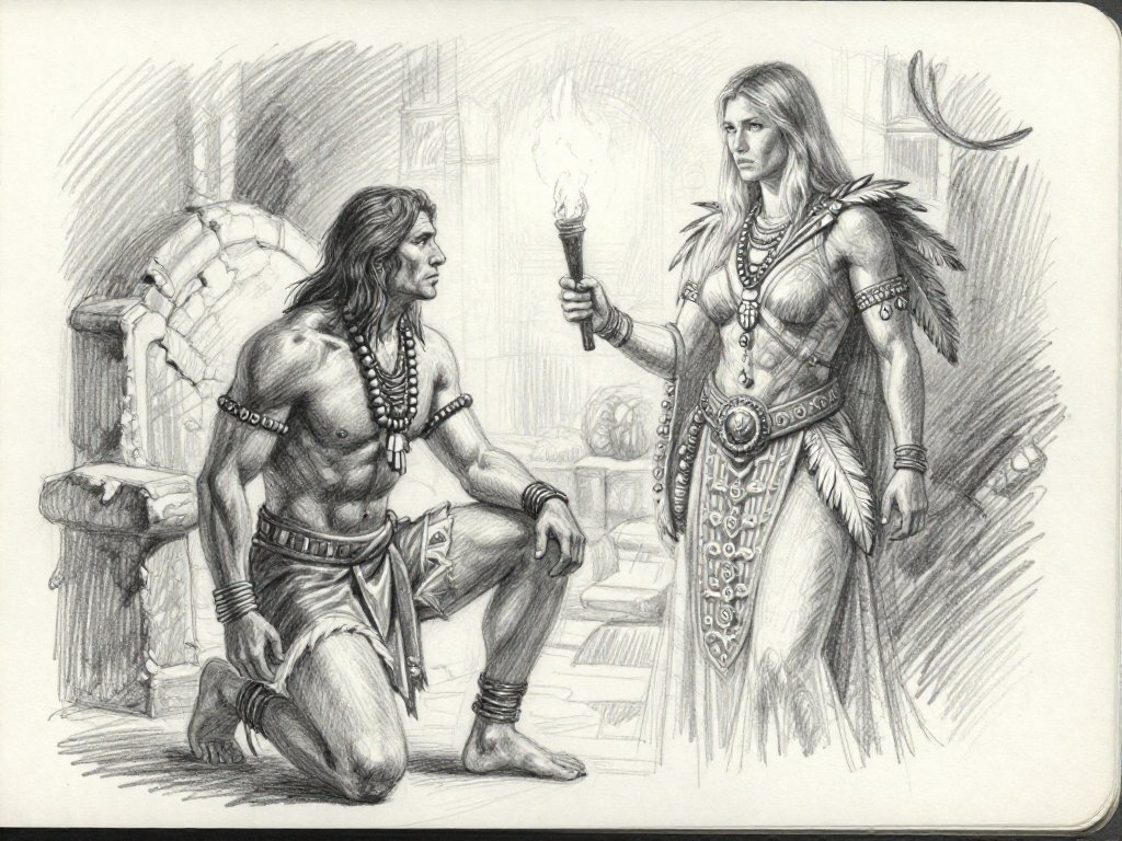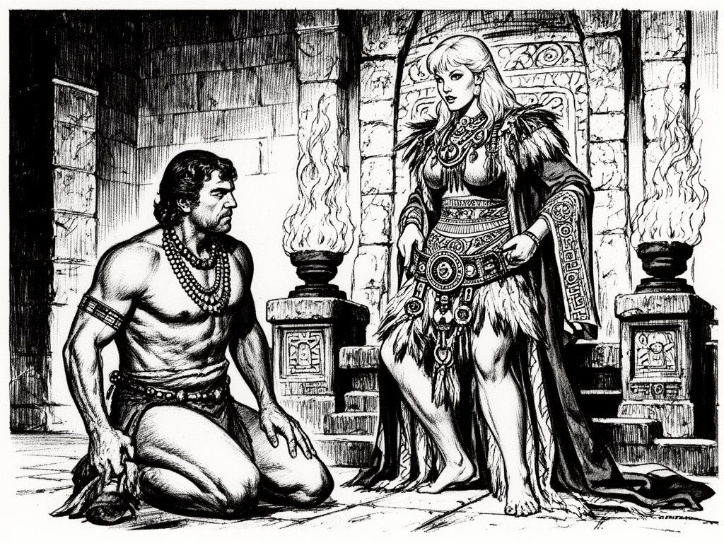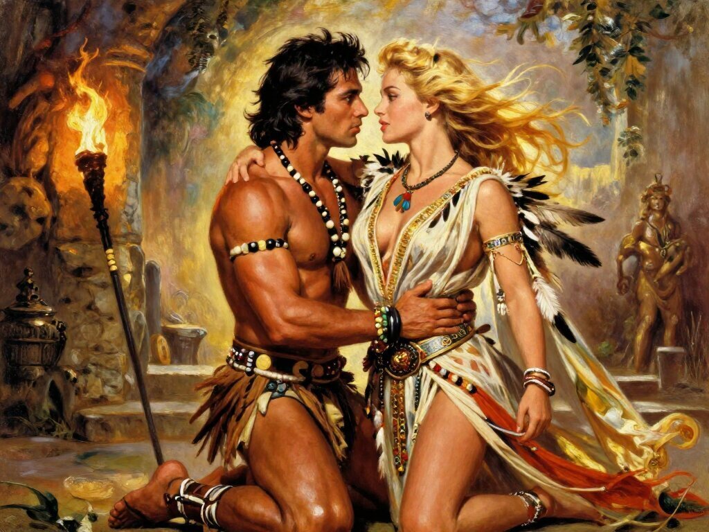 tribal setting; muscular man, 40 y.o, dark hair, tribal beads, kneeling; blonde woman, 25 y.o, strong build, ornate robe with feathers, holding ceremonial belt, intense expression, torch-lit stone throne room