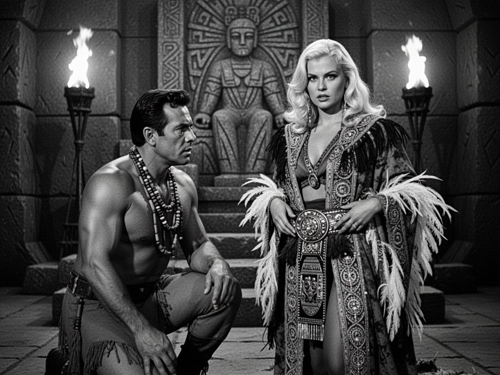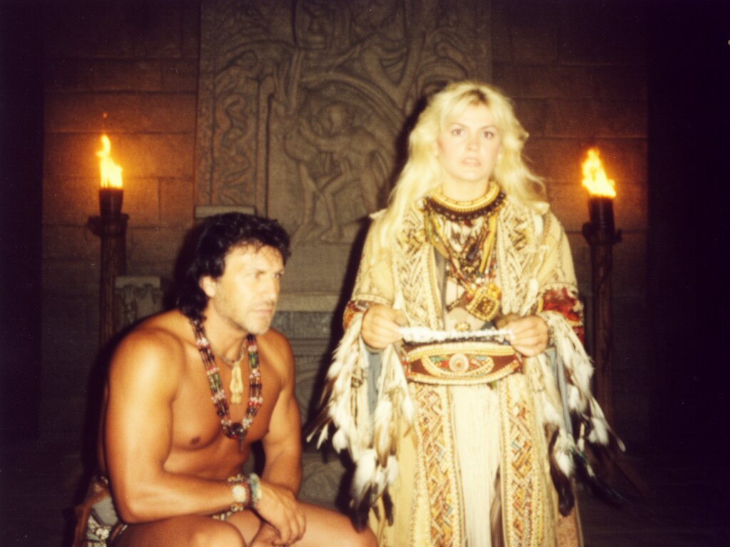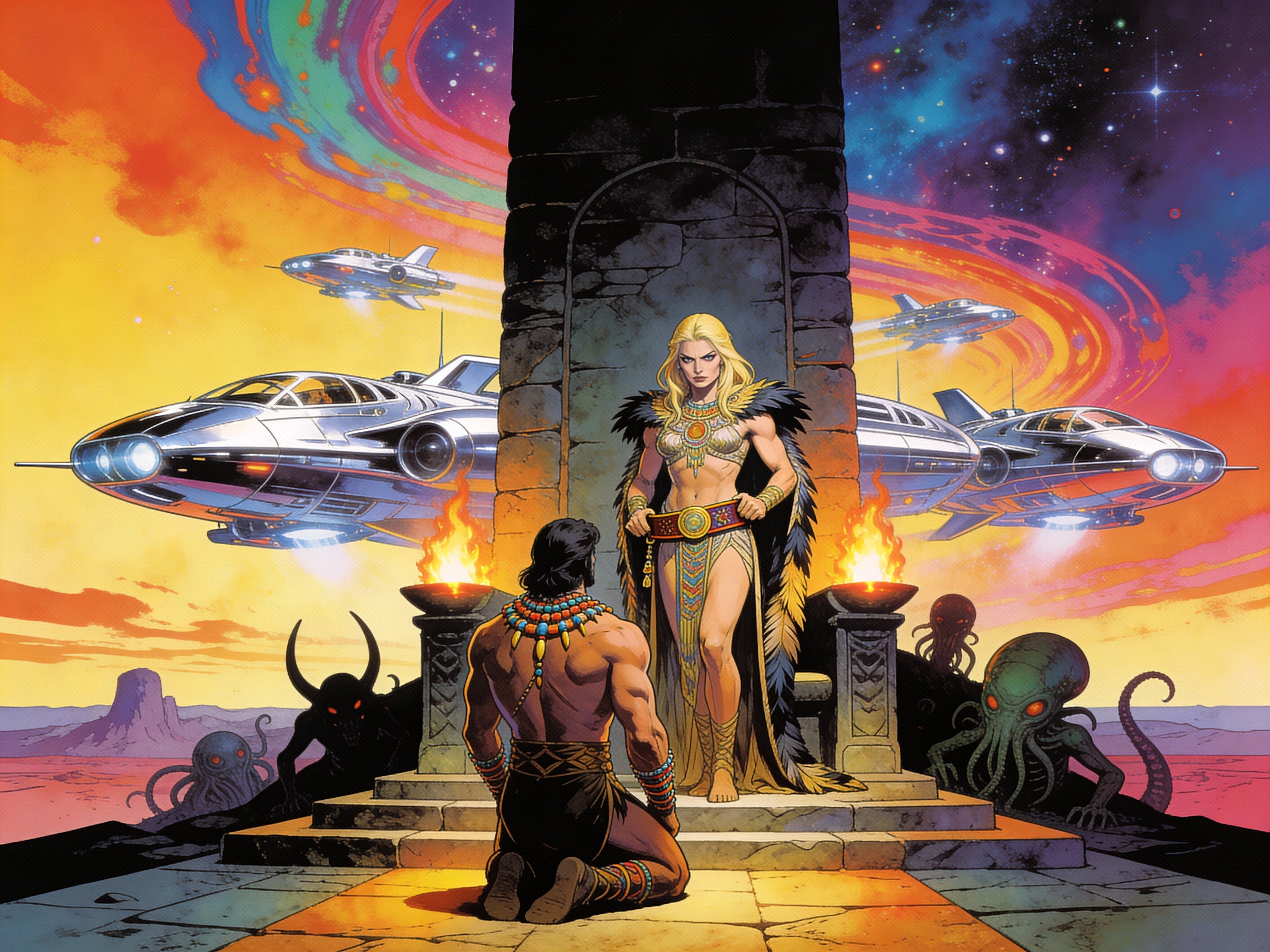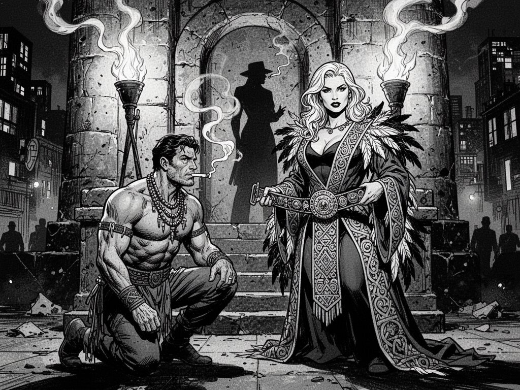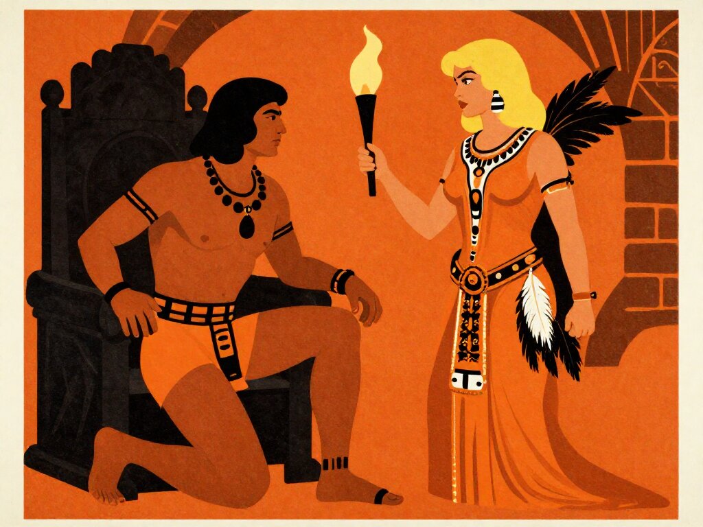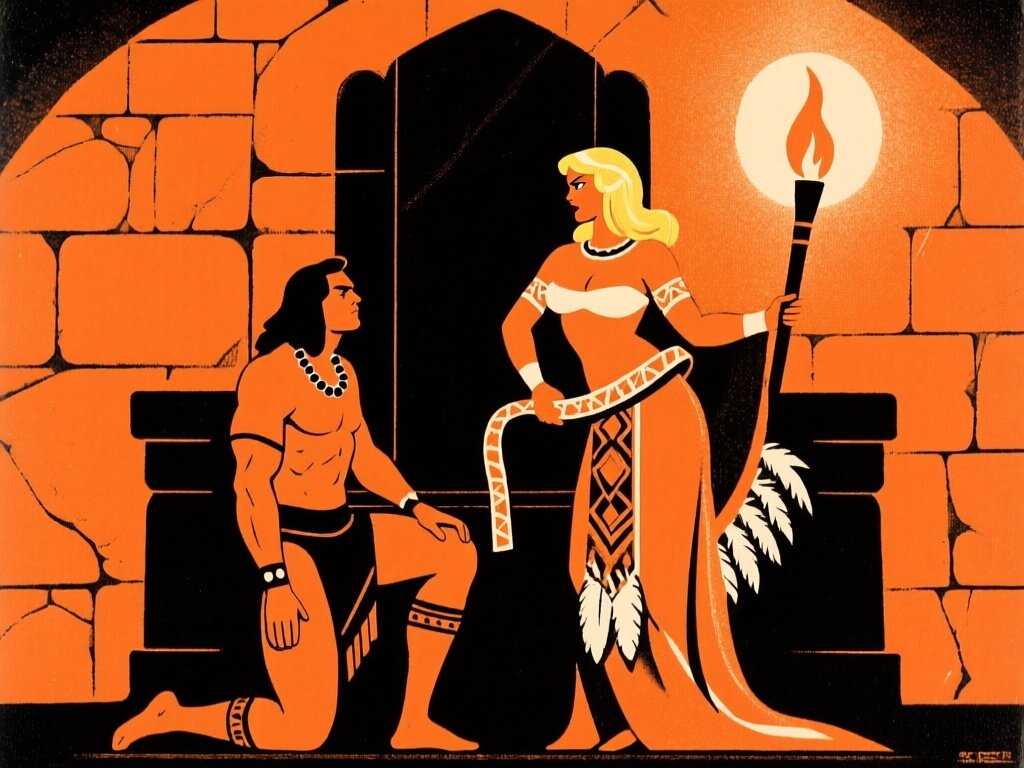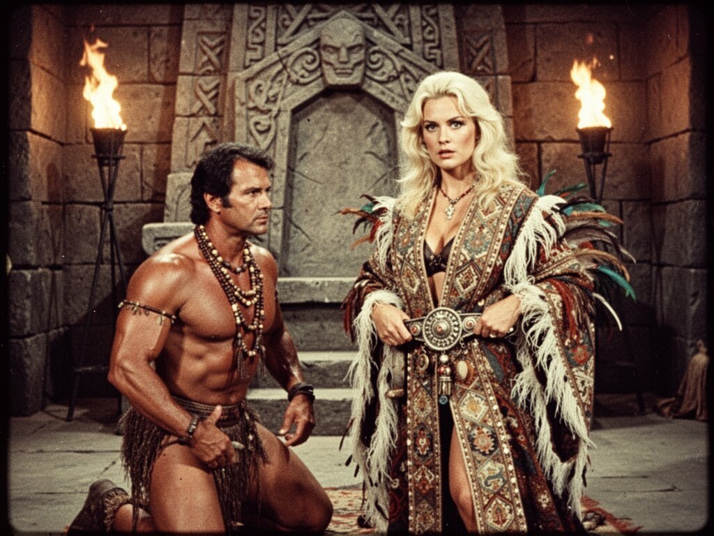 tribal setting; muscular man, 40 y.o, dark hair, tribal beads, kneeling; blonde woman, 25 y.o, strong build, ornate robe with feathers, holding ceremonial belt, intense expression, torch-lit stone throne room