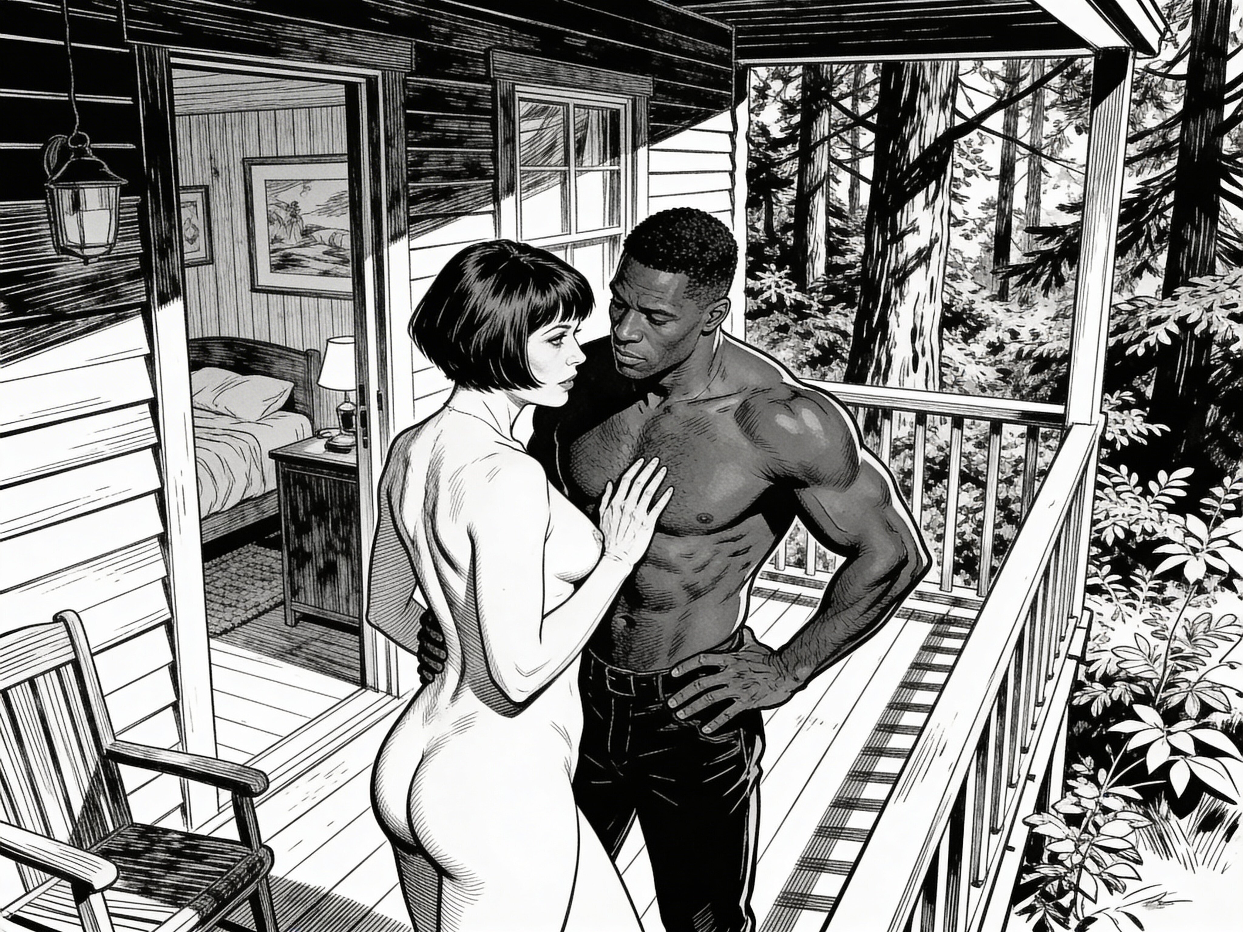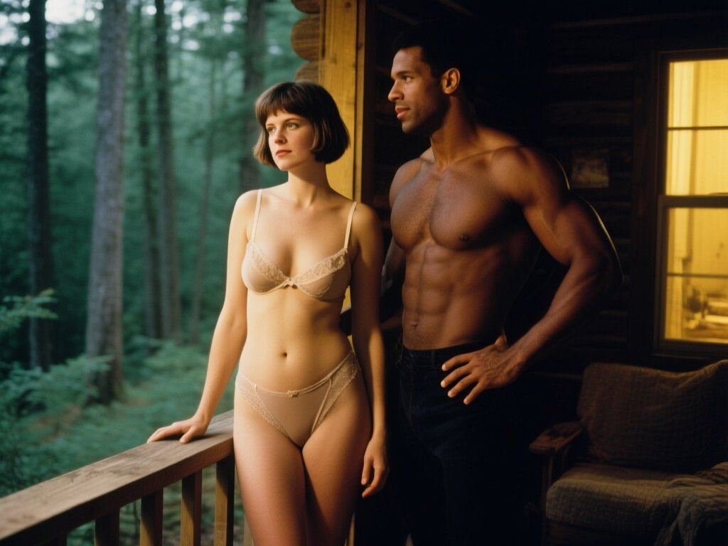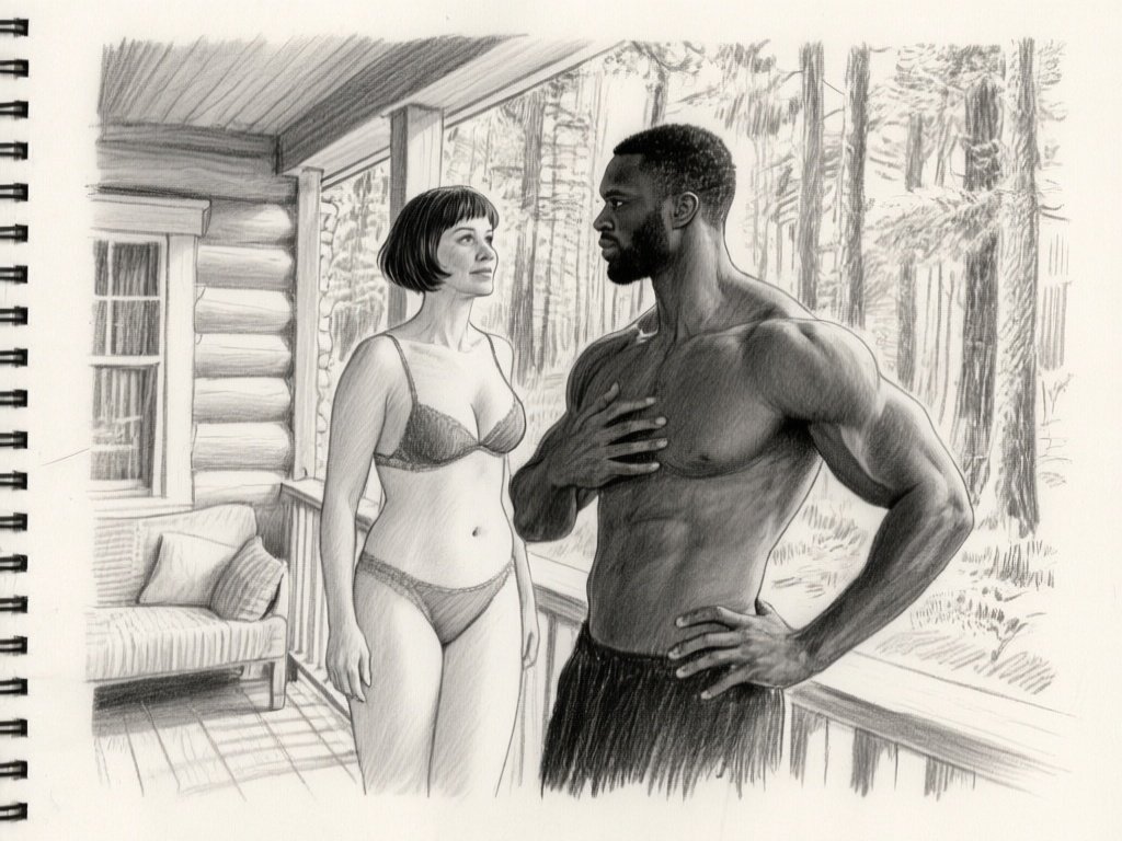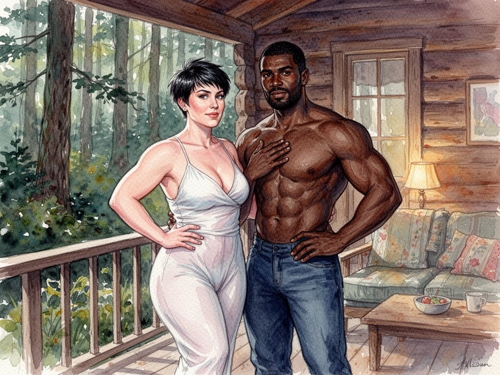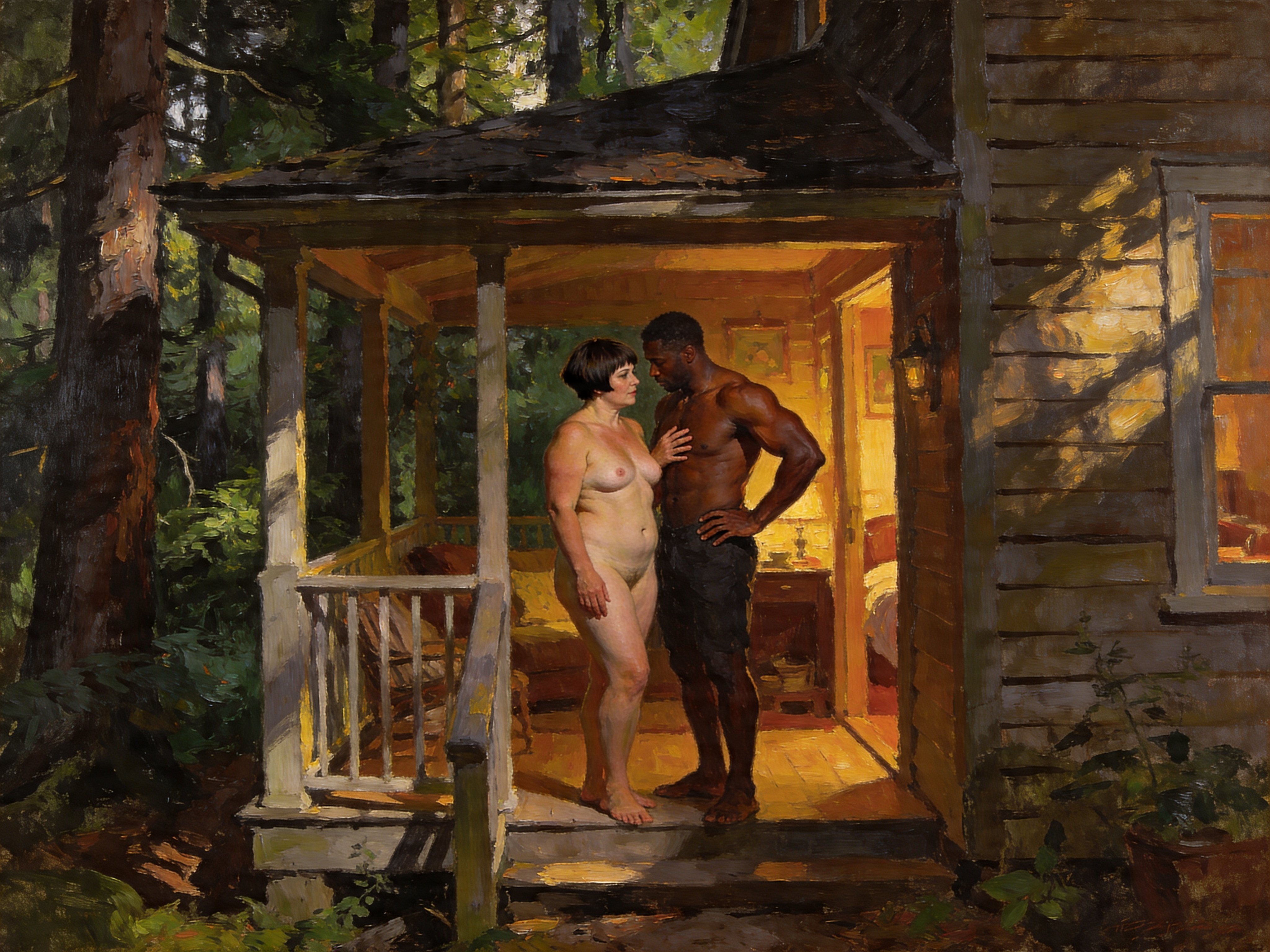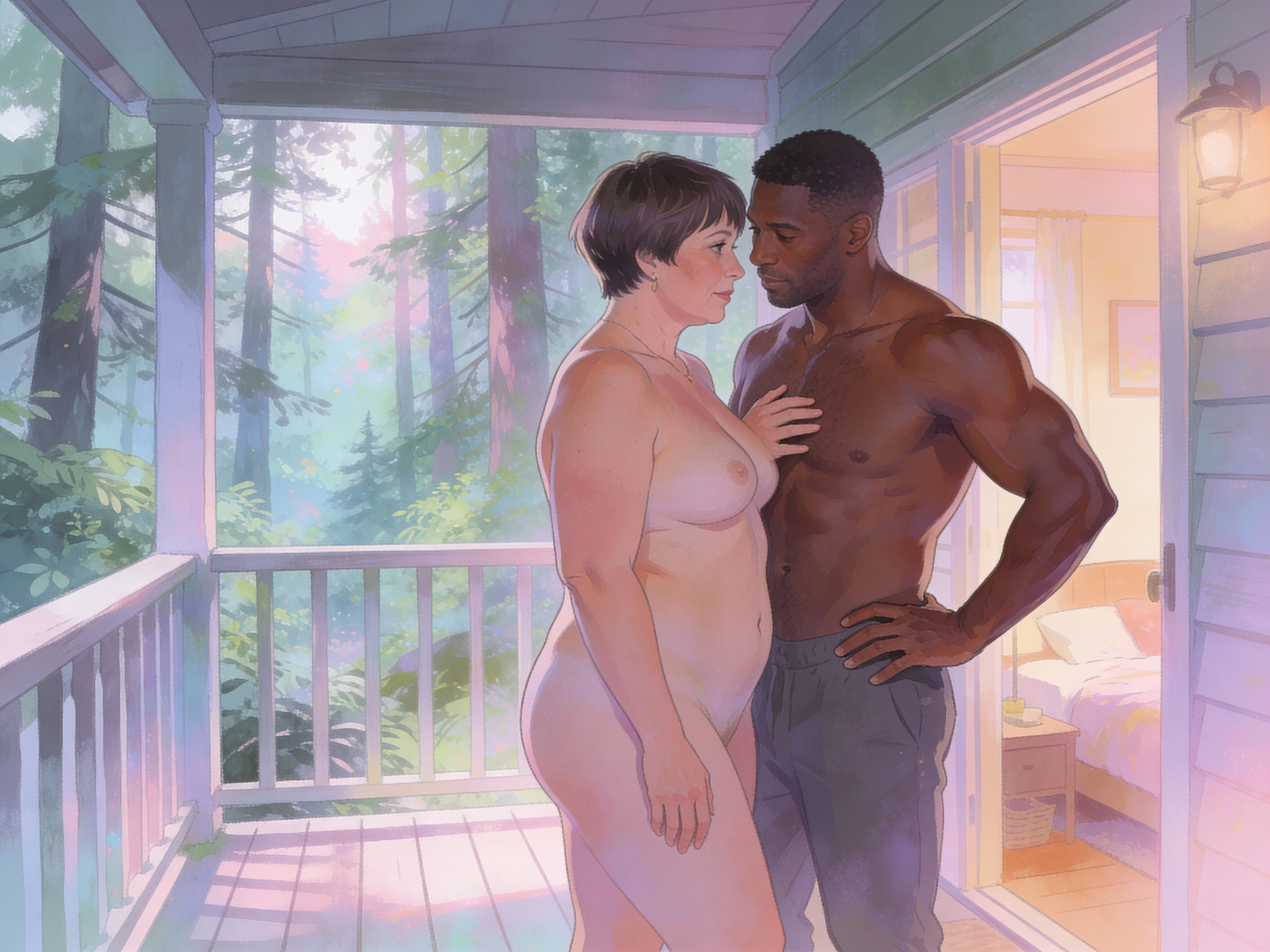 curvy woman, 45 y.o, pixie cut, partially undressed, standing on forest cabin porch; muscular dark-skinned man, 40 y.o, close to her; hand on hip and chest, cozy interior and lush forest outside