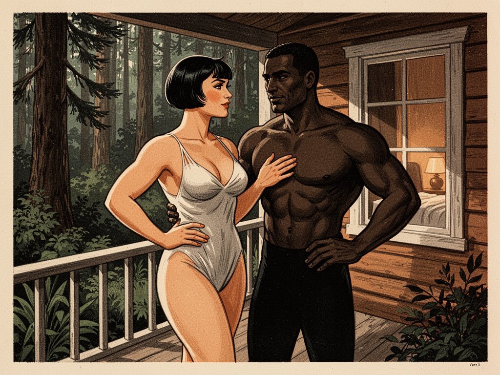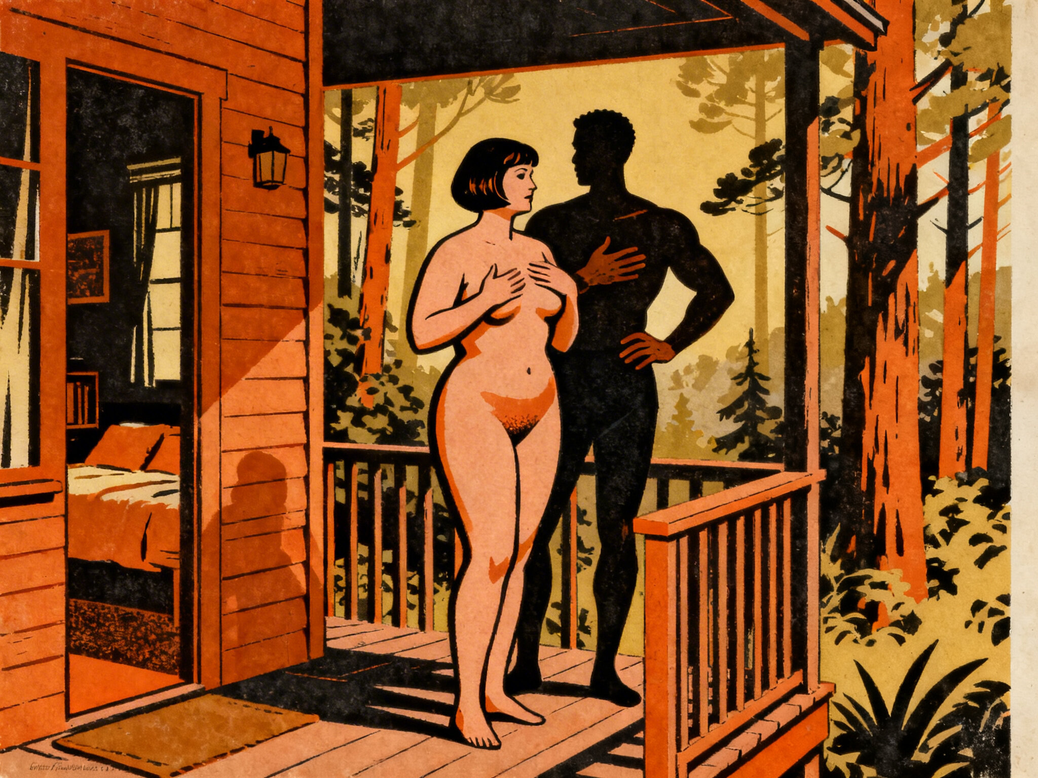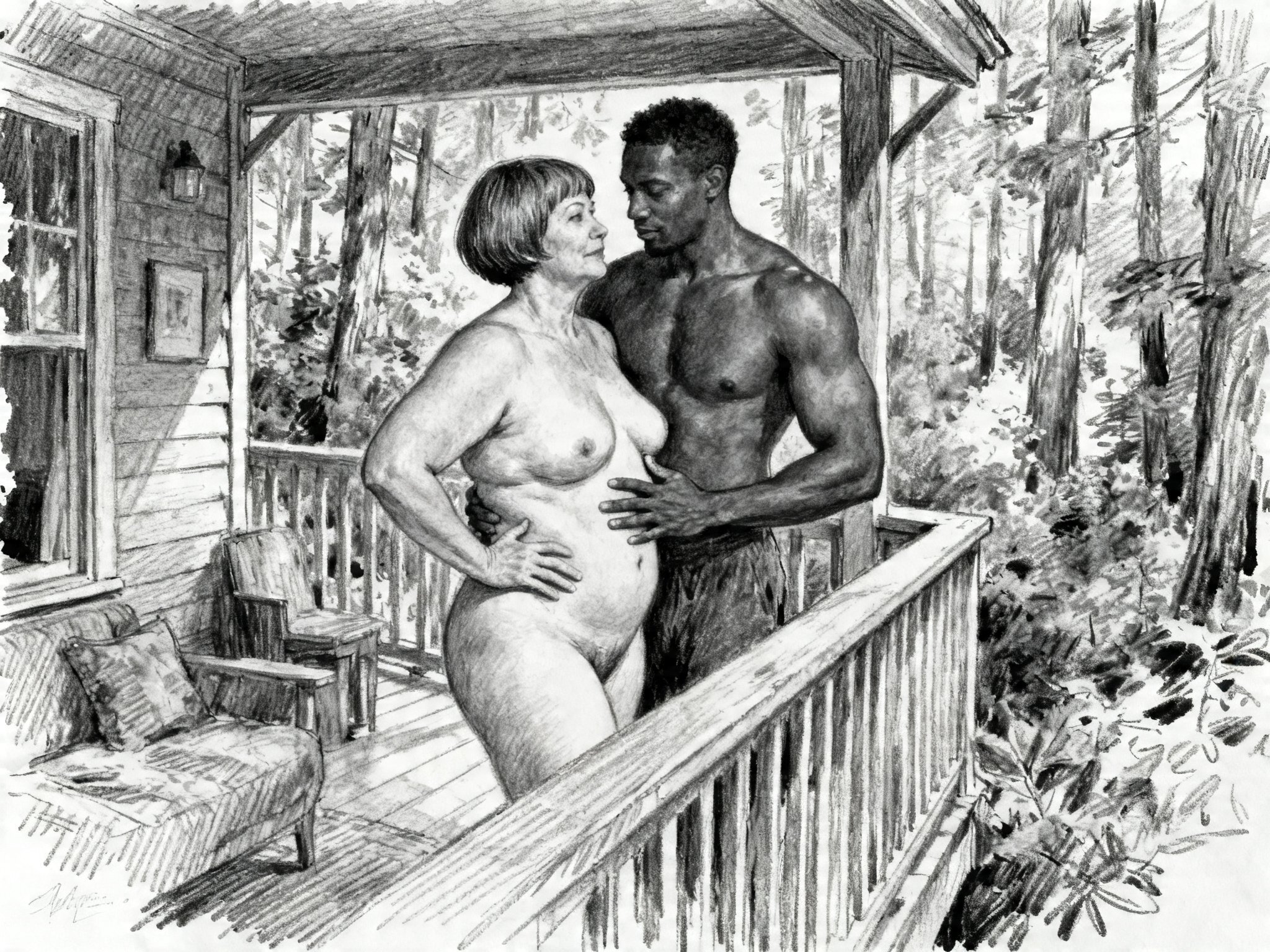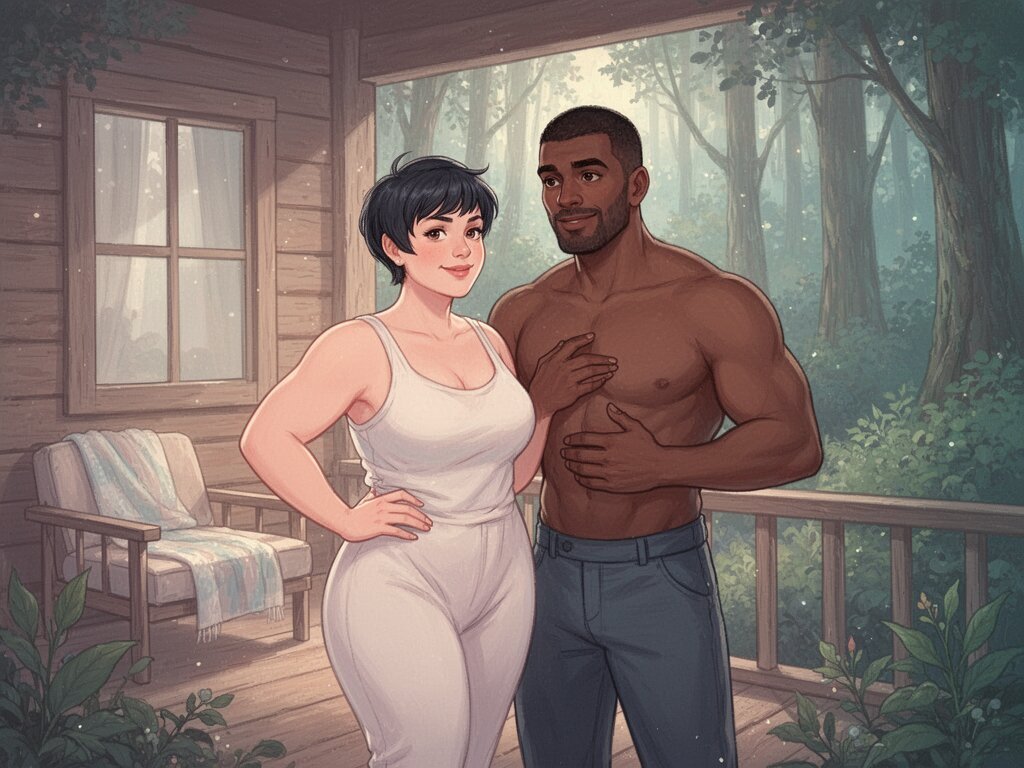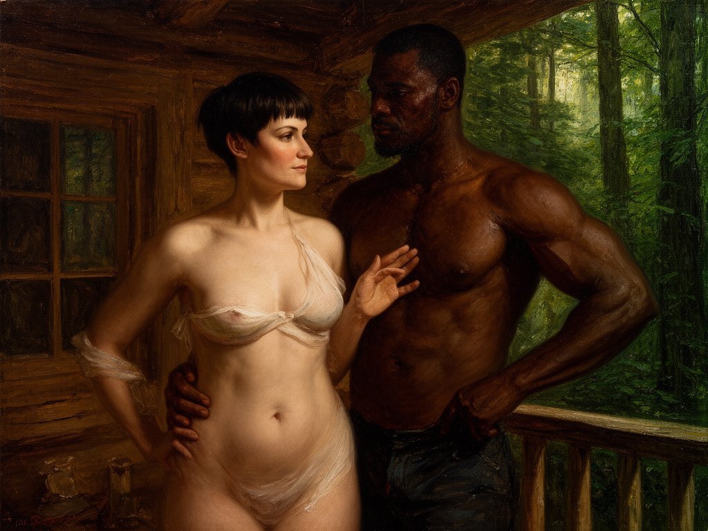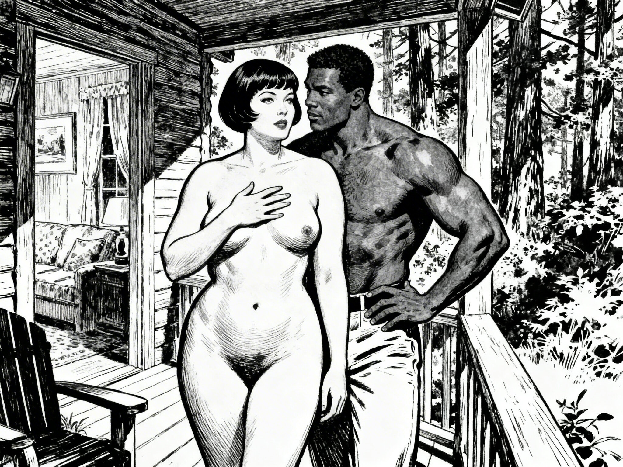 curvy woman, 45 y.o, pixie cut, partially undressed, standing on forest cabin porch; muscular dark-skinned man, 40 y.o, close to her; hand on hip and chest, cozy interior and lush forest outside