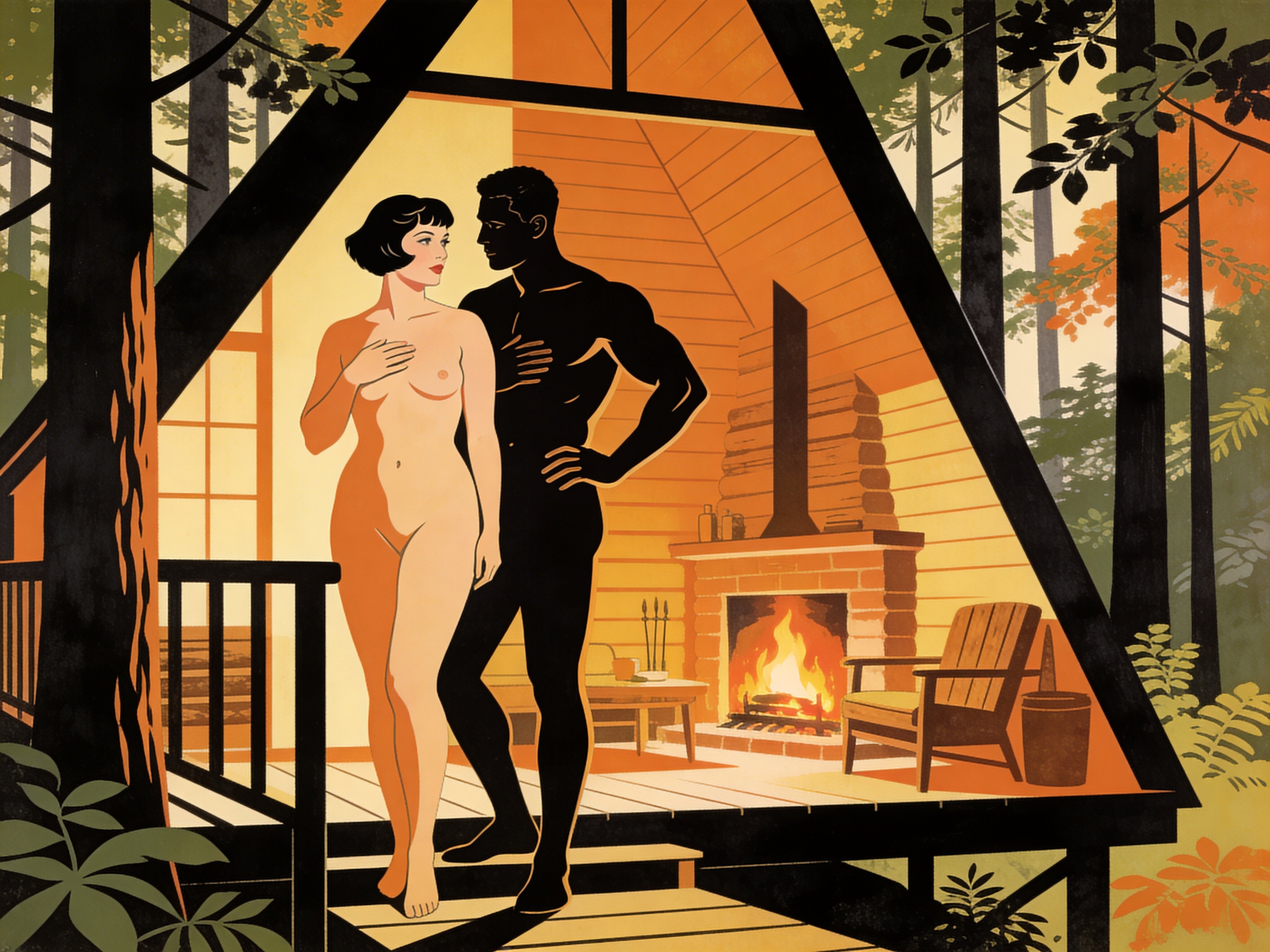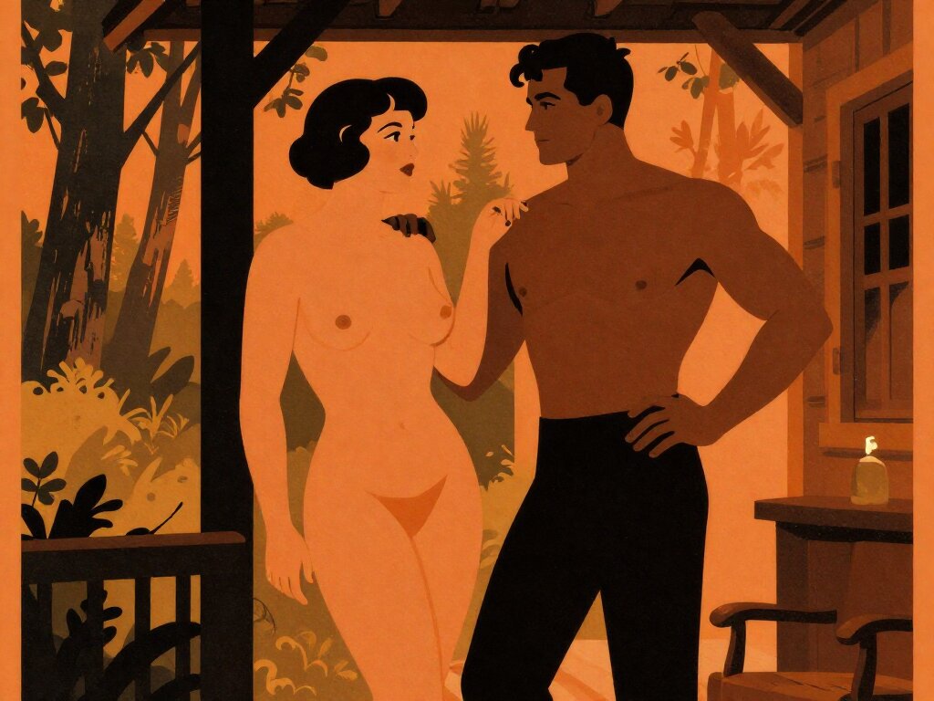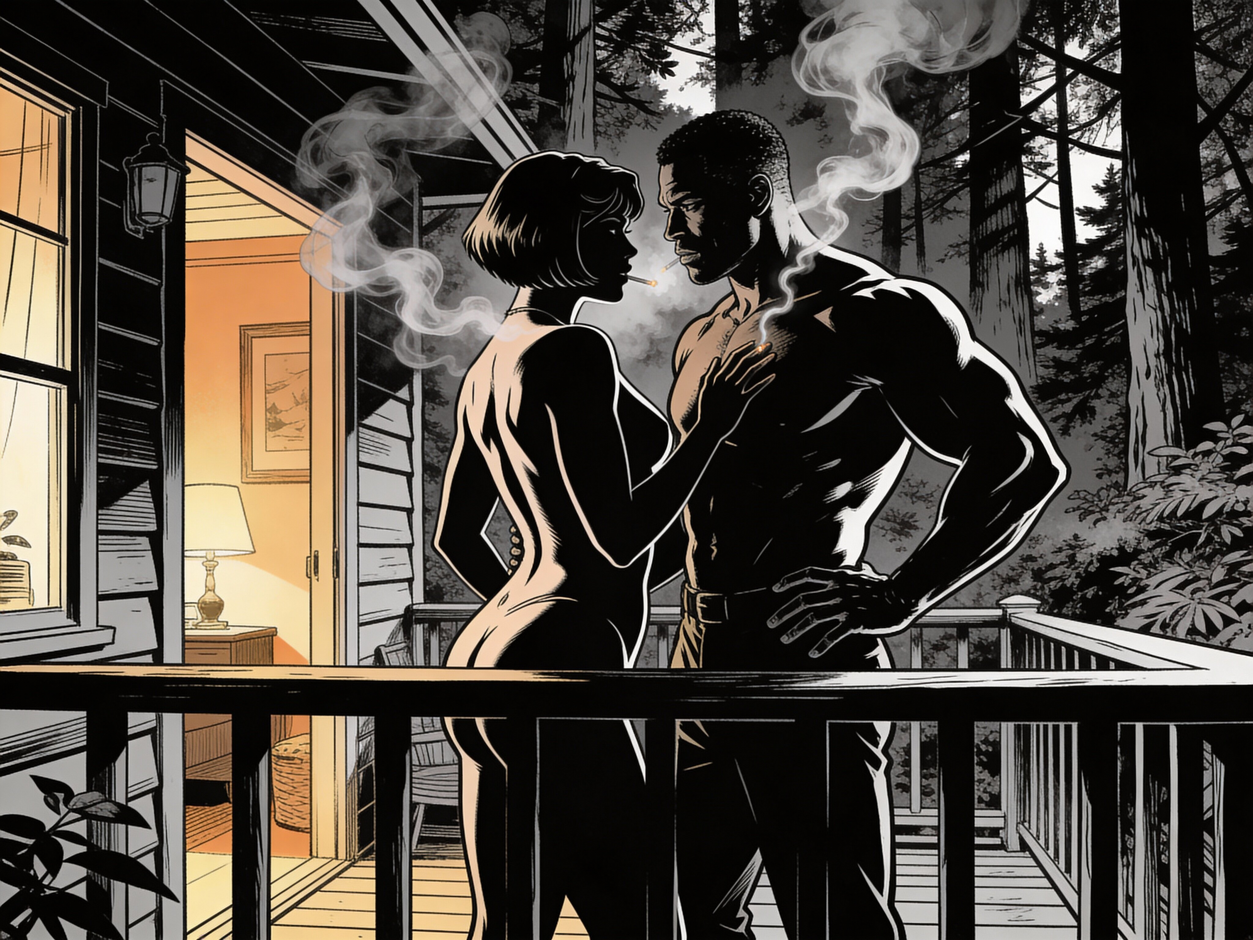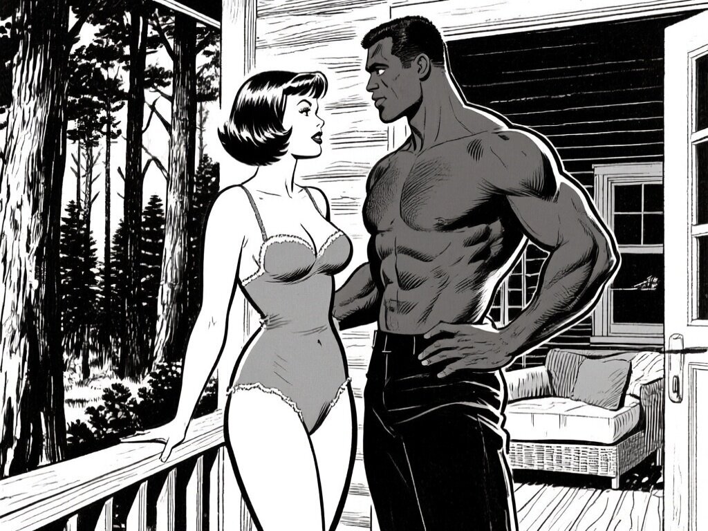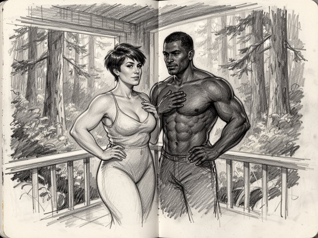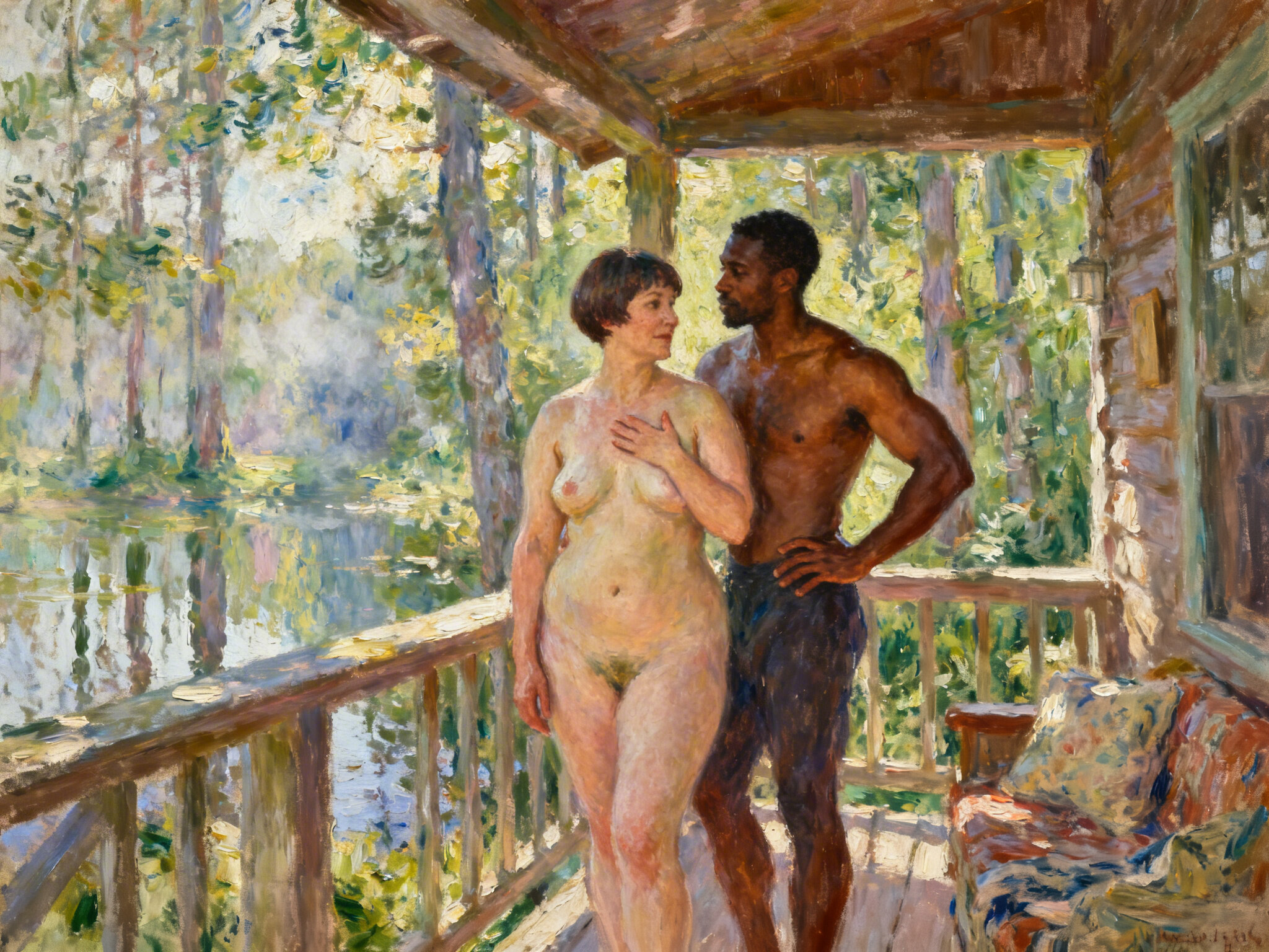 curvy woman, 45 y.o, pixie cut, partially undressed, standing on forest cabin porch; muscular dark-skinned man, 40 y.o, close to her; hand on hip and chest, cozy interior and lush forest outside
