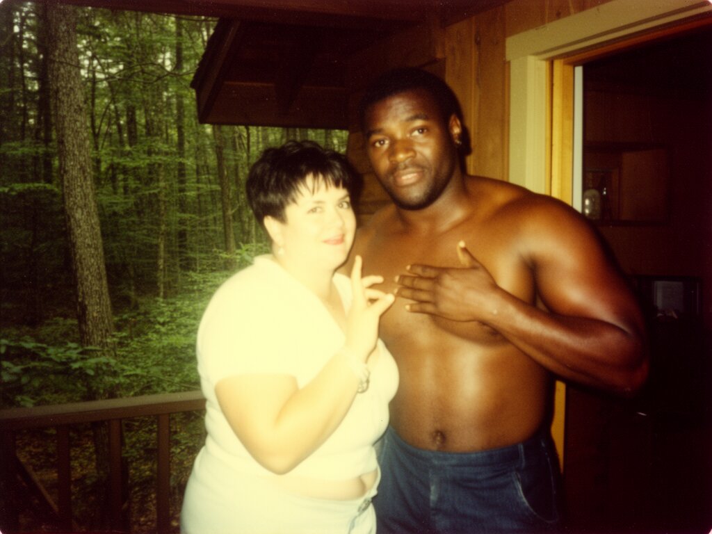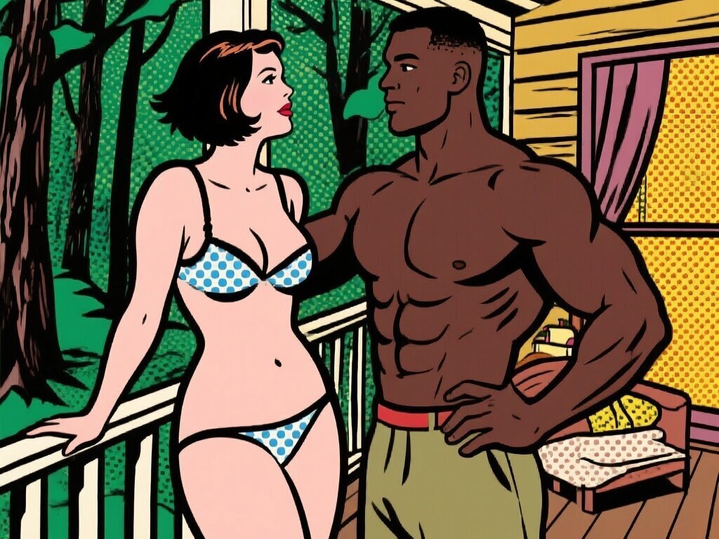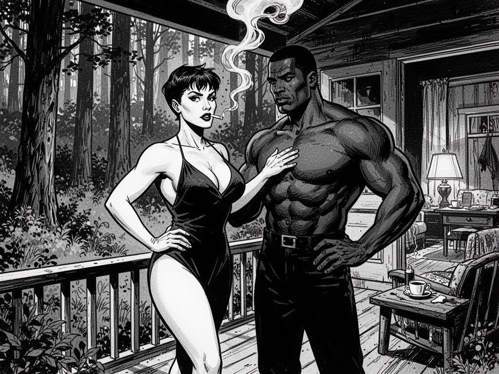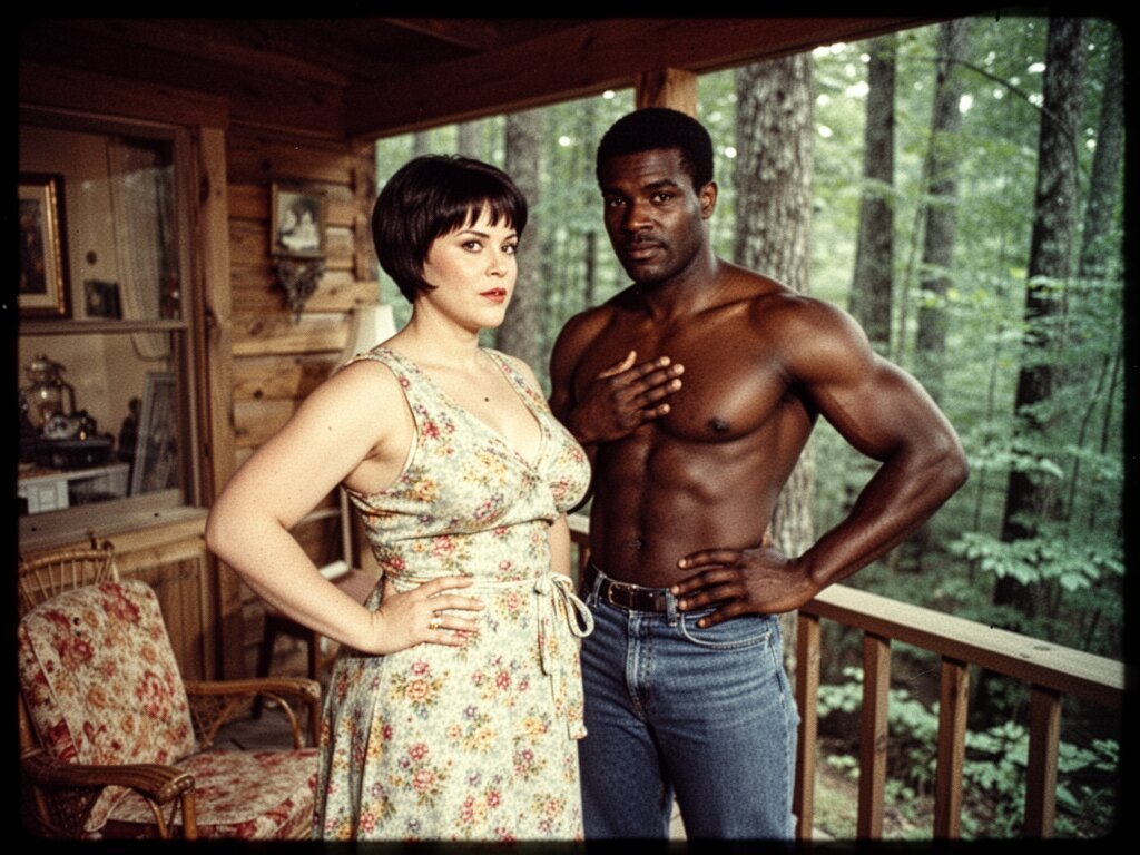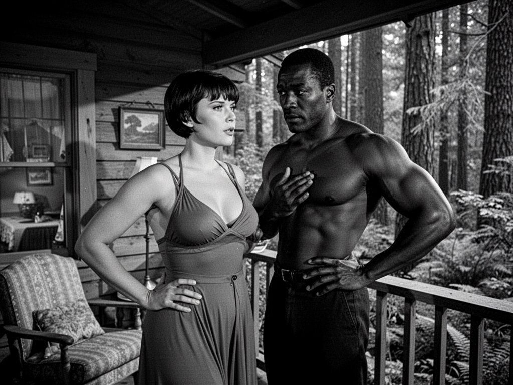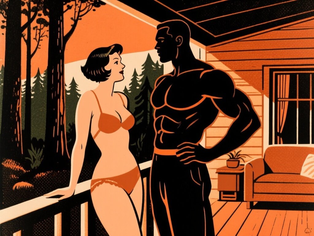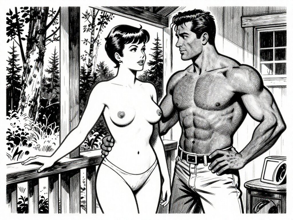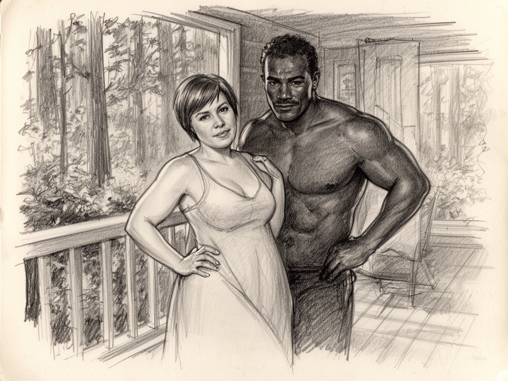 curvy woman, 45 y.o, pixie cut, partially undressed, standing on forest cabin porch; muscular dark-skinned man, 40 y.o, close to her; hand on hip and chest, cozy interior and lush forest outside