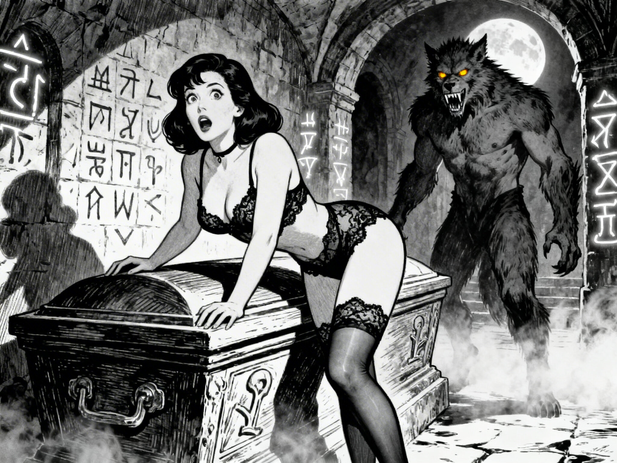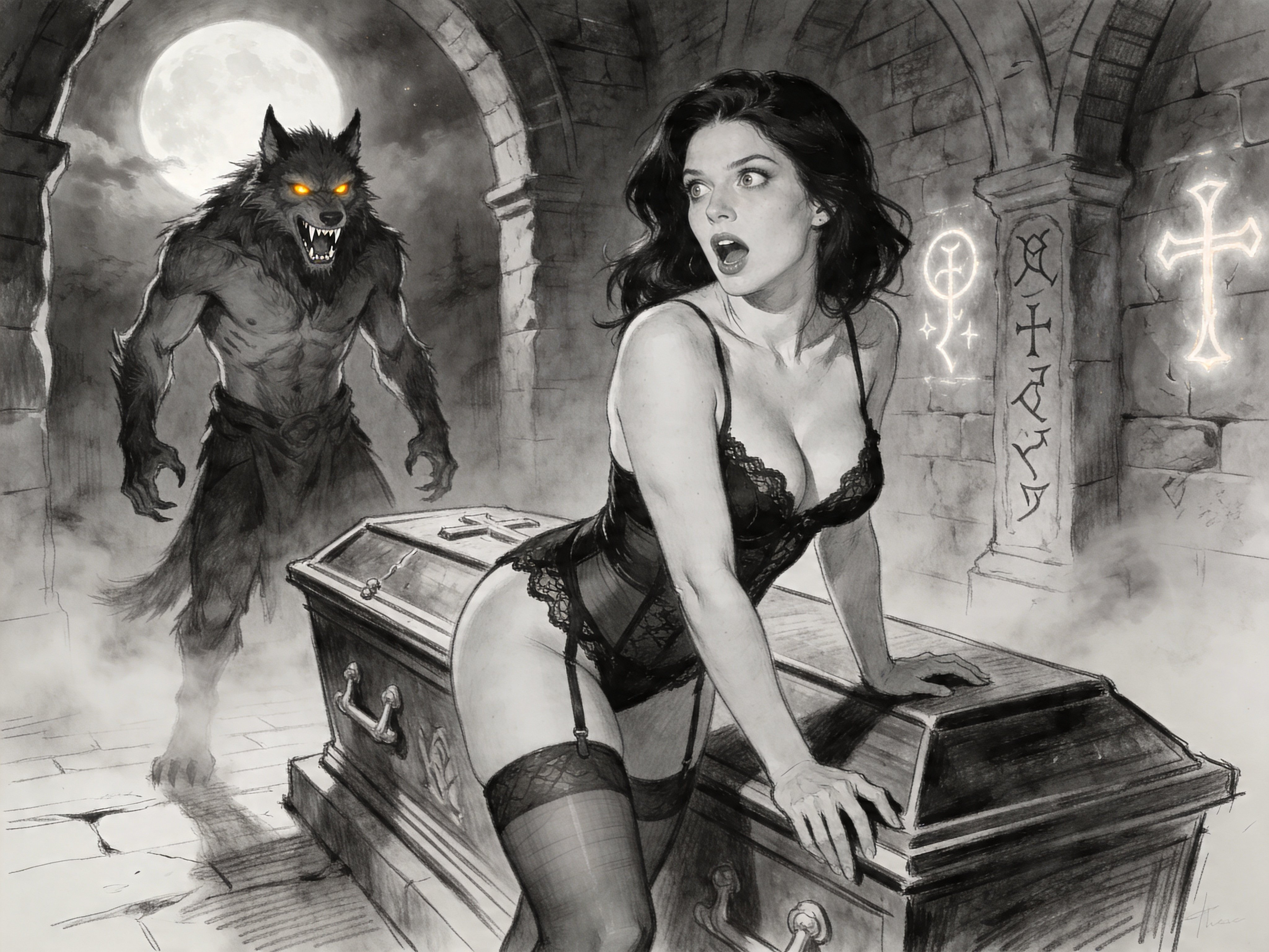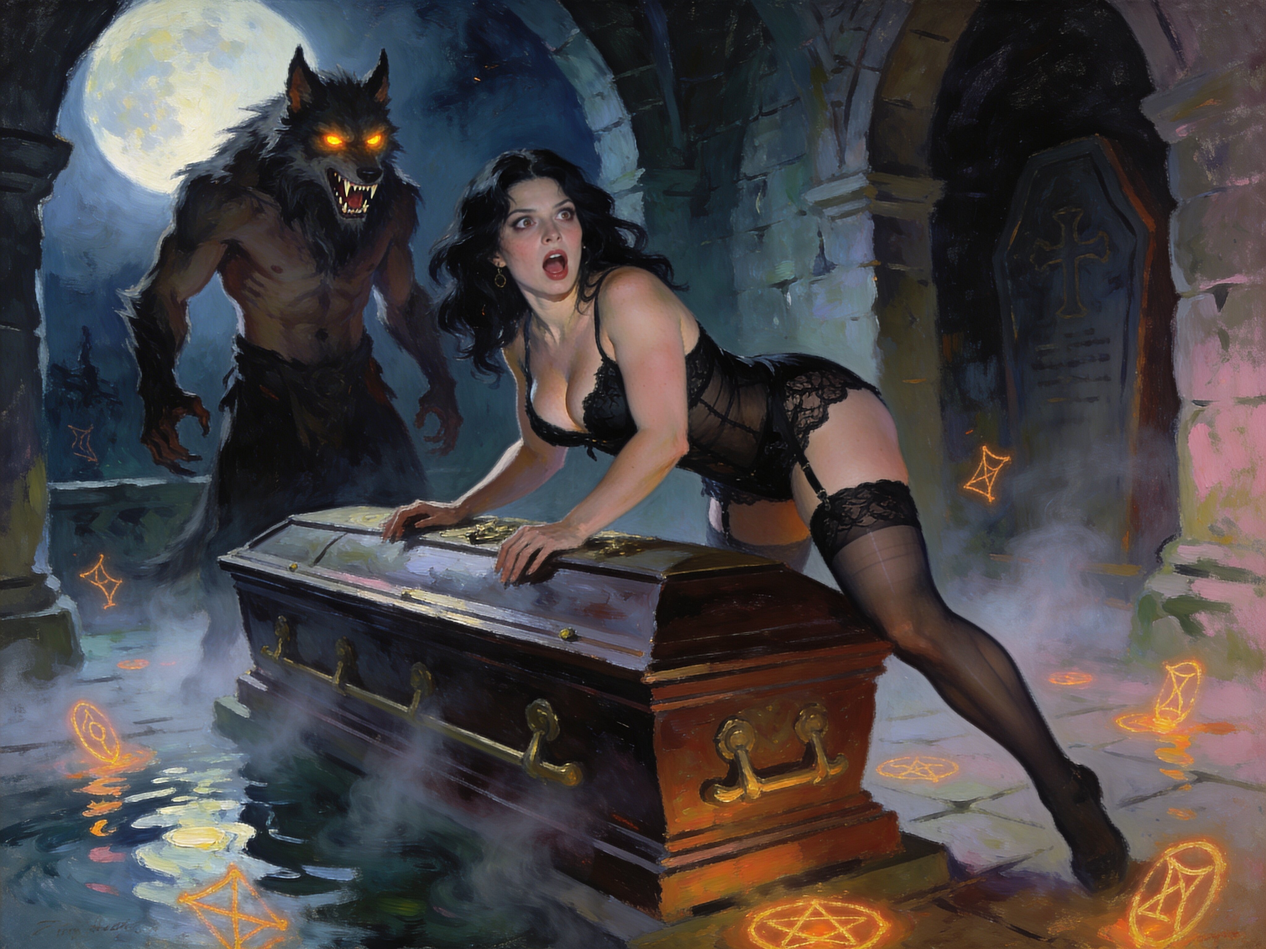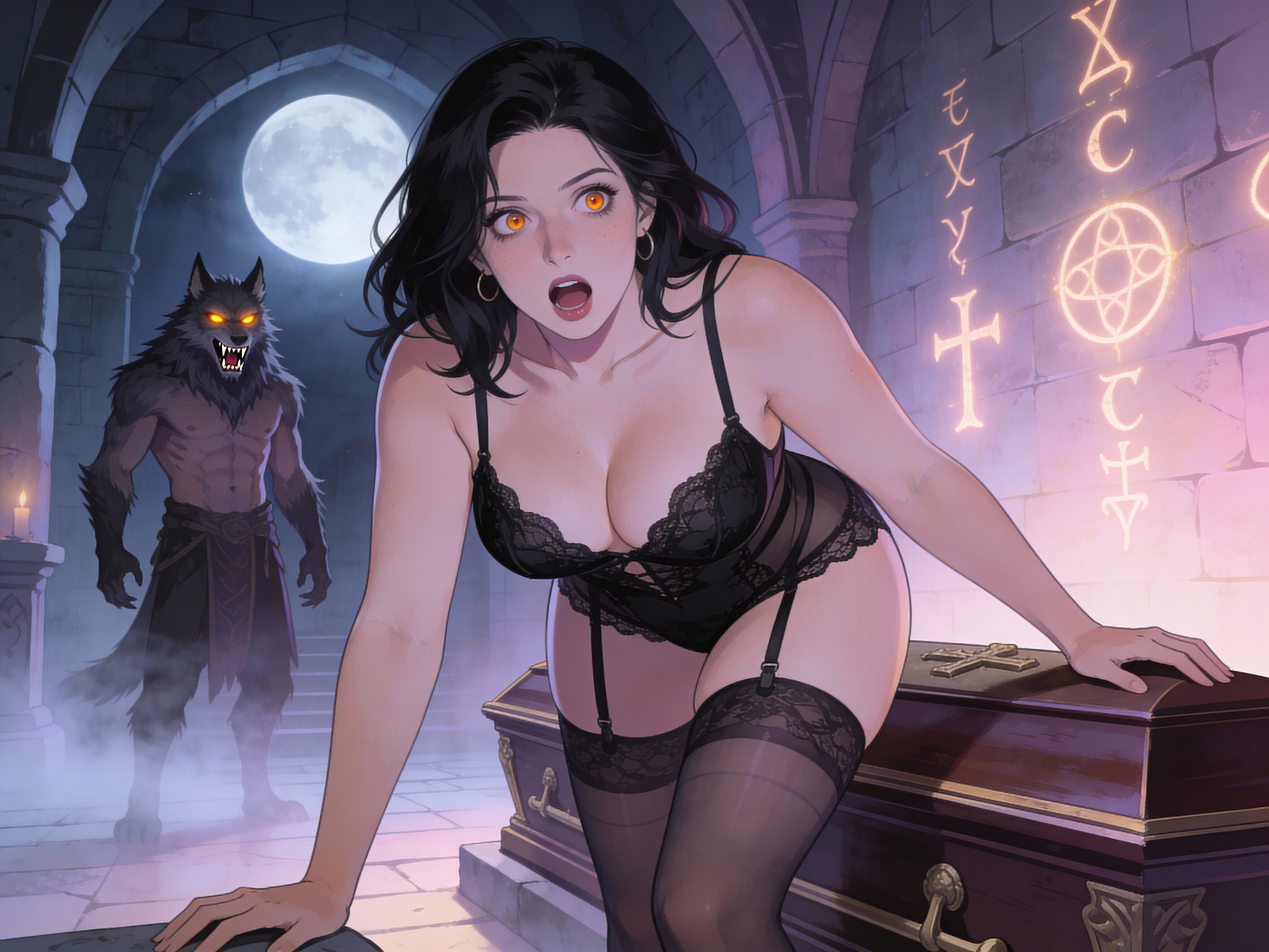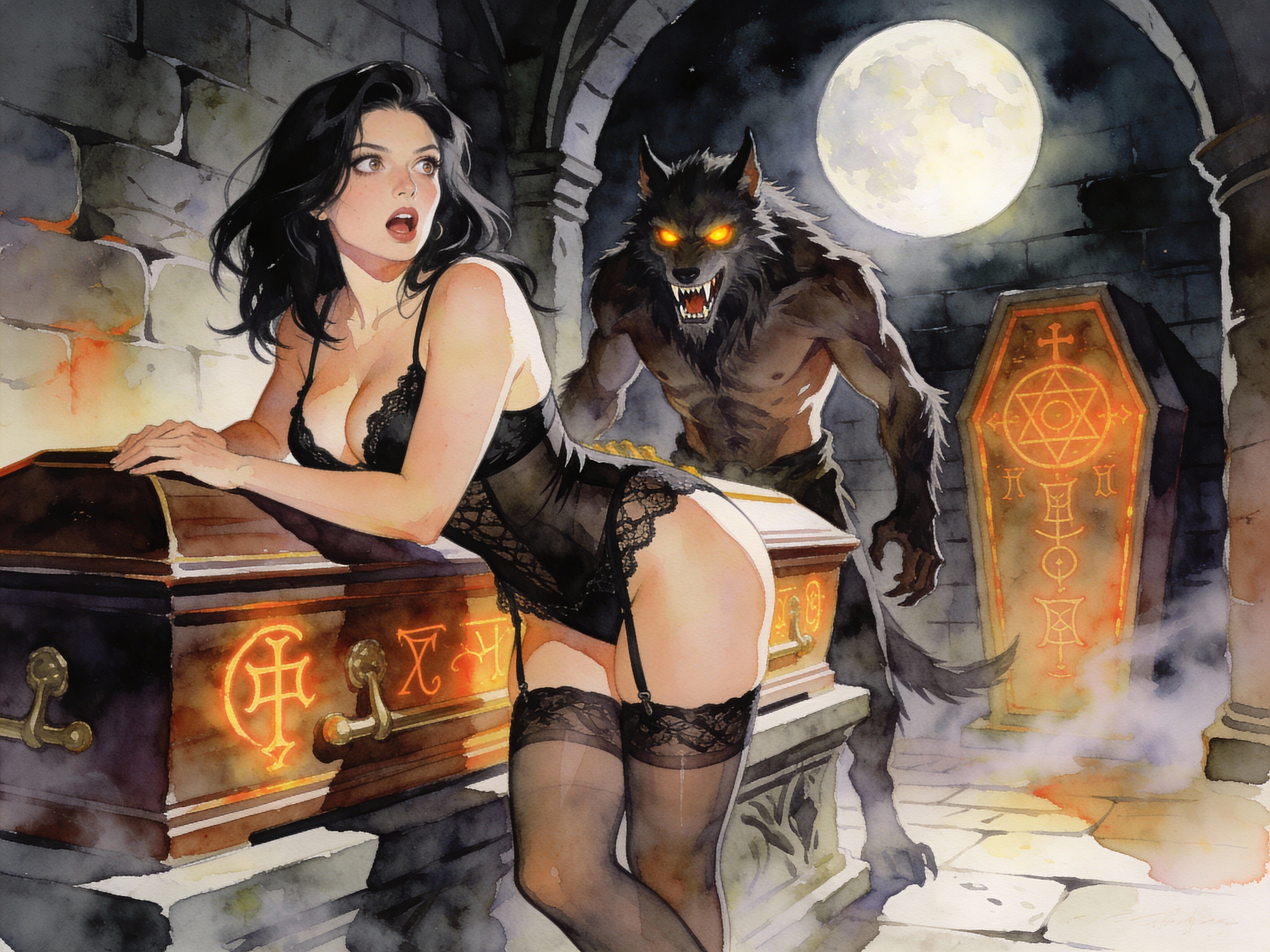 curvy pale woman, 30s, jet-black hair, black lace lingerie, sheer thigh-highs, surprised and aroused, leaning on sarcophagus in moonlit crypt; shirtless werewolf man with fangs and glowing amber eyes behind her, glowing runes, misty floor