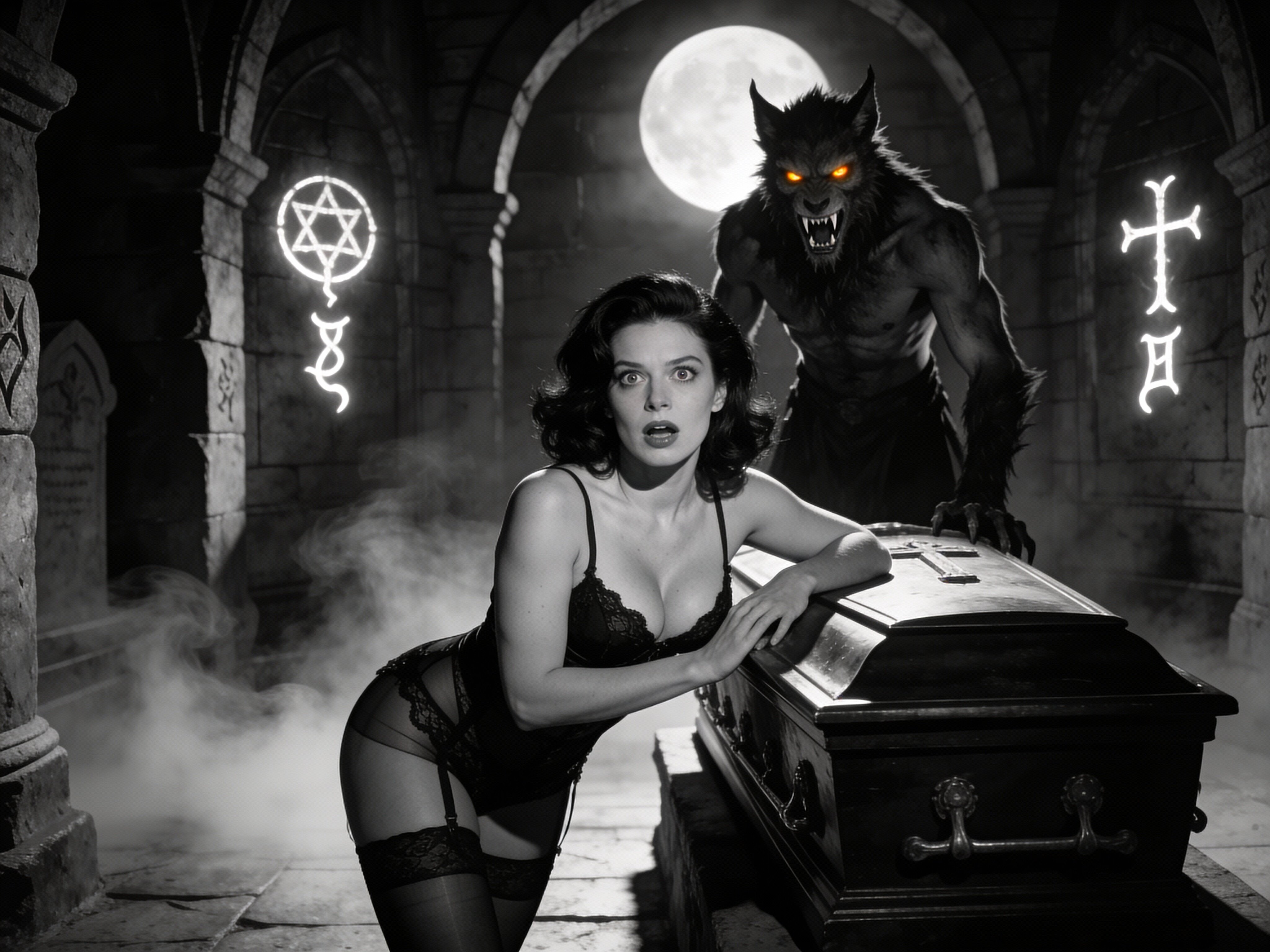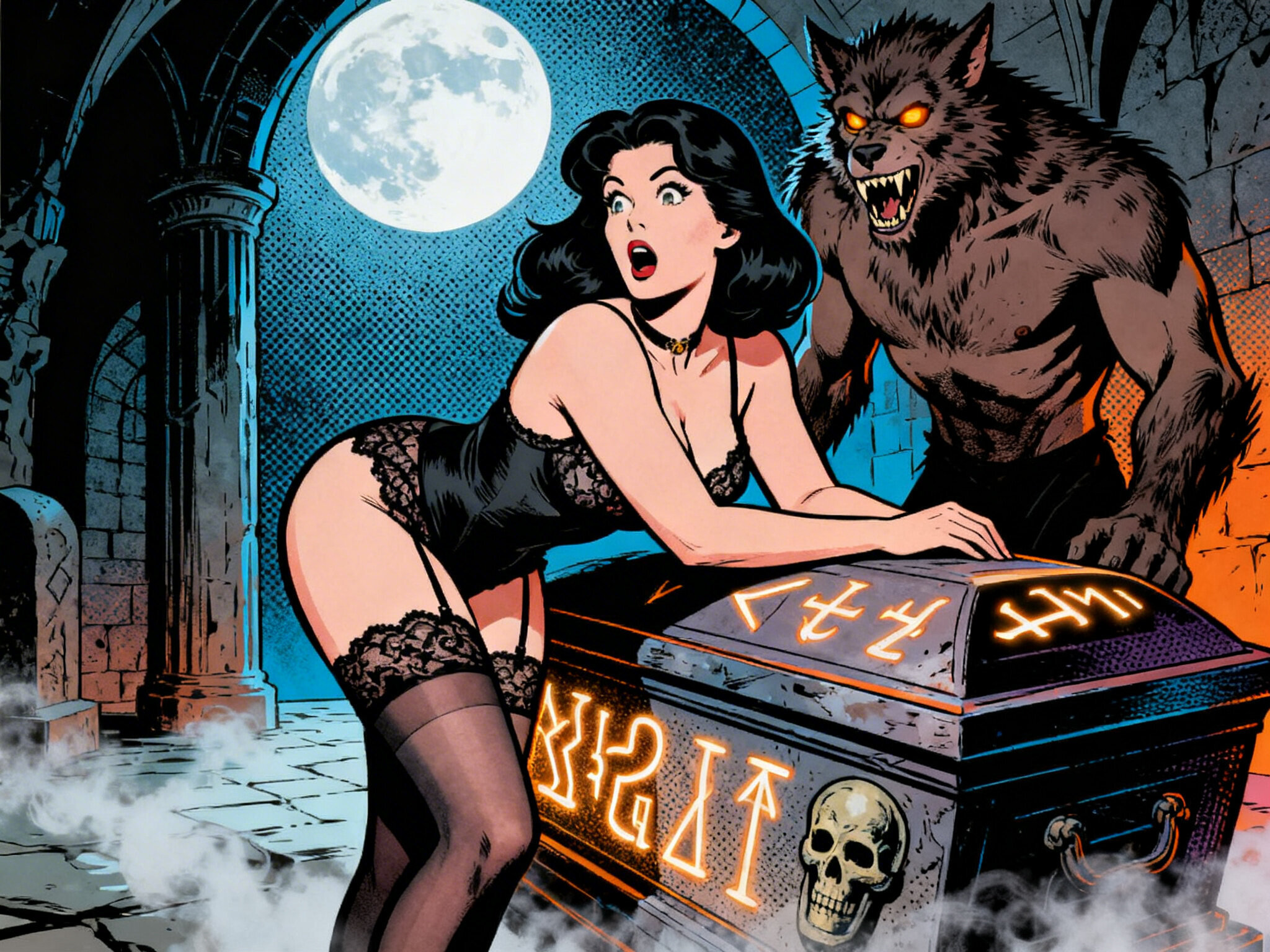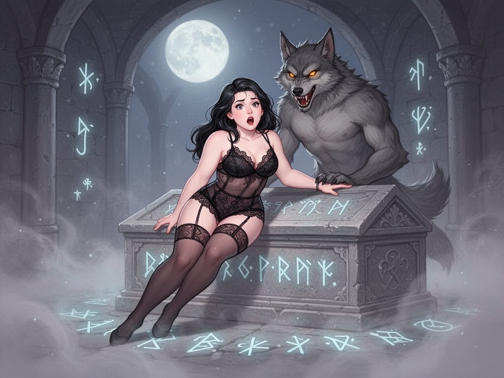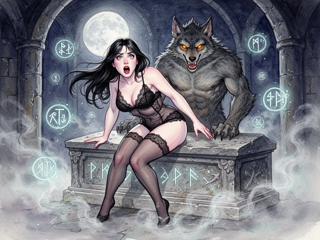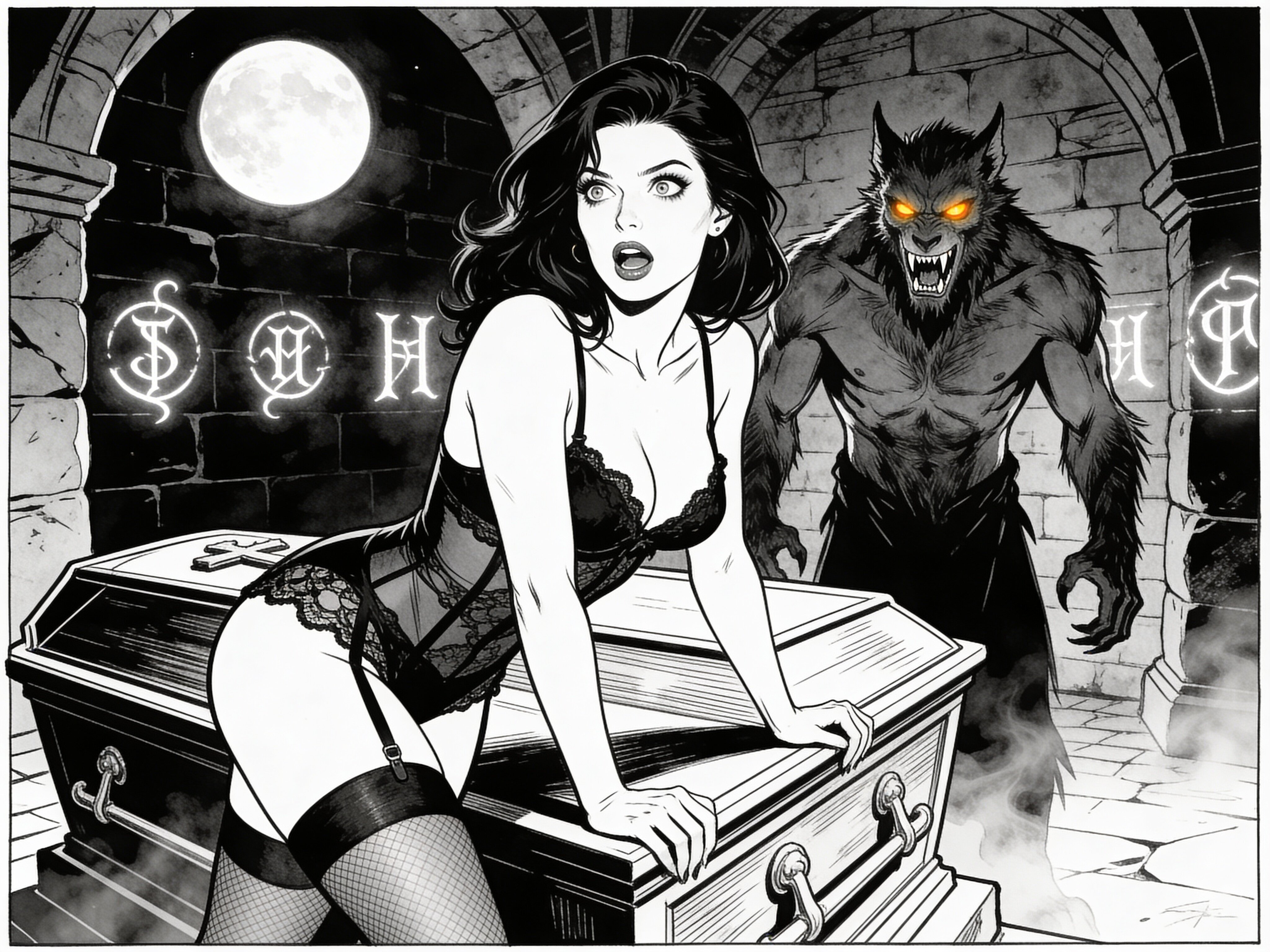 curvy pale woman, 30s, jet-black hair, black lace lingerie, sheer thigh-highs, surprised and aroused, leaning on sarcophagus in moonlit crypt; shirtless werewolf man with fangs and glowing amber eyes behind her, glowing runes, misty floor