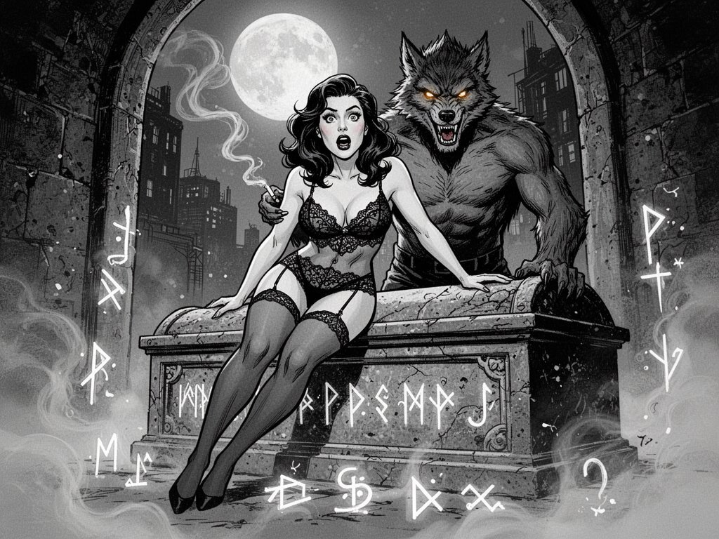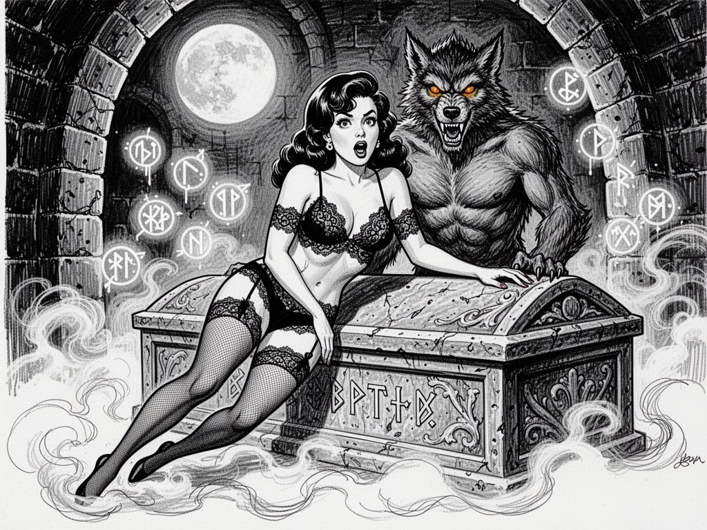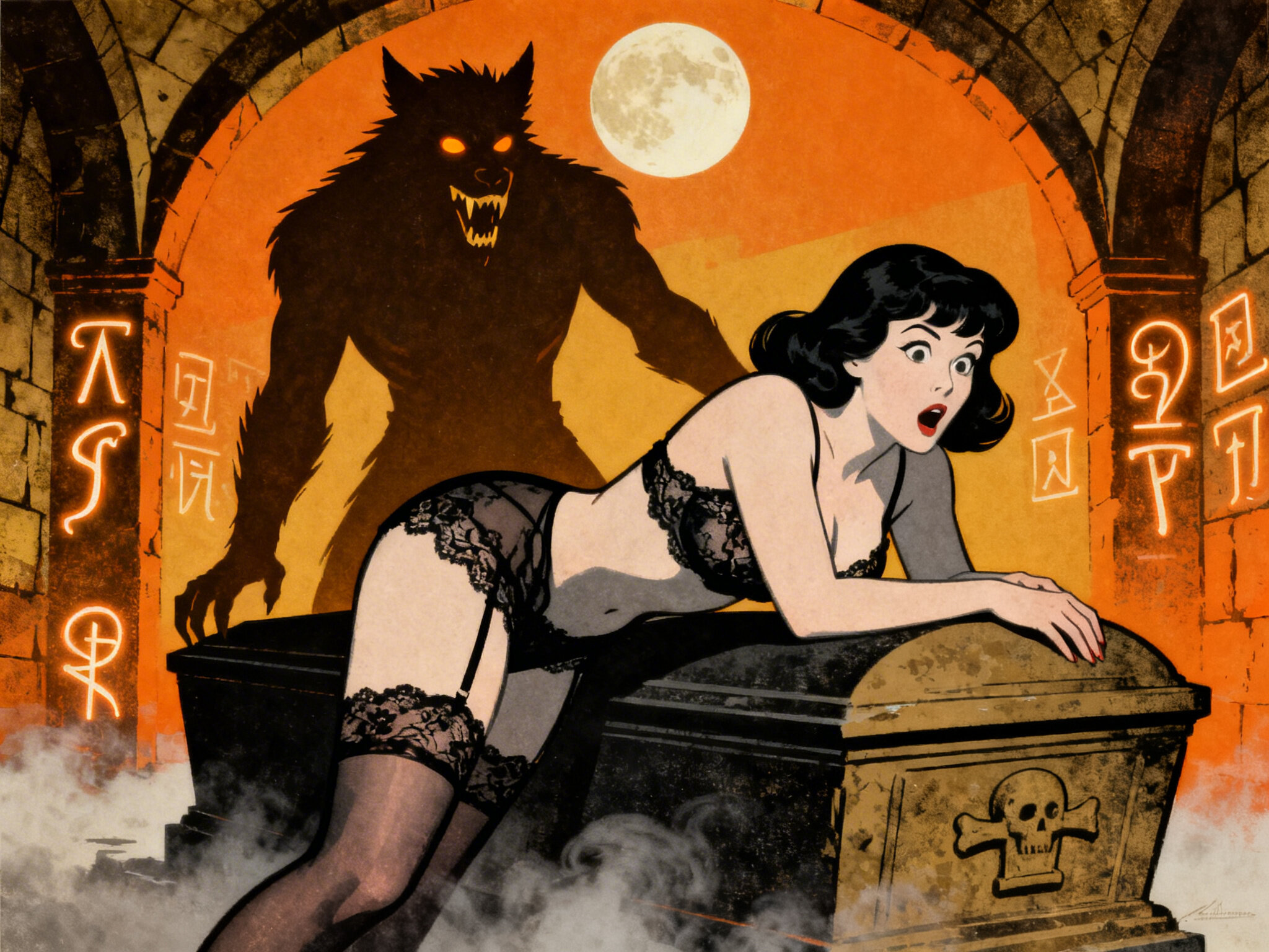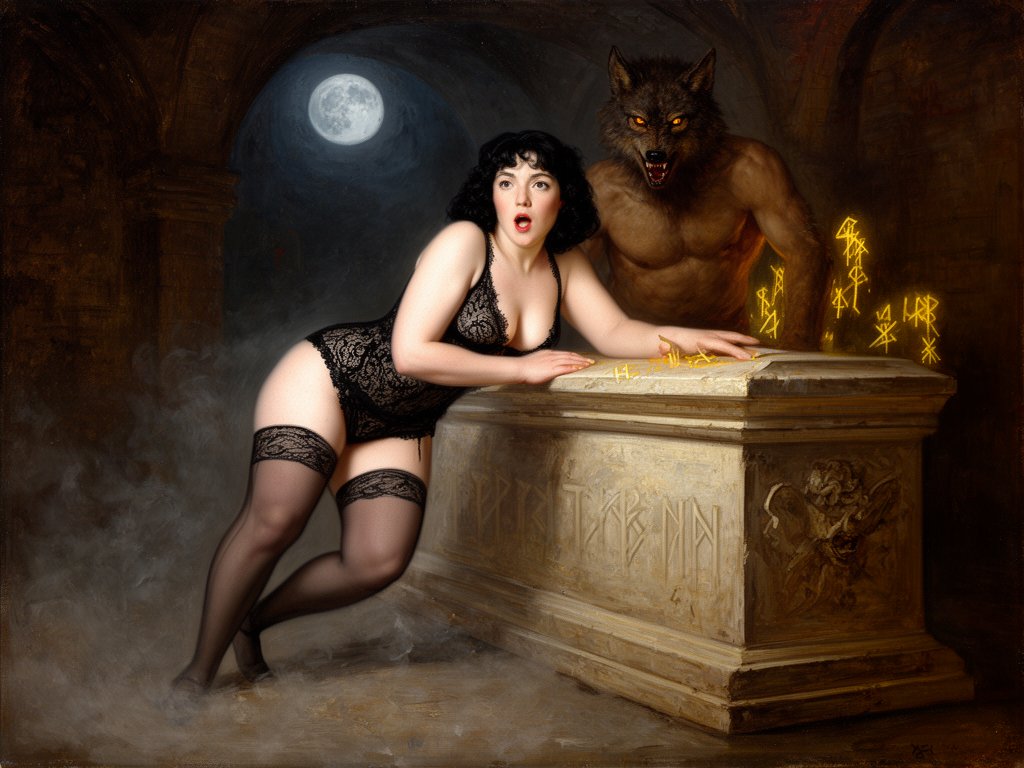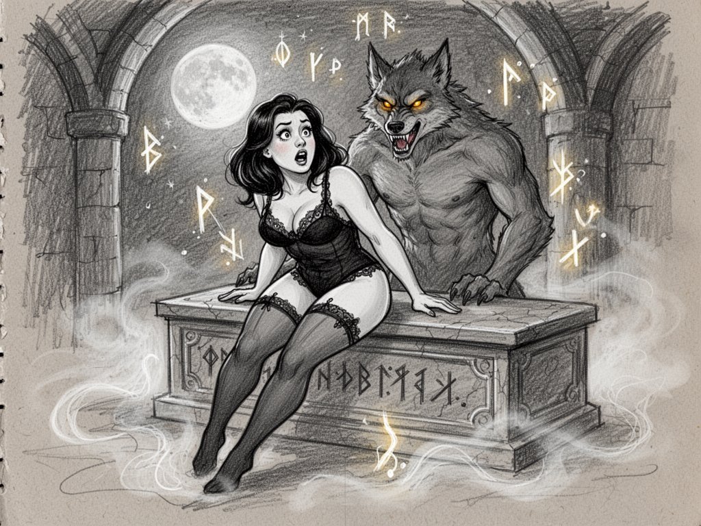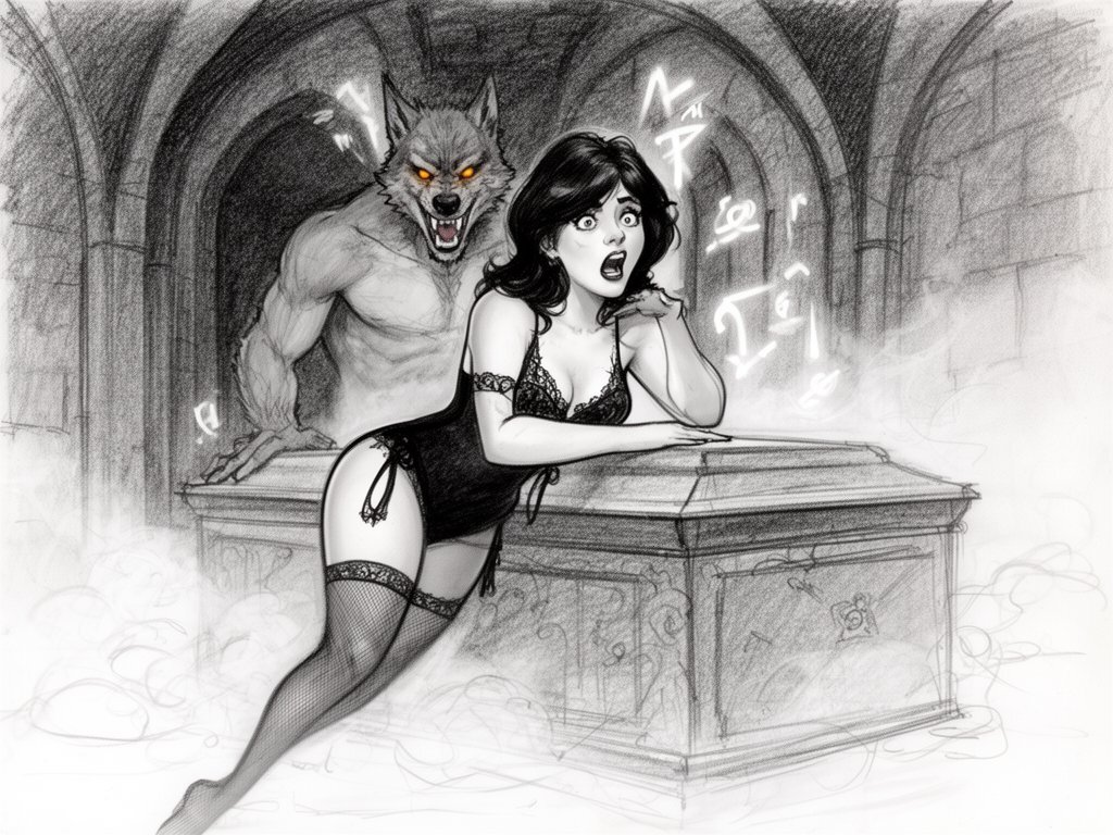 curvy pale woman, 30s, jet-black hair, black lace lingerie, sheer thigh-highs, surprised and aroused, leaning on sarcophagus in moonlit crypt; shirtless werewolf man with fangs and glowing amber eyes behind her, glowing runes, misty floor