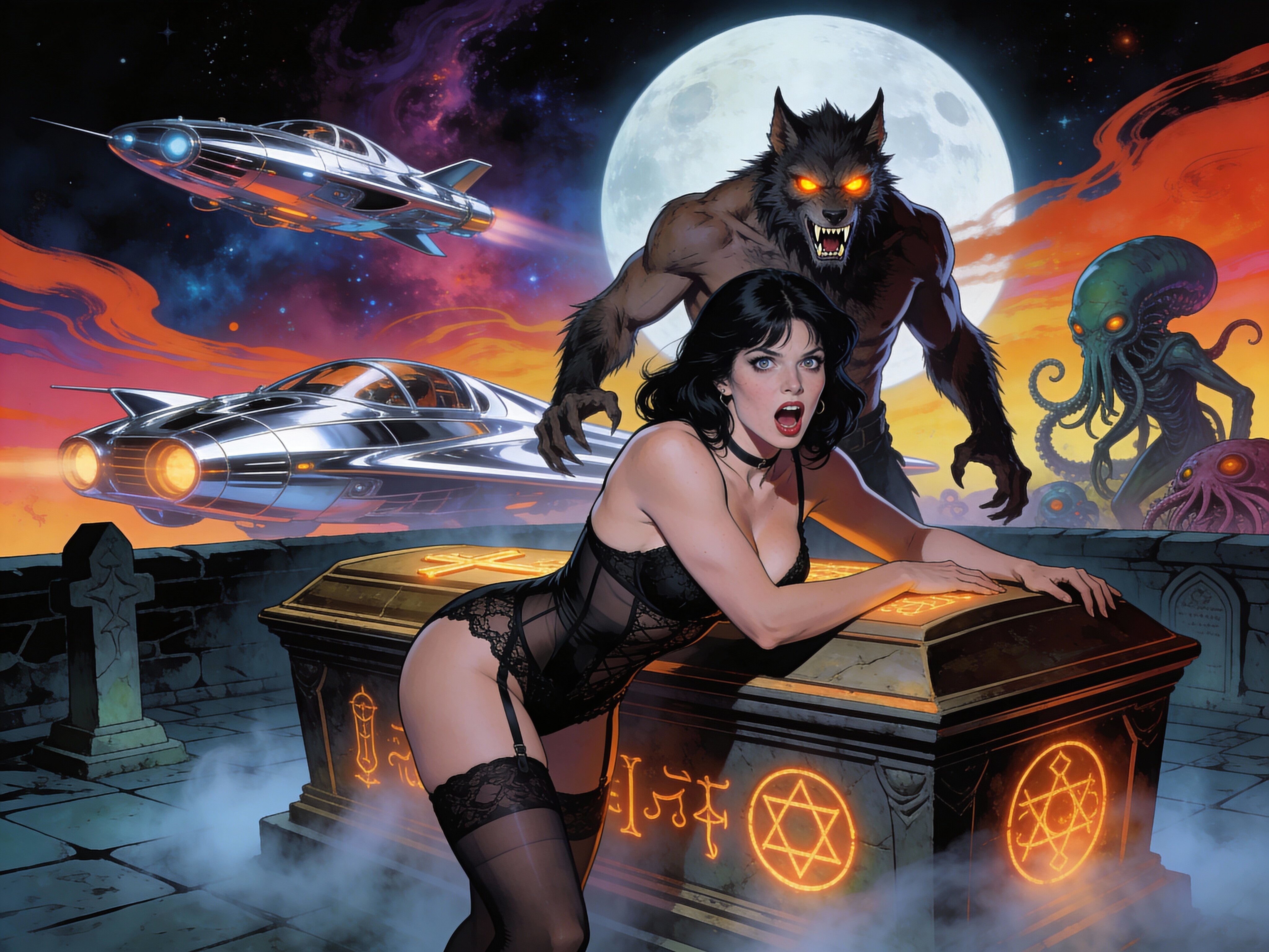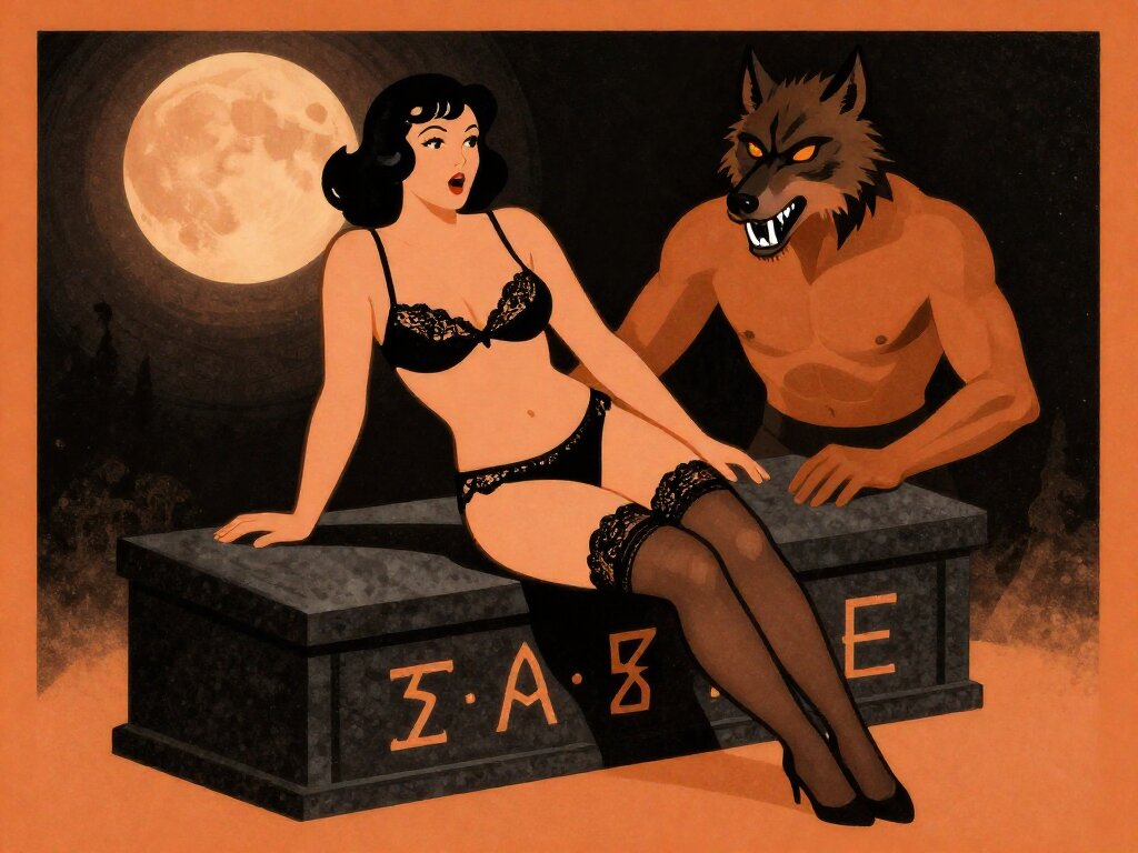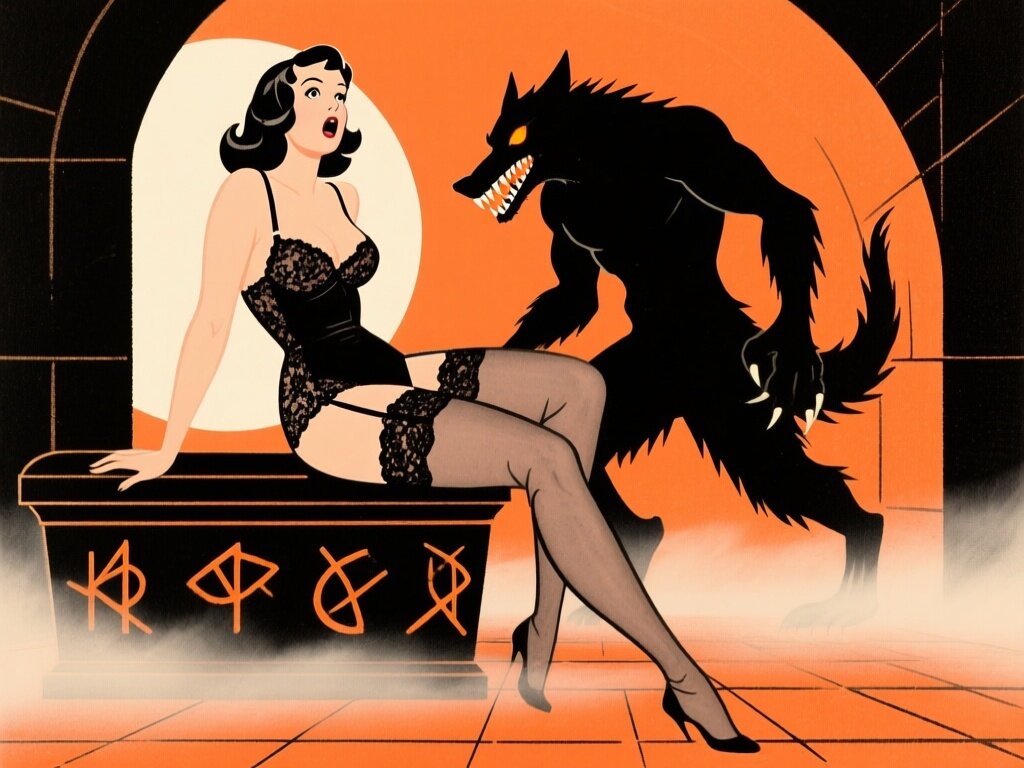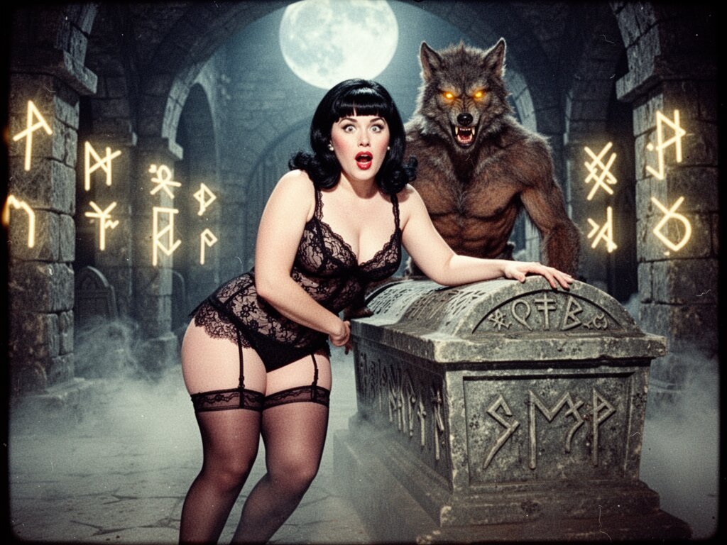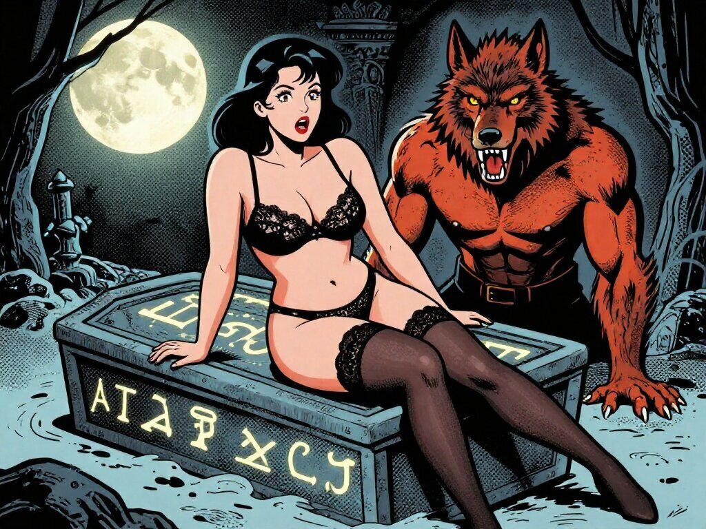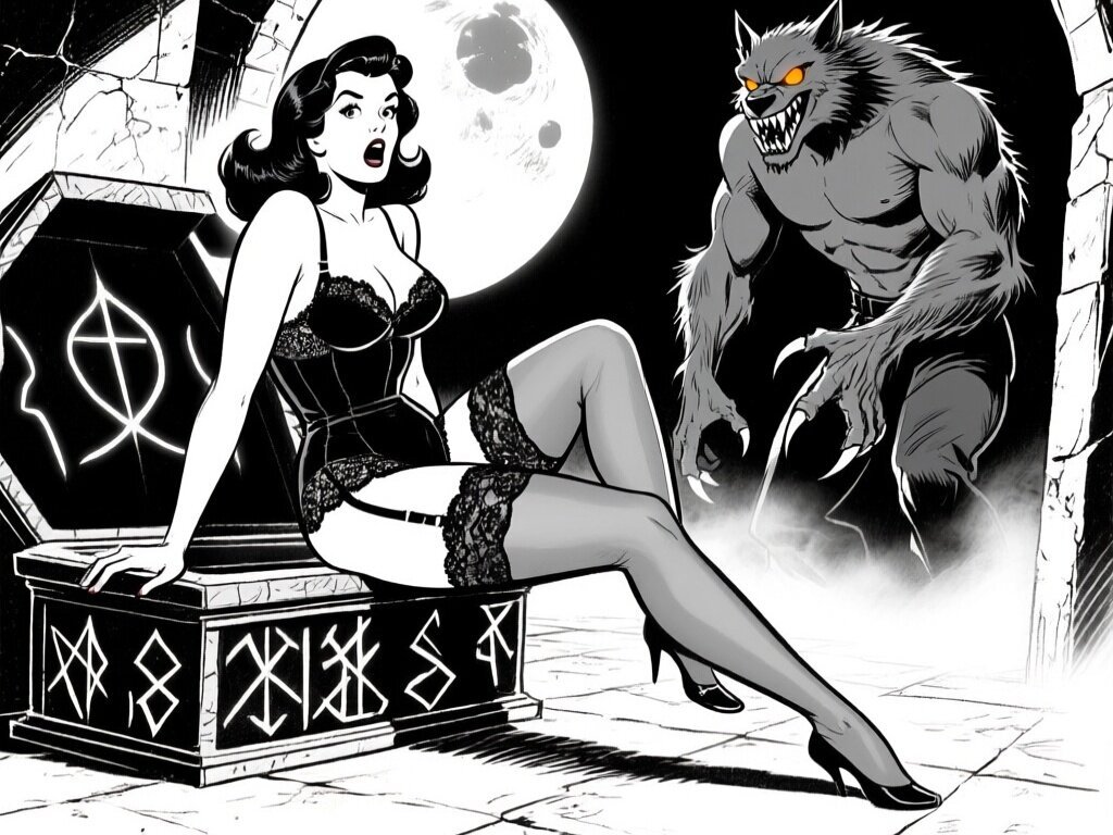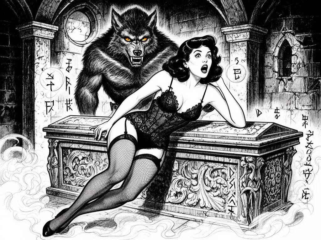 curvy pale woman, 30s, jet-black hair, black lace lingerie, sheer thigh-highs, surprised and aroused, leaning on sarcophagus in moonlit crypt; shirtless werewolf man with fangs and glowing amber eyes behind her, glowing runes, misty floor
