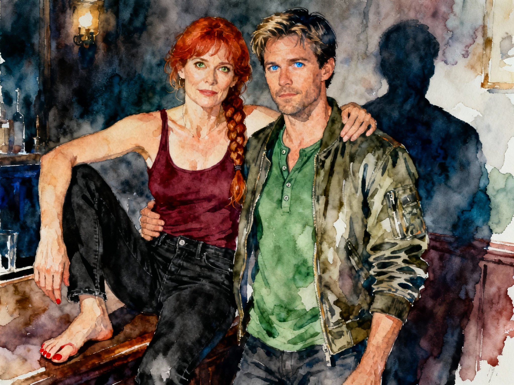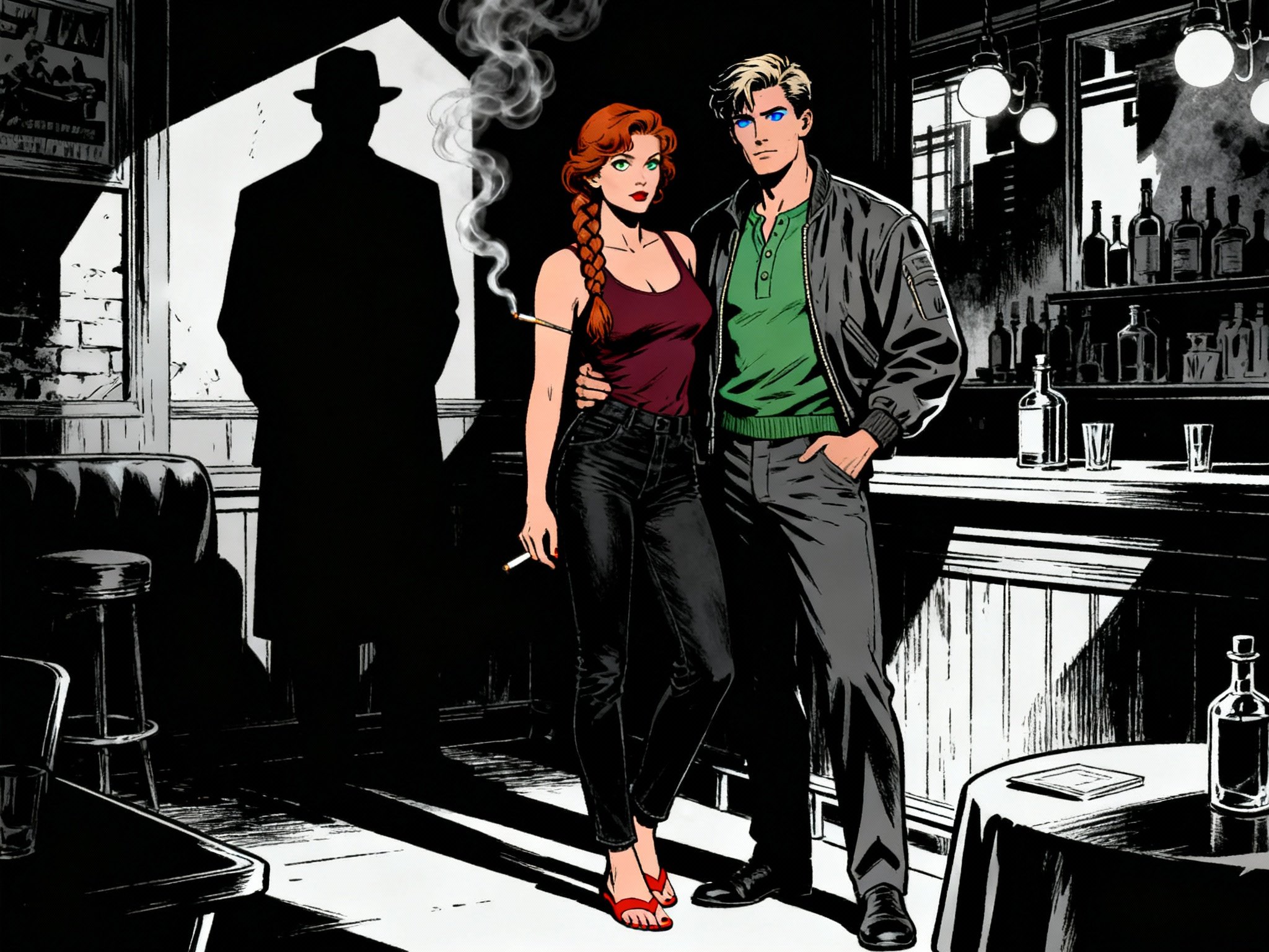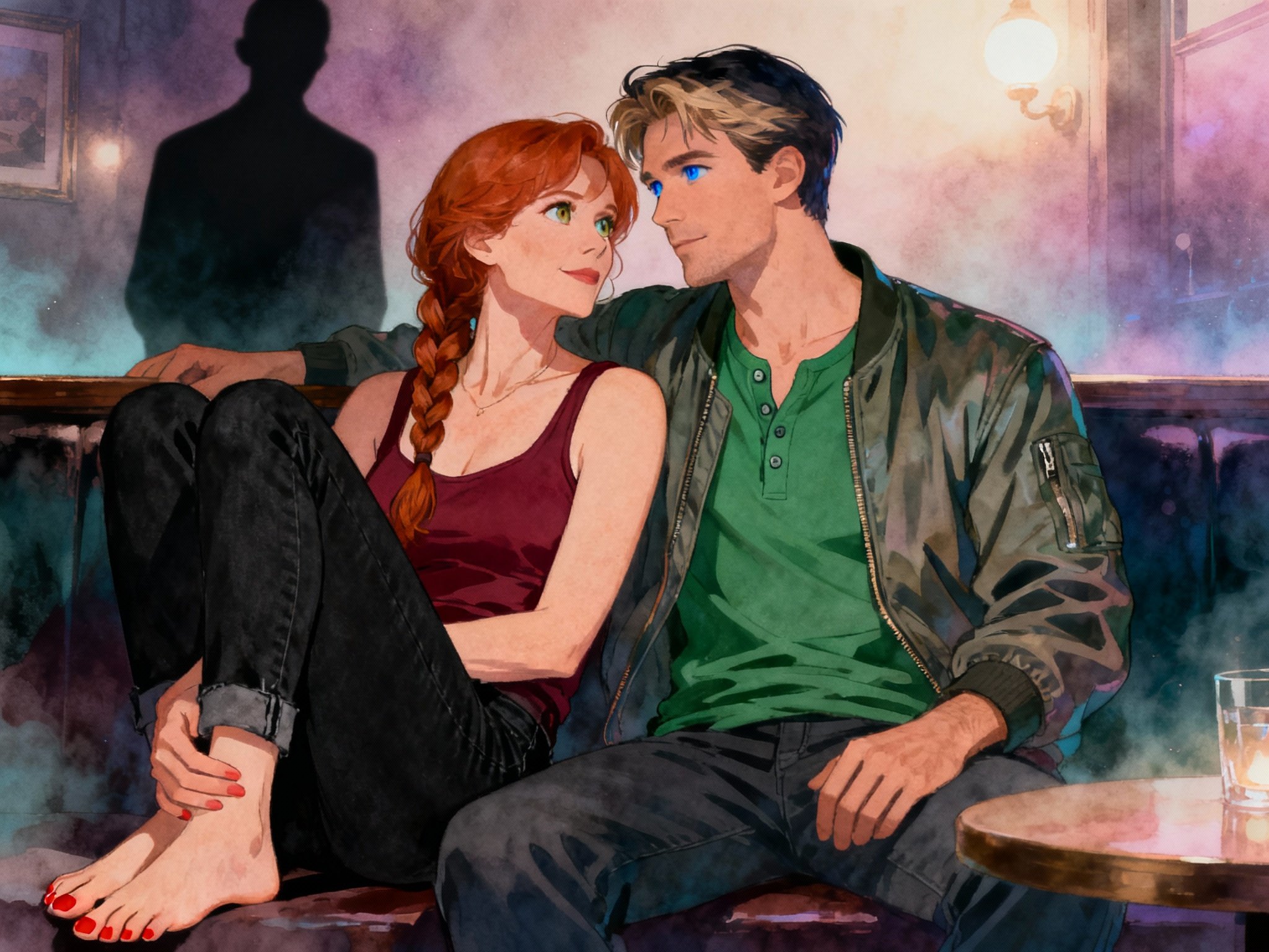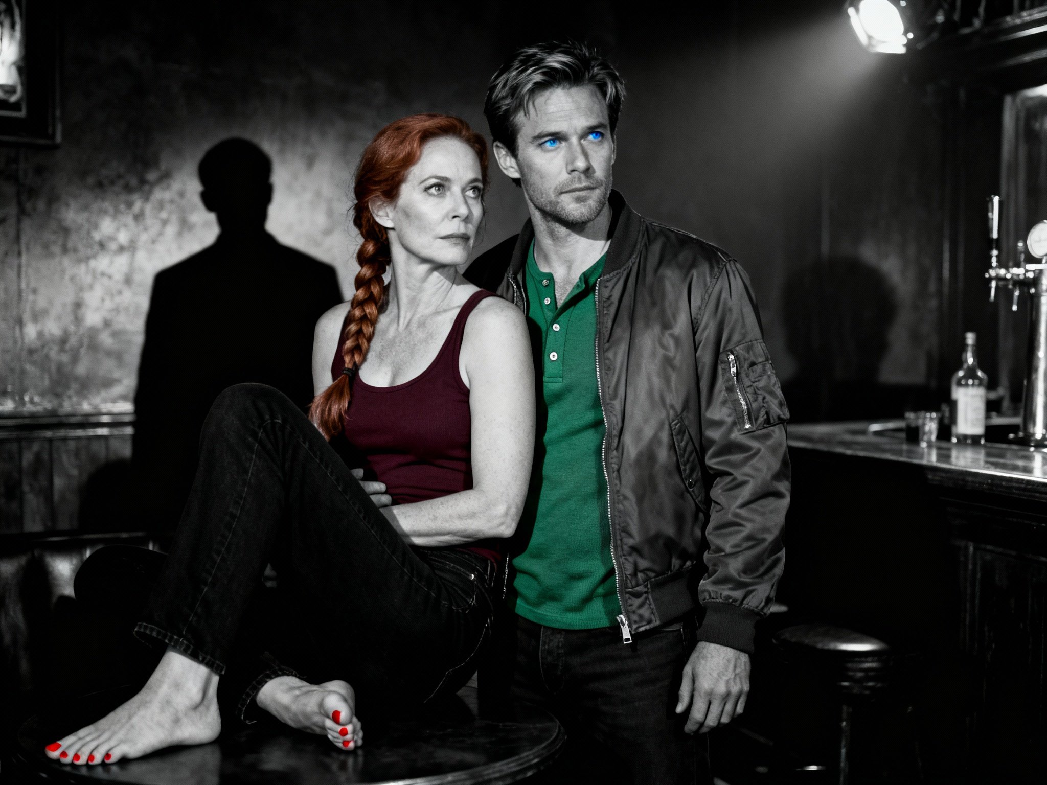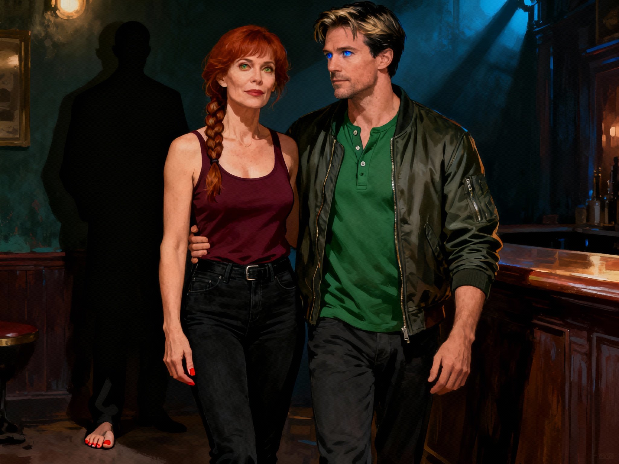 woman, late 30s, hazel eyes, auburn braid, black jeans, burgundy tank top, red toenails; man, mid-30s, blue eyes, dark blond hair, green henley, bomber jacket; close in low-lit speakeasy, shadowy figure behind