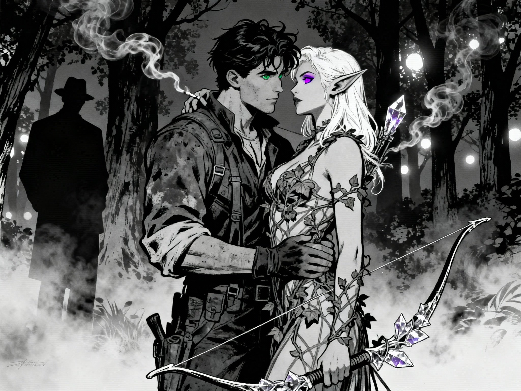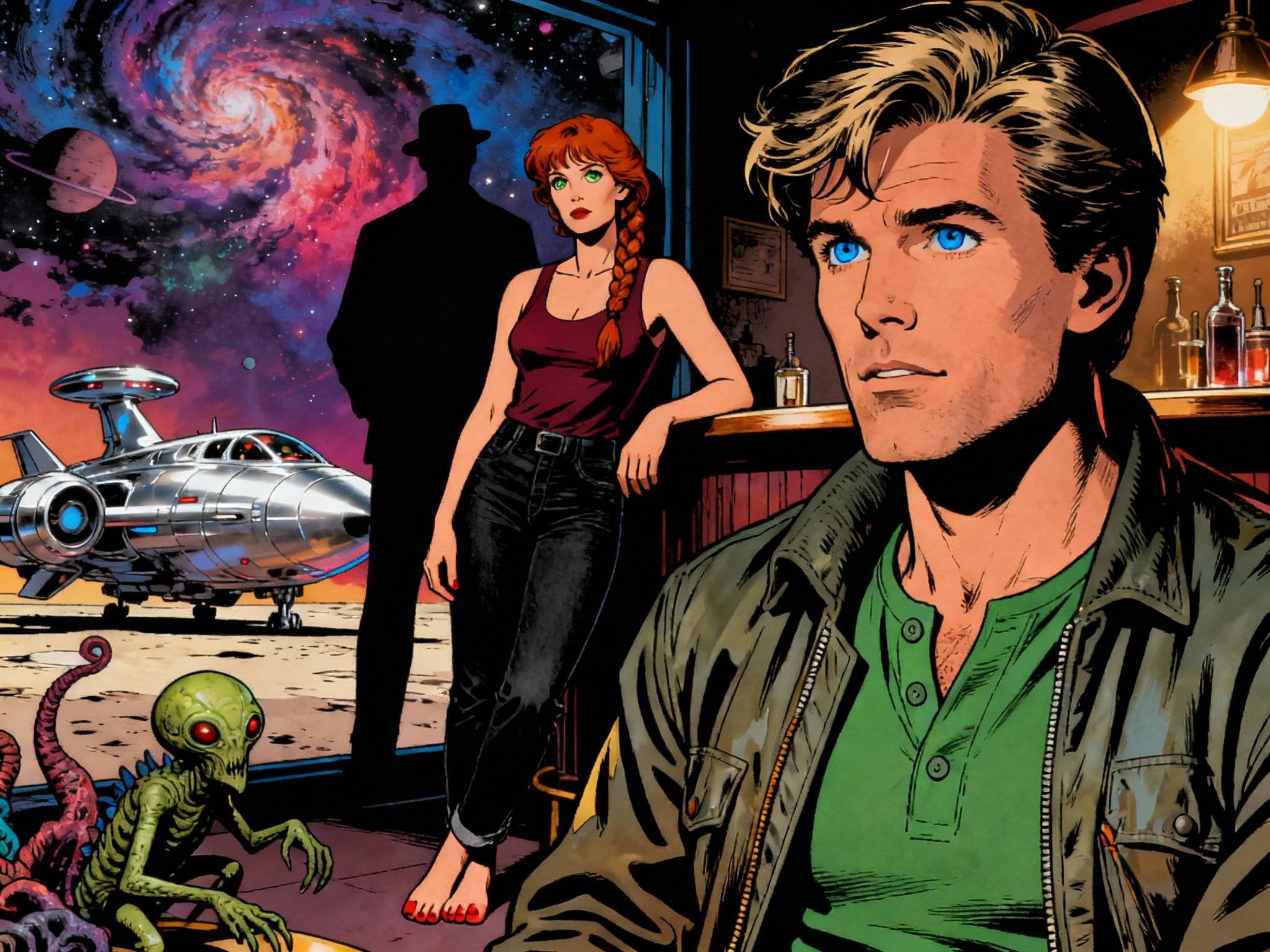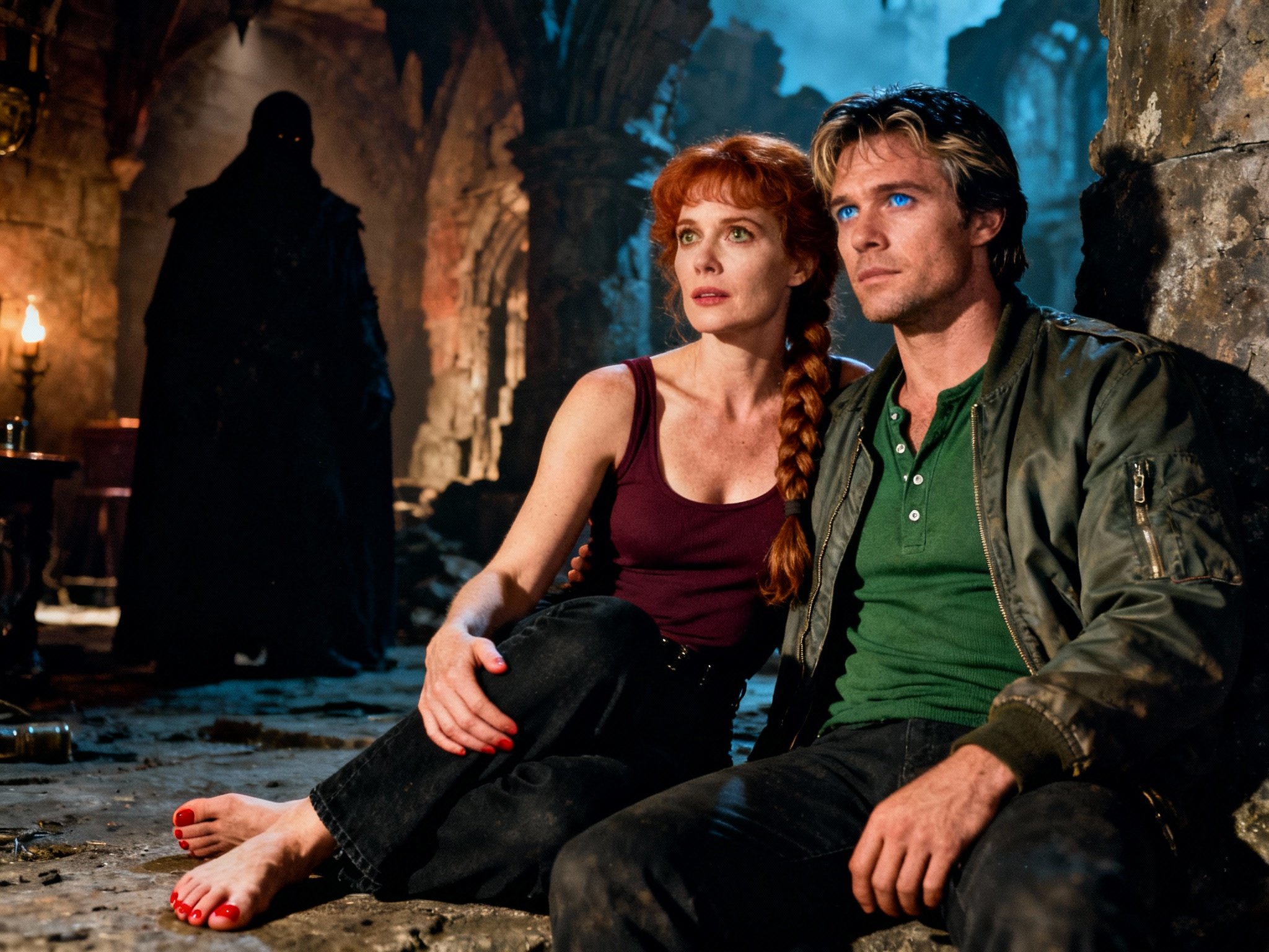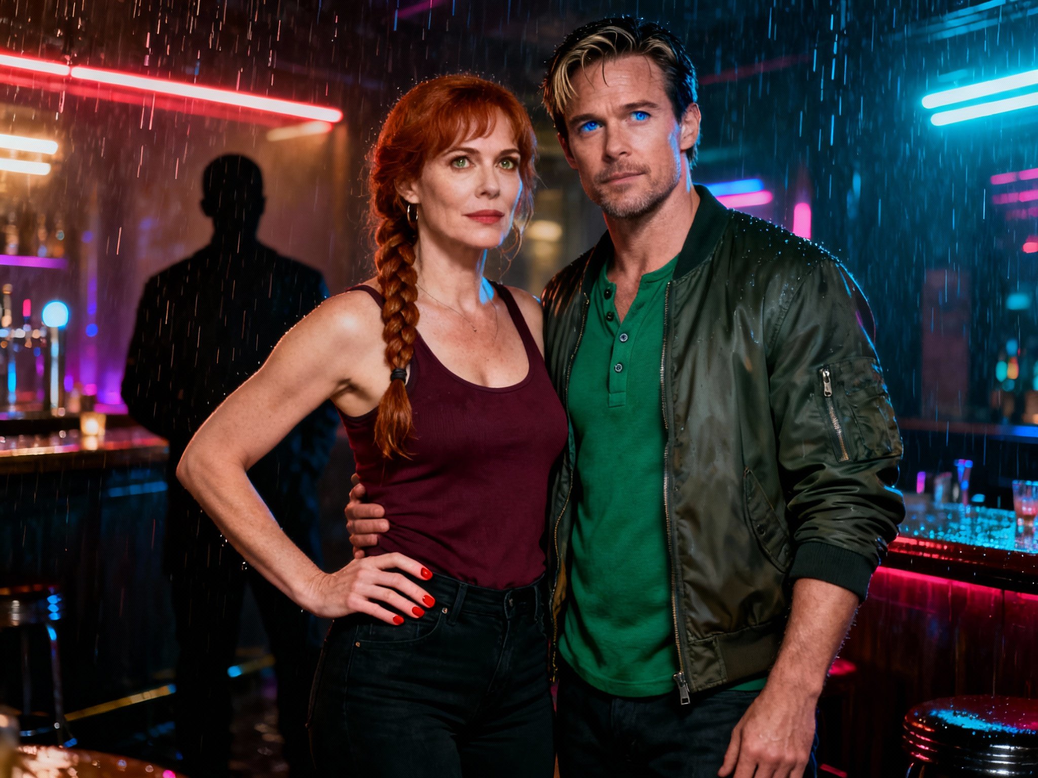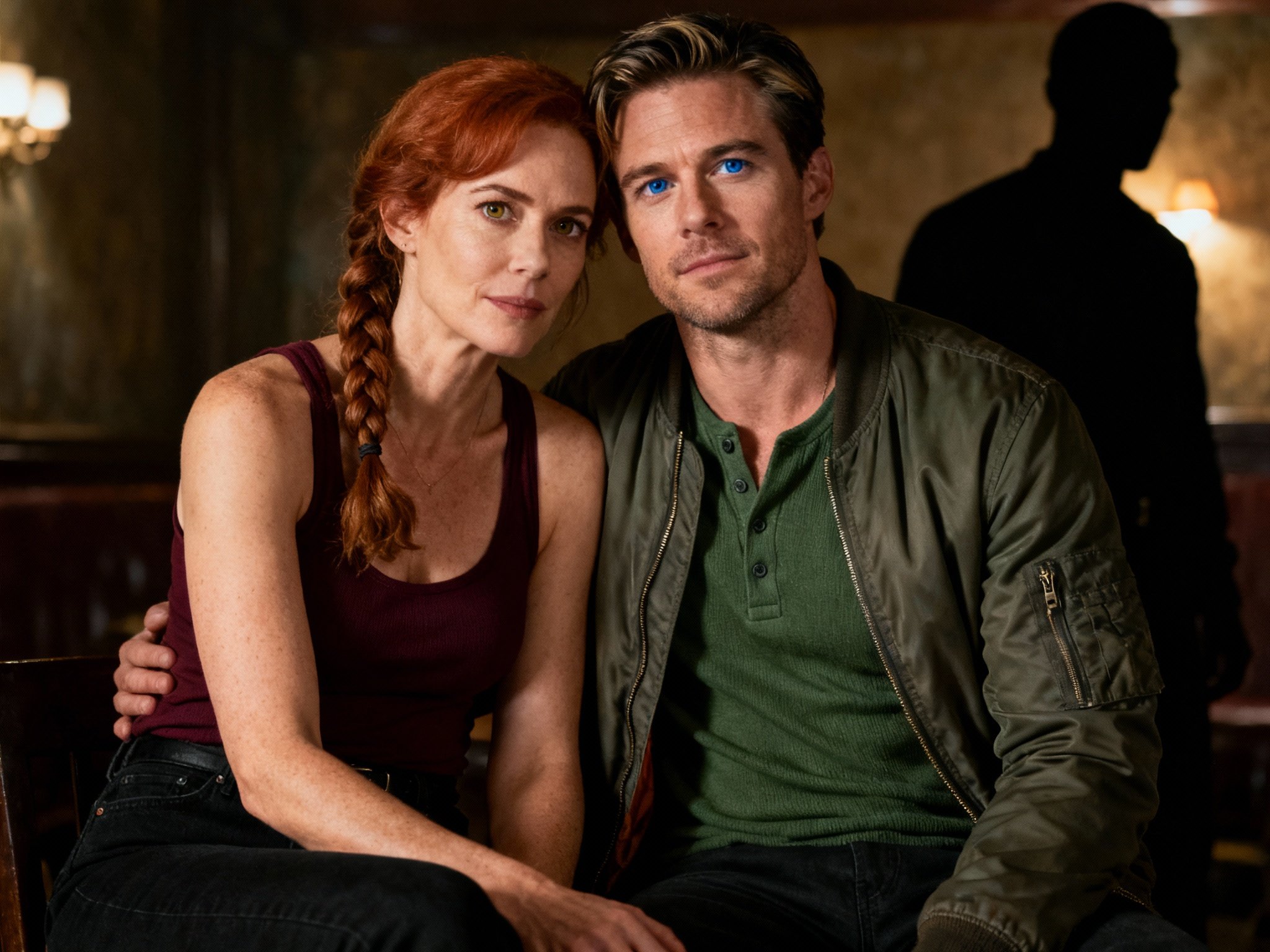 woman, late 30s, hazel eyes, auburn braid, black jeans, burgundy tank top, red toenails; man, mid-30s, blue eyes, dark blond hair, green henley, bomber jacket; close in low-lit speakeasy, shadowy figure behind