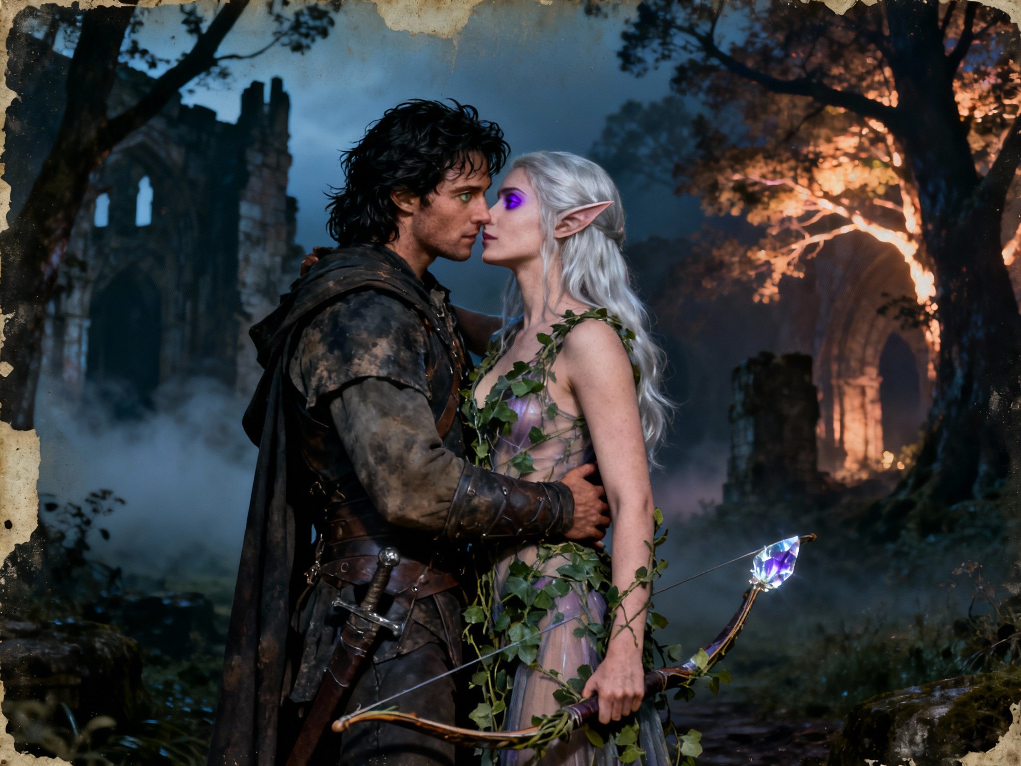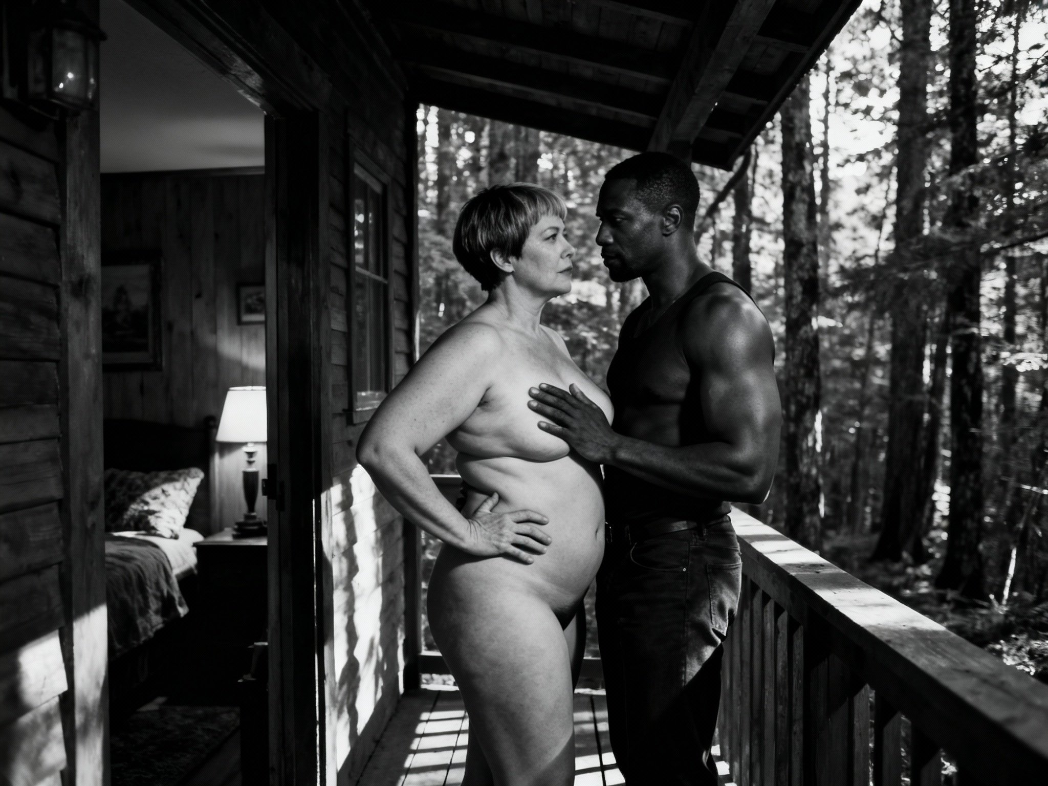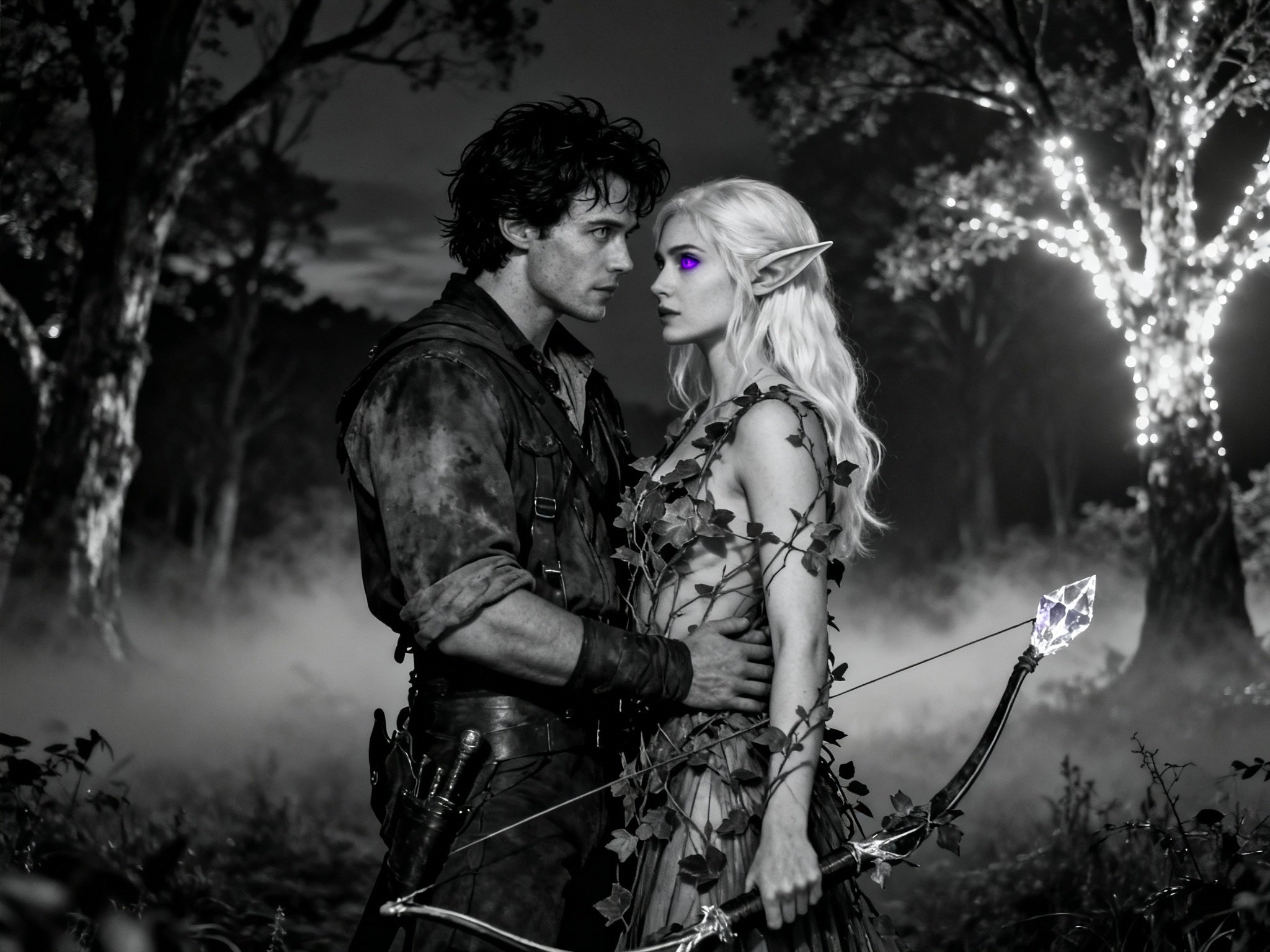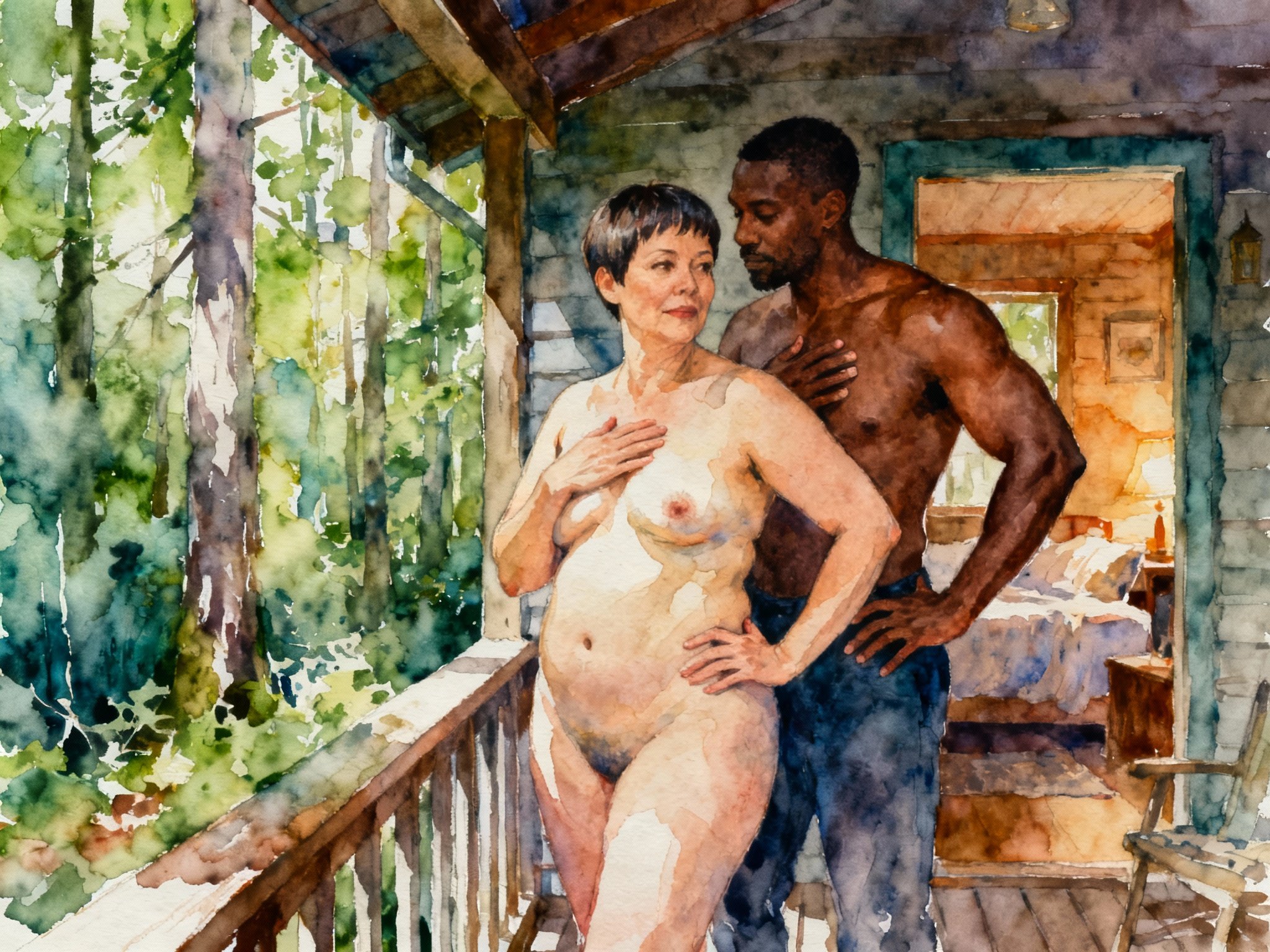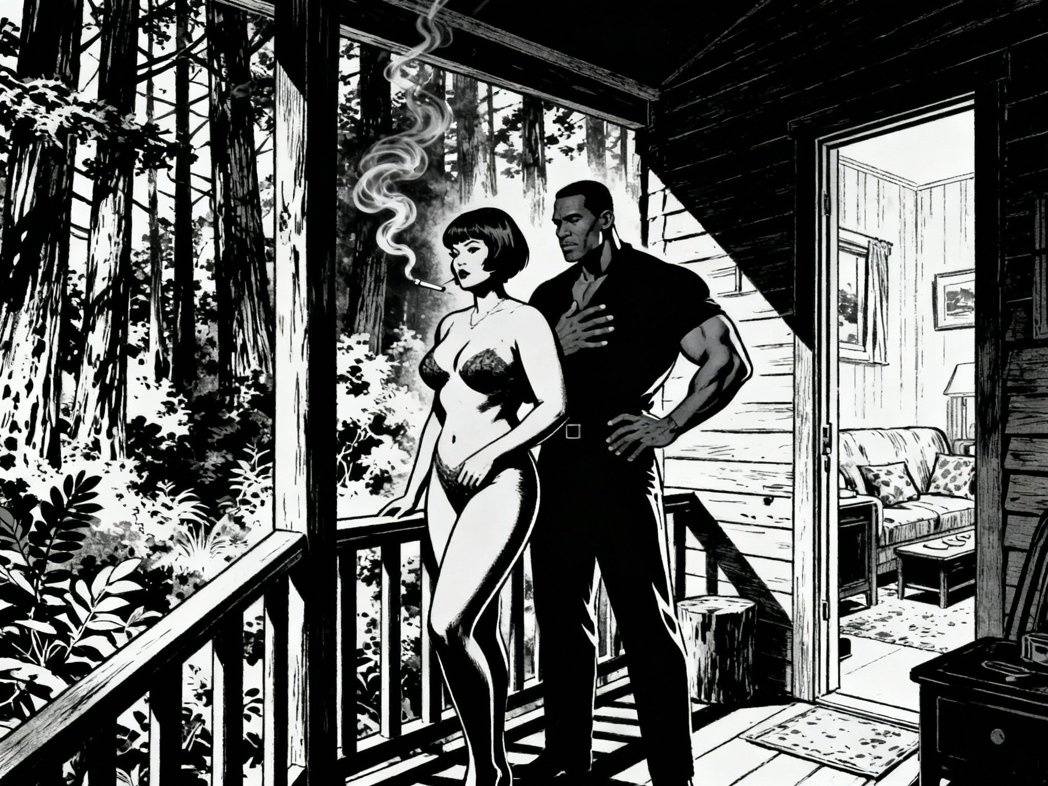 woman, late 30s, hazel eyes, auburn braid, black jeans, burgundy tank top, red toenails; man, mid-30s, blue eyes, dark blond hair, green henley, bomber jacket; close in low-lit speakeasy, shadowy figure behind