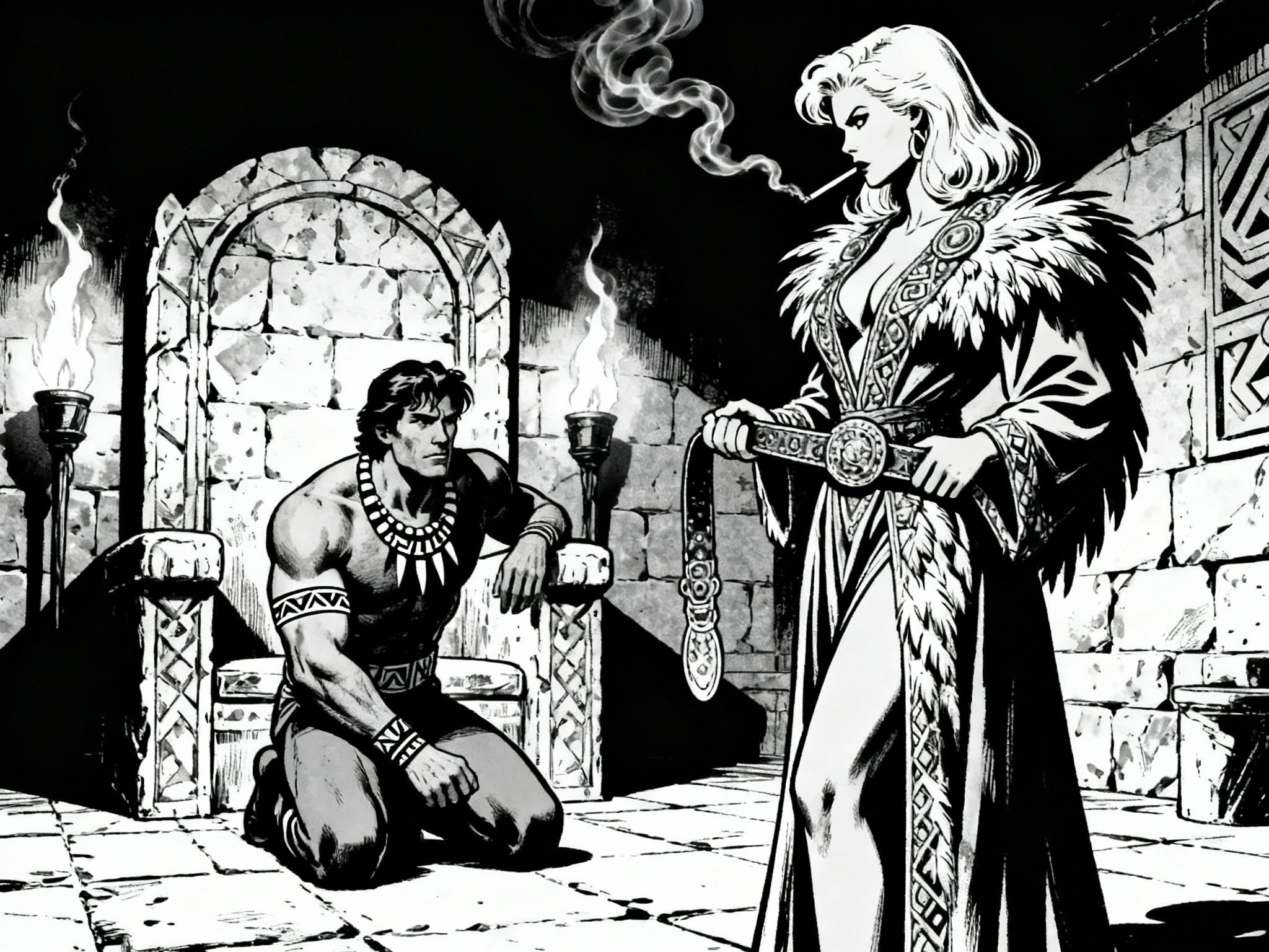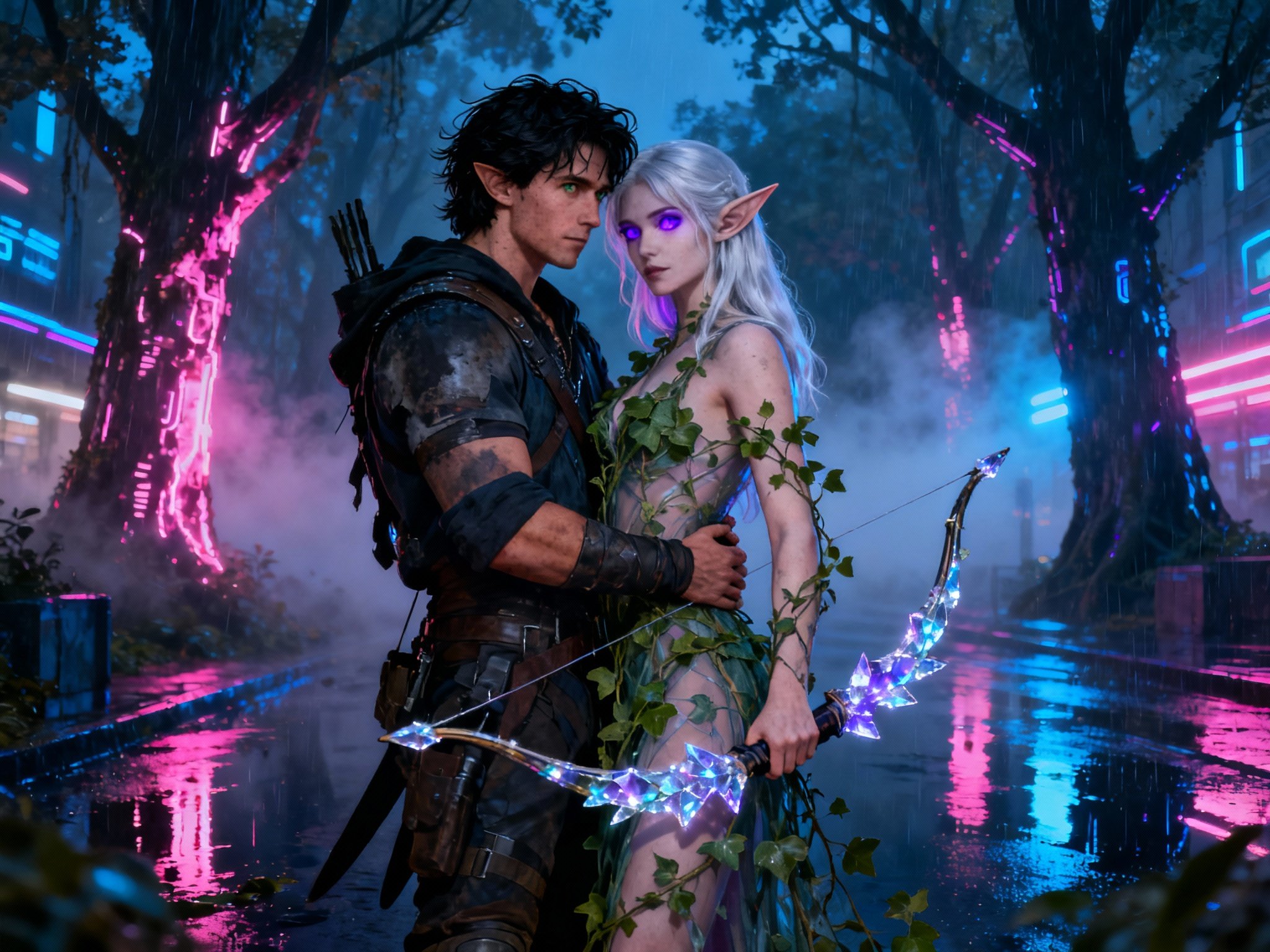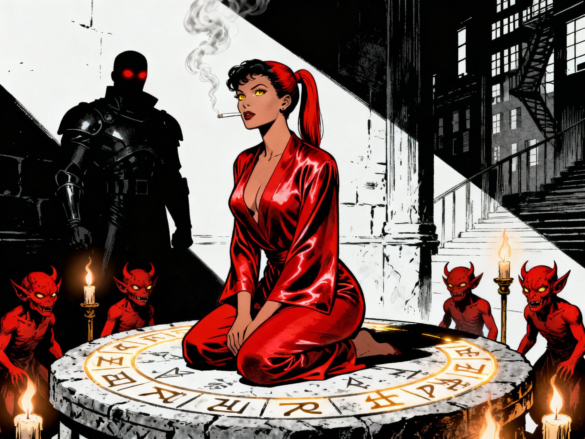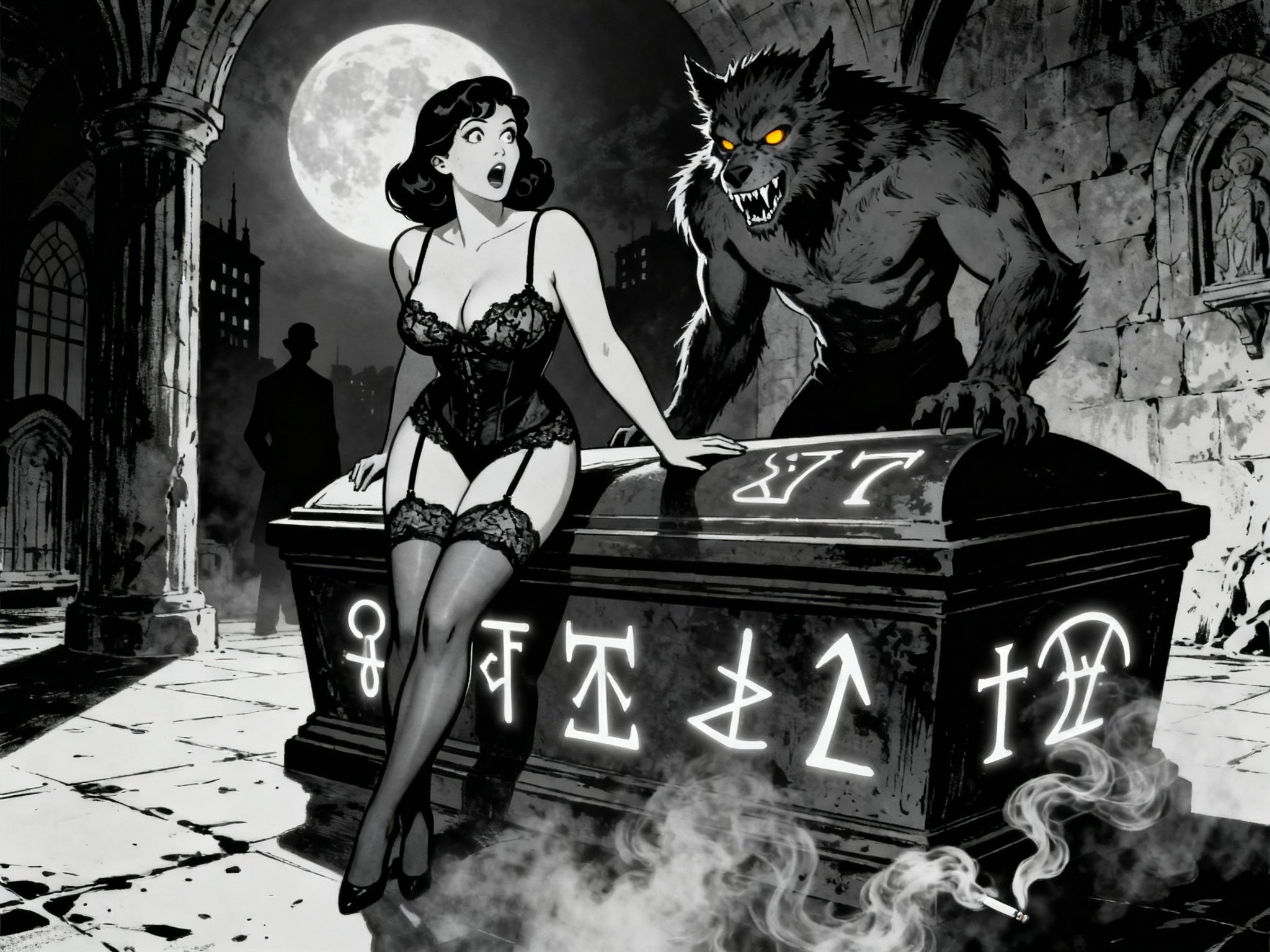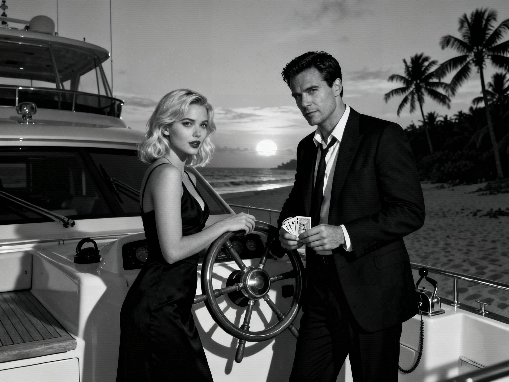 woman, late 30s, hazel eyes, auburn braid, black jeans, burgundy tank top, red toenails; man, mid-30s, blue eyes, dark blond hair, green henley, bomber jacket; close in low-lit speakeasy, shadowy figure behind