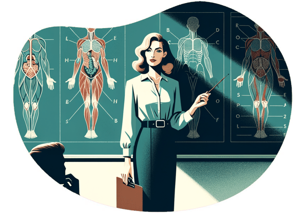 - As you walk into the dimly lit room, you see a chalkboard with various diagrams of the female anatomy. Your partner, dressed in a professional blouse and skirt, stands at the front of the room, clipboard in hand.