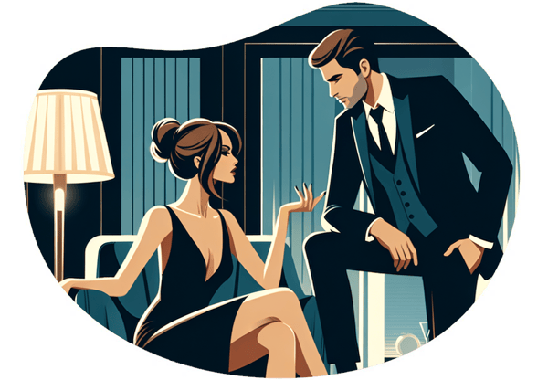 A spy seducing their target in a dimly lit hotel room. Feel the excitement and anticipation as you become the target of a seductive game.